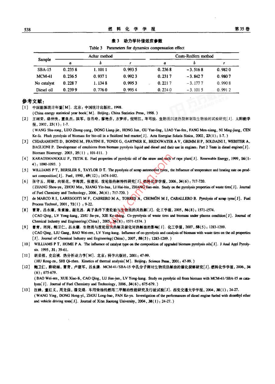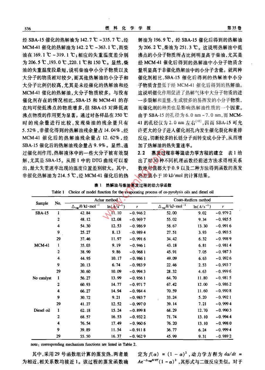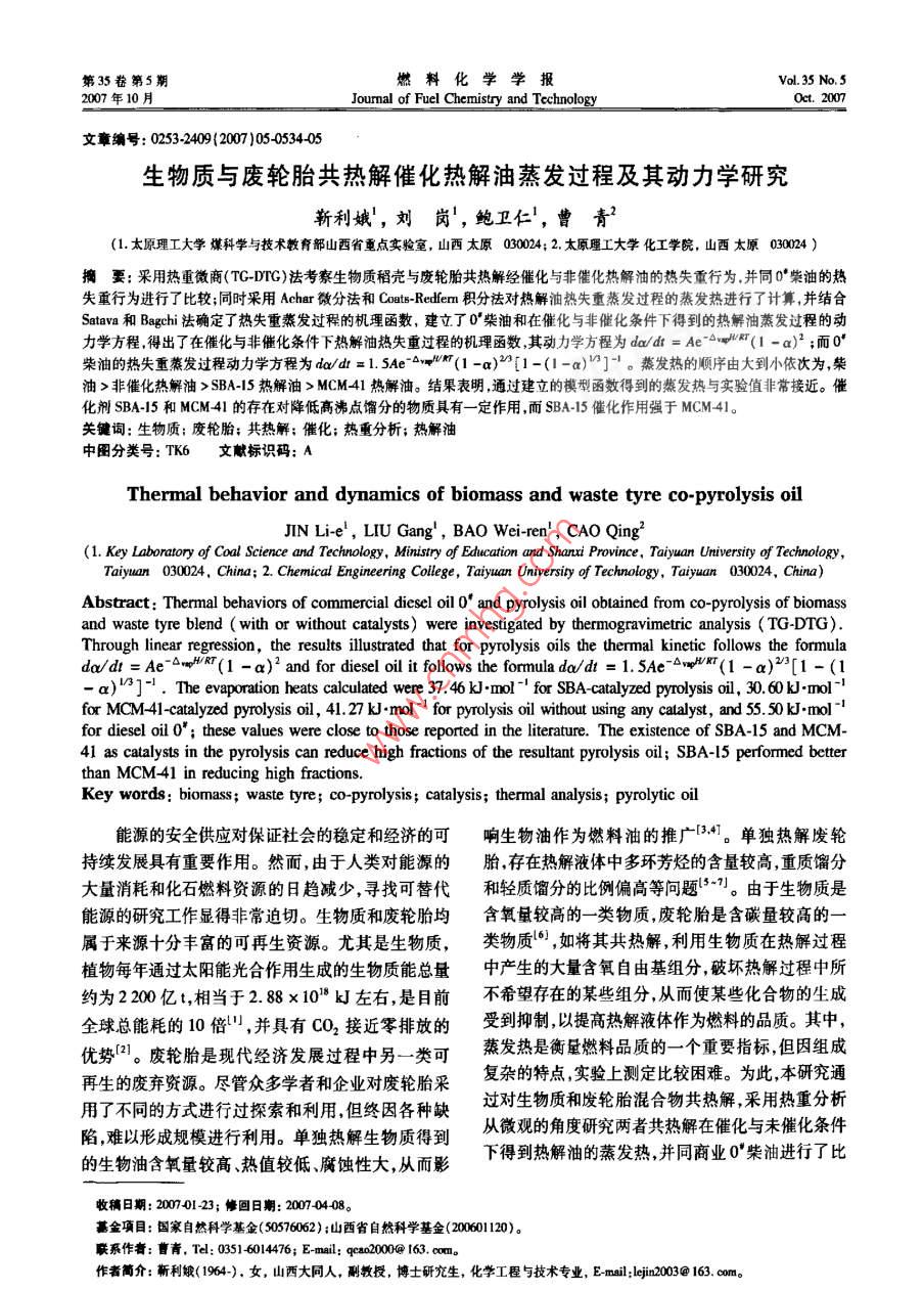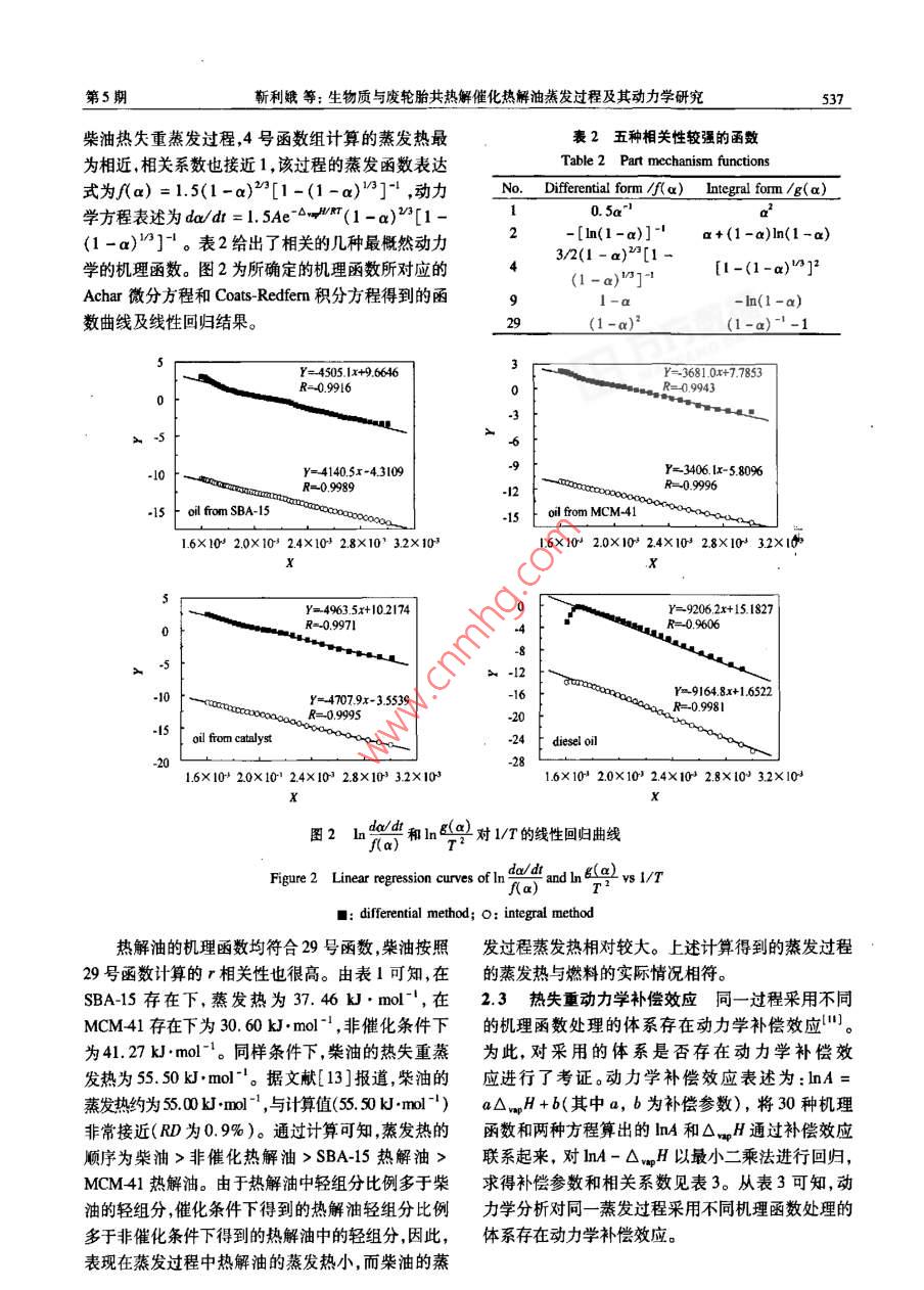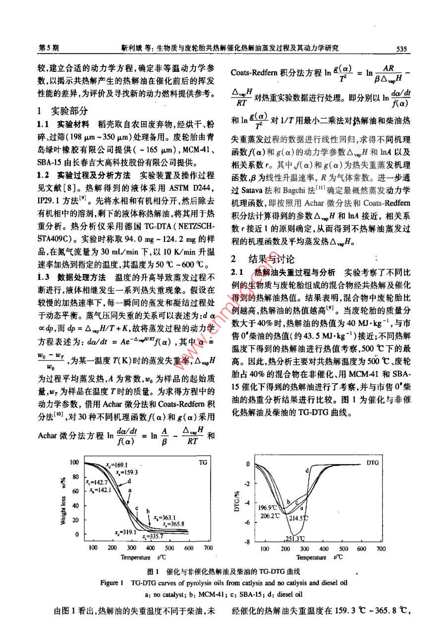 第35卷第5期燃料化學學報Vol. 35 No.52007年10月」Jourmal of Fuel Chemistry and TechnologyOect. 2007文章編號: 0253-2409(2007 )05-0534-05生物質與廢輪胎共熱解催化熱解油蒸發(fā)過程及其動力學研究靳利娥',劉崗', 鮑衛(wèi)仁',曹青(1.太原理工大學煤科學與技術教育部山西省重點實驗室,山西太原030024; 2.太原理工大學化工學院,山酉太原030024 )摘要: 采用熱重微商(TG-DTG)法考察生物質稻殼與廢輪胎共熱解經催化與非催化熱解油的熱失重行為,并同0'柴油的熱失重行為進行了比較;同時采用Acher微分法和Coats- Redfemn積分法對熱解油熱失重蒸發(fā)過程的蒸發(fā)熱進行了計算,并結合Satava和Bagchi法確定了熱失重蒸發(fā)過程的機理函數(shù),建立了0°柴油和在催化與非催化條件下得到的熱解油蒸發(fā)過程的動力學方程,得出了在催化與非催化條件下熱解油熱失重過程的機理函數(shù),其動力學方程為da/dt = Ae-H(1 -a)”;而0'柴油的熱失重蒸發(fā)過程動力學方程為da/dr = 1. SAe~(1 -ax)2[1-(1-a)"]"。蒸發(fā)熱的順序由大到小依次為,柴油>非催化熱解油> SBA-15熱解油> MCM-41熱解油。結果表明,通過建立的模型函數(shù)得到的蒸發(fā)熱與實驗值非常接近。催化劑SBA-15和MCM41的存在對降低高沸點餾分的物質具有- -定作用,而SBA-15催化作用強于MCM-41。關鍵詞:生物質:廢輪胎;共熱解;催化;熱重分析;熱解油中圈分類號: TK6文獻標識碼: AThermal behavior and dynamics of biomass and waste tyre co-pyrolysis oilJIN Li-e',LIU Gang',BAO Wei-ren',CAO Qing2(1. Key Laboratory of Coal Science and Technology , Ministry of Education and Sharxi Province, Taiyuan University of Technology,Taiyuan 030024, China; 2. Chemical Engineering College, Taiyuan University of Technology, Taiyuan 030024, China)Abstract : Thermal behaviors of commercial dicsel oil 0* and pyrolysis oil obtained from co-pyrolysis of biomassand waste tyre blend ( with or without catalysts) were investigated by thermogravimetric analysis ( TG-DTG).Through linear regression, the results ilustrated that for pyrolysis oils the thermal kinetic follows the formuladx/di =Ae -0mpWRT(1 -a) and for diesel oil it follows the formula da/dt = 1. 5Ae~wyVRT(1 -a)"[1 -(1-a)/ ] ! . The evaporation heats calculated were 37. 46 kJ.mol -! for SBA catalyzed pyrolysis oil, 30.60 kJ.mol-!for MCM-41-catalyzed pyrolysis oil, 41.27 kJ-mol 1 for pyrolysis oil without using any catalyst, and 55. 50 kJ.mol-'for diesel oil 0* ; these values were close to those reported in the literature. The existence of SBA-15 and MCM-41 as catalysts in the pyrolysis can reduce high fractions of the resultant pyrolysis oil; SBA-I5 performed betterthan MCM-41 in reducing high fractions.I Key words: biomass; waste tyre; co-pyrolysis; catalysis; thermal analysis; pyrolytic oil能源的安全供應對保證社會的穩(wěn)定和經濟的可響生 物油作為燃料油的推廣-3.]。單獨熱解廢輪持續(xù)發(fā)展具有重要作用。然而,由于人類對能源的胎 ,存在熱解液體中多環(huán)芳烴的含量較高,重質餾分大量消耗和化石燃料資源的日趨減少,尋找可替代和輕質餾分的比例偏高等問題6s-7。由于生物質是能源的研究工作顯得非常迫切。生物質和廢輪胎均含氧量較高的--類物質,廢輪胎是含碳量較高的一屬于來源十分豐富的可再生資源。尤其是生物質,類物質'0) ,如將其共熱解,利用生物質在熱解過程植物每年通過太陽能光合作用生成的生物質能總量中產生的大量含氧自由基組分,破壞熱解過程中所約為2200億t,相當于2.88 x10*kJ左右,是目前不希望存在的某些組分,從而使某些化合物的生成全球總能耗的10倍",并具有CO2接近零排放的受到抑制,以提高熱解液體作為燃料的品質。其中,優(yōu)勢(1。廢輪胎是現(xiàn)代經濟發(fā)展過程中另- -類可蒸發(fā)熱是衡量燃料品質的-一個重要指標,但因組成再生的廢棄資源。盡管眾多學者和企業(yè)對廢輪胎采復雜的特點,實驗上測定比較困難。為此,本研究通用了不同的方式進行過探索和利用,但終因各種缺過對生物質和廢輪胎混合物共熱解,采用熱重分析陷,難以形成規(guī)模進行利用。單獨熱解生物質得到從微觀的角度研究兩者共熱解在催化與未催化條件的生物油含氧量較高、熱值較低、腐蝕性大,從而影下得到熱解油的蒸發(fā)熱,并同商業(yè)0*柴油進行了比收稿日期: 2007401-23;修回日期: 2007-0408。基金項目:國家自然科學基金(50576062) ;山西省自然科學基金(20601120)。聯(lián)系作者:曹青, Tel: 0351 6014476; E-mail: qeo2000@0 163. om作者簡介:靳利娘(1964-).女,山西大同人,副教授,博士研究生,化學工程與技術專業(yè),Emil:lejn003@ 163. com。第5期靳利娥等:生物質與廢輪胎共熱解催化熱解油蒸發(fā)過程及其動力學研究535較,建立合適的動力學方程,確定非等溫動力學參Coats-Redfem積分法方程lng(x)ART=nβ△H數(shù),以揭示共熱解產生的熱解油在催化前后的揮發(fā)性能的差異,為評價及尋找新的動力燃料提供參考。O.H對熱重實驗數(shù)據(jù)進行處理。即分別以hn'de/dtRTf(a)1實驗部分1.1實驗材料 稻殼取自農田廢棄物 ,經烘干、粉.和lnB對1/T用最小二乘法對熱解油和柴油熱碎、過篩( 198 μm ~ 350 μm)處理備用。廢輪胎由青失重蒸發(fā)過程的數(shù)據(jù)進行線性回歸,求得不同機理島綠葉橡膠有限公司提供( ~ 165 um), MCM41、函數(shù)f(a)和 g(x)的動力學參數(shù)▲,H和InA以及SBA-15由長春吉大高科技股份有限公司提供。相關系數(shù)r。其中f(x)和g(a)為熱失重蒸發(fā)機理1.2 實驗過程及分析方法 實驗裝置及操作過程函