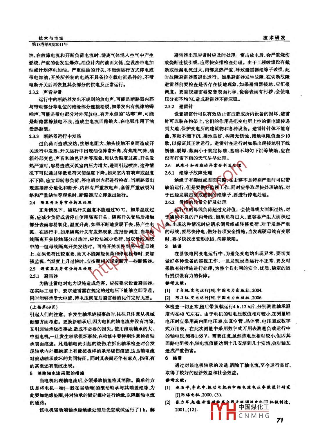 技術(shù)研發(fā).TECHNOLOGY AND MARKETVoL.18,No.9,2011變電運行技術(shù)鄧天培(平果供電局,廣西百色531400)摘要:縣級電網(wǎng)不僅是一個縣電力系統(tǒng)的主要負(fù) 荷中心,而且是城鎮(zhèn)現(xiàn)代化建設(shè)的重要基礎(chǔ)設(shè)施。在電網(wǎng)規(guī)劃過程中,為了能夠提供安全穩(wěn)定、優(yōu)質(zhì)、經(jīng)濟(jì)的電網(wǎng),要高度重視變電運行技術(shù)。關(guān)鍵詞:變電運行;巡視;異常;分析;處理do:10.3969/jissn.1006- -8554.2011.09.0400引盲夜間,若是變壓器外部放電,變壓器套管附近會發(fā)出藍(lán)色的火縣級電網(wǎng)不僅是一個縣電力系統(tǒng)的主要負(fù)荷中心,而且是花,這種情況下應(yīng)加強監(jiān)視,及時安排檢修,以免發(fā)展成為事故。城鎮(zhèn)現(xiàn)代化建設(shè)的重要基礎(chǔ)設(shè)施。變電運行的任務(wù)是縣級電網(wǎng)2.1.2 溫度異常電力設(shè)備運行操作以及維護(hù)管理的主要工作,其運行狀況的優(yōu)如果變壓器在相同運行條件下,溫度比-般情況下升高劣關(guān)系到整個縣的安全和穩(wěn)定。因此,在電網(wǎng)規(guī)劃過程中,應(yīng)高10C以上,或上層油溫大于規(guī)定的允許值,則認(rèn)為變壓器溫度度重視變電運行技術(shù)。異常。制定合理的巡視路線圖變壓器溫度發(fā)生異常時,應(yīng)檢查散熱器是否正常,因為變根據(jù)設(shè)備的分布情況按照巡視視角的開闊性和巡視路線壓器上層油溫直接關(guān)系著散熱器的工作狀態(tài),檢查風(fēng)扇和油泵簡便性原則制定巡視路線圖。保證巡視時不重復(fù)、不遺漏,巡視轉(zhuǎn)向是否正確,油循環(huán)系統(tǒng)和冷卻器風(fēng)冷系統(tǒng)是否存在異常。路線通暢、平整、無障礙物。當(dāng)設(shè)備改造換型、新設(shè)備投運和變?nèi)绻@些都沒有問題,應(yīng)查看溫度計指示是否正確,有沒有出電站擴建時,要修訂設(shè)備巡視路線圖。合理設(shè)置巡視路線標(biāo)志,現(xiàn)失靈。為避免溫度異常造成變壓器損壞,應(yīng)投入備用變壓器。對于風(fēng)吹日曬、路面整治環(huán)境綠化、電纜敷設(shè)等原因造成的巡2.1.3 變壓器油色和油位異常視路線模糊不清、標(biāo)志缺損的情況,應(yīng)及時補充更換。在高峰負(fù)如果變壓器油內(nèi)有碳質(zhì),油色變化會比較大外殼與線圈荷期間,應(yīng)加強溫度、油位、氣壓冷卻裝置的檢查力度,同時應(yīng)之間容 易發(fā)生擊穿事故,當(dāng)變壓器內(nèi)部有放電時,變壓器應(yīng)停檢查機械的緊固、支撐和傳動部位是否有變形斷裂,電氣接點止運行。變壓器油位變化也可能引起事故,當(dāng)變壓器嚴(yán)重缺油是否與運行方式相符。時,內(nèi)部的線圈和鐵芯會暴露在空氣中,使絕緣受潮。配有瓦斯2電氣設(shè)備異常運行的分析及處理保護(hù)的變壓器,當(dāng)油位下降到- -定程度時 ,會發(fā)生輕、重瓦斯保電氣設(shè)備發(fā)生故障往往是由于運行異常導(dǎo)致的,為確保用護(hù)動作。電安全,運行值班人員應(yīng)加強巡視工作,一旦發(fā)現(xiàn)運行異常,工2.1.4 變壓器外表異常作人員要盡快處理,爭取把事故隱患消滅在萌芽狀態(tài),避免異設(shè)置在室外的主變壓器長期通電帶負(fù)荷運行,在外界環(huán)境常狀態(tài)進(jìn)- -步發(fā)展。的影響下,容易造成防爆管玻璃破損套管閃絡(luò)放電和呼吸器2.1 變壓器的異常分析及處理中的硅膠變色等不良后果。如出現(xiàn)防爆玻璃管破碎向外噴油,變壓器內(nèi)部故障是由輕微到嚴(yán)重發(fā)展的.在事故發(fā)生的初應(yīng)立即將變壓器退出運行。級階段,變壓器- -般會有異常情況出現(xiàn),當(dāng)值班人員發(fā)現(xiàn)有異2.2 互 感器的異常分析及處理常時,應(yīng)做好現(xiàn)場記錄并匯報上級。如果會影響變壓器的安全,當(dāng)故障電壓互感器停電時,應(yīng)退出自動裝置和有可能誤動要及時使變壓器停電檢查,投入備用電源或備用變壓器。的保護(hù)后再停電。高壓保險沒有熔斷,高壓側(cè)絕緣沒有損壞,電2.1.1聲音異常樂互動器故障不嚴(yán)重,可以拉開刀閘隔離故障。故障電壓互動器變壓器的繞組在鐵芯上,當(dāng)有電流流過時硅鋼片產(chǎn)生振隔離后,進(jìn)行倒閘操作,母線并列后合上電壓互感器,重新投入動,繞組之間由于電磁力的作用也會產(chǎn)生振動.使變壓器發(fā)出自動裝置。當(dāng)電流互動器運行中出現(xiàn)異常時,應(yīng)轉(zhuǎn)移負(fù)荷停電處均勻的“嗡嗡”聲。如果聲音異?;虿痪鶆?都是不正常的。理。如果聲音較小,可以不立即停電,但需向主管領(lǐng)導(dǎo)匯報。如果內(nèi)部短時的“哇哇‘”聲,可能是大動力設(shè)備起動,負(fù)荷變負(fù)荷過大二次回路開路、接線接觸不良等原因產(chǎn)生的電化大,產(chǎn)生因高次諧波,也可能是電網(wǎng)中發(fā)生過電壓。值班人員流互感器過熱現(xiàn)象,應(yīng)及時減少線路負(fù)荷,若負(fù)荷不大,但溫度可根據(jù)當(dāng)時電壓、電流表的指示情況,有無接地信號,是否存在較高時,應(yīng)進(jìn)行停電處理。電流互感器二次阻抗很小,一般不能負(fù)荷擺動來判斷。如果內(nèi)部發(fā)出的“嗡嘴”聲較高且沉重,可能是有聲音。電流互動器發(fā)出異常聲音的原因主要包括鐵芯松動和鐵芯振動增大引起的這種情況可根據(jù)變壓器負(fù)荷情