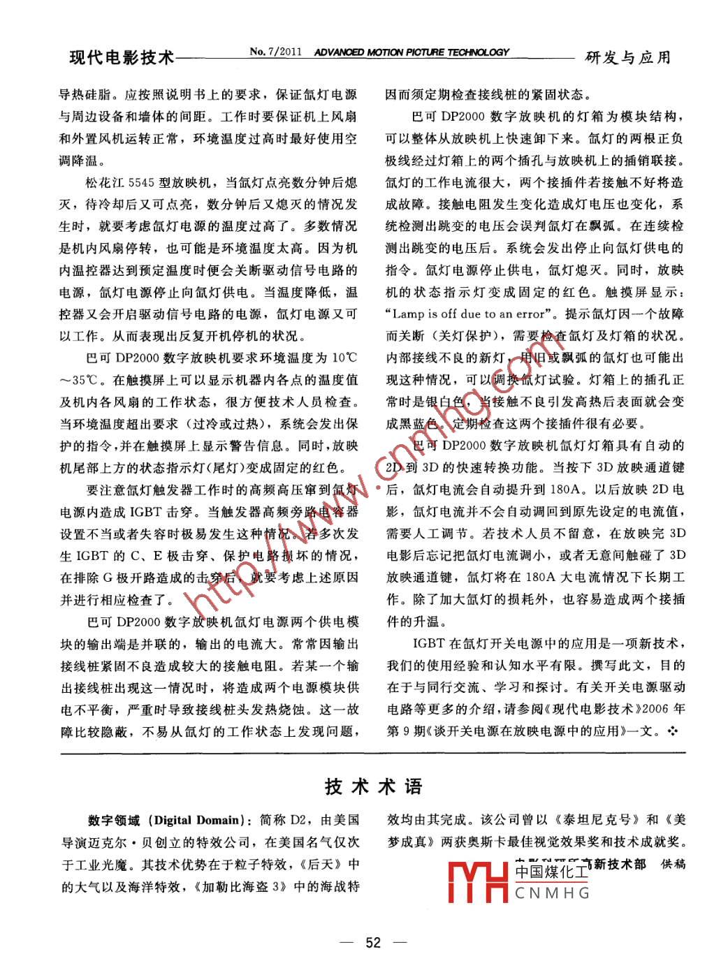 現(xiàn)代電影技術(shù)-No.7/2011 ADVANCED MOTION PICTURE TECHINOLOGY研發(fā)與應(yīng)用導(dǎo)熱硅脂。應(yīng)按照說(shuō)明書(shū)上的要求,保證氙燈電源因而須定期檢查接線樁的緊固狀態(tài)。與周邊設(shè)備和墻體的間距。工作時(shí)要保證機(jī)上風(fēng)扇巴可DP2000數(shù)字放映機(jī)的燈箱為模塊結(jié)構(gòu),和外置風(fēng)機(jī)運(yùn)轉(zhuǎn)正常,環(huán)境溫度過(guò)高時(shí)最好使用空可以整體從放映機(jī).上快速卸下來(lái)。氙燈的兩根正負(fù),調(diào)降溫。極線經(jīng)過(guò)燈箱上的兩個(gè)插孔與放映機(jī)上的插銷(xiāo)聯(lián)接。松花江5545型放映機(jī),當(dāng)氙燈點(diǎn)亮數(shù)分鐘后熄氙燈的工作電流很大,兩個(gè)接插件若接觸不好將造滅,待冷卻后又可點(diǎn)亮,數(shù)分鐘后又熄滅的情況發(fā)成故障。接觸電阻發(fā)生變化造成燈電壓也變化,系生時(shí),就要考慮氙燈電源的溫度過(guò)高了。多數(shù)情況統(tǒng)檢測(cè)出跳變的電壓會(huì)誤判氙燈在飄弧。在連續(xù)檢是機(jī)內(nèi)風(fēng)扇停轉(zhuǎn),也可能是環(huán)境溫度太高。因?yàn)闄C(jī)測(cè)出跳變的電壓后。系統(tǒng)會(huì)發(fā)出停止向氙燈供電的內(nèi)溫控器達(dá)到預(yù)定溫度時(shí)便會(huì)關(guān)斷驅(qū)動(dòng)信號(hào)電路的指令。氙燈電源停止供電,氙燈熄滅。同時(shí),放映電源,氙燈電源停止向氙燈供電。當(dāng)溫度降低,溫機(jī)的狀態(tài)指示燈變成固定的紅色。觸摸屏顯示:控器又會(huì)開(kāi)啟驅(qū)動(dòng)信號(hào)電路的電源,氙燈電源又可“Lamp is off due to an error".提示氙燈因一個(gè)故障以工作。從而表現(xiàn)出反復(fù)開(kāi)機(jī)停機(jī)的狀況。而關(guān)斷(關(guān)燈保護(hù)),需要檢查氙燈及燈箱的狀況。.巴可DP2000數(shù)字放映機(jī)要求環(huán)境溫度為10C內(nèi)部接線不良的新燈,用舊或飄弧的氙燈也可能出~35C。在觸摸屏上可以顯示機(jī)器內(nèi)各點(diǎn)的溫度值現(xiàn)這種情況,可以調(diào)換氙燈試驗(yàn)。燈箱上的插孔正及機(jī)內(nèi)各風(fēng)扇的工作狀態(tài),很方便技術(shù)人員檢查。常時(shí)是銀白色, 當(dāng)接觸不良引發(fā)高熱后表面就會(huì)變當(dāng)環(huán)境溫度超出要求(過(guò)冷或過(guò)熱),系統(tǒng)會(huì)發(fā)出保成黑藍(lán)色。定期檢查這兩個(gè)接插件很有必要。護(hù)的指令,并在觸摸屏上顯示警告信息。同時(shí),放映巴可DP2000數(shù)字放映機(jī)氙燈燈箱具有自動(dòng)的機(jī)尾部上方的狀態(tài)指示燈(尾燈)變成固定的紅色。2D到3D的快速轉(zhuǎn)換功能。當(dāng)按下3D放映通道鍵要注意氙燈觸發(fā)器工作時(shí)的高頻高壓竄到氙燈后,氙燈電流會(huì)自動(dòng)提升到180A。以后放映2D電電源內(nèi)造成IGBT擊穿。當(dāng)觸發(fā)器高頻旁路電容器影,氙燈電流并不會(huì)自動(dòng)調(diào)回到原先設(shè)定的電流值,設(shè)置不當(dāng)或者失容時(shí)極易發(fā)生這種情況。若多次發(fā)需要人工調(diào)節(jié)。若技術(shù)人員不留意,在放映完3D生IGBT的C、E極擊穿、保護(hù)電路損壞的情況,電影后忘記把氙燈電流調(diào)小,或者無(wú)意間觸碰了3D在排除G極開(kāi)路造成的擊穿后,就要考慮上述原因放映通道鍵,氙燈將在180A大電流情況下長(zhǎng)期工并進(jìn)行相應(yīng)檢查了。作。除了加大氙燈的損耗外,也容易造成兩個(gè)接插巴可DP2000數(shù)字放映機(jī)氙燈電源兩個(gè)供電模件的升溫。塊的輸出端是并聯(lián)的,輸出的電流大。常常因輸出IGBT在氙燈開(kāi)關(guān)電源中的應(yīng)用是一-項(xiàng)新技術(shù),接線樁緊固不良造成較大的接觸電阻。若某一個(gè)輸我們的使用經(jīng)驗(yàn)和認(rèn)知水平有限。撰寫(xiě)此文,目的出接線樁出現(xiàn)這一-情況時(shí),將造成兩個(gè)電源模塊供在于與同行交流、學(xué)習(xí)和探討。有關(guān)開(kāi)關(guān)電源驅(qū)動(dòng)電不平衡,嚴(yán)重時(shí)導(dǎo)致接線樁頭發(fā)熱燒蝕。這一故電路等更多的介紹,請(qǐng)參閱《現(xiàn)代電影技術(shù)》2006年障比較隱蔽,不易從氙燈的工作狀態(tài)上發(fā)現(xiàn)問(wèn)題,第9期《談開(kāi)關(guān)電源在放映電源中的應(yīng)用》-文。必技術(shù)術(shù)語(yǔ)數(shù)字領(lǐng)域(Digital Domain):簡(jiǎn)稱D2,由美國(guó)效均由其完成。該公司曾以《泰坦尼克號(hào)》和《美導(dǎo)演邁克爾.貝創(chuàng)立的特效公司,在美國(guó)名氣僅次夢(mèng)成真》兩獲奧斯卡最佳視覺(jué)效果獎(jiǎng)和技術(shù)成就獎(jiǎng)。于工業(yè)光魔。其技術(shù)優(yōu)勢(shì)在于粒子特效,《后天》中中國(guó)煤化立新技術(shù)部供稿的大氣以及海洋特效,《加勒比海盜3》中的海戰(zhàn)特MYHCNMHG.