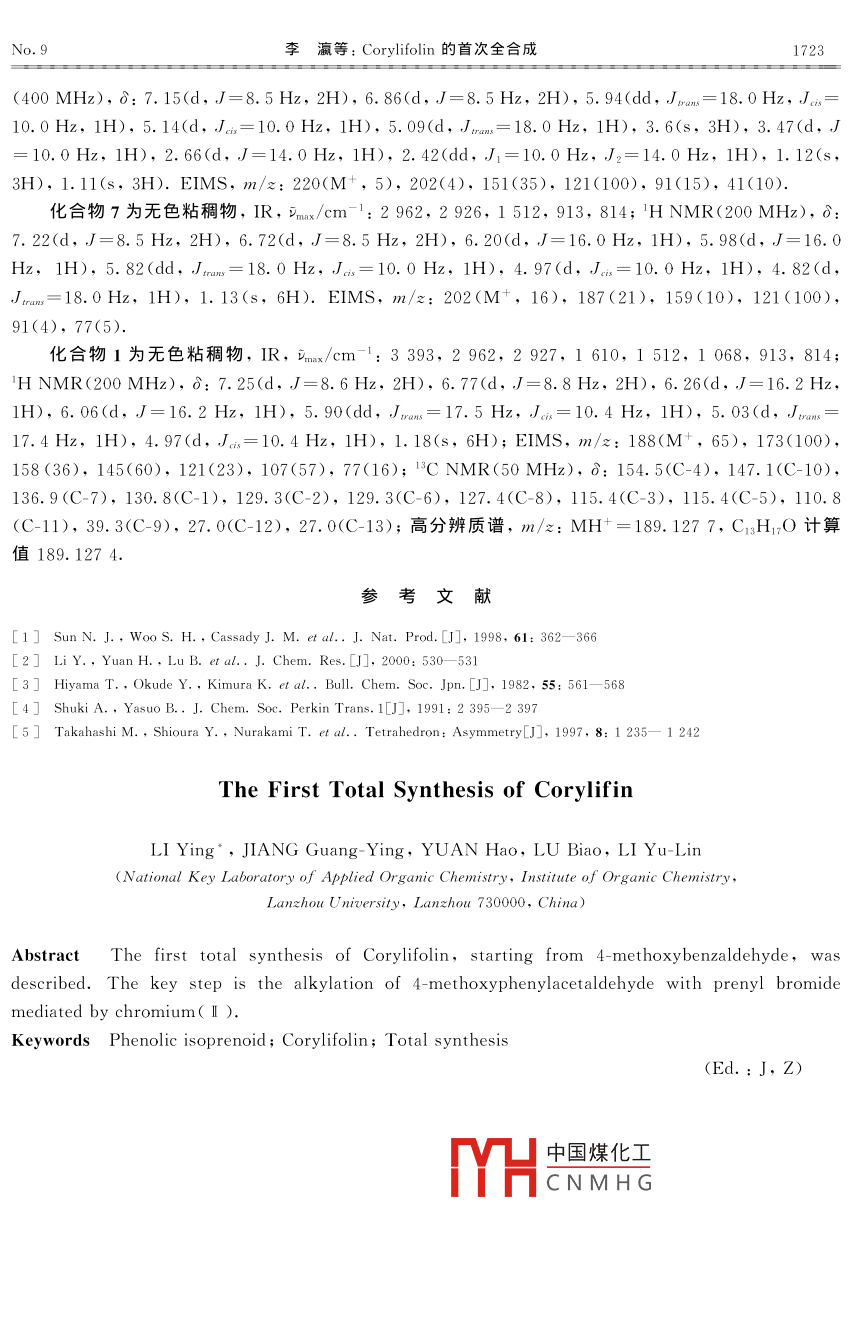 Vol.23高等學(xué)?;瘜W(xué)學(xué)報No.9.2002年9月CHEMICAL JOURNAL OF CHINESE UNIVERSITIES1722~ 1723[研究簡報]Corylifolin的首次全合成李瀛,蔣光英,袁昊,陸標(biāo),李裕林(蘭州大學(xué)應(yīng)用有機(jī)化學(xué)國家重點(diǎn)實(shí)驗(yàn)室,有機(jī)化學(xué)研究所,蘭州730000)關(guān)鍵詞類 異戊二烯酚; Corylifolin, 全合成中圖分類號O624. 32文獻(xiàn)標(biāo)識碼A文章編號0251-0790(2002)09- 1722-02類異戊二烯酚類化合物Corylifolin(1)是由Snapka 等]于1998 年從豆科植物PsoraleaCorylifolia中分離得到的天然產(chǎn)物,其結(jié)構(gòu)已由波譜學(xué)和化學(xué)方法確定,一同分離的還有化合物Bakuchio(2).植物PsoraleaCorylifolia是廣泛分布于中國和印度的豆科類植物,藥理實(shí)驗(yàn)研究表明,此植物對Streptococcus 和Paramecium等具有很高的活性,因此它作為民間藥材被長期使用.化合物Corylifolin(1)和Bakuchio(2)具有類似的化學(xué)結(jié)構(gòu)及生物活性,是有效的DNA復(fù)制聚合酶的抑制劑,而且具有抗腫瘤和抗誘變作用.化合物Corylifolin(1)的合成工作尚未見報道.我們曾采用鉻( I )參與的Barier Grignard反應(yīng)構(gòu)筑季碳,完成了天然產(chǎn)物Sporochnol A的合成凹],在這里,我們繼續(xù)用此法合成Corylifolin(1),反應(yīng)式如Scheme 1所示.OMeCHOMeO'(3)MeO4)HO.Me0"<6)(7HO(1)Scheme 1 The synthetic route of corylifolinReagents and conditions: a. Ph3PCH2OCHzCl, n BuLi, yield 76%. b. 3 mol/L HCI, THF,reflux, yield 89%. c. (i) CrCls.LiAlH,THF; (i) Prenyl Bromide, DMF. yield 83%. d. (i) MsCI, Pyridine; (i) i-BuOK, DMSO, 80 C. yield 75%.e. CHsMgI, Et2O, 180 C, yield 78%.茴香醛通過wittig 反應(yīng)得到烯醇醚4,再經(jīng)3 mol/L酸酸化水解得到對甲氧基苯乙醛5,醛5在鉻( I )作用下與異戊烯基溴發(fā)生Barier Grignard反應(yīng)3,以83%的收率得到化合物醇6,醇6經(jīng)甲磺?;Wo(hù)與t_BuOK作用消除甲磺酰酯得到化合物75'中國煤化江下脫除甲氧基保護(hù)叫后就得到目標(biāo)產(chǎn)物Corylifolin(1),總收率32%.本合成MYHCNMHc過IR.MS及HNMR的確證.化合物6為無色粘稠物,IR, max/cm-': 3 439,2 960, 2 871, 1 512,1 246,913, 817; H NMR收稿日期: 2001-07-03.基金項(xiàng)目:國家高等學(xué)校骨干教師基金資助.聯(lián)系人簡介:李瀛(1954年出生), 男,博士,教授,博士生導(dǎo)師,從事有機(jī)合成化學(xué)研究. E-mail: liyl@ lzu. edu.cnNo.9李瀛等: Corylifolin 的首次全合成1723(400 MHz), δ: 7.15(d, J=8.5Hz, 2H), 6. 86(d, J=8.5 Hz, 2H), 5. 94(dd, Jwam=18.0Hz, Jes=10.0Hz,1H),5. 14(d, Ja=10.0Hz, 1H),5. 09(d, Jmam=18.0 Hz,1H),3.6(s,3H), 3. 47(d, J=10.0Hz,1H),2. 66(d, J=14.0Hz,1H), 2.42(dd,J=10.0Hz, J2=14.0 Hz,1H),1.12(s,3H),1.11(s,3H). EIMS, m/z: 220(M+, 5), 202(4),151(35), 121(100),91(15),41(10).化合物7為無色粘稠物,IR, Dmx/cm-': 2 962, 2926, 1 512, 913, 814; 'H NMR(200 MHz), δ:7. 22(d, J=8.5Hz, 2H),6.72(d, J=8.5Hz, 2H),6.20(d, J=16.0Hz,1H),5. 98(d, J=16.0Hz,1H),5. 82(dd, Jmm=18.0 Hz, J..=10.0 Hz, 1H), 4. 97(d, J..=10.0 Hz, 1H), 4. 82(d,Jmum=18.0Hz,1H),1. 13(s,6H). EIMS, m/z: 202(M+,16),187(21), 159(10), 121(100),91(4),77(5). .化合物1為無色粘稠物,IR, mmx/cm-': 3 393,2 962,2 927,1 610, 1 512,1 068, 913,814;'H NMR(200 MHz), δ: 7.25(d, J=8.6Hz, 2H), 6. 77(d, J=8.8Hz, 2H), 6.26(d, J=16.2 Hz,1H),6. 06(d, J=16.2 Hz,1H), 5. 90(dd, Jwm=17.5 Hz, J.n=10.4 Hz, 1H),5. 03(d, Jwms=17.4 Hz,1H), 4.97(d, Js=10.4 Hz, 1H),1. 18(s,6H); EIMS, m/z: 188(M+,65),173(100),158 (36), 145(60),121(23), 107(57), 77(16); 1C NMR(50 MHz),8: 154. 5(C-4),147. 1(C- 10),136. 9(C-7),130. 8(C-1),129. 3(C-2),129. 3(C-6),127. 4(C-8),115. 4(C-3),115. 4(C-5),110.8(C-11), 39. 3(C-9),27. 0(C-12), 27.0(C-13);高分辨質(zhì)譜,m/z: MH+=189. 127 7, C.H;O計算值189. 127 4.參考文獻(xiàn)[1] SunN. J,WooS. H.,Cassady J. M. etal.. J. Nat. Prod.[J], 1998, 61: 362- -366[2] Li Y., YuanH. LuB. etal.. J. Chem. Res.0],2000: 530- -531[3] Hiyama T.. Okude Y.,Kimura K. etal.. Bull. Chem. Soc. Jpn.[J], 1982, 55: 561-568[4] Shuki A., YasuoB.. J. Chem. Soc. Perkin Trans. 1[J], 1991: 2395- 2 397[5] Takahashi M.,Shioura Y.,Nurakami T. et al.. Tetrahedron: Asymmetry[J], 1997, 8: 1 235- 1 242The First Total Synthesis of CorylifinLI Ying°,JIANG Guang- Ying,YUAN Hao, LU Biao, LI Yu-Lin(National Key Laboratory of Applied Organic Chemistry, Institute of Organic Chemistry,Lanzhou University, Lanzhou 730000, China)AbstractThe first total synthesis of Corylifolin, starting from 4- methoxy benzaldehyde, wasdescribed. The key step is the alkylation of 4-methoxyphenylacetaldehyde with prenyl bromidemediated by chromium( I ).Keywords Phenolic isoprenoid; Corylifolin; Total synthesis(Ed. : J, Z)中國煤化工MYHCNMHG