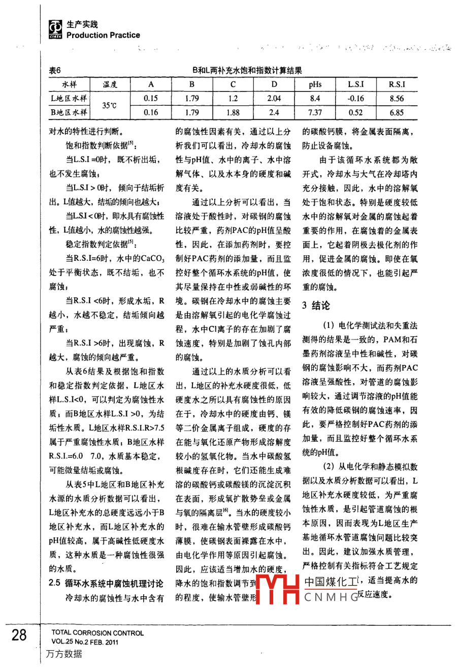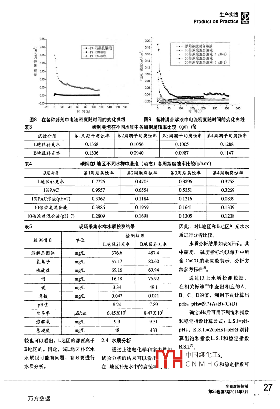 生產(chǎn)實(shí)踐Production Practice循環(huán)水管道腐蝕原因分析楊培燕′張繼恒2顧寶珊’李黎'董小冬2劉汝平2楊國賢2(1.中國鋼研科技集團(tuán)有服公司先進(jìn)金屬材料涂鍍國家工程實(shí)驗(yàn)室,北京100081;2.廊坊天海高壓容器有限公司,河北廊坊065000摘要:用室內(nèi)模擬實(shí)驗(yàn)、電化學(xué)實(shí)驗(yàn)、水質(zhì)分析、腐蝕產(chǎn)物的成分分析和XRD分析等方法,對某壓力容器廠碳鋼循環(huán)水管道腐蝕穿孔原因進(jìn)行了分析。結(jié)果表明:碳鋼在冷卻水中的腐蝕主要是由溶解氧引起的電化學(xué)腐蝕,腐蝕的主要原因是,該廠補(bǔ)充水源為嚴(yán)重腐蝕性水。關(guān)鍵詞:循環(huán)水系統(tǒng)腐蝕原因水質(zhì)分析腐蝕性水中圖分類號(hào):TG1725文獻(xiàn)標(biāo)識(shí)碼:A文章編號(hào):10087818(2011)020023-07Causes of Corrosion in the circulating Water SystemYANG Pei-yan, ZHANG Jiheng, GU Bao-shan, LILi, DONG Xiao-dong LIU RUHping YANG Guo-X(1. National Engineering Laboratory for Advanced Coatings Technology of Metal Material, China IronSteel Research Institute Group, Beijing 100081, China2. Lang Fang Tian Hai High Pressure Container Co, Ltd, Langfang 065000, China)Abstract: The causes of corrosion in the circulating water system at Langfang plant have been studiedby means of rotary coupon corrosion tests, linear polarization, water quality research, X-ray diffraction(XRD) and scanning electron microscope(SEM). The results demonstrated that the corrosion of steelcarbon in the circulating water system was caused mainly by the electrochemical corrosion of dissolvedoxygen in the water. The main reason of corrosion was that the added water in recycling circulating watersystems was the corrosive water.Key words: circulating water system; corrosion cause; water quality research; corrosive water0引言量也越來越高,循環(huán)水管道腐蝕年以上,沒有明顯腐蝕現(xiàn)象發(fā)生。問題逐漸突出。隨著我國水資源的日益貧由于B地區(qū)的補(bǔ)充水源為該乏,工廠對節(jié)約用水的意識(shí)也在某壓力容器有限公司是一家地區(qū)深井水,而L地區(qū)的補(bǔ)充水源逐漸增強(qiáng),因此,循環(huán)冷卻水成為生產(chǎn)高壓容器的廠家,該公司在B為該地區(qū)自來水,因此,本文通大部分工廠用水量的主要組成部地區(qū)和L地區(qū)有兩個(gè)生產(chǎn)基地,兩過對L地區(qū)的腐蝕管道進(jìn)行失效分分,工業(yè)冷卻水循環(huán)后,雖然大個(gè)生產(chǎn)基地的循環(huán)水管道材質(zhì)基本析,對B和L兩地區(qū)的水質(zhì)進(jìn)行分幅度地節(jié)約了用水量,但從技術(shù)相同,L地區(qū)的設(shè)備2008年初投入析,以及腐蝕試驗(yàn)對比,對管道使用,管道使用7個(gè)月,進(jìn)行維護(hù)腐蝕的原因和機(jī)理進(jìn)行了研究和和管理上對設(shè)備運(yùn)營提出更高的要求。特別是近年來隨著補(bǔ)充水檢修時(shí)發(fā)現(xiàn)循環(huán)水管路發(fā)生了較嚴(yán)探討,在此基礎(chǔ)上對今后如何減質(zhì)的逐年惡化,循環(huán)水中的雜質(zhì)含重的腐蝕,而B地區(qū)的設(shè)或防止此類腐蝕的發(fā)生提出了中國煤化工作者簡介:楊培燕(1978-),女,碩士,工程師,主要CNMH作全面腐蝕控制23第25卷第2期2011年2月生產(chǎn)實(shí)踐Production Practice建議公司提供的自來水或試驗(yàn)室去離旋轉(zhuǎn)速度大約40轉(zhuǎn)min,懸掛時(shí)1試驗(yàn)方法子水配制。三電極系統(tǒng)浸泡在試間分為四個(gè)周期,每個(gè)周期間隔驗(yàn)介質(zhì)中,電極與金屬腐蝕測試18天。1.1腐蝕產(chǎn)物分析儀的對應(yīng)接頭連接,并使用定時(shí)14水質(zhì)分析首先通過現(xiàn)場觀察以及現(xiàn)巡回?cái)?shù)據(jù)記錄儀打印記錄研究電循環(huán)水系統(tǒng)中,最可能出現(xiàn)場拆卸下來的腐蝕試樣的宏觀觀極的極化電流,通過測定極化電的問題就是結(jié)垢和腐蝕問題,因察,對管道的腐蝕程度以及形貌流的變化,確定極化阻率和腐蝕此,必須先對循環(huán)冷卻水水質(zhì)進(jìn)進(jìn)行初步了解,由于管內(nèi)璧油污速率。行分析,主要考慮pH值、鈣硬較嚴(yán)重,為便于進(jìn)一步清晰觀13室內(nèi)模擬試驗(yàn)度、總堿度、水溫、總?cè)芙夤腆w察,對某些管壁進(jìn)行了清洗。最用靜態(tài)掛片失重試驗(yàn)和動(dòng)態(tài)旋五個(gè)重要因素,判斷水質(zhì)的基本后選取較為典型的腐蝕部位,利轉(zhuǎn)掛片試驗(yàn)測定水樣的侵蝕性依據(jù)采用飽和指數(shù)LSI和穩(wěn)定指用掃描電子顯微鏡(SEM)對表試片為Q235-B的標(biāo)準(zhǔn)腐蝕試片數(shù)R.S,本研究主要研究了該公面腐蝕產(chǎn)物進(jìn)行微觀形貌觀察與(40mm×20m×3.5mm)。試司補(bǔ)充水的水質(zhì)能譜分析,取有代表性的腐蝕產(chǎn)驗(yàn)溫度為40℃±1℃,試驗(yàn)介質(zhì)為其中硬度、堿度指標(biāo)均以每物部位,采用XRay衍射儀(XRD)在L地區(qū)和B地區(qū)現(xiàn)場采集水樣及升中所含CaCO的毫克數(shù)表示進(jìn)行定性分析模擬現(xiàn)場情況,根據(jù)研究需要實(shí)分析方法參考標(biāo)準(zhǔn)。12電化學(xué)試驗(yàn)驗(yàn)室所配制的溶液。采用同種材料三電極體系進(jìn)2試驗(yàn)結(jié)果與討論靜態(tài)模擬試驗(yàn):試驗(yàn)時(shí)毎個(gè)行線性極化,用自凝牙托粉封裝容器內(nèi)掛三個(gè)試片,計(jì)算平均腐21腐蝕產(chǎn)物分析碳鋼試片暴露面積為1.0cm,蝕率,常壓開口條件;懸掛時(shí)間選取較為典型