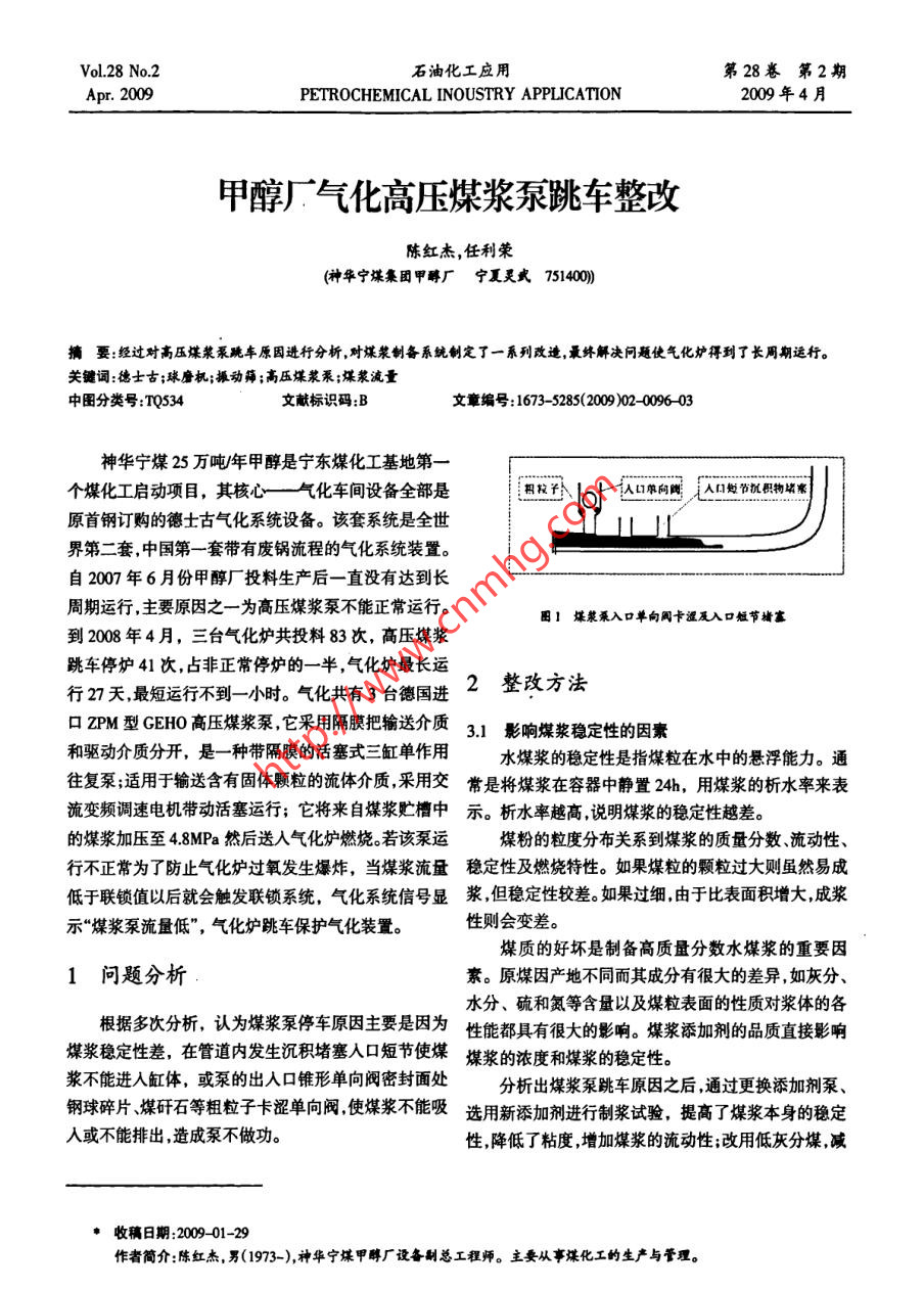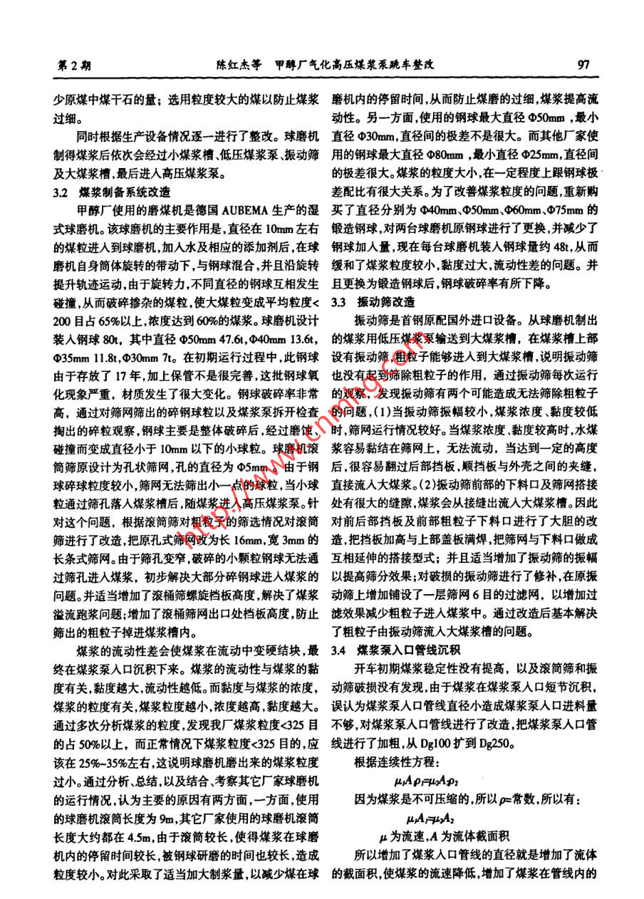 Vol.28 No.2石油化工應(yīng)用.第28卷第2期Apr.2009PETROCHEMICAL INOUSTRY APPLICATION2009年4月甲醇廠氣化高壓煤漿泵跳車整改陳紅杰,任利榮(神華寧煤集團甲醇廠寧夏靈武 751400)摘要:經(jīng)過對高壓煤漿泵跳車 原因進行分析,對謀漿制備系統(tǒng)制定了一系列改造,最終解決問題使氣化爐得到了長周期運行。關(guān)鍵詞:德士古;球磨機;振動篩;高壓煤漿泵;煤漿流量中圖分類號:TQ534文獻標識碼:B文章編號:1673- -5285(2009)02. 0096-03神華寧煤25萬噸/年甲醇是寧東煤化工基地第一個煤化工啟動項目,其核心一氣化車間設(shè)備全部是相救子\ I人口單向閥I人口處節(jié)猶職物靖寒原首鋼訂購的德士古氣化系統(tǒng)設(shè)備。該套系統(tǒng)是全世界第二套,中國第-套帶有廢鍋流程的氣化系統(tǒng)裝置。自2007年6月份甲醇廠投料生產(chǎn)后-直沒有達到長周期運行,主要原因之一為高壓煤漿泵不能正常運行。團1煤漿乘入口單向閥卡澀及入口短節(jié)堵塞到2008年4月,三臺氣化爐共投料83次,高壓煤漿跳車停爐41次,占非正常停爐的- -半,氣化爐最長運2整改方法行27天,最短運行不到一-小時。氣化共有3臺德國進口ZPM型GEHO高壓煤漿泵,它采用隔膜把輸送介質(zhì)3.1影響煤漿穩(wěn)定性的因素和驅(qū)動介質(zhì)分開,是- -種帶隔膜的活塞式三缸單作用水煤漿的穩(wěn)定性是指煤粒在水中的懸浮能力。通往復(fù)泵;適用于輸送含有固體顆粒的流體介質(zhì),采用交常是將 煤漿在容器中靜置24h,用煤漿的析水率來表流變頻調(diào)速電機帶動活塞運行;它將來自煤漿貯槽中示。 析水率越高,說明煤漿的穩(wěn)定性越差。的煤漿加壓至4.8MPa然后送人氣化爐燃燒。若該泵運煤粉的粒度分布關(guān)系到煤漿的質(zhì)量分數(shù)、流動性、行不正常為了防止氣化爐過氧發(fā)生爆炸,當煤漿流量穩(wěn)定性及燃燒特性。 如果煤粒的顆粒過大則雖然易成低于聯(lián)鎖值以后就會觸發(fā)聯(lián)鎖系統(tǒng),氣化系統(tǒng)信號顯漿,但穩(wěn)定性較差。如果過細,由于比表面積增大,成漿示“煤漿泵流量低”,氣化爐跳車保護氣化裝置。性則會變差。煤質(zhì)的好壞是制備高質(zhì)量分數(shù)水煤漿的重要因1問題分析素。原煤因產(chǎn)地不同而其成分有很大的差異,如灰分、水分、硫和氮等含量以及煤粒表面的性質(zhì)對漿體的各根據(jù)多次分析,認為煤漿泵停車原因主要是因為性能都具有很大的影響。煤漿添加劑的品質(zhì)直接影響煤漿穩(wěn)定性差,在管道內(nèi)發(fā)生沉積堵塞人口短節(jié)使煤煤漿的濃度和煤漿的穩(wěn)定性。漿不能進人缸體,或泵的出人口錐形單向閥密封面處分析出煤漿泵跳車原因之后,通過更換添加劑泵、鋼球碎片、煤矸石等粗粒子卡澀單向閥,使煤漿不能吸選用新添加劑進行制漿試驗,提高了煤漿本身的穩(wěn)定人或不能排出,造成泵不做功。性,降低了粘度,增加煤漿的流動性;改用低灰分煤,減●收稿日期:2009 -01-29作者簡介:陳紅杰,男(1973-),神華寧煤甲醇廠設(shè)備制總工程師。主要從事煤化工的生產(chǎn)與管理。第2期陳紅杰等甲醇廠 氣化高壓煤漿泵跪車整改97少原煤中煤干石的量;選用粒度較大的煤以防止煤漿磨機內(nèi) 的停留時間,從而防止煤磨的過細,煤漿提高流過細。動性。另一方面,使用的鋼球最大直徑φ50mm ,最小同時根據(jù)生產(chǎn)設(shè)備情況逐一進行了整改。 球磨機直徑 φ30mm,直徑間的極差不是很大。而其他廠家使制得煤漿后依次會經(jīng)過小煤漿槽低壓煤漿泵、振動篩用的鋼球最大 直徑φ80mm ,最小直徑φ25mm,直徑間及大煤漿槽,最后進入高壓煤漿泵。的極差很大。煤漿的粒度大小,在一定程度上跟鋼球極3.2 煤漿制備系統(tǒng)改造差配比有很大關(guān)系。為了改善煤漿粒度的問題,重新購甲醇廠使用的磨煤機是德國AUBEMA生產(chǎn)的濕買了 直徑分別為040mm、中50mm、960mm、φ75mm的式球磨機。該球磨機的主要作用是,直徑在10mm左右鍛造鋼球 ,對兩臺球磨機原鋼球進行了更換,并減少了的煤粒進入到球磨機,加人水及相應(yīng)的添加劑后,在球鋼球加入量 ,現(xiàn)在每臺球磨機裝人鋼球量約48t,從而磨機自身簡體旋轉(zhuǎn)的帶動下,與鋼球混合并且沿旋轉(zhuǎn)緩和了煤漿粒度較小,黏度過大,流動性差的問題。并提升軌跡運動,由于旋轉(zhuǎn)力,不同直徑的鋼球互相發(fā)生且更換 為鍛造鋼球后,鋼球破碎率有所下降。碰撞,從而破碎摻雜的煤粒,使大煤粒變成平均粒度< 3.3 振動篩改造200目占65%以上,濃度達到60%的煤漿。球磨機設(shè)計振動篩是1首鋼原配國外進口設(shè)備。從球磨機制出裝入鋼球80t,其中直徑φ50mam 47.6t,040mm 13.6t,的煤漿用低壓煤漿泵輸送到大煤漿槽, 在煤漿槽上部φ35mm 1.8,30mm 7t。在初期運行過程中,此鋼球設(shè)有 振動篩,粗粒子能夠進入到大煤漿槽,說明振動篩由于存放了17 年,加上保管不是很完善,這批鋼球氧也沒有起到篩 除粗粒子的作用,通過振動篩每次運行化現(xiàn)象嚴重,材質(zhì)發(fā)生了很大變化。鋼球破碎率非常的觀察, 發(fā)現(xiàn)振動篩有兩個可能造成無法篩除粗粒子高。通過對篩網(wǎng)篩出的碎鋼球粒以及煤漿泵拆開檢查的問題 , (1)當振動篩振幅較小,煤漿濃度、黏度較低掏出的碎粒觀察.鋼球主要是整體破碎后經(jīng)過磨蝕、時, 篩網(wǎng)運行情況較好。當煤漿濃度、黏度較高時,水煤碰撞