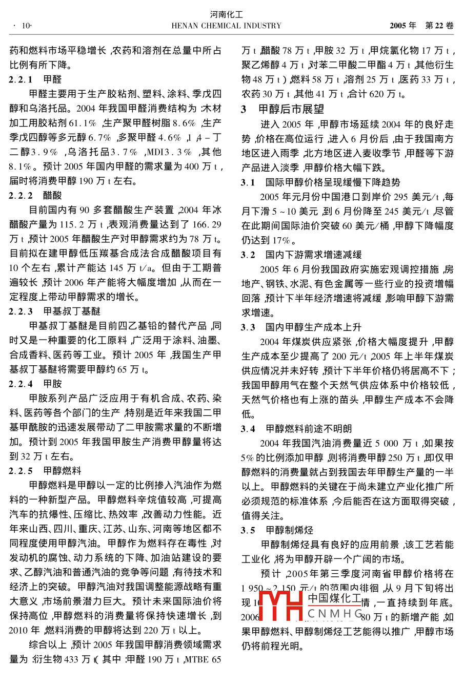 第9期袁志鋒等甲醇市場分析甲醇市|場|分析袁志鋒,吳成魁21.濮陽市甲醇廠,河南濮陽457000;2.南陽石蠟精細(xì)化工廠,河南南陽473132)摘要炌介紹了國內(nèi)外甲醇市場的生產(chǎn)和消費(fèi)狀況分析了未來甲醇市場趨勢。關(guān)鍵詞押醇;生產(chǎn);市場分析中圖分類號(hào)Q223.1文獻(xiàn)標(biāo)識(shí)碼文章編號(hào)1003-3467(2005)9-000-0Market Analysis of MethanolYUAN Zhi-feng, wu Cheng-kui(1. Puyang Methanol Plant Puyang 457000, China 2 Nanyang Wax Fine Chemical Plant Nanyang 473132 ChinaAbstract The production and consumption of methanol at home and abroad in recent years are intro-duced. The production consumption and market trend in the future of methanol at home are analyzedKey words methanol production market analysis1國際甲醇市場狀況歐、亞洲甲醇供不應(yīng)求主要依賴進(jìn)口。11國際甲醇生產(chǎn)狀況目前在世界甲醇消費(fèi)結(jié)構(gòu)中,占居第一位的仍世界甲醇生產(chǎn)主要分布在北美、拉丁美洲、中是甲醛,約占35%~36%;其次為甲基叔丁基醚東、東亞、東歐、西歐、大洋洲及非洲等地美洲是世(MTBE)為約占27%;第三位為醋酸,約占7%界上最大的甲醇生產(chǎn)地,占世界總產(chǎn)能的39%其9%其他衍生物包括對(duì)苯二甲酸二甲酯、甲基丙烯中北美占世界總產(chǎn)能的16%拉丁美洲占23%亞酸甲酯、甲胺、溶劑和防凍劑約占28%。2010年前洲占世界總產(chǎn)能的30%其中中東占17%東亞占全球甲醇需求增長速度預(yù)計(jì)為2.4%醋酸增長速13%歐洲總產(chǎn)能約為882萬t,占世界總產(chǎn)能的度將達(dá)到5.2%世界MTBE需求將減少6%左右。21%東歐占11%,西歐占10%;洋洲占6%;非2我國甲醇市場現(xiàn)狀洲占4%。目前世界甲醇生產(chǎn)主要以大型化為主,2.1國內(nèi)甲醇主要生產(chǎn)狀況其中規(guī)模大于30萬t/a的裝置合計(jì)生產(chǎn)能力可達(dá)我國現(xiàn)有甲醇生產(chǎn)企業(yè)200多家,以煤炭為主3271萬t占世界總產(chǎn)能的79%要原料的生產(chǎn)廠家占到70%其他以天然氣、焦?fàn)t國外甲醇生產(chǎn)企業(yè)主要以天然氣為原料2002氣、渣油等為原料總體來說我國甲醇生產(chǎn)企業(yè)產(chǎn)年產(chǎn)能3914萬t2003年產(chǎn)能達(dá)到4061萬t2004能普遍偏低我國2002年產(chǎn)能445.3萬t2003年年產(chǎn)能4141萬t預(yù)計(jì)2005年生產(chǎn)能力達(dá)4294萬產(chǎn)能600萬t2004年產(chǎn)能740萬t。在國內(nèi)產(chǎn)能不t2006年生產(chǎn)能力達(dá)4695萬t。從2005~209斷增加的情況下國內(nèi)甲醇產(chǎn)量迅速增加2000年年5年內(nèi)全球?qū)⑿略霎a(chǎn)能1800萬t預(yù)計(jì)2007年為198.69萬t2004年達(dá)到440.65萬t2005年1將岀現(xiàn)產(chǎn)能過剩這種情況將持續(xù)到2010年直至5月份全國產(chǎn)量213.9萬t預(yù)計(jì)全年產(chǎn)量將達(dá)到完成甲醇產(chǎn)能新的結(jié)構(gòu)性調(diào)整。550萬t1.2國際甲醇消費(fèi)分布及構(gòu)成2.2我國甲醇消費(fèi)現(xiàn)狀從總體來講目前世界甲醇供需基本平衡但不田醇襠蟲瓴域主賈為化學(xué)合成燃料和溶劑等。同地區(qū)情況各異。甲醇的需求主要集中在北美、西中國煤化工甲醇衍生物60.5%歐、東南亞、東北亞和中國。目前加拿大、拉丁美洲、燃CNMH藥7.9%農(nóng)藥4.7%東歐、中東、非洲、大洋洲甲醇供大于求而美國、西其他9.6%。近年來用醇衍生物生產(chǎn)發(fā)展迅速醫(yī)收稿日期2005-07作者簡介袁志鋒(1970-)男經(jīng)濟(jì)師從事企業(yè)管理電話(0393)4615775轉(zhuǎn)2030河南化工HENAN CHEMICAL INDUSTRY2005年第22卷藥和燃料市場平穩(wěn)增長農(nóng)藥和溶劑在總量中所占萬t醋酸τ8萬t甲胺32萬t甲烷氯化物1萬t比例有所下降。聚乙烯醇4萬t對(duì)苯二甲酸二甲酯4萬t其他衍生2.2.1甲醛物48萬t)燃料58萬t溶劑25萬t醫(yī)藥33萬t,甲醛主要用于生產(chǎn)膠粘劑、塑料、涂料、季戊四農(nóng)藥30萬t其他41萬t合計(jì)620萬t。醇和烏洛托品。2004年我國甲醛消費(fèi)結(jié)構(gòu)為沐材3甲醇后市展望加工用膠粘劑61.1%生產(chǎn)聚甲醛樹脂8.6%生產(chǎn)進(jìn)入2005年甲醇市場延續(xù)2004年的良好走季戊四醇等多元醇6.7%多聚甲醛4.6%l4-丁勢價(jià)格在高位運(yùn)行進(jìn)入6月份后由于我國南方二醇3.9%,烏洛托品3.7%,MDI3.3%,其他地區(qū)進(jìn)入雨季北方地區(qū)進(jìn)入麥?zhǔn)占竟?jié)甲醛等下游8.1%。預(yù)計(jì)2005年國內(nèi)甲醛的需求量為400萬t,產(chǎn)品進(jìn)入淡季甲醇價(jià)格大幅下跌屆時(shí)將消費(fèi)甲醇190萬t左右。3.1國際甲醇價(jià)格呈現(xiàn)緩慢下降趨勢2.2.2醋酸2005年元月份中國港口到岸價(jià)295美元/t每目前國內(nèi)有90多套醋酸生產(chǎn)裝置2004年冰月下滑5~10美元到6月份降至245美元/t盡管醋酸產(chǎn)量為115.2萬t表觀消費(fèi)量達(dá)到了166.29在此期間國際油價(jià)突破60美元/桶,甲醇下降幅度萬t預(yù)計(jì)2005年醋酸生產(chǎn)對(duì)甲醇需求約為78萬t。仍達(dá)到17%。目前擬在建甲醇低壓羰基合成法合成醋酸項(xiàng)目有3.2國內(nèi)下游需求增速減緩」10個(gè)左右,累計(jì)產(chǎn)能達(dá)145萬ta。但由于工期普2005年6月份我國政府實(shí)施宏觀調(diào)控措施房遍較長預(yù)計(jì)2006年產(chǎn)能將大幅度增加從而在一地產(chǎn)、鋼鐵、水泥、有色金屬等一些行業(yè)的投資增幅定程度上帶動(dòng)甲醇需求的增長回落預(yù)計(jì)下半年經(jīng)濟(jì)增速將減緩影響甲醇下游需2.2.