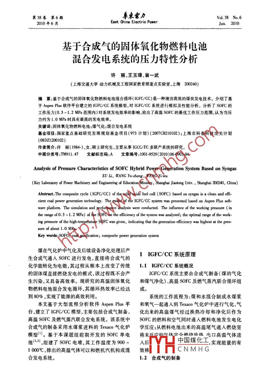 基于合成氣的固體氧化物燃料電池混合發(fā)電系統(tǒng)的壓力特性分析