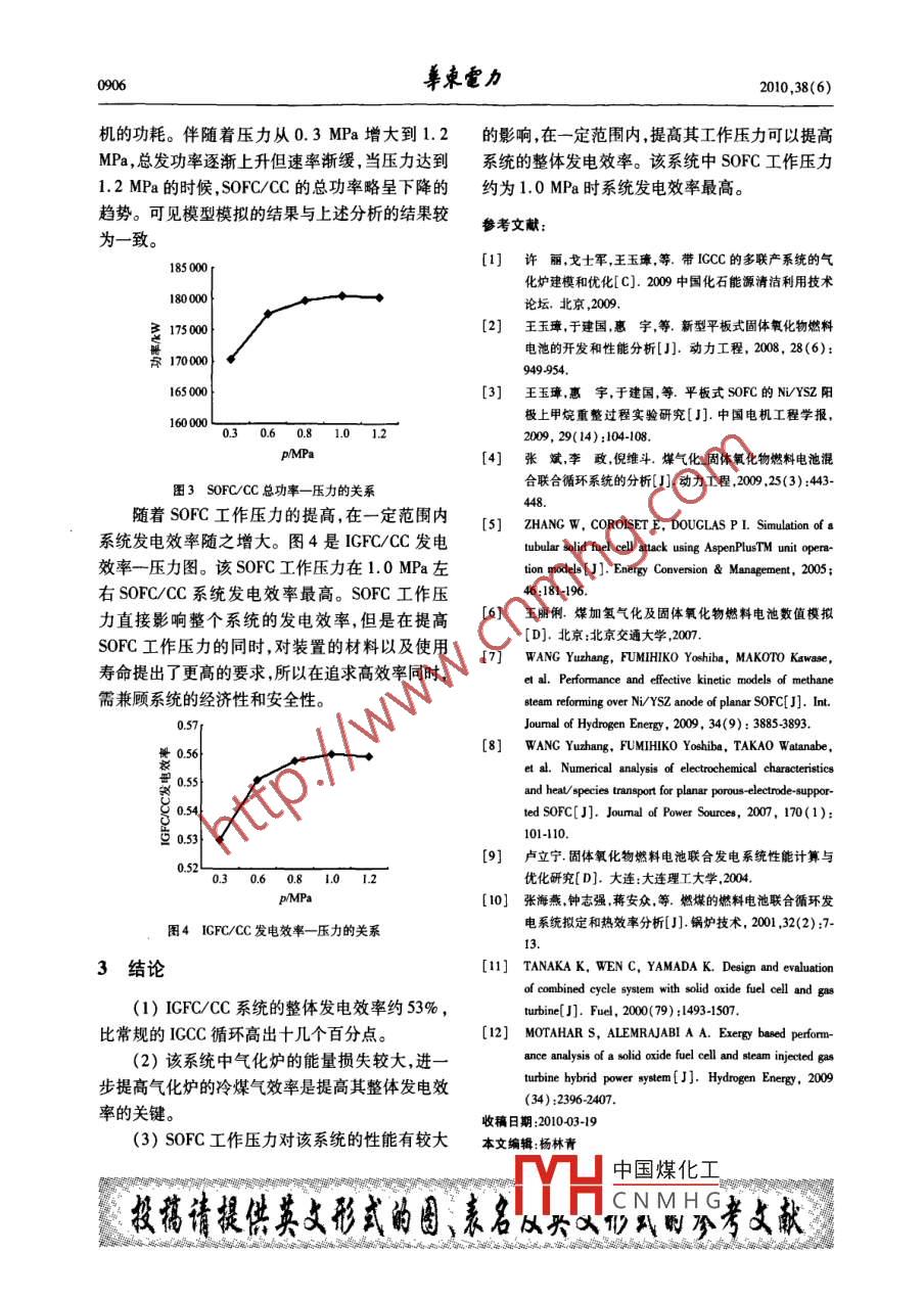 第38卷第6期阜束電力Vol 38 No 62010年6月East China Electric PowerJun.2010基于合成氣的固體氧化物燃料電池混合發(fā)電系統(tǒng)的壓力特性分析許麗,王玉璋,翁一武(上海交通大學(xué)動(dòng)力機(jī)械及工程國(guó)家教育部重點(diǎn)實(shí)驗(yàn)室,上海200240)摘要:基于合成氣的固體氧化物燃料電池混合循環(huán)( IGFC/CC)是一種清潔高效的煤炭發(fā)電技術(shù)。介紹了基于 Aspen Plus軟件平臺(tái)建立的 IGFC/CC系統(tǒng)模型,對(duì) IGFC/CC系統(tǒng)進(jìn)行模擬及性能分析。分析了SOFC工作壓力(0.3-1.2MPa范圍內(nèi))對(duì)系統(tǒng)發(fā)電效率的影響,給出了高溫SOFC的最優(yōu)工作壓力范圍,認(rèn)為當(dāng)力約為10MPa時(shí)具有最高的發(fā)電效率。關(guān)鍵詞:固體氧化物燃料電池;煤氣化;混合發(fā)電系統(tǒng)基金項(xiàng)目:國(guó)家重點(diǎn)基礎(chǔ)研究發(fā)展規(guī)劃基金項(xiàng)目(973計(jì)劃)(2007CB210102);上海市科委科技攻關(guān)計(jì)劃(08DZ1200102)作者簡(jiǎn)介:許麗(1984-),女,碩士研究生,主要從事 IGCC/FC多聯(lián)產(chǎn)系統(tǒng)的研究。中圖分類號(hào):TM911.47文獻(xiàn)標(biāo)志碼:A文章編號(hào):10019529(2010)060903404Analysis of Pressure Characteristics of SOFC Hybrid Power Generation System Based on SyngasXU L, WANG Yu-zhang, WENG Yi-wuKey Laboratory of Power Machinery and Engineering of Education Ministry, Shanghai Jiaotong Univ, Shanghai 200240, ChinaAbstract: The composite cycle (IGFC/CC)of the solid oxide fuel cell( SOFC) based on syngas is a clean and effi-cient coal power generation technology. The model of the IGFC/CC system was presented based on Aspen Plus soft-ware platform. The simulation and performance analysis were conducted. The influence of the working pressure( inthe range of 0. 3-1 2 MPa)of the SOFC on the efficiency of the system was analyzed; the optimal range of the work-ing pressure of the high-temperature SOFC was given, indicating that the generation efficiency was highest at the pres-sure of about 1.0 MPaKey words: SOFC; coal gasification; composite power generation system煤在氣化爐中氣化及后續(xù)設(shè)備凈化處理后產(chǎn)生合成氣通入SOFC進(jìn)行發(fā)電,直接將合成氣的1IGFC/CC系統(tǒng)原理化學(xué)能轉(zhuǎn)化為電能,其過(guò)程從根本上改變了傳統(tǒng)1.1IGFC/CC系統(tǒng)概況的固體煤直接燃燒發(fā)電的模式,該過(guò)程既不會(huì)產(chǎn)1GFC/CC系統(tǒng)主要由合成氣制備(煤的氣化生污染,又具備高效率?,F(xiàn)研究的高溫固體氧化和煤氣凈化)、高溫SOFC及燃?xì)庹羝?lián)合循環(huán)組物燃料電池混合發(fā)電循環(huán),其循環(huán)熱效率已經(jīng)達(dá)成。到80%,實(shí)現(xiàn)了能源的高效利用。系統(tǒng)的工作流程為:煤和水混合制成水煤漿本文基于大型流程分析軟件 Aspen Plus平和氧氣一起通入到 Texaco氣化爐中進(jìn)行氣化,氣臺(tái),建立了IGFC/CC模型,主要包括合成氣制備、化出來(lái)的高溫煤氣經(jīng)過(guò)換熱冷卻和凈化后作為高溫SOFC及燃?xì)庹羝?lián)合發(fā)電系統(tǒng)。該系統(tǒng)中SOFC的燃料和空氣同時(shí)通入燃料電池發(fā)生電化合成氣的制備采用水煤漿進(jìn)料的 Texaco氣化爐學(xué)反應(yīng);從燃料電池出來(lái)的高溫尾氣通入燃燒室模型口?;诒菊n題組前期開(kāi)發(fā)的SOFC單電將未反應(yīng)的氣休宗仝桃檔前執(zhí)出口高溫氣體進(jìn)23),組建了SOFC電堆,其工作溫度為900池入后中國(guó)煤化工實(shí)現(xiàn)能量的有1000℃排出的高溫氣體可以和燃機(jī)汽機(jī)構(gòu)成混效梯CNMHG合發(fā)電系統(tǒng)。1.2合成氣的制備0904束電力010,38(6)進(jìn)入SOFC發(fā)電的合成氣制備主要分為兩該模型為了較為清晰的描述高溫SOFC整個(gè)工作步:煤在 Texaco氣化爐的氣化和后續(xù)的煤氣凈過(guò)程,將實(shí)際過(guò)程中同時(shí)進(jìn)行的置換反應(yīng)和電化化。 Texaco氣化爐采用水煤漿進(jìn)料的方式。原煤學(xué)反應(yīng)分兩步處理:首先凈化后的合成氣和循和水、添加劑、石灰石、氨水等混合制成濃度約環(huán)氣混合通入SHHT模塊進(jìn)行置換反應(yīng),將煤氣65%的水煤漿,經(jīng)高壓煤漿泵加壓后與高壓氧氣中的CO轉(zhuǎn)化為H2,然后通入到燃料電池的陽(yáng)極經(jīng)燒嘴混合后噴入氣化爐內(nèi)進(jìn)行氣化。衡量氣化模擬電化學(xué)。根據(jù)燃料量(即合成氣量)和燃料爐性能優(yōu)劣的重要指標(biāo):合成氣中有效氣體成分,利用率可計(jì)算出陽(yáng)極電化學(xué)反應(yīng)需要的氧氣量,冷煤氣效率和碳轉(zhuǎn)化率。表1為研究煤種的特性 CATHODE模塊則實(shí)現(xiàn)將該氧量從加壓后的空氣及氣化過(guò)程的工作參數(shù)。具體對(duì) Texaco氣化爐中分離并通入電池陽(yáng)極,剩余空氣則用于吸收燃?xì)饣^(guò)程的建模及分析見(jiàn)文獻(xiàn)[1]。料電池電化學(xué)反應(yīng)釋放的熱量來(lái)模擬空氣冷卻燃表1氣化相關(guān)參數(shù)料電池的過(guò)程。煤工業(yè)分析%煤元素分析/%氣化爐工作參數(shù)燃料電池出口高溫氣體中仍含有部分未反應(yīng)W3.44‖c13.21進(jìn)煤量/kg·h-14000A59.09‖H69.27臨低位發(fā)熱量/·kg-12900的有效氣體,將它通入到后置燃燒室(BURN)進(jìn)5704.56工作壓力/MPa3步燃燒放熱,燃燒室出口的高溫尾氣驅(qū)動(dòng)燃?xì)鈜6.9N.28氧煤比08透平發(fā)電,從而實(shí)現(xiàn)了能量梯級(jí)利用,有效提高了3.6氧氣濃度98系統(tǒng)