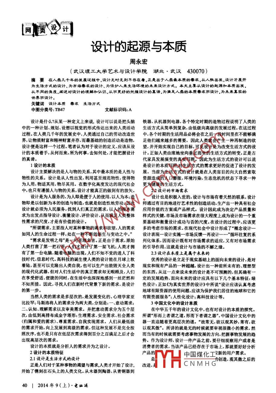 設計的起源與本質周永宏(武漢理工大學藝術與設計學院 湖北●武漢430070 )摘要在人類幾千年的發(fā)展過程中.設計無時無刻不存在著.正是出于人類最本質的需求,從人性出發(fā),設計才展開為生活方式的設計、為市場需求的設計、為保護人來生活環(huán)境的未來設計方式。本文主要從設計的起源和本質出發(fā),從不同的角度.闡述對設計的理解和認識。從而更好的把握設計的真謗.為滿足人類的本質需求而設計.為未來真實的世界而設計。關鍵詞設計本質 需求生活方式中圖分類號:TB47文獻標識碼:A設計是什么?從某一種定義上來說,設計可以說是把頭腦鐵器,從機器到電器,各個特定時期的造物過程說明了人類的中的- -種計劃、規(guī)劃、設想以視覺的形式傳達出來的人類活動生活方式從簡單到復雜,由低級向高級的發(fā)展過程。在這過程過程。在人類幾千年的發(fā)展史中,人類通過自己的勞動改造世中,各個時期的生活用品必將會在之后一段時間里在不能夠滿界,讓物質財富和精神財富并存,而最基礎的創(chuàng)造活動是造物,足他們越來越多的需要,因此人類就會產生- -種再制造的欲設計便是這樣-一個過程。筆者認為對于設計的定義,應該從設望,并開始實現(xiàn)自己的目標,可見設計是為改變生活方式的設計的本質著手,從何而來,所為何事,去知何處,才能把握設計計.正如人類由席地坐向垂足而坐的生活方式的轉變,正是古代家具發(fā)展演變的真實寫照。因此為生活方式的設計可以說1設計的本質是設計的本質寫照,對生活方式的需求更好的促進了設計的發(fā)設計主要解決的是人與物的關系,其中最本質的是人性與展。當前為生活方式的設計就是在人類盲目的向大自然索取物性的關系。設計是從人性出發(fā),利用甚至規(guī)范物性,使得物資源造 成的人口膨脹,環(huán)境污染,生態(tài)危機的狀態(tài)下尋求一種為人用,物適其用,物盡其用。在數(shù)字化高度發(fā)達的現(xiàn)代社會更為健康的生活方式。中,也只有遵循人與物的關系,設計才能真正的做到有的放矢。2.2設計的市場需求設計是為人服務的,為人即是便于人的使用,以人為本;造設計也是積極入世的,設計與市場有著天然的聯(lián)系,設計物即是以創(chuàng)新為本的創(chuàng)造與制造,也就是創(chuàng)造性地勞動。因此師通過有目的地進行藝術性的創(chuàng)造活動,生產出一種具有社會設計就必須為人民服務,找到人們真正的需求,以人的根本需應用 價值的方案或產品樣式。設計因此成為決定產品質量和求為出發(fā)點指導設計、衡量設計、評價設計,從而滿足人類整體樣式的關鍵,市場及市場需求在很大程度上成為設計的一個重性需求的尺度,才是有價值的設計。要基礎和衡量設計成功與否的尺度。在設計的過程中,應該更“所謂需求,主要指人對某種事物的渴求和欲望,人的需求多的考慮市場的需求。在現(xiàn)代社會中設計形成了“概念設計一如同人的生命過程一樣,處在-種不斷的新生 與變動之中?!痹O計表現(xiàn)- -設計實施- -市場反饋-再.....”循環(huán)往復 的系“需求是發(fā)明之母”是一句至理名言。 正是由于需求,原始列化體系, 因而設計既有對市場需求的適應,又有對市場需求人類打鑿了第-把石斧:人們才設計了第一架飛機:人類才擁的引導作用,這就是設計與市場的不解之緣。有了第一臺電腦,隨著電腦的出現(xiàn),人們不知不覺的進入了科2.3設計在本質上是屬于未來的技時代、信息時代。高科技的誕生使人類的設計能在月球上軟優(yōu)秀的設計是立足于現(xiàn)實基礎.上的面向未來的設計,是對著陸,甚至可以克隆出人類自我,也可以生產出能毀滅全人類現(xiàn)實和現(xiàn)有產品的- -種超越,設計出一種前所未有的、理想型的現(xiàn)代化武器,但對人們生活中的真正需求卻無暇顧及,人們的東西。 從這一- 點來說未來的設計是不可預測的,但其確有- -在享受舒適、便捷的同時,在生活中也深深地感到- - 絲茫然和定的發(fā)展趨勢,面向未來的設計應具有以下幾個基本特征:綠不知所措。因此,尋找人們在新時代背景下新的需求,是設計色 設計:正如《為真實世界的設計》中所說“設計應該認真考慮的第一步。地球有限資源的使用問題,應該為保護我們居住的地球和它的當然人類的需求是多層次的,是發(fā)展變化的。心理學家亞有限資源服務";人性化設計:高科技設計等。比拉罕:馬斯洛將人的需求分為兩大類,分別是: -、意動需求;3中國文化中的設計本質二、認知、理解需求以及審美需求。并把意動需求分為五個層在中華五千年的設計文化中,也有對設計的本質的探究。次,由低到高排布成金字塔形:生理需求、安全需求、社會需求所謂“形而 上者謂之道,形而下者謂之器”,中國設計文化中的(歸屬和愛的需求)、尊重需求、自我實現(xiàn)需求。人們從最低級器一直追隨著更高層次的道?!肮食o,欲以觀其妙,常有,欲的需求開始,向上發(fā)展到高級的需求,但這種發(fā)展不是完全按以觀其傲”。 所講的就是無的時候就要審視很微小的需求,然照次序,也不是只有在低層次需求得到百分之百滿足之后才會而 當有的時候就需要考慮事物發(fā)展的方向,把握事物發(fā)展的趨出現(xiàn)高層次的需求。勢。作為設計師,設計- -件產品之前,要仔細觀察用戶或者是設計的本質
