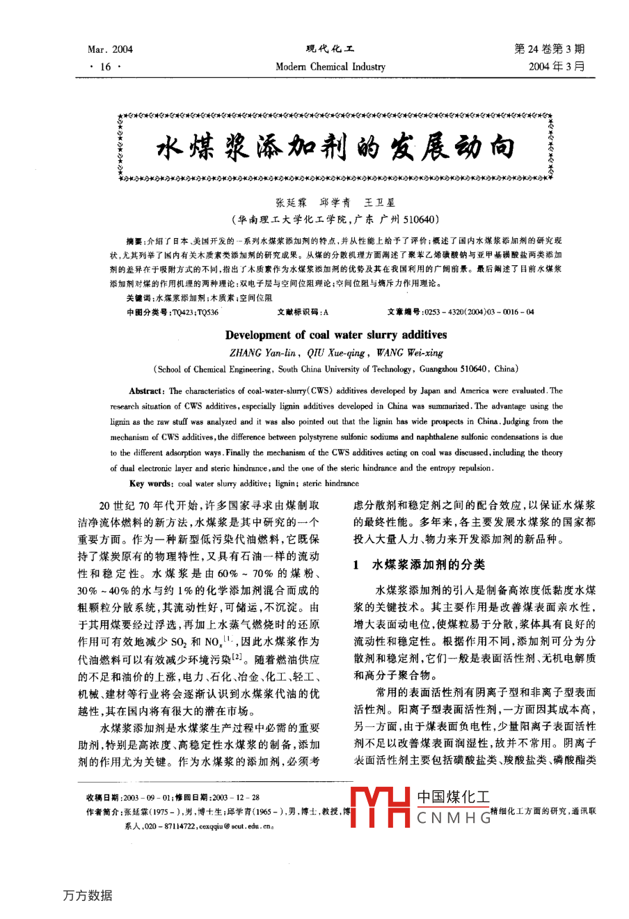 Mar.2004現(xiàn)代化工第24卷第3期16Modern Chemical Industry2004年3月)Q)片《》《《)《增腎)))的對蕭滑)《氵水煤糧添加劑的發(fā)展動向張延寐邱學(xué)青王衛(wèi)星(華南理工大學(xué)化工學(xué)院,廣東廣州510640)摘要:介紹了日本、美國開發(fā)的一系列水煤漿添加劑的特點,并從性能上給予了評價;概述了國內(nèi)水煤漿添加劑的研究現(xiàn)狀,尤其列舉了國內(nèi)有關(guān)木質(zhì)素類添加劑的研究成果。從煤的分散機理方面闡述了聚苯乙烯磺酸鈉與亞甲基磺酸鹽兩類添加劑的差異在于吸附方式的不同,指出了木質(zhì)素作為水煤漿添加劑的優(yōu)勢及其在我國利用的廣闊前景。最后闡述了目前水煤漿添加劑對煤的作用機理的兩種理論:雙電子層與空間位阻理論;空間位阻與熵斥力作用理論。關(guān)鍵調(diào):水煤漿添加劑;木質(zhì)素;空間位阻中圖分類號:TQ423;TQ536文獻標(biāo)識碼:A文章編號:0253-4320(2004)03-0016-04Development of coal water slurry additivesZHANG Yan-lin, QIU Xue-ging, WANG Wei-xing(School of Chemical Engineering, South China University of Technology, Guangzhou 510640, China)bstract:The characteristics of coal-water-slurry(CWS)additives developed by Japan and America were evaluated.Theresearch situation of CWS additives, especially lignin additives developed in China was summarized. The advantage using thein as the raw stuff was analyzed and it was also pointed out that the lignin has wide prospects in China. Judging from theto the different adsorption ways. Finally the mechanism of the CWS additives acting on coal was discussed, including the theoryof dual electronic layer and steric hindrance, und the one of the steric hindrance and the entropy repulsKey words: coal water slurry additive; lignin; steric hindrance20世紀(jì)70年代開始,許多國家尋求由煤制取慮分散劑和穩(wěn)定劑之間的配合效應(yīng),以保證水煤漿潔凈流體燃料的新方法,水煤漿是其中研究的一個的最終性能。多年來,各主要發(fā)展水煤漿的國家都重要方面。作為一種新型低污染代油燃料,它既保投入大量人力、物力來開發(fā)添加劑的新品種。持了煤炭原有的物理特性,又具有石油一樣的流動性和穩(wěn)定性。水煤漿是由60%~70%的煤粉1水煤漿添加劑的分類30%~40%的水與約1%的化學(xué)添加劑混合而成的水煤漿添加劑的引入是制備高濃度低黏度水煤粗顆粒分散系統(tǒng),其流動性好,可儲運,不沉淀。由漿的關(guān)鍵技術(shù)。其主要作用是改善煤表面親水性,于其用煤要經(jīng)過浮選,再加上水蒸氣燃燒時的還原增大表面動電位,使煤粒易于分散,漿體具有良好的作用可有效地減少SO2和NO21,因此水煤漿作為流動性和穩(wěn)定性。根據(jù)作用不同,添加劑可分為分代油燃料可以有效減少環(huán)境污染21。隨著燃油供應(yīng)散劑和穩(wěn)定劑它們一般是表面活性劑、無機電解質(zhì)的不足和油價的上漲,電力、石化、冶金、化工、輕工、和高分子聚合物。機械、建材等行業(yè)將會逐漸認(rèn)識到水煤漿代油的優(yōu)常用的表面活性劑有陰離子型和非離子型表面越性,其在國內(nèi)將有很大的潛在市場。活性劑。陽離子型表面活性劑,一方面因其成本高水煤漿添加劑是水煤漿生產(chǎn)過程中必需的重要另一方面,由于煤表面負(fù)電性,少量陽離子表面活性助劑,特別是高濃度、高穩(wěn)定性水煤漿的制備,添加劑不足以改善煤表面潤濕性,故并不常用。陰離子劑的作用尤為關(guān)鍵。作為水煤漿的添加劑,必須考表面活性劑主要包括磺酸鹽類、羧酸鹽類、磷酸酯類收稿日期:2003-09-01;修回日期:2003-12-28中國煤化工作者簡介:張廷霖(1975-),男,博士生;邱學(xué)青(1965-),男,博士,教授CNMH精細(xì)化工方面的研究,通訊聯(lián)系人,020-8114722,cexqgnu@cet,edu.cne2004年3月張延霖等:水煤漿添加劑的發(fā)展動向17等,其中萘磺酸甲醛縮合物、磺化木質(zhì)素、聚苯乙烯鏡觀察煤表而特征,研究了煤表面結(jié)構(gòu)及其物化性磺酸鹽聚丙烯酸系共聚物是普遍采用的水煤漿添質(zhì)與分散劑的相關(guān)性,并從上百種分散劑中成功研加劑。非離子表面活性劑自面世以來發(fā)展很快,其制出性能優(yōu)良的分散劑ACC-71045.。由此可以看特點是在水中并不電離,親水基主要由分子結(jié)構(gòu)中出,研究添加劑分子結(jié)構(gòu)特征與煤表面物化性能間的含氧官能團提供,水煤漿制備中所用的此類添加的規(guī)律是改變目前添加劑研究中盲目性或經(jīng)驗性的劑多為聚合度不同的環(huán)氧乙烷聚合物。非離子表血關(guān)鍵?;钚詣┑墓餐攸c是它們既可用作分散劑,又能兼美國 Once Fuel公司10報道了一種能改善剪切作穩(wěn)定劑,但到目前為止,因其價格昂貴而尚未被廣穩(wěn)定性和降低黏度的水煤漿添加劑。該添加劑是由泛采用。無機電解質(zhì)主要指氯化鈉、碳酸鈉氫氧化2種表面活性劑復(fù)配而成,每一種表面活性劑具有鈉等。高分子聚合物主要為聚環(huán)氧乙烯、聚丙烯酰不同分子質(zhì)量的親水基足以潤混分散煤顆粒。一種胺、阿拉伯膠等,其在水煤漿中主要用作穩(wěn)定劑。表面活性劑帶有高分子質(zhì)量的氧乙烯基,另一種則2水煤漿添加劑的國內(nèi)外研究現(xiàn)狀帶有低分子質(zhì)量的氧乙烯基,2種表面活性劑共用時可使煤的質(zhì)量分?jǐn)?shù)達到70%以上。21國外研究現(xiàn)狀美國 Nat Distillers化學(xué)公司1報道了一種非離目前國外水煤漿添加劑主