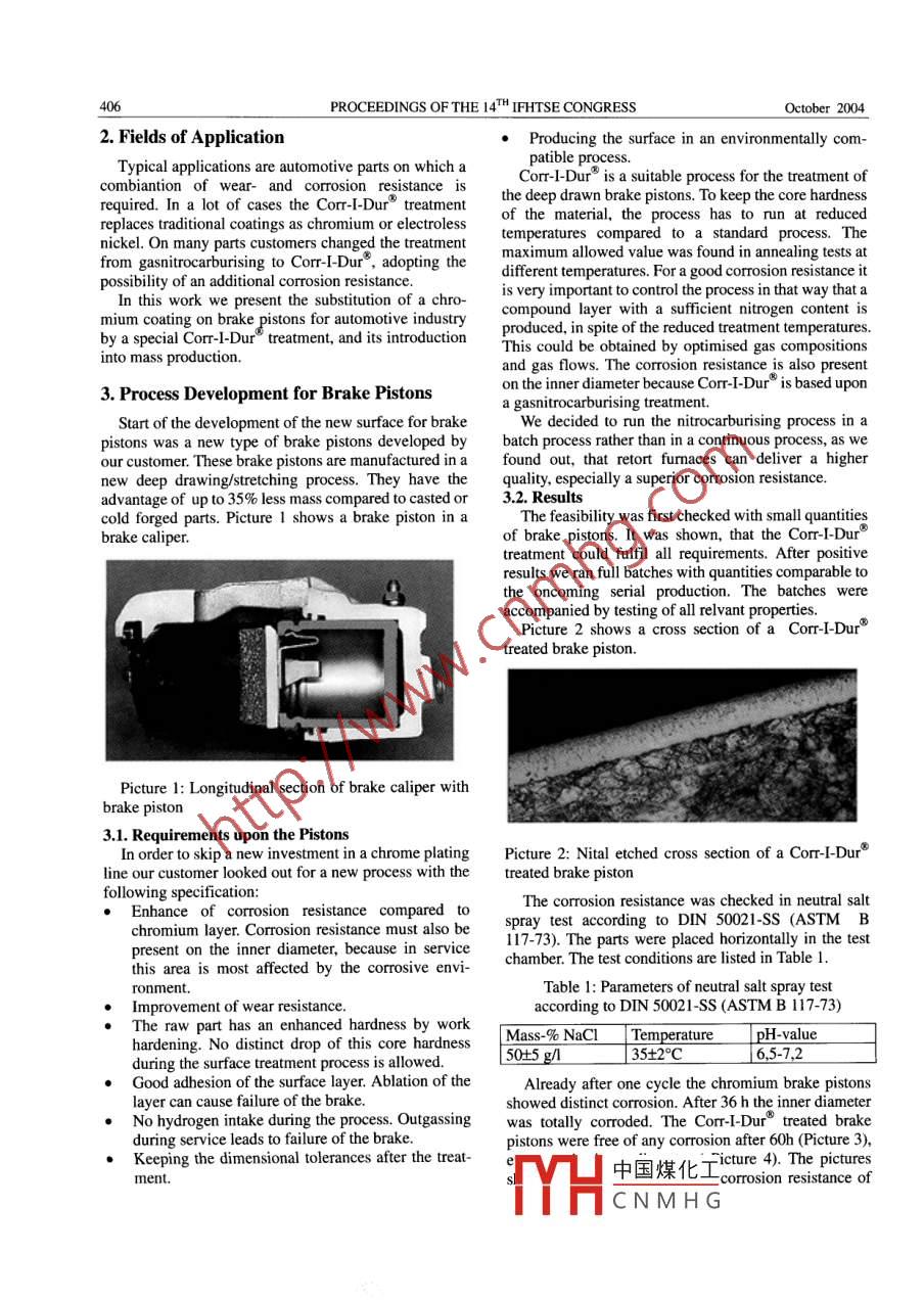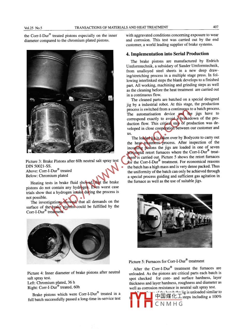 TRANSACTIONS OF MATERIALS AND HEAT TREATMENTPROCEEDINGS OF THE 14 IFHTSE CONGRESSOctobeIntegration of Gas Nitrocarburising and Oxidising in a Mass Production Line forBrake pistonsGero Walkowiak, Dieter Muller", Uwe Zeibig1. Bodycote Warmebehandlung GmbH, Ebersbach, Germany2. Bodycote Warmebehandlung gmbH, Ebersbach, Germany3. Sander Umformtechnik gmbH Co K Renchen-UIm, GermanyAbstract: The combination of wear-and corrosion resistance is a demand to a multitude of automotive parts. Several metalliccoatings as hard/soft chromium or electroless nickel have been the conventional surface protection e. g. on parts as brakepistons and shock absorber or gas spring piston rods. The Corr-l-Dur process-a special gasnitrocarburising and oxidisingtechnology. has a huge potential not only in substituting those coatings but also in delivering surfaces with higher qualityThe benefits of the replacement of soft chromium with Corm-I-Durand the implementation of the process in the customersproduction line with an annual capacity of 17 million brake pistons is described in this presentation, Starting with the demaron wear- and corrosion resistance the way of process development and the design of applicative equipment is shown. Thresult is a tailor-made surface solution with superior quality for deep drawn brake pistons. Two main disadvantageoutgassing of the chromium layer and reduced corrosion resistance on the inner diameter-are eliminated by the replacementwith Corr-I-Dur, The process-sure achievement of enhanced corrosion resistance, uniform layer thickness, negligibledistortion as well as environmental and economical advantages make Corr-"an excellence choice for this applicationKey words: Corr-I-Dur nitrocarburising, oxidising, corrosion resistance, brake piston, mass productionA REASONABLE MATERIAL CHOICE is one of the established a commercial gasnitrocarburising andfundamentals of the success of the production of com- oxidising technology that reproducibly delivers an ex-ponents. Damages can appear during service by corro- cellent corrosion resistancesion, wear and fatigue failure1. 2. Layer ConstitutionWhen looking for a sufficient corrosion resistance,Layers produced by gasnitrocarburisingan oxidisingommonly stainless steels or coatings as chromium or processes generally consist of three zones:electroless nickel are considered. Recent experiencesThe transition to the substrate is built by the diffu-has shown, that in many cases a nitrocarburising andsion layer. This layer has a thickness of 0, 1 to 1, 0oxidising treatment is the most reasonable choice frommm. Nitride precipications and interstitially dis-the economical and technical point of viewsolved nitrogen enhance the hardness and theEspecially if corrosion and wear protection is desiredfatigue strength of this areacombined with a high strength of the base material,The compound layer which consists of E-andnitrocarburising and oxidising treatments more andY(carbo)nitrides. The thickness of this layer ismore become first choice, especially for parts that arebetween 5 and 30umproduced in high quantities.The outer layer is the oxide layer(0,5-3um). Thechemical composition is Fe] O4(magnetite).1. Corrosion Protection by NitrocarburisingIt is well known that nitriding or nitrocarburising canThe compound layer has a high hardness and deliversenhance the corrosion resistance of low alloyed steelsgood wear resistance, especially if it mainly consists ofe-nitrides. Under special conditions the oxide layer canBut the results in corrosion tests do not meet the usual work as a passive layer on the compound layer. It wasspecifications for parts that are exposed to corrosiveshown, that a sufficient concentration of nitrogen plusenvironment. A subsequent oxidation especially of carbon in the compound layer is the key to a goodnitrocarburised surfaces can give a further distinct improvement of the corrosion resistance [1-3orrosion protection[2-5]. As these concentrations aredirectly influenced by the process parameters hugeThe best known commercial nitrocarburising and discrepancies between gasnitrocarburising andoxidising processes are based on salt bath nitrocarbuising technology. Nowadays oxidation ot gasnitrocar-. process which is established by Bodycote has to fulfilronmental aspects. Common processes indeed reach certain standards concerning furnaces and processparameters, so it reproducible delivers an excellentabout 96 hours in salt spray test but cannot fulfil the corrosion resistanceincreasing demands of 240 hours or moreWith the so called Corr-I-Dur process, Bodycote has中國(guó)煤化工CNMHG406PROCEEDINGS OF THE 14IFHTSE CONGRESSOctober 20042. Fields of ApplicationProducing the surface in an environmentally comTypical applications are automotive parts on which aibleCorr-l-Dur is a suitable process for the treatment ofcombiantion of wear- and corrosion resistance is the deep drawn brake pistons. To keep the core hardnessrequired. In a lot of cases the Corr-I-Durtreatmentreplaces traditional coatings as chromium or electrolessof the material, the process has to run at reducednickel. On many parts customers changed the treatment temperatures compared to a standard process.Thefrom gasnitrocarburising to Corr-I-Dur, adopting the maximum allowed value was found in annealing tests atpossibility of an additional corrosion resistancedifferent temperatures. For a good corrosion resistance itIn this work we present the substitution of a chreis very important to control the process in that way that amium coating on brake pistons for automotive industry compound layer with a sufficient nitrogen content isby a special Corr-I-Dur treatment, and its introduction produced, in spite of the reduced treatment temperaturesThis could be obtained by optimised gas compositionsinto mass production3. Process Development for Brake Pistonson the inner diameter because CorT-I-Dur is based upongasnitrocarburisingStart of the development of the new surface for brakeWe deci