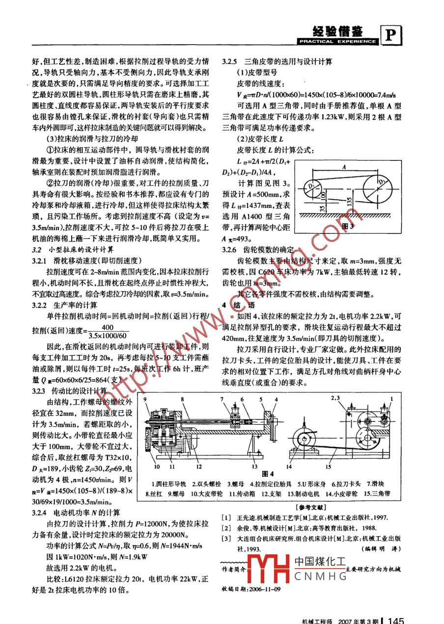 經(jīng)驗借鑒TICAL EXPERIENCE異型孔加工技術(shù)及設(shè)備改造施華1,邱正興2(1江蘇食品職業(yè)技術(shù)學(xué)院江蘇淮安2230032江蘇清江拖拉機有限公司,江蘇淮安223001)摘要:從經(jīng)濟實用性出發(fā),文中介紹一種適用于小型帶異型孔零件的加工,具有一定的通用性,目前已得到了應(yīng)用和推廣關(guān)鍵詞:異型孔;拉削;沖裁;加工表面中圖分類號:TG57文獻標(biāo)識碼:B文章編號:1002-2333(2007)03-0144-021引言針對沖裁表面撕裂問題,將沖頭工作部位磨出小小的倒如圖1所示,自行車方孔曲柄汽車水泵上的葉輪等錐,相當(dāng)于刀具的后角,力圖使冷沖近似于插刀插削,③均采用無銷式聯(lián)接結(jié)構(gòu),這種結(jié)構(gòu)裝配簡單,更換方便,針對沖頭折斷易和工件咬合問題,提出將沖頭淬火硬度但這一類孔的加工曾經(jīng)一直是困擾中小型企業(yè)的難題。降低到HRC45-48,將與工件接觸的部位進行電火花表而推翻傳統(tǒng)工藝方法,采用自行設(shè)計簡單適用的小型專面強化處理,涂覆與金屬親和性差的YG8硬質(zhì)合金,使機,既能滿足加工質(zhì)量,同時又做到了環(huán)保節(jié)能。沖頭外硬內(nèi)韌等。以上這些措施都逐一實施,收效甚微不能從根本上解決冷沖撕裂問題。閨檬3拉削方案的制定和小型拉床的設(shè)計要想提高加工質(zhì)量,從根本上解決問題,必須推翻傳統(tǒng)的冷沖異型孔工藝,改用拉削取代。工藝方案為:鉆方孔的內(nèi)切圓基孔→擴兩端沉孔→拉削123mm方孔(拉床)→沖擴2錐面(40T沖床)(b)拉削方孔,若采用通用拉床,最小規(guī)格的拉床L6110圖1額定拉力為10t,電機功率為17kW,使用時如同大馬拉小2加工工藝方案的分析車,造成能源的浪費,而以拉削曲柄異型孔為例計算出的以圖1(a)中的零件為例,加工帶錐度的方孔一般采拉力僅為12t,因此自行設(shè)計拉床經(jīng)濟節(jié)能。用的方案為:鉆方孔的內(nèi)切圓基孔→擴兩端沉孔→沖口3,1小型拉床設(shè)計中的關(guān)鍵技術(shù)123mm方孔(40T沖床)→沖擴2°錐面(40T沖床)。(1)拉床總傳動方案這種方案看似無可厚非,但卻存在以下問題:通常,有液壓傳動和機械傳動兩種:(1)冷沖工藝的金屬分離不同于金屬切削工藝,在沖液壓傳動的拉床特點是:①拉削速度無級調(diào)節(jié),且制過程中,材料由彈性變形→撕(拉)裂→剝離這樣一個枕返回速度可大于拉削速度(單出桿油缸)。②液壓傳動過程且沖裁厚度大(達15mm)和實際處于無凹模沖裁狀慣性沖擊力小,滑枕在起終點可準(zhǔn)確停止到位。③液壓傳況使方孔下部大于孔深的撕裂斑痕沖裁時下半部金屬動發(fā)生故障機會多使用維修麻煩。④液壓油泄露使場完全是在材料撕裂的狀況下分離的,這就造成異型孔的地污染液壓元件價格貴液壓油的消耗使得制造、使用下口一半多的表面成為撕裂成本提高。區(qū),如圖2,影響外觀同時還機械傳動的拉床特點是:①工作速度一次設(shè)計好,不影響與相應(yīng)軸的配合接觸強能輕易改變,且拉削速度與返回速度相同。②滑枕在起終度,從而使產(chǎn)品缺乏市場競點慣性沖程大,不易準(zhǔn)確停止到位,易控制失靈。③機械爭力傳動結(jié)構(gòu)簡單,制造使用和維修方便。④造價低。2)沖頭表面易和工件材料咬合,使沖頭拔出力(卸根據(jù)企業(yè)的具體情況,經(jīng)比較選擇了機械傳動的結(jié)工件力)增大,沖頭易折斷同時沖頭工件咬合后再拔開,構(gòu)方案。使工件表面質(zhì)量進一步惡化,并在沖頭表面產(chǎn)生咬合瘤(2)拉床導(dǎo)軌的設(shè)計影響沖加工的繼續(xù)進行。中國煤化工對拉削質(zhì)量的影響(3)存在著所沖孔與鉆孔的不同軸偏移的問題。最大,YH導(dǎo)軌型式需本著導(dǎo)從改進和完善冷沖工藝入手,我們曾經(jīng)進行了以下向精CNMHG則。國內(nèi)外正規(guī)的嘗試:①設(shè)計沖頭的磨削夾具,提高沖頭的加工效率,②拉床產(chǎn)品,其導(dǎo)軌都是矩形,這種導(dǎo)軌導(dǎo)向精度高,剛性144機械工程師2007年第3期經(jīng)驗借盛好,但工藝性差,制造困難,根據(jù)拉削過程導(dǎo)軌的受力情325三角皮帶的選用與設(shè)計計算況,導(dǎo)軌只受軸向力,基本不受側(cè)向力,因此導(dǎo)軌支承剛(1)皮帶型號度就是次要的,只需滿足導(dǎo)向精度的要求。可選擇加工工皮帶的線速度藝最好的雙圓柱導(dǎo)軌,圓柱形導(dǎo)軌只需在磨床上精磨,其V=mDn/(1000X60)=1450(1058)6×10000=74mk圓柱度、直線度都容易保證,兩導(dǎo)軌安裝后的平行度要求可選用A型三角帶,同時由手冊推薦值,單根A型也很容易由鏜孔來保證,滑枕的襯套(導(dǎo)向套)也只需精三角帶在此速度下可傳遞功率123kW則采用2根A型車內(nèi)外圓即可這樣拉床制造的關(guān)鍵問題就可以得到解決。三角帶可滿足功率傳遞要求(3)拉床的潤滑與拉刀的冷卻(2)皮帶長度L①拉床的相互運動部件中,圓導(dǎo)軌與滑枕襯套的潤皮帶長度L的計算公式:滑最為重要,設(shè)計中設(shè)置了油杯自動潤滑,使結(jié)構(gòu)簡化,L計=2A+m2(D1+軸承室則在裝配時預(yù)加潤滑脂進行潤滑。D2)+(DD1)4A,冷卻泵和冷卻液箱,進行冷卻,但這樣使得拉床結(jié)構(gòu)太繁得L計=查表瑣,且污染工作場所。考慮到拉削速度不高(設(shè)定為n=選用A1400型三角m3.5m/min),拉削速度不大,可拉5-10件后將拉刀在吸上帶,再計算兩輪中心距機油的海棉上蘸一下來進行潤滑冷卻既簡單又實用。A*=49