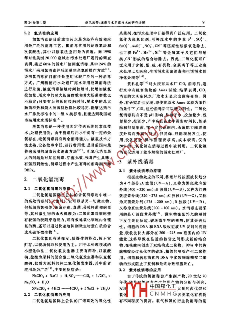 2010年3月北京聯(lián)合大學學報(自然科學版)Mar. 2010第24卷第1期總79期Jourmal of Beijing Union University( Natural Sciences )Vol.24 No.1 Sum No. 79城市污水消毒技術的研究進展趙風云,孫根行(陜西科技大學資源與環(huán)境學院,陜西西安710021)[摘要]城市污水消毒是保障水質(zhì)安全必不可少的環(huán)節(jié)。目前,城市污水消毒方法主要為氯消毒、二氧化氯消毒、紫外消毒和臭氧消毒等,傳統(tǒng)氯消毒由于產(chǎn)生有毒副產(chǎn)物而逐步為其他消毒方法所取代,闡述了各種消毒方式的消毒原理及應用,聯(lián)合消毒技術將成為近幾年發(fā)展較快的城市污水消毒技術。[關鍵詞]城市污水;消 毒技術;聯(lián)合消毒[中圖分類號] X 703.1 [文獻標志碼] A [文章編號] 1005 -0310(2010)01-0008-04Research Progress in the Disinfection Technologies of SewageZHAO Feng yun, SUN Gen-xing(Collge of Resources and Environment, Shaanxi University of Seiencet&Technology, xi' an 710021, China)Abstract: The disinfection technologies of sewage are essential operation to protect water quality and safety. Thedisinfection technologies of sewage include mostly chlorination disinfection , chlorine dioxide disinfection, ultravio-let disinfection , ozone disinfection et. al . The traditional chlorination disinfection is being gradually substituted byother disinfection crafts because of its toxic disinfection byproducts. It had described the prineiples and applica-tions of various disinfection technologies. And united disinfection wins the expansive future in recent years.Key words: sewage; disinfection technologies ; joint disinfection污水再生利用是解決我國目前水資源緊缺的小的中性分子,它能擴散到帶負電的細菌表面,并重要途徑,污水消毒是保障水質(zhì)安全必不可少的環(huán).穿透至細菌內(nèi)部,氧化和破壞微生物外膜或酶的蛋節(jié)。氯消毒因其成本低廉、運行管理簡單且對致病白質(zhì)結構功能,從而使微生物死亡”。而氯對病毒微生物有廣泛的滅活特性,在目前的污水消毒處理的作用,主要是對核酸破壞的致死性作用。中仍處于主導地位[41。但由于氯消毒會產(chǎn)生大量向水中加人液氯或次氣酸鹽溶液消毒時,在水的三氯甲烷、鹵乙酸等消毒副產(chǎn)物,近年來出現(xiàn)了中發(fā)生的反應如下:很多替代消毒方法,例如:二氧化氯消毒、紫外消Cl2+ H20 = HOCl+ H'+ CI~毒.臭氧消毒等,聯(lián)合消毒技術也得到了更加廣泛0C1^+H2O=HOCI+0H”的應用。HOCl、0CI"之和稱作有效自由氣,其中以HOCI消毒效果最好。排人水體時,氯會和水中的1氯消毒氨氮、有機氮反應生成消毒效果較差的無機氯胺和1.1 氯消毒的原理.氯胺,稱作化合氯??傆鄽馐侵赣行ё杂陕群陀行认臼亲顬槠毡榈南炯夹g,殺菌機理非常化合氯之和。簡單,主要是氯溶于水中產(chǎn)生了HOCI。HOCI 是很中國煤化工[收稿日期] 2009-12-31[作者簡介]趙風云(1985- -),女,內(nèi)蒙古烏海人,陜西科技大學MCHCNM H G。再生利用安全性評價。第24卷第1期趙風云等:城市污水消毒技術的研究進展91.2 氯消毒的應用殺菌劑,在污水處理中日益得到廣泛應用。二氧化加氯消毒是目前城市污水最為經(jīng)濟有效和應氯作為強氧化劑,可將廢水中的少量S3-、S0;"、用最廣泛的消毒工藝。氯消毒常用的是液氯法和Sn0;~.As0;-、NO2、CN-等還原性酸根氧化除去,次氣酸法,其中以液氯法應用最為普遍。據(jù)1998也可將Fe2* 、Mn2°、Ni?*等金屬離子及它們與酚年對北美洲20 000座城市污水處理廠進行的調(diào)查類、CN-形成的絡合物除去。因此,二氧化氯可廣表明,接近60%的污水廠使用氯消毒,其中24%的泛應用于含氯、酚硫、有機物、金屬離子等工業(yè)廢污水廠采用氯消毒并后續(xù)脫除余氯的操作方式[4),水處理以及醫(yī)院、生活污水殺菌消毒和生活污水的.說明氯消毒在目前還是應用比較廣泛的一種消毒凈化處理等10)。方式。廣州獵德污水處理廠尾水采用液氯消毒法黃君禮等“"對大慶東風水廠Cl02消毒后,進進行殺菌,液氯消毒接觸時間較短時,僅增加液氯行水中有機富集物的Ames試驗,結果表明,CIO2投加量,尾水中的總大腸菌群數(shù)和糞大腸菌群數(shù)也消毒的大慶東風水廠取水未顯示出致突變性。另不穩(wěn)定;只要有足夠長的接觸時間,尾水中的總大外,有研究者也發(fā)現(xiàn),即使在原水Ames試驗為陽性腸菌群數(shù)和糞大腸菌群數(shù)都比較穩(wěn)定,能夠達到污的條件下,C102組份消毒后可以轉(zhuǎn)為陰性。二氧化水廠排放標準中的一級A類標準,且能達到我國城氯消毒具有不受pH影響、易溶于水、投加量少、殘市雜用水水質(zhì)標準5]。留量少、投資少、產(chǎn)率高且在水中滯留時間長,能殺液氯消毒是一種使用固定傳送系統(tǒng)的常規(guī)技除和抑制細菌,在一定的范圍內(nèi),殺菌能力隨著溫術,處理費用低。由于消毒后污水中尚有一定的余度升高而升高的特點,但易爆,只能現(xiàn)場發(fā)生.使氯存在,液氯消毒具有剩余消毒能力。液氯技術方用,設備復雜,操作管理要求高,成本較高,僅有法成熟,設備故障率低,運行費用低,是目前國內(nèi)最20%的二氧化氯在消毒過程中被利用。二氧化氯普遍采用的城市污水消毒方法([2。但氯化消毒最消毒僅適用于較小規(guī)模的污水處理廠。大的問題是對某些病毒、芽孢無效,殘毒產(chǎn)生臭味,有強烈刺激性,消毒過程中產(chǎn)生有毒的消毒副產(chǎn)物3紫外線消毒DBPs。3.1紫外線消 毒的原理2二氧化氯消毒根據(jù)生