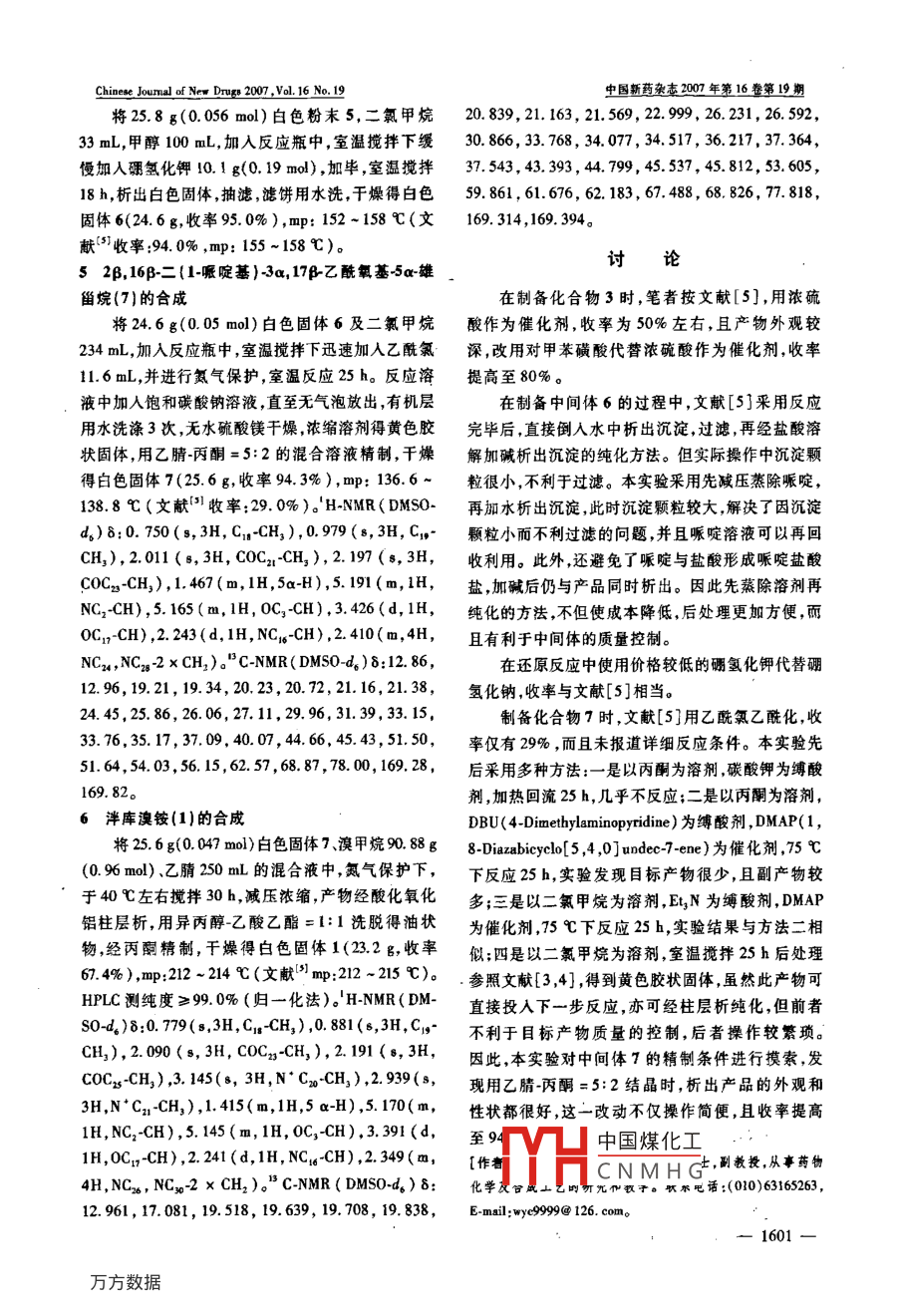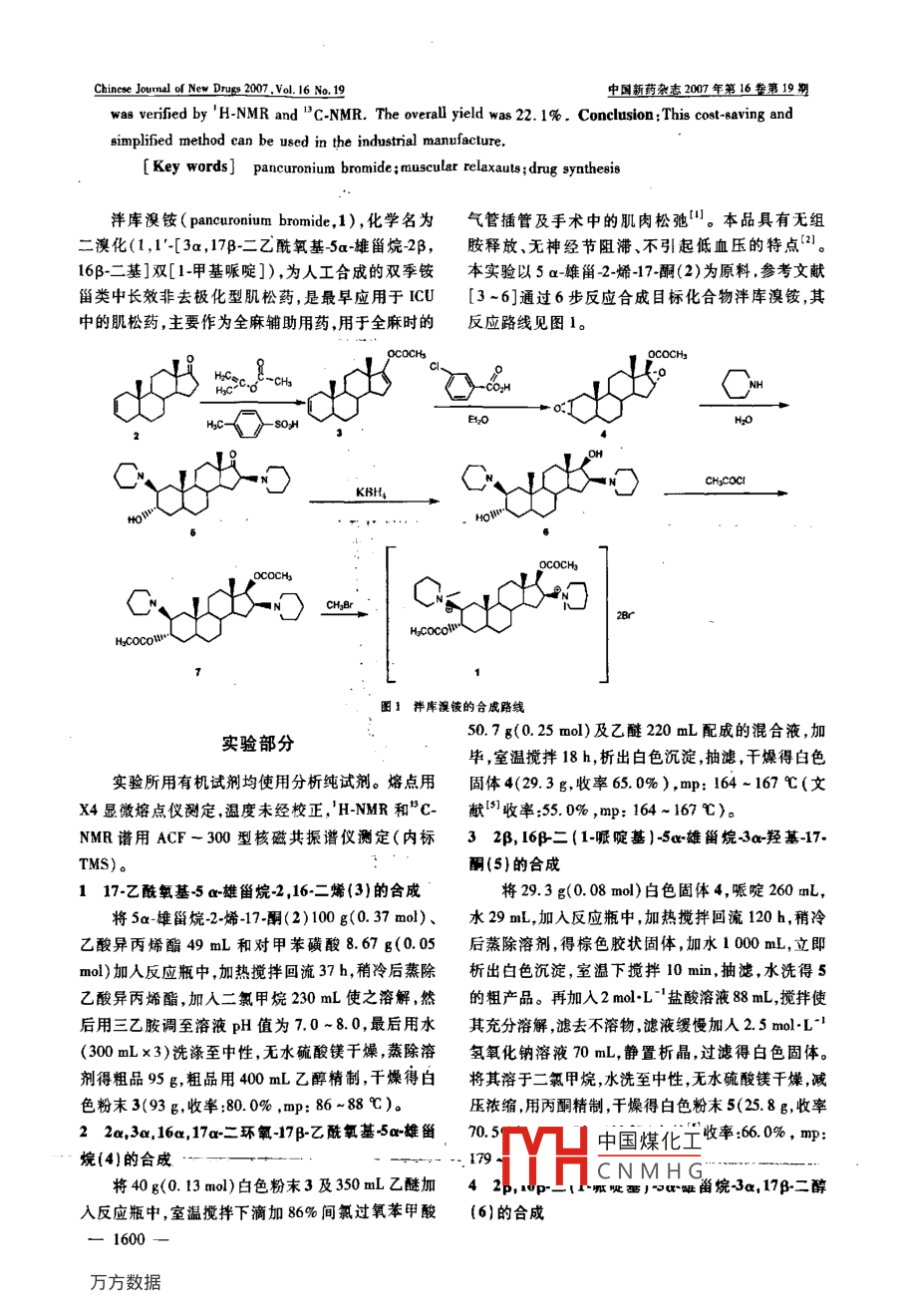 Chinese Jounal of New Druge 2007 .Vol. 16 No. 19中國新藥雜志2007年第16卷第19期度不同,其中具有統(tǒng)計學(xué)意義的是加巴噴丁與普.[3] GARCIA J, ALTMAN RD. Chronie pain smtes: pathophyiology瑞巴林和乙二醇生成的二酯組以及單獨的加巴噴and medical therapy [J]. Semin Arhins Rheum, 1997, 27(1):1-16.丁及普瑞巴林和乙二醇生成的二酯組。它們和加] WOOLP CJ, MANNION RU. Neuropahic pain; stiology. yap.巴噴丁原藥相比,鎮(zhèn)痛效果有了顯著提高。以酰tom, mechanisens and management [J]. Lanoes, 1999, 353胺鍵連接組的鎮(zhèn)痛效果無統(tǒng)計學(xué)意義??傮w上,(9164) :1959 - 1964.以二酯鍵連接的化合物活性好于以酰胺鍵連接的[5] RICOR BM,PELVIC SR. Cancer paia [J]. I Surg Oncol,2000, 75(4) :280 -300.分子?;钚詫嶒灲Y(jié)果表明了互聯(lián)體前藥的有效[6] DALLEL R, VOISIN D. Towerds a pain tealument baed on the性,以酰胺鍵連接的分子活性差的原因,可能與酰idenifcationof the pain-generating mecharisms [J]. Ewr Neuro,胺鍵在體內(nèi)不易解離有關(guān),而且由酰胺鍵連接的2001, 45(2): 126 - 132.化合物水溶性不佳,也會影響藥物在體內(nèi)的生物[7] MARTIN TJ, EISRNACH JC. Pharmacolog of opioid and non-opioid analgesicg in chronie pain suate [J]. J Pharmacol Exp T-利用度。酯鍵連接的分子由于氨基成鹽而易溶于her, 2001, 299(3):811 -817. .水,有利于藥物在體內(nèi)的吸收。[8] MACPHERSON RD. New dretions in pain management [J].[作者簡介]史衛(wèi)國(1971-),博士研究生 ,E-mail: shi-Drugs Today, 2002, 38(2); 135-145.weiguo@ nic. bmi. ac. cn。[通訊作者]劉河(1973-),男,副研究員,主要從事藥物tically with naproxen to produce anihyerageia [J]. Anetheri-ology, 2002, 97(S); 1263 -1273.化學(xué)研究。聯(lián)系電話:(010) 66874612, E-mail: liuhe@ nie.[10] CARUSO SF, FREDRICK LM, JOHN WL. Anticonvulsant con-bmi. ac. en。ticing composition for treating neuropathie pain: us, 6187338{參考文獻][P]. 1999 -02 -22.[11] 鄭虎藥物化學(xué)[M].北京:人民衛(wèi)生出版社.2002:469 -[1] HAYS C, BROWNE s, LANTRY C,et al. Buresa, neuropathie47pein in the scute pain service: s propetive suvey[J]. Acuke [12] 黃維德,陳常慶. 多肽合戚[M].北京:科學(xué)出版社, 1985:Pain, 2002, 4(1): 45 -48.92 - 105.[2] JENSEN Is, BARON R. Translation of symploms and signs intomechsnisms i neuropathie pain [J]. Pain, 20030 102(1);1-8.編輯:王宇梅/接曼B期:2007 -02-13泮庫溴銨的合成王玉成',陳玉芳”,顧菲”,辜順林*(I中國醫(yī)學(xué)科學(xué)院中國協(xié)和醫(yī)科大學(xué)醫(yī)藥生物技術(shù)研兗所,北京100050;2徐州師范大學(xué)化學(xué)系,徐州21116)[摘要] 目的:合成中長效非去極化型肌松藥泮庫澳銨。方法:以Sa-堆甾-2-烯-17-闌為起始原料經(jīng)酯化、氧化、開環(huán),還原、乙?;?最后與澳甲烷成鹽等6步反應(yīng)合成泮庫溴銨。結(jié)果:泮庫溴銨的結(jié)構(gòu)經(jīng)核磁共輾譜確證,總收率為22.1%。結(jié)論:本路線可簡化實驗操作,降低成本,適合工業(yè)化生產(chǎn)。[關(guān)鍵詞]泮庫澳銨;肌松藥;藥物合成[中圈分類號] R971.8;R914.5 [文獻標識碼] B [文章編號] 1003 -3734(2007)19 -1599 -04The synthesis of pancuronium bromideWANG Yu-cheng' ,CHEN Yu-fang', CU Fei2 , GU Shun-lin2(1 Institule of Medicinal Biotechnology, Chinee Academy of Medical Sciences , Peking Union Medical College ,Bejing 100050,China; 2 Department of Chemistry, Xuzhou Normnl IniroriwrXxushanu 21116, China)中國煤化工[Abstract] Objective: To study the synthesis of pan: Pancuroniumbromide was synthesized from 5- androst-2-en-17-one through ternnuwl, vnuaiui, 1 opening, re-0HCNMH Gduction, acetylation and then reacted with bromonethane. Results: The structure of pancuronium bromide一1599 -Chincee Jounal of New Druges 2007. Vol.16 No. 19中國新藥雜志2007年第16卷第19期was verifed by 'H-NMR and "C-NMR. The overall yield was 22. 1%. Conclusion: This cost -Baving andsimplifed method can be used in the industrial manufacture.[Key words] pancuronium bromide ;muscular relaxauts ;drug syotheeis泮庫溴銨( pancuronium bromide,1),化學(xué)名為氣管插管及手術(shù)中的肌肉松弛"。本品具有無組二溴化(1,1'-[3a,17β-二乙酰氧基-5a-雄甾烷-2β,胺釋放、無神經(jīng)節(jié)阻滯、不引起低血壓的特點“1。16β-二基]雙[1-甲基哌啶]),為人工合成的雙季銨本實驗以5 a-雄甾-2-烯-17-酮(2)為原料,參考文獻甾類中長效非去極化型肌松藥,是最早應(yīng)用于ICU[3~6]通過6步反應(yīng)合成目標化合物泮庫溴銨,其中的肌松藥,主要作為全麻輔助用藥,用于全麻時的反應(yīng)路線見圖1。0OOCHsCI出-CO.HHC- >-sOHEL2OH2CH2COCtCutKBt4Ho"6. HoWCOCHsOCOCHCu2BrHacocolHcCocol"圖1拌庫溴鏤的合成路線50.7g(0.25 mol)及乙醚220 mL配成的混合液,加實驗部分畢,室溫攪拌18 h,析出白色沉淀,抽漶,干燥得白色實驗所用有機試劑均使用分析純試劑。熔點用固體4(29.3g,收率65.0%),mp: 164-167 C(文X4顯微熔點儀測定,溫度未經(jīng)校正,H-NMR和"C-獻[51收率:55.0% ,mp; 164 ~ 167 C)。NMR譜用ACF- 300型核磁共振譜儀測定(內(nèi)標32β, 16p-二(1-哌啶基)-5a.雄甾烷-3a-羥基-17.TMS)。酮(5}的合成.1 17-乙酰氧基-5 ac-雄甾烷-2,16-二烯(3)的合成將29.3 g(0.08 mol)白色固體4,哌啶260 mL,將Sa-雄甾烷-2-烯-17-酮(2) 100 g(0. 37 mol)、水29 mL,加入反應(yīng)瓶中,加熱攪拌回流120 h,稍冷乙酸異丙烯酯49 mL和對甲苯磺酸8.67 g(0. 05后蒸除溶劑,得棕色膠狀固體,加水1000mL,立即.mol)加人反應(yīng)瓶中,加熱攪拌回流37h,稍冷后蒸除析出白色沉淀,室溫下攪拌10 min, 抽濾,水洗得5乙酸異丙烯酯,加入二氯甲烷230 mL使之溶解,然的粗產(chǎn)品。再加入2 mol