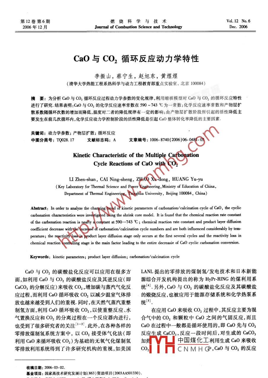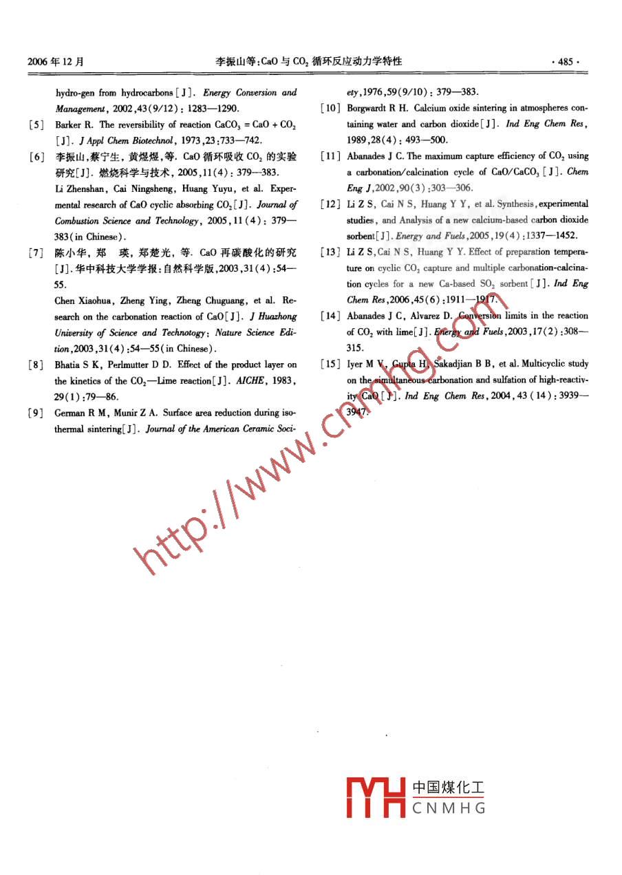 第12卷第6期燃燒科學與技術Vol 12 No 6006年12月Journal of Combustion Science and TechnologyCaO與CO2循環(huán)反應動力學特性李振山,蔡寧生,趙旭東,黃煜煜(清華大學熱能工程系熱科學與動力工程教育部重點實驗室,北京10004)摘要:為分析CaO與CO2循環(huán)反應過程動力學參數(shù)的變化規(guī)律,利用縮核模型對CaO與CO2的循環(huán)反應特性進行了研究結(jié)果表明:CaO與CO2的化學反應速率常數(shù)在590-743℃為一常數(shù);化學反應速率常數(shù)和產(chǎn)物層擴散系數(shù)隨循環(huán)次數(shù)的增加而降低,溫度對二者的降低規(guī)律有一定的影響;由產(chǎn)物層擴散階段所引起的活性降低主要發(fā)生在前幾次循環(huán)內(nèi),化學反應動力學控制階段的活性降低是引起CaO整體轉(zhuǎn)化率降低的主要因素關鍵詞:動力學參數(shù);產(chǎn)物層擴散;循環(huán)反應中圖分類號:TQ028.17文獻標志碼:A文章編號:1006-8740(2006)06-0481-05Kinetic Characteristic of the Multiple CarbonationCycle Reactions of Cao with CO2LI Zhen-shan, CAI Ning-sheng, ZHAO Xu-dong, HUANG Yu-yuKey Laboratory for Thermal Science and Power Engineering, Ministry of Education of ChinaDepartment of Thermal Engineering, Tsinghua University, Beijing 100084, China)Abstract: In order to analyze the changing trend of kinetic parameters of carbonation/ calcination cycle of CaO, the cyclicvestigated using the shrink core model. It is found that the chemical reaction rate constantof the carbonation reaction is nearly a constant at 590--743 C; chemical reaction rate constant and product layer diffusioncoefficient decrease with the increase of carbonation/ calcination cycle numbers and are both influenced considerably by tem-perature; the reactivity loss in product layer diffusion stage only occurs at the first several cycles and the reactivity loss inchemical reaction controlling stage is the main factor leading to the entire decrease of Cao cyclic carbonation conversionKeywords: kinetic parameters; product layer diffusion; carbonation/ calcination cycleCaO與CO2的碳酸鹽化反應可以應用在很多方LANL提出的零排放的煤制氫/發(fā)電技術和日本新能面,如利用CaO與CO2的碳酸鹽反應及其逆反應(即源綜合開發(fā)機構(gòu)提出的稱為 Hy Pr-RING的煤利用系CaCO3的分解反應)來吸收CO2,增加碳與蒸汽氣化反統(tǒng)4,另外,CaO與CO2的碳酸鹽化反應及其碳酸鹽應過程,而利用CaO循環(huán)吸收CO2以減少溫室氣體排的煅燒反應,也被應用于能源存儲系統(tǒng)和化學熱泵系放也越來越受到人們的重視同時,在天然氣蒸汽重整統(tǒng)制氫方面,利用CaO循環(huán)吸收CO2,以使重整反應、水在應用CaO來吸收CO2過程中,其反應主要為混氣置換反應和CO2的分離過程在一個反應器內(nèi)進行,合氣中的CO2和顆粒中CaO之間的氣固反應,而且也受到了很多研究者的關注13.此外,在各種各樣的CaO在過程中一般都是循環(huán)使用的,即CaO先與CO2零排放煤制氫系統(tǒng)方案中,以CO2接受體氣化法(即反應生成CaCO3,反應一段時間后,對生成的CaCO利用CaO來循環(huán)吸收CO2)為基礎的無氧氣化煤制氫加中國煤化工利用生成Ca0來吸收零排放利用系統(tǒng)得到了許多研究機構(gòu)的重視如美國Co2CNMHG,Ca0與CO2的反應收稿日期:200603-02基金項目:國家高技術研究發(fā)展計劃(863)資助項目(2003AA501330)雋者蘑山(93).男,博土研究生,① mails. tsinghua. edu.en482燃嬈科學與技術第12卷第6期動力學特性數(shù)據(jù)對于上述幾種應用過程而言是十分重1-(1-X)5=k·(ca2-c)t要的,動力學參數(shù)隨循環(huán)反應/煅燒次數(shù)的變化關系對3.566×10exp(-19680/7于相關過程的分析和后續(xù)的反應器設計都十分關鍵RT本文在前期CaO與CO2循環(huán)反應特性實驗研究6的當整個反應過程由產(chǎn)物層內(nèi)擴散速度控制時,反基礎上,主要考察循環(huán)次數(shù)對反應過程動力學參數(shù)的應方程為影響,為后續(xù)的研究和應用提供參考z-[z+(1-z)(1-x)實驗裝置和測量系統(tǒng)Dofr'(Cco, -.)(4)式中k為化學反應速率常數(shù),m3·s1·moll;co為1.1實驗系統(tǒng)介紹CO2反應氣體濃度,mol·m-3;c。為CO2平衡濃度,使用熱重分析儀 TA Instrument1200進行CaO與mol·m-3;t為反應時間,s;z為產(chǎn)物CaCO3與反應物O2反應實驗,TGA的升溫速率為50℃/min,當溫度達到設定溫度并穩(wěn)定后,開始通入含有CO2的氣體CaO的摩爾體積比,2.8;Dm為產(chǎn)物層擴散系數(shù),ms·m進行反應,恒溫反應時間為30min,然后停止通入含CO2的混合氣,通入N2,TCA以50℃/min的升溫速圖1為TGA實驗給出的樣品反應20min后的轉(zhuǎn)率升溫,待溫度穩(wěn)定在設定的煅燒溫度水平時,恒溫化率曲線.從圖中可以看出,CaO的碳酸鹽化過程首10min,然后TGA以50℃/mn的降溫速率降溫,待溫是反應速率非??斓幕瘜W反應控制階段,然后反應轉(zhuǎn)化率的增加速率明顯降低,最后變化趨勢趨于平緩度穩(wěn)定在設定的反應溫度水平時,開始通人含有CN物層擴散階段8.因此,如圖1所示,對化學的氣體進行反應,至此,完成一個循環(huán)樣品采用分析純CaO,粒徑為20~60Hm,CaO與CO2反應時間約30反應控制階段使用式(3)進行描述,而使用式(4)對產(chǎn)min,CaCO3煅燒溫度870℃,時間10min.CO2體積分物層擴散控制過程進行計算數(shù)分別為14%25%和35%1.2實驗數(shù)據(jù)的整理假定TGA原始曲線起始增重點處樣品質(zhì)量為m0,原始樣品的純度為P,假定雜質(zhì)不發(fā)生反應,且反應過程中雜質(zhì)的質(zhì)量不發(fā)生變化,反應進行到t時刻,樣品的質(zhì)量為m2,則固體反應物轉(