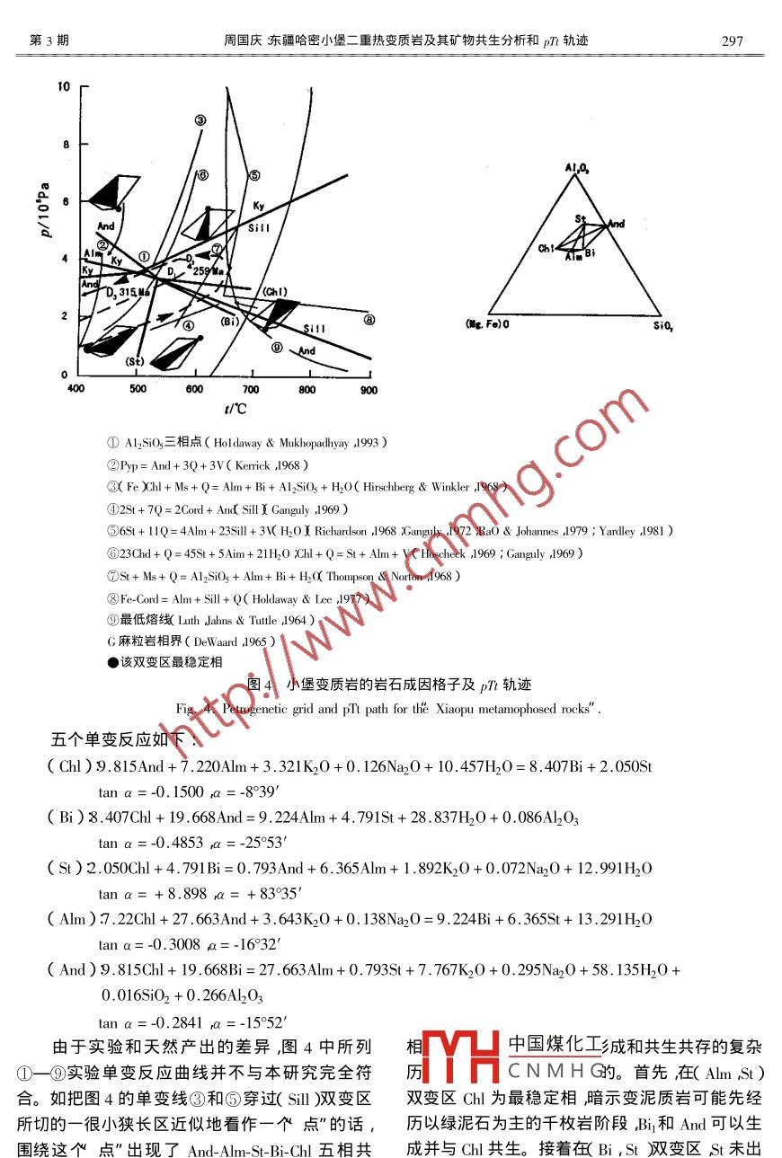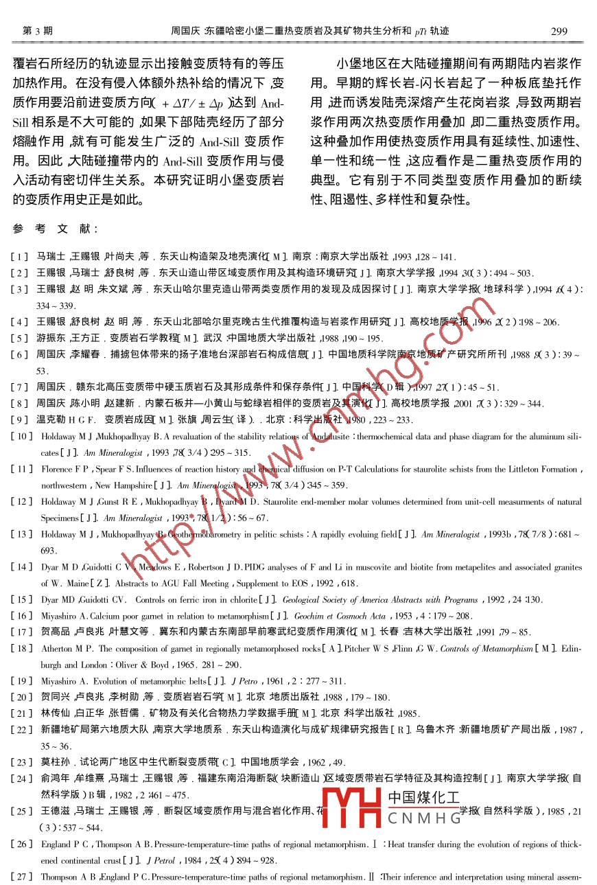 第24卷第3期礦物學(xué)報2004年9月ACTA MINERALOGICA SINICA2004文章編號:100047342004)30290-11東疆哈密小堡二重?zé)嶙冑|(zhì)巖及其礦物共生分析和pTt軌跡周國慶南京大學(xué)地球科學(xué)系江蘇南京210093)摘要哈密小堡變質(zhì)地體是石碳系含碳砂泥質(zhì)巖先后在315Ma和259M經(jīng)閃長巖和花崗巖體侵入導(dǎo)致的二重?zé)嶙冑|(zhì)作用產(chǎn)物其中含紅柱石鐵鋁榴石十字石黑云母綠泥石五種變斑晶角巖的變斑晶帶狀成分和結(jié)構(gòu)記錄了二重?zé)嶙冑|(zhì)作用特征。估算的兩期熱變質(zhì)峰期溫度壓力分別為530.58℃.29GP和566.06℃0.40GFa并獲得一反時針p軌跡。這些特征暗示了該區(qū)巖漿作用和熱變質(zhì)作用與板底墊托 underplating和碰撞造山帶因陸陸碰撞、地殼增厚誘發(fā)的深部地殼的深熔作用有關(guān)關(guān)鍵詞珨哈密小堡二重?zé)嶙冑|(zhì)巖礦物共生分析;I軌跡中圖分類號1571;588.34文獻標識碼:A作者簡介凋國慶男1936年生副教授巖石學(xué)小堡為哈密沁城東北的一個村。馬瑞士、王來看它類似但又不同于中壓區(qū)域變質(zhì)相系的巴賜銀等1-4多次報道過沿小堡他們稱為小鋪〃)羅帶在黑云母一鐵鋁榴石間出現(xiàn)了紅柱石51后小河發(fā)育的一套NNE-SsW向分布的變質(zhì)巖并將來在更高變質(zhì)級出現(xiàn)矽線石、堇青石具有典型的其歸結(jié)為斷裂區(qū)域變質(zhì)作用”在文獻3中又改低壓變質(zhì)相系特點。因此覺得有對斷裂區(qū)域變?yōu)閰^(qū)域熱變質(zhì)作用疊加了A型俯沖區(qū)域斷裂變質(zhì)作用”作一討論之必要質(zhì)作用”并在地質(zhì)圖圖1)的沁城一阿爾格提山斷裂之北標注有紅柱石、硅線石帶其南標注1小堡主要變質(zhì)巖的巖石學(xué)和變質(zhì)了十字石帶同時將該大斷裂劃在C2居里得楞組期次劃分層內(nèi)。但我們注意到,長約7.5km的變質(zhì)巖剖面為了考察多次巖漿侵入導(dǎo)致的熱變質(zhì)作用疊實為一夾在芨芨臺子和沁城-哈爾格蘭提山兩斷加效應(yīng)我們著重研究經(jīng)歷了多期變質(zhì)對變質(zhì)作裂之間向西陡傾的正斷層面,后期又多次被斷裂用反應(yīng)靈敏并記錄了整個變質(zhì)作用史的富碳粉砂破壞并糜棱巖化。小堡變質(zhì)巖剖面內(nèi)和附近有多質(zhì)頁巖或泥質(zhì)粉砂巖變成的紅柱石-鐵鋁榴石-十個小閃長巖體侵入東為一大花崗巖基巖基中也字石黑云母角巖(圖2)為了方便表示本文將包有不少閃長巖塊捕虜體西被第四系覆蓋南被使用以下礦物代號:Am鐵鋁石榴石,And紅柱沁城—阿爾格蘭提山斷裂所切,北為以火山巖為石Andr-鈣鐵榴石,Bi黑云母Chd-硬綠泥石Ch-主的泥盆系。作者經(jīng)野外及室內(nèi)觀察發(fā)現(xiàn)小堡綠泥石,Cor-青石, Graph-石墨AGm鈣鋁榴石,變質(zhì)巖不存在文獻1~3〕中劃分的矽線石紅柱G石榴石,Ky-藍晶石,Ms-白云母,Bp-葉臘石,石帶一紅柱石十字石帶一石榴石-黑云母帶一絹Pyr鎂鋁榴石Q-石英Sil矽線石St-十字石spe云母帶而且矽線石-堇青石組合在剖面北靠近錳鋁榴石S-石字石Jwa-鈣鉻榴石,V-蒸氣相花崗巖體紅柱石-石榴石-十字石組合更向南靠變質(zhì)作用與溫度T)壓力p減組分C近多個閃長巖體說明它們是砂泥質(zhì)巖先后被閃改變有關(guān)。對于C不發(fā)生變化的封閉體系變質(zhì)長巖體和花崗巖體侵入經(jīng)二重?zé)嶙冑|(zhì)作用疊加效作中國煤化工、p都改變時即為通應(yīng)而成。據(jù)特征礦物結(jié)束結(jié)晶順序綠泥石)黑常CNMHGT→0為動力變質(zhì)作云母一鐵鋁榴石一十字石一矽線石和沒有藍晶石用”當(dāng)Δp∽0,為熱接觸)質(zhì)作用”。對于開放體系變質(zhì)作用通常有流體組分參與當(dāng)△T→收稿日期2003-11-110,、C有變化時為壓溶作用當(dāng)△T→0,7、C有基金項目國家自然科學(xué)基金項目批準號:9672102)變化時為熱液蝕變作用當(dāng)只有C變化而△p周國慶東疆哈密小堡二重?zé)嶙冑|(zhì)巖及其礦物共生分析和pn軌跡哈爾克山。大石頭蘇頭桶禍寓子泉妹攻態(tài)奧姆爾塔格下馬崖十十A 268Ma十白石頭泉a石頭泉Cr城-哈爾格蘭提山斷裂哈示格蘭提山二宮1[2「,3[4區(qū)5巴6p:7[+8D-D2大南湖組中酸性火山巖及碳酸鹽巖綠片巖相C1牙滿蘇組凝灰?guī)r、砂巖及灰?guī)rC居里德楞組含礫及泥砂質(zhì)沉積巖角閃巖相A-B剖面位置閃長巖體2.改造型中粗粒片麻狀黑云母花崗財3.同熔型中細粒黑云母花崗巖4.淺色花崗巖5.鹼性花崗巖6.斷裂及A型俯沖帶7.硅線石及紅柱石8.十字石圖1小堡地區(qū)地質(zhì)簡圖Fig. 1. The geological sketch map for the Xiaopu, Hami, Xinjiang.用一個變質(zhì)作用時序678表示它們的變質(zhì)期次和歷史如下Q第一熱變質(zhì)期第一階段T富碳砂泥質(zhì)巖被閃長巖體侵入受熱轉(zhuǎn)變?yōu)楹谠颇附菐r顯示標準的角巖結(jié)構(gòu)。第一熱變質(zhì)期第二階段T;(變斑晶初生期)黑云母角巖增溫進級變質(zhì)依次出現(xiàn)了紅柱石—鐵鋁榴石一十字石變斑晶?;|(zhì)粒度變粗,分布不5X42均120℃附近,三聯(lián)點”平衡結(jié)構(gòu)清楚。變斑晶十字石呈明顯的帶狀構(gòu)造有1mm左右的碳質(zhì)帶分隔變斑晶呈碎斑為And、Alm、St、Bi,角巖基質(zhì)為 Q Bi rph(單偏光5×4)核心帶和過渡帶。有些十字石核心帶成棱角狀與圖2紅柱石鐵鋁榴石十字石黑云母角巖X173照片)過渡帶輪廓極不和諧表明核心帶結(jié)晶后曾受力,Photo showing metamorphic pyrophyrobla