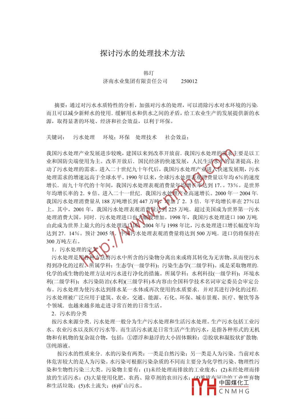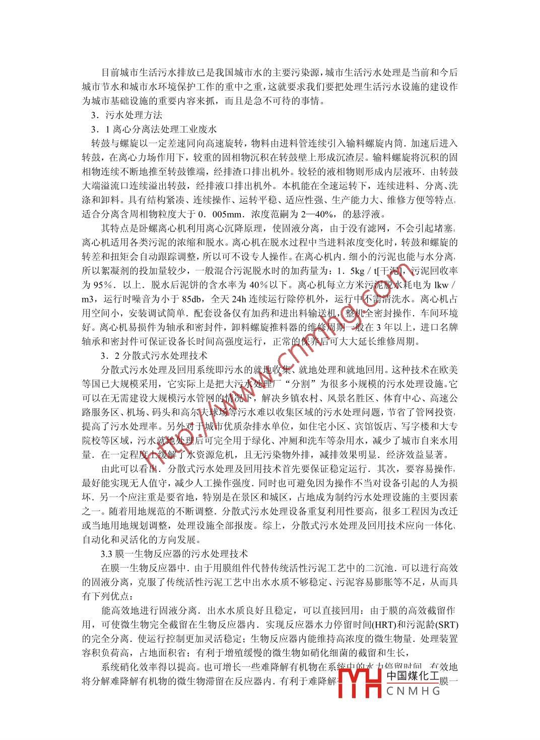 探討污水的處理技術(shù)方法韓玎濟(jì)南水業(yè)集團(tuán)有限責(zé)任公司25001 2摘要:通過對(duì)污水水質(zhì)特性的分析,加強(qiáng)對(duì)污水的處理,可以消除污水對(duì)水環(huán)境的污染,而且可以減少新鮮水的使用.緩解用水和供水之間的矛盾,給工農(nóng)業(yè)生產(chǎn)的發(fā)展提供新的水源,取得顯著的環(huán)境、經(jīng)濟(jì)和社會(huì)效益,以利于環(huán)保。關(guān)鍵詞:污水處理 環(huán)境; 環(huán)保處理技術(shù)社會(huì) 效益;我國(guó)污水處理產(chǎn)業(yè)發(fā)展進(jìn)步較晚,建國(guó)以來到改革開放前.我國(guó)污水處理的需求主要是以工業(yè)和國(guó)防尖端使用為主。改革開放后.國(guó)民經(jīng)濟(jì)的快速發(fā)展,人民生活水平的顯著提高.拉動(dòng)了污水處理的需求。進(jìn)入二十世紀(jì)九十年代后,我國(guó)污水處理產(chǎn)業(yè)進(jìn)入快速發(fā)展期,污水處理需求的增速遠(yuǎn)高于全球水平。1990年以來,全球污水處理表觀消費(fèi)量以年均6%的速度增長(zhǎng).而九十年代的十年間,我國(guó)污水處理表觀消費(fèi)量年均增長(zhǎng)率達(dá)到17.。73%。是世界年均增長(zhǎng)率的2.9倍。進(jìn)入二十一世紀(jì).我國(guó)污水處理產(chǎn)業(yè)高速增長(zhǎng)。2000 年一2004 年,我國(guó)污水處理消費(fèi)量從188萬噸增長(zhǎng)到447萬噸,增加了2.3倍.年平均增長(zhǎng)率在27%以上。其中,2001 年,我國(guó)污水處理表觀消費(fèi)量達(dá)到225萬噸。超過美國(guó)成為世界第一污水處理消費(fèi)大國(guó)。同時(shí).污水處理進(jìn)口也大幅度增加。1998 年,我國(guó)污水處理進(jìn)口100 萬噸.由此成為世界上最大的污水處理進(jìn)口國(guó)。2004年與1998 年比,污水處理進(jìn)口增長(zhǎng)幅度年均達(dá)到27.14%。預(yù)計(jì)2005年.中國(guó)污水處理表觀消費(fèi)量將達(dá)到500萬噸.進(jìn)口仍將保持在300萬噸左右。1.污水處理的定義污水處理是用各種方法將污水中所含的污染物分離出來或?qū)⑵滢D(zhuǎn)化為無害物,從而使污水得到凈化的過程。所屬學(xué)科:生態(tài)學(xué)(一-級(jí)學(xué)科);污染生態(tài)學(xué)(二級(jí)學(xué)科)。或是采取物理的、化學(xué)的或生物的處理方法對(duì)污水進(jìn)行凈化的措施。所屬學(xué)科:水利科技(- -級(jí)學(xué)科); 環(huán)境水利(二級(jí)學(xué)科);水污染防治(水利)(三級(jí)學(xué)科)本內(nèi)容由全國(guó)科學(xué)技術(shù)名詞審定委員會(huì)審定公布。污水處理為使污水達(dá)到排水某一水體或再次使用的水質(zhì)要求,并對(duì)其進(jìn)行凈化的過程。污水處理被廣泛應(yīng)用于建筑、農(nóng)業(yè),交通、能源、石化、環(huán)保、城市景觀、醫(yī)療、餐飲等各個(gè)領(lǐng)域.也越來越多地走進(jìn)尋常百姓的日常生活。2.污水的分類按污水來源分類.污水處理一般分為生產(chǎn)污水處理和生活污水處理。生產(chǎn)污水包括工業(yè)污水、農(nóng)業(yè)污水以及醫(yī)療污水等.而生活污水就是日常生活產(chǎn)生的污水,是指各種形式的無機(jī)物和有機(jī)物的復(fù)雜混合物,包括:①漂浮和懸浮的大小固體顆粒:②膠狀和凝膠狀擴(kuò)散物;③純?nèi)芤?。按污水的性質(zhì)來分.水的污染有兩類:一類是自然污染;另-類是人為污染。當(dāng)前對(duì)水體危害較大的是人為污染。水污染可根據(jù)污染雜質(zhì)的不同而主要分為化學(xué)性污染、物理性污染和生物性污染三大類。污染物主要有: (1)未經(jīng)處理而排放的工業(yè)廢水: (2)未經(jīng)處理而排放的生活污水; (3)大量使用化肥、農(nóng)藥、除草劑的農(nóng)田污水; 4堆放車河邊的工業(yè)座棄物中國(guó)煤化工和生活垃圾: (5)水 土流失; (6)礦山污水。MHCNMH G目前城市生活污水排放已是我國(guó)城市水的主要污染源,城市生活污水處理是當(dāng)前和今后城市節(jié)水和城市水環(huán)境保護(hù)工作的重中之重,這就要求我們要把處理生活污水設(shè)施的建設(shè)作為城市基礎(chǔ)設(shè)施的重要內(nèi)容來抓,而且是急不可待的事情。3.污水處理方法3.1離心分離法處理工業(yè)廢水轉(zhuǎn)鼓與螺旋以一定差速同向高速旋轉(zhuǎn),物料由進(jìn)料管連續(xù)引入輸料螺旋內(nèi)筒.加速后進(jìn)入.轉(zhuǎn)鼓,在離心力場(chǎng)作用下,較重的固相物沉積在轉(zhuǎn)鼓壁上形成沉渣層。輸料螺旋將沉積的固相物連續(xù)不斷地推至轉(zhuǎn)鼓錐端,經(jīng)排渣口排出機(jī)外。較輕的液相物則形成內(nèi)層液環(huán).由轉(zhuǎn)鼓大端溢流口連續(xù)溢出轉(zhuǎn)鼓,經(jīng)排液口排出機(jī)外。本機(jī)能在全速運(yùn)轉(zhuǎn)下,連續(xù)進(jìn)料、分離、洗滌和卸料。具有結(jié)構(gòu)緊湊、連續(xù)操作、運(yùn)轉(zhuǎn)平穩(wěn)、適應(yīng)性強(qiáng)、生產(chǎn)能力大、維修方便等特點(diǎn)。適合分離含周相物粒度大于0.005mm.濃度范嗣為2- -40%, 的懸浮液。其特點(diǎn)是臥螺離心機(jī)利用離心沉降原理,使固液分離,由于沒有濾網(wǎng),不會(huì)引起堵塞。離心機(jī)適用各類污泥的濃縮和脫水。離心機(jī)在脫水過程中當(dāng)進(jìn)料濃度變化時(shí),轉(zhuǎn)鼓和螺旋的轉(zhuǎn)差和扭矩會(huì)自動(dòng)跟蹤調(diào)整,所以可不設(shè)專人操作。在離心機(jī)內(nèi).