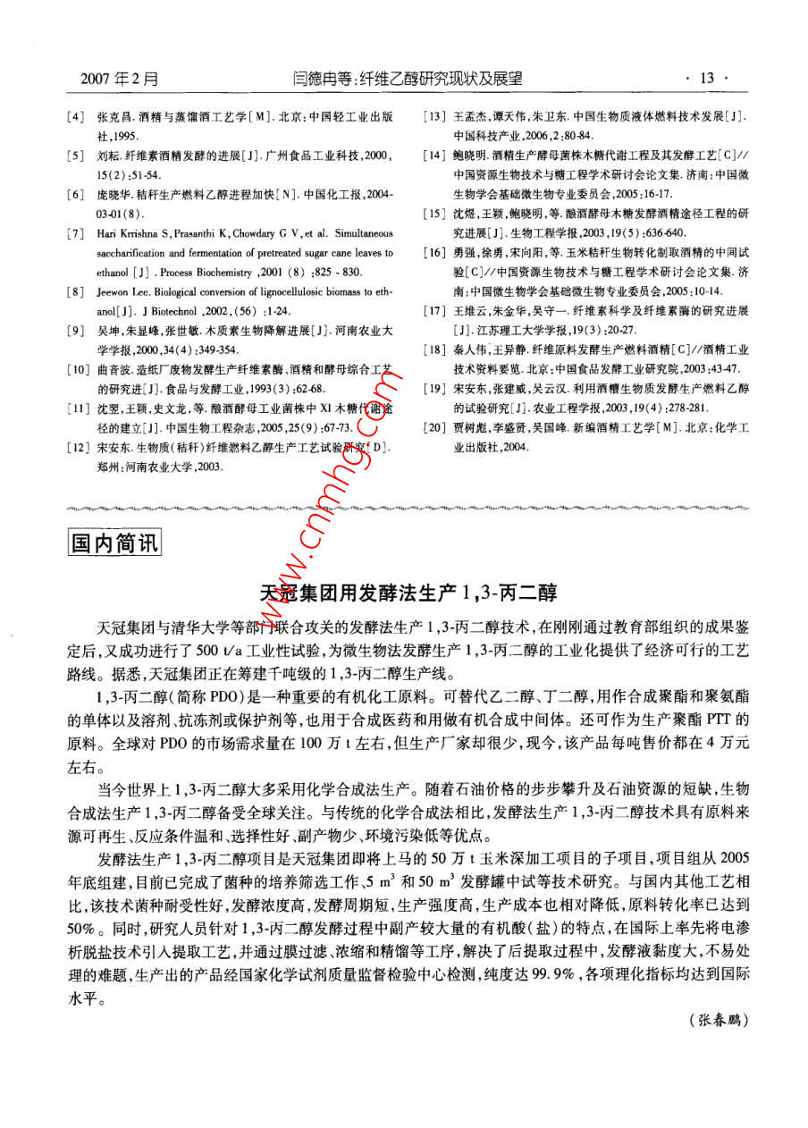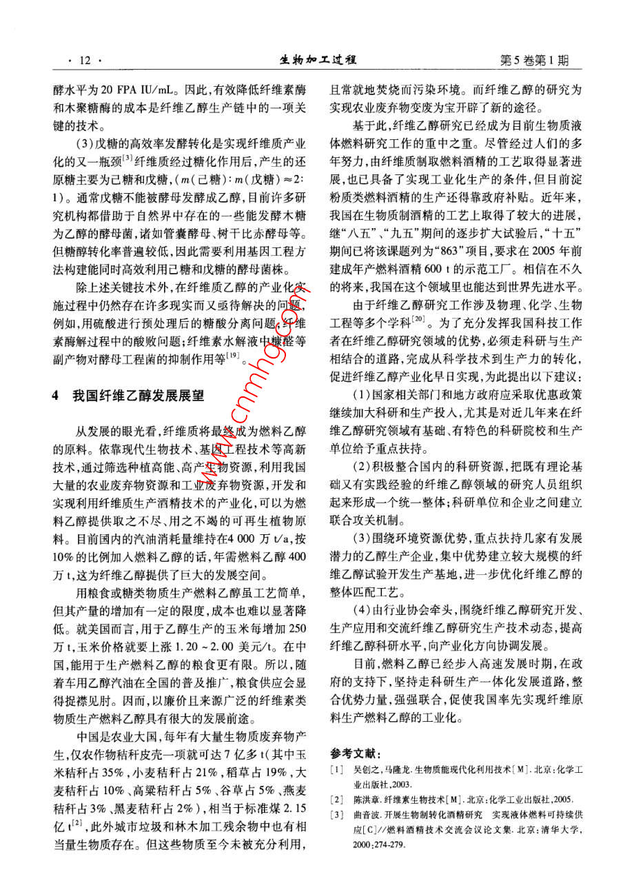 第5卷第1期生物加工過程Feb.20072007年2月 Chinese Journal of Bioprocess Engineering9纖維乙醇研究現(xiàn)狀及展望閆德冉,陳偉紅,張麗莉2,杜風(fēng)光,宋安東3(1.河南天冠集團(tuán),南陽473000:2.南陽市環(huán)??蒲兴?南陽473000;3.河南農(nóng)業(yè)大學(xué)生命科學(xué)學(xué)院,鄭州450002)摘要:介紹了近年來國內(nèi)外纖維乙醇的研究現(xiàn)狀,闡述了目前纖維乙醇生產(chǎn)存在的問題,分析了纖維乙醇產(chǎn)業(yè)化亟待解決的關(guān)鍵技術(shù),展望了纖維乙醇的發(fā)展。關(guān)鍵詞:纖維乙醇;糖化;發(fā)酵中圖分類號:S826.5文獻(xiàn)標(biāo)識碼:A文章編號:1672-3678(20071-0004-05 Recent research Progress and prospect of cellulose fuel ethanol YAN De-ran', CHEN Wei-hong', ZHANG Li-li2, DU Feng-guang', SONG An-dong'.2 (1. Henan Tianguan Group, Nanyang 473000, China; 2. Institute of Enviromental protection Research, Nanyang 473000,China; 3. College of Life Science, Henan Agricultural University, Zhengzhou 450002, China) Abstract: The reseach process and application of the cellulose fuel ethanol was introduced. The general situation of the cellulose ethanol technology inland and abroad was summarized. The key problems in the cellulose ethanol industrialized process were analyzed. The development strategies of the cellulose etha- nol was discaussed. Key words: cellulose fuel ethanol; saccharification; fermentation纖維素制酒精技術(shù)在19世紀(jì)已提出,并在美國質(zhì)制燃料酒精的技術(shù)。以美國國家可再生能源實和前蘇聯(lián)建有工廠。其方法是把原料中的纖維素驗室( National Renewable Energy Laboratory,簡稱水解為單糖,再把單糖發(fā)酵成為酒精。該工藝的原NREL)為代表的研究者進(jìn)行了大量的工作,使該技料價格雖然便宜,但生產(chǎn)成本卻很高,隨著以石油術(shù)取得了長足的進(jìn)步,預(yù)期生產(chǎn)成本已降低一半以為原料的合成酒精大量生產(chǎn),這類廠大都關(guān)閉,只上目前纖維乙醇生產(chǎn)在技術(shù)上已無問題,但在有前蘇聯(lián)還有生產(chǎn)。我國黑龍江省伊春市的南岔經(jīng)濟(jì)性方面仍需要解決許多制約因素,因此世界各木材水解廠是20世紀(jì)60年代引進(jìn)前蘇聯(lián)設(shè)備建成國所建纖維乙醇生產(chǎn)線大多只能算作示范性工廠,的,80年代末又引進(jìn)該國設(shè)備與技術(shù)進(jìn)行改造,要真正實現(xiàn)纖維乙醇產(chǎn)業(yè)化還需要很長的一段路木屑為原料,年產(chǎn)酒精3000t,之后因缺乏原料等原要走。因而停產(chǎn)。本世紀(jì)初,伴隨著國際石油價格的一路狂飆及在20世紀(jì)石油危機(jī)后,西方國家開始重視生物世界各國對能源需求的增加,利用纖維質(zhì)原料生產(chǎn)收稿日期:2006-10-19基金項目:國家科技部“863”資助項目(2001AA51402002);河南省杰出人才創(chuàng)新基金資助項目(321001300;河南省科技廳重點攻關(guān)資助項目(0423022900)作者簡介:德(1968-),男,河南南陽人,工程師,研究方向:生物工程-mai l yanderan tom.com10生物加工過程第5卷第1期乙醇工藝的研究和開發(fā)成為目前國內(nèi)外研究的重蒸發(fā)器濃縮至糖質(zhì)量分?jǐn)?shù)為11%再進(jìn)行發(fā)酵點,如何開發(fā)高效廉價的纖維質(zhì)原料預(yù)處理技術(shù)、為了降低纖維酒精的生產(chǎn)成本,美國 Novozymes選育誘變產(chǎn)高酶活的纖維素酶生產(chǎn)菌株、構(gòu)筑能同公司和美國NREL合作開發(fā)的生物基乙醇燃料項目化五碳糖的酵母菌株以及實現(xiàn)相對高濃度發(fā)酵等獲重大進(jìn)展,將生產(chǎn)1L燃料乙醇所需纖維素酶的是降低纖維乙醇成本的關(guān)鍵國外在這方面做成本從最初超過1.32美元的水平大幅減少至當(dāng)前了大量的研究工作,并建起了一定規(guī)模的中試生產(chǎn)的低于13.2美分。 Novozymes公司和NREL下一步廠。我國在“十五”期間已將纖維乙醇研究工作提將努力降低纖維素酶的生產(chǎn)成本,目標(biāo)是在未來的上日程,并在國家“863計劃中作為研究課題進(jìn)行兩年中把生產(chǎn)1L燃料乙醇所需纖維素酶的成本降重點攻關(guān),國內(nèi)的河南天冠、安徽豐原和河北唐山低至2.65美分。另外,美國普度大學(xué)的何汪媛教的太博爾等企業(yè)也在進(jìn)行這方面的研究工作。授利用基因工程技術(shù)構(gòu)建了可發(fā)酵戊碳糖的酵母菌株,為半纖維素的酒精轉(zhuǎn)化奠定了基礎(chǔ)。1國外纖維乙醇研究的現(xiàn)狀近年來,隨著纖維乙醇技術(shù)的快速發(fā)展,歐美國家的一些大公司已決定建造較大規(guī)模的工廠。纖維乙醇的生產(chǎn)包括酸水解和酶水解兩種工 BC International公司計劃投資9000萬美元(其中能藝。酸水解生產(chǎn)工藝最具代表性的是前蘇聯(lián)的連源部投資1100萬美元),將一個閑置的煉油廠改造續(xù)滲濾水解流程、美國 Vulcan化工公司與加拿大的成年產(chǎn)燃料酒精7600萬L的生產(chǎn)廠。該廠以甘蔗 StakeVulcan-Stake公司聯(lián)合研制的-流程連續(xù)滲殘渣為原料,采用稀硫酸水解,其核心技術(shù)是轉(zhuǎn)基濾水解流程是前蘇聯(lián)木材水解制造酒精的主要工因的E.coli(由佛羅里達(dá)大學(xué)開發(fā)),該菌株可發(fā)酵藝流程,該工藝流程首先將木材粉碎后由帶式輸送水解液中的全部單糖 Masada Resource公司計劃器填入水解器中,水解后剩下的木質(zhì)素通過排渣器投資1.5億美元,建造年產(chǎn)乙醇3600萬L的工廠。排出器外水解液從水解器流