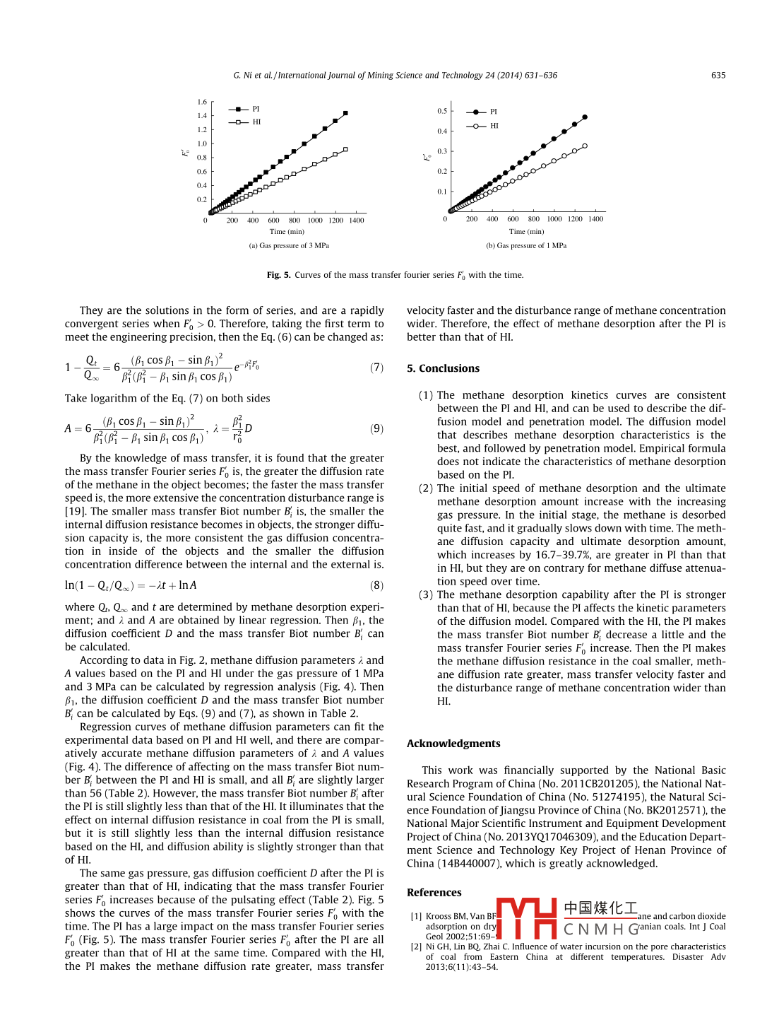 International Journal of Mining Science and Technology 24(2014)631-636Contents lists available at Science DirectInternational Journal of Mining Science and TechnologyELSEVIERurnalhomepagewww.elsevier.com/locate/ijmstKinetic characteristics of coal gas desorption based on the pulsatingInjectionNi Guanhua, D, * Lin Baiquan Zhai Cheng, Li Quangui a, D, Peng Shen. Li Xianzhong CSchool of Safety Engineering, China University of Mining 8 Technology, XuzhouState Key laboratory of Coal Resources and Mine Safety, Xuzhou 221116, ChinaSchool of Energy Science and Engineering, Henan Polytechnic University, Jiaozuo 454000, ChinaARTICLE INFOABSTRACTArticle histoorder to understand the kinetic characteristics of coal gas desorption based on the pulsating injectionReceived 13 October 2013(PI), the research experimentally studied the kinetic process of methane desorption in terms of the pl andReceived in revised form 9 January 2014Accepted 18 March 2014hydrostatic injection(HI). The results show that the kinetic curves of methane desorption based on Pl andAvailable online 29 August 2014HI are consistent with each other, and the diffusion model can best describe the characteristics of methane desorption. Initial velocity, diffusion capacity and ultimate desorption amount of methane desorptionafter Pl are greater than those after HI, and the ultimate desorption amount increases by 16.7-39.7%Methane decay rate over the time is less than that of the Hl. The Pl influences the diffusion model paramHydrostatic injectioneters, and it makes the mass transfer Biot number b, decrease and the mass transfer Fourier series FoMethane desorptionincrease. As a result pi makes the methane diffusion resistance in the coal smaller methane diffusion rategreater, mass transfer velocity faster and the disturbance range of methane concentration wider than HITherefore, the effect of methane desorption based on Pl is better than that of HIo 2014 Published by Elsevier B V on behalf of China University of Mining Technology1 Introductionshow that a large amount of gas was expelled during the closureof fracture due to the confining pressureThe methane is not only a kind of clean energy and valuableWith the increase of coal mining depth and exploitation intenchemical material, but also a substantial root causing coal and sity, coal outburst and gas explosion seriously threaten minersgas outburst as well as explosion. In the natural coal, the fracture personal safety, and restrict the development of coal mines. Effinetwork is arranged by a large number of pores and cracks, from ciently and safely relieving pressure of coal seam is an importantthe defect in a molecular or atomic scale to visible cracks, with guarantee to the safe production of coal mines. In recent years,considerable specific surface area and strong methane adsorption all kinds of hydraulic measures have been taken in managing minecapacity. The methane is adsorbed on the inner surface of the coal gas and prevention of coal and gas outburst by coal mining entermatrix physically. Methane adsorption and desorption characteris- prises and scholars, including hydraulic fracturing, coal seam watertics are related to not only the pore structure of coal, metamor7. Conventional hydro-hism, ash, moisture and other intrinsic factors, but also gas static injection(Hi) can play a role in wetting the coal. Howeverpressure, temperature, stress, electric field, magnetic field and due to blocking up the channel of the gas desorption and migrationacoustic field [1, 2]. Chen et al. determined the methane adsorption by the water, there is a blocking effect on the gas desorption, whichcharacteristics of the anthracite at different temperatures by the has been confirmed by many scholars [8, 9 Pulsating injection(pl)olumetric method [3]. Their results show that the equilibrium is a new technology based on the original coal seam water injectime of methane adsorption increased from 5 h at 50C to 25 h tion and aimed at improving pressure relief of the coal seamdied by He et al, using an experimental seam permeability (10 Zhai et al. took hydraulic fracturing expesystem with temperature-pressure coupling [4 Their results iments and mechanical analysis under the different pressures andfrequencies, and analyzed the characteristics of coal fatigue damage [11]. Their results showed that alternating stress was formedhor at: School of Safety Engineering. China University ofXuzhou221116, China.Tel:+8615950668058.at the end of coal中國煤化工 he pulsating water,gh0101@163.com(g.Ni).and fatigue damag-le to the repeatedCNMHGhttp://dx.doiorg/10.1016/j.ijmst.2014.03.0232095-2686 2014 Published by Elsevier B V on behalf of China University of Mining TechnologyG Ni et al. / International Journal of Mining Science and Technology 24(2014)631-636Decompression valveManometer地中十Shutoff valve 3High-pressure gasPulse injectiShutoff valve 5 Sydrostatic injectiorpumpFig 1. Methane desorption system based on the Pl and HItime after PI and Hl, and comparatively analyzes the kinetic char4-4acteristics of coal gas desorption based on Pl2. Kinetic characteristics of methane desorption-e Pl of 3 MPa -o-HI of 3 MPaIn order to explore the kinetic characteristics of methane4 PI of I mpa亠 HI of I MPadesorption, this research has made unremitting efforts to establish20040060080010001200a variety of dynamic models, and put forward a number of equations to calculate the changes of methane desorption amount overthe time in coalFig. 2. Curves of gas desorption amount with time based on the Pl and HI2.1. Empirical equationsaction of compression and expansion. Li et al. investigated the gen-Wang and Yang determined the velocity of the coal gas desorperation and propagation of pulsating stress wave and the mecha- tion using the gravimetric method, and put forward Eq. (1)to indilaboratory experiment and field test [12 ] Their study shows that cate the amount of desorption over the time [15]reflection and superposition of puls