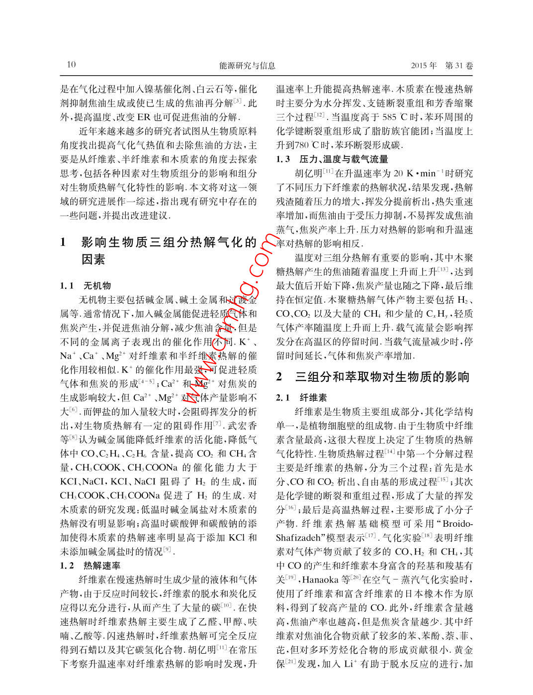 能源研究與信息第31卷第1期Energy Research and InformationVol.31 No.1 2015文章編號:1008-8857(2015)01 - 0009-05DOI: 10.13259/j. cnki. eri.2015. 01.003生物質(zhì)組分熱解氣化特性研究現(xiàn)狀蔣林宏,俞海淼(同濟大學(xué)機械與能源工程學(xué)院,上海201804)摘要:為了提升生物質(zhì)氣化氣熱值,減少焦油產(chǎn)率,越來越多的研究者開始試圖從生物質(zhì)組分的角度對熱解氣化特性進(jìn)行探索.概述了堿金屬、溫度、壓力、升溫速率在熱解氣化過程中對生物質(zhì)組分造成的影響,以及纖維素、半纖維素、木質(zhì)素、萃取物和組分間相互作用對生物質(zhì)熱解氣化過程造成的影響。提出了在二組分相互作用研究的基礎(chǔ)上,應(yīng)繼續(xù)開展三組分相互作用的實驗研究,以及生物質(zhì)?;锖蜕镔|(zhì)原料化學(xué)結(jié)構(gòu)差異對生物質(zhì)原料熱解氣化特性的影響。此外,提出了采用單變量對照實驗方法研究單變量的作用大小.關(guān)鍵詞:三組分;萃取物;相互作用中圖分類號: TK6文獻(xiàn)標(biāo)志碼: AResearch status on gasification and pyrolysischaracteristics of biomass componentsJIANG Linhong, YU Haimiao .(School of Mechanical Engineering. Tongji University, Shanghai 201804, China)Abstract: In order to improve the heating value of the gaseous product and decrease theyield of tar from the pyrolysis and gasification of biomass, the pyrolysis and gasificationcharacteristics of biomass components are investigated widely. The effects of the alkali,temperature, pressure,and heating rate on the pyrolysis and gasification are summarized.The effects of cellulose, hemicellulose,lignin and the interactions between them on thegasification and pyrolysis are also discussed. Besides those, the effects of the interactionsamong three components, the difference among the biomass model compounds, and thchemical structure of the biomass on the gasification characteristics require some furtherinvestigations on the foundation of the two components experiments. At last, the singlevariable controlled experiments are proposed to study the effect of the single factor.Key words: three component; extract; interaction生物質(zhì)氣化和熱解是將生物質(zhì)能源轉(zhuǎn)換為高化技術(shù)的推廣.提高熱值的傳統(tǒng)方法包括提高氣品位氣體燃料時使用的一-種有效利用生物質(zhì)能源化溫度和當(dāng)量比(ER)、加入催化劑、改變物料特的方式之一切.但其也存在著諸多問題,以生物質(zhì)性21.焦油對氣化過程以及相關(guān)的設(shè)備和實驗人氣化為例,主要有氣化氣低熱值以及焦油等問題.員造成很大危害.去除焦油的傳統(tǒng)方法包括催化氣化氣熱值過低導(dǎo)致氣化氣成本上升,阻礙了氣裂解、烘培.低溫慢速熱解處理等.催化裂解主要收稿日期: 2014-05- 06第一作者:蔣林宏(1990- ),男,碩士研究生.研究方向:生物質(zhì)氣化. E-mail: 448455796@ qq. com通信作者:俞海森(1976- ),男,副教授.研究方向:生物質(zhì)氣化. E-mail: myhtongji@ 126. com10能源研究與信息2015年第31卷是在氣化過程中加人鎳基催化劑、白云石等.催化溫速率上升能提高熱解速率.木質(zhì)素在慢速熱解劑抑制焦油生成或使已生成的焦油再分解5]。此時主要分為水分揮發(fā)、支鏈斷裂重組和芳香縮聚外,提高溫度、改變ER也可促進(jìn)焦油的分解,三個過程[2],當(dāng)溫度高于585 C時,苯環(huán)周圍的近年來越來越多的研究者試圖從生物質(zhì)原料化學(xué)鍵斷裂重組形成了脂肪族官能團;當(dāng)溫度上角度找出提高氣化氣熱值和去除焦油的方法,主升到780 C時,苯環(huán)斷裂形成碳.要是從纖維素、半纖維素和木質(zhì)素的角度去探索.3 壓力、溫度與載氣流量思考,包括各種因素對生物質(zhì)組分的影響和組分胡億明11]在升溫速率為20 K●min~ '時研究對生物質(zhì)熱解氣化特性的影響.本文將對這一領(lǐng)了不同壓力下纖維素的熱解狀況,結(jié)果發(fā)現(xiàn).熱解域的研究進(jìn)展作一.綜述,指出現(xiàn)有研究中存在的殘渣隨著壓力的增大,揮發(fā)分提前析出,熱失重速一些問題,并提出改進(jìn)建議.率增加,而焦油由于受壓力抑制,不易揮發(fā)成焦油蒸氣,焦炭產(chǎn)率上升.壓力對熱解的影響和升溫速影響生物質(zhì)三組分熱解氣化的率對熱解的影響相反.因素溫度對三組分熱解有重要的影響,其中木聚糖熱解產(chǎn)生的焦油隨著溫度上升而上升[13] ,達(dá)到1.1無機物最大值后開始下降.焦炭產(chǎn)量也隨之下降,最后維無機物主要包括堿金屬、堿土金屬和過渡金持在恒定值.木聚糖熱解氣體產(chǎn)物主要包括H2、屬等.通常情況下,加入堿金屬能促進(jìn)輕質(zhì)氣體和CO、CO2 以及大量的CH和少量的C.H,輕質(zhì)焦炭產(chǎn)生,并促進(jìn)焦油分解,減少焦油含量,但是氣體產(chǎn)率隨溫度上升而上升.載氣流量會影響揮不同的金屬離子表現(xiàn)出的催化作用不同. K*、發(fā)分在高溫區(qū)的停留時間.當(dāng)載氣流量減少時,停Na+、Ca*、Mg2+對纖維素和半纖維素?zé)峤獾拇吡魰r間延長,氣體和焦炭產(chǎn)率增加.化作用較相似.K*的催化作用最強,可促進(jìn)輕質(zhì)2三組分和萃取物對生物質(zhì)的影響氣體和焦炭的形成[+-5];Ca+和Mg+對焦炭的生成影響較大,但Ca+、Mg°對氣體產(chǎn)量影響不2.1纖維素大回。而鉀鹽的加入量較大時,會阻礙揮發(fā)分的析纖維素是生物質(zhì)主要組成部分,其化學(xué)結(jié)構(gòu)出,對生物質(zhì)熱解有一-定的阻礙作用口.武宏香單一,是