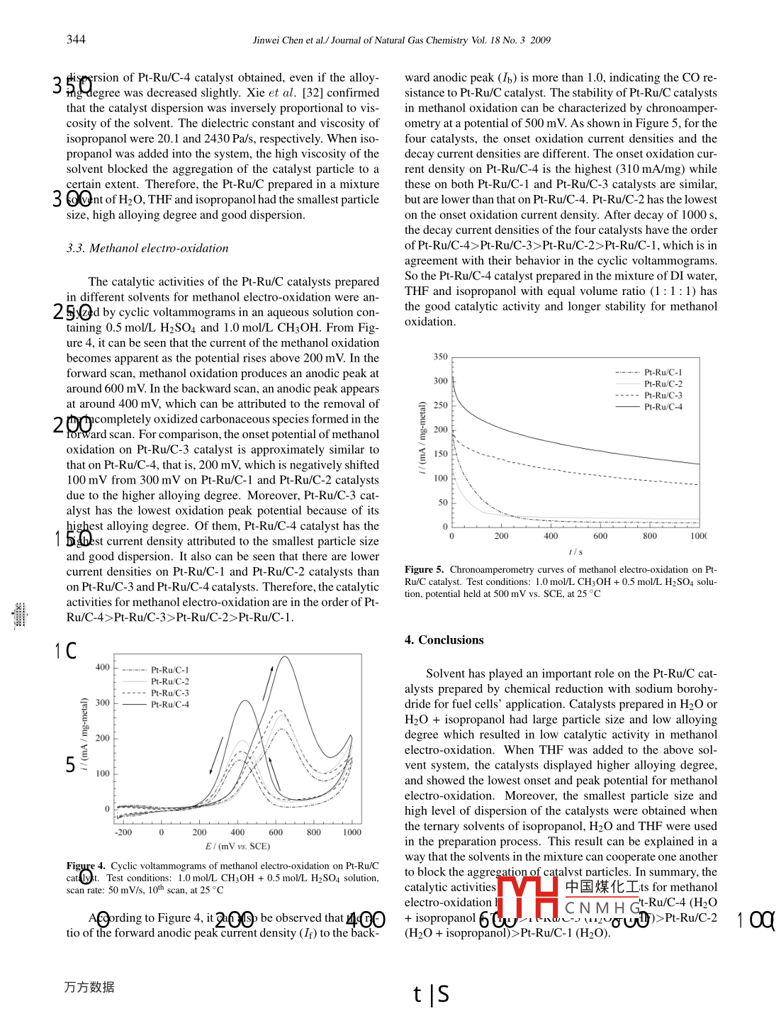 Available online at www.sciencedirect.comJOURNAL:OFScienceDirectNATURAL GASCHEMISTRYELSEVIERJournal of Natural Gas Chemistry 18(2009) 341- -345www.elsevier.com/locatejngcSolvent effects on Pt- Ru/C catalyst for methanol electro-oxidationJinwei Chen,Chunping Jiang,Hui Lu,Lan Feng,Xin Yang,Liangqiong Li,Ruilin Wang*College of Materials Science and Engineering, Sichuan University, Chengdu 610065, Sichuan, China[ Received February 27, 2009; Revised April 21, 2009; Available online July 28, 2009 ]AbstractAlloying degree, particle size and the level of dispersion are the key structural parameters of Pt-Ru/C catalyst in fuel cells. Solvent(s) usedin the preparation process can affect the particle size and alloying degree of the object substance, which lead to a great positive impact on itsproperties. In this work, three types of solvents and their mixtures were used in preparation of the Pt-Ru/C catalysts by chemical reductionof metal precursors with sodium borohydride at room temperature. The structure of the catalysts was characterized by X-ray diffraction(XRD) and Transmission electron microscopy (TEM). The catalytic activity and stability for methanol electro- oxidation were studied by CyclicVoltammetry (CV) and Chronoamperometry (CA). Pt-Ru/catalyst prepared H2O or binary solvents of H2O and isopropanol had largeparticle size and low alloying degree leading to low catalyability in. methanol electro-oxidation. When tetrahydrofuranwas added to the above solvent systems, Pt-Ru/C catalyst prA AliAand higher loying degee which rsuted in bteriditcatalytic activity, lower onset and peak potentials, comparM oreover, the catalyst prepared in ternary solven[of isopropanol, water and tetralhydrofuran had the smallestpying degree and the dispersion kept unchangeTherefore, this kind of catalyst showed the highest catalytichi y bruothanol electro oxidation.Key wordssolvent effect; fuel cell; methanol electro -oxidation; Pt-Ru/C catalyst; tetrahydrofuran1. IntroductionPt through the bifunctional mechanism or electronic effect[9,12-14]. In many possibilities, the binary Pt-Ru alloy isMethanol is a fundamental product of C1 chemistry in-generally regarded as the most promising candidate [15-17]. .dustry [1]. It can be economically produced from a varietyAnd numerous studies have been directed toward the synthe-of resources, such as natural gas, coal, heavy oil, and so forthsis and structure-activity relationship of this kind of catalyst[2]. Methanol has many applications in the chemical indus-[18- -21]. The dispersion, particle size and alloying degree atry. In recent years,fuel cell has been widely recognized as .important factors to be considered in order to obtain a goca very attractive device to obtain directly electric energy fromelectro-catalytic activity.the combustion of a chemical product, and has been exten-monly prepared starting from PuC followed by the depositiosively investigated [3- -8]. Among them, the direct methanol of the second metal (M) on PU/C and annealed at high tem-fuel cell has been developed for portable devices such as mo-peratures [22]. However, the heat treatment gives rise to un-bile telephones and laptops on account of its simple designdesired metal particles, which resulted in the decrease of Ptand operation. The direct oxidation of methanol in fuel cellsmass activity in methanol oxidation. An alternative way tohas been extensively studied [9-11]. Platinum is regardedprepare carbon supported Pt-based alloys with small particleas the most active metal for methanol oxidation. However, size is the simultaneous impregnation of Pt and M precursorsstrongly adsorbed CO-like species block the surface of Pt foron the carbon support, followed by reduction at low tempera-further methanol adsorption and result in low DMFC powerture with reducing agents. In the impregnation method at lowdensity. Therefore, Pt-based bimetal, ternary, even quater-temperature, solvent is one of the important factors in obtain-nary catalysts have been used to mitigate CO poisoning ofing catalysts with appropriate structural parameters. The" Corresponding author. Tel&Fax: +86-028-8541801 8; E-mail: rl.wang @ scu.edu.cnThis work was supported by 863 Project (No. 2006AA05Z102), and the Cultivation Fund of the KeY Seintific and Terhnical Inovation Project, Ministryof Education of China (No. 707050), Specialized Research Fund for the Doctoral Program of Higher Educa中國(guó)煤化工du Natural ScienceFoundaion (Nos.06GGYB449GX 030, and 07GGZD139GX).fYHCNM HGopyright@2009, Dalian Institute of Chemical Physics, ChineseAcademy of Sciences. All ighs rserve.doi: 10.1016/S 10039953(08)601 14-0342Jinwei Chen et al./ Journal of Natural Gas Chemistry Vol. 18 No.3 2009mixture solvents of H20 and isopropanol have been com-monly employed as the solvent of the precursors [23], andpatterns were obtained at a scanning rate of 4/min with ancatalysts with small particle size are obtained, however, theangular resolution of 0.06° of the scan in the range of 10°alloying degree is low. Recently, Chen et al. [24] reported aand 90°. Transmission electron microscopy (TEM) experi-significant increase in alloying degree when the mixture solu-ments were performed with a JEOL, JEM-100CX II micro-tion of H2O and tetrahydrofuran (THF) was used as the sol-scope. Before taking the electron micrographs, the catalystvent. However, the pH levels and different solvents in prepa-samples were finely ground and ultrasonically dispersed inration process can result in low activity. A modified routeethanol. Then a drop of the resultant dispersion was depositedwas proposed in this paper. Pt-Ru/C catalysts with high ac-on a standard copper grid and dried in air.tivity were obtained using the mixture solvents of H2O, iso-propanol and THP with appropriate pH. The structural param-2.3. Electrode preparation and electrochemical measurementeters of Pt-Ru/C catalyst relied on the solvents used in the pre-pared process, and the high catalytic activity was 