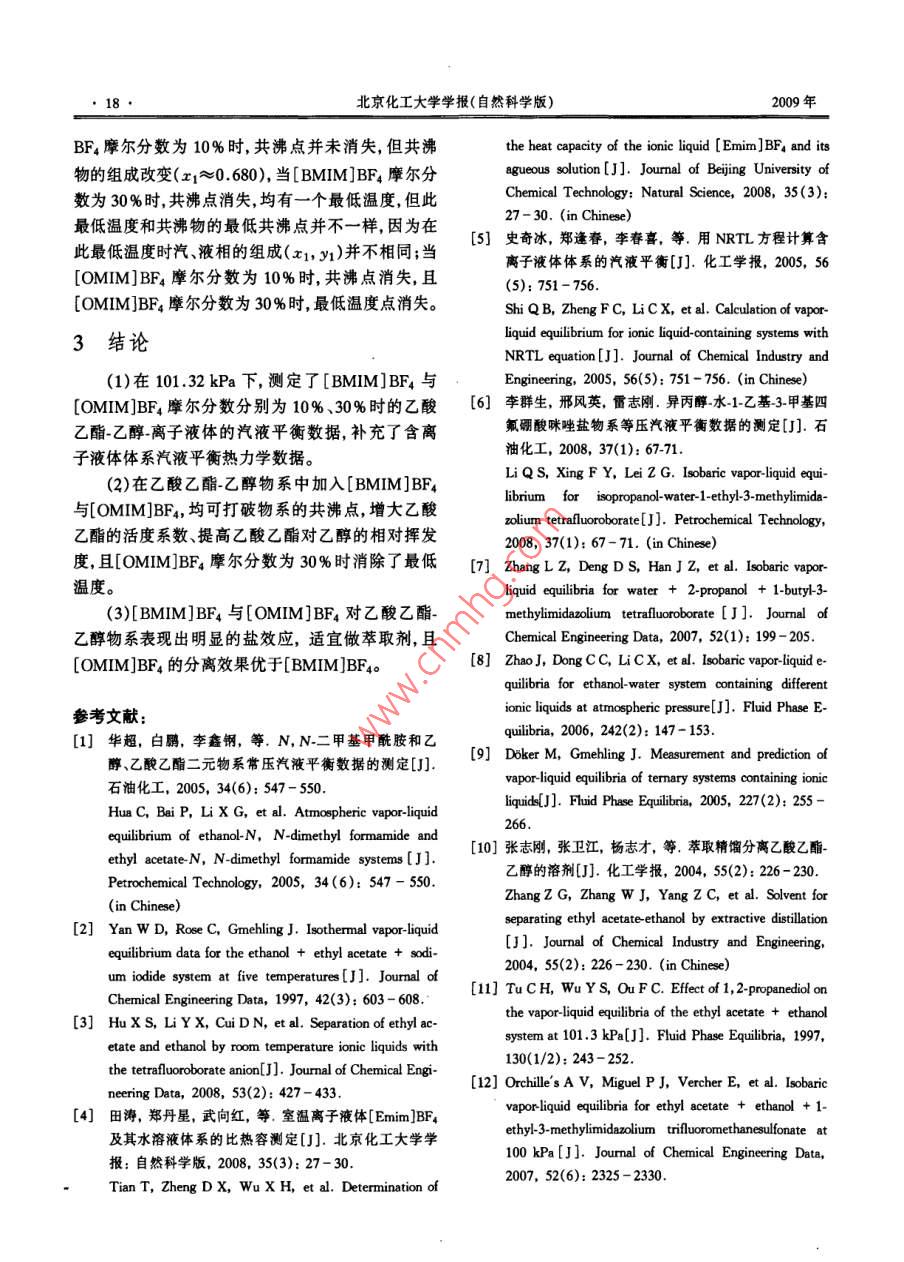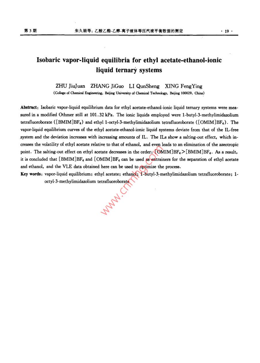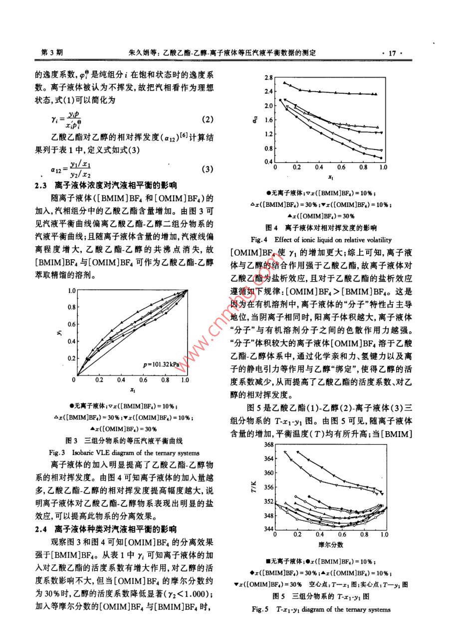 第36卷第3期北京化工大學(xué)學(xué)報(自然科學(xué)版)Vol 36, No. 32009年Journal of Beijing University of Chemical Technology(Natural Science)2009乙酸乙酯-乙醇-離子液體等壓汽液平衡數(shù)據(jù)的測定朱久娟張繼國李群生”邢風(fēng)英(北京化工大學(xué)化學(xué)工程學(xué)院,北京100029)摘要:在101.32kPa下,用改進的 Othmer釜測定了兩種乙酸乙酯乙醇離子液體三元物系的等壓汽液平衡數(shù)據(jù),即乙酸乙酯乙醇-1-丁基3-甲基咪唑四氟硼酸鹽([BMIM]BF4)與乙酸乙酯乙醇1-辛基3-甲基咪唑四氟硼酸鹽([OMIM]BF4)。實驗結(jié)果表明:加入[BMIM]BF4和[OMIM]BF4,汽液平衡線偏離乙酸乙酯乙醇物系的汽液平衡線;離子液體摩爾分數(shù)越大偏離程度越大;[BMIM]BF4與[OMM]BF4表現(xiàn)出明顯鹽效應(yīng)使乙酸乙酯對乙醇的相對揮發(fā)度發(fā)生改變,均消除了乙酸乙酯乙醇物系的共沸點。離子液體對乙酸乙酯的鹽析效應(yīng)順序為:[OMIM]BF4> [BMIM]BF4。因此,[BMIM]BF4和[OMM]BF4可以作為乙酸乙酯乙醇物系萃取精餾的溶劑汽液平衡數(shù)據(jù)的測定可為分離過程優(yōu)化設(shè)計提供依據(jù)。關(guān)鍵詞:汽液相平衡;乙酸乙酯;乙醇;1-丁基3甲基咪唑四氟硼酸鹽;1-辛基-3-甲基咪唑四氟硼酸鹽中圖分類號;TQ013.1引言BF4/[OMIM]BF4)三組分物系等壓汽液平衡數(shù)據(jù),并討論了離子液體對乙酸乙酯乙醇共沸物物系分乙酸乙酯是應(yīng)用廣泛的脂肪酸酯之一,因其具離的不同影響。有極好的溶解性,故被應(yīng)用于涂料、水果香精等山目前,乙酸乙酯主要由乙酸和乙醇通過酯化反應(yīng)生1實驗部分產(chǎn)工業(yè)上采用乙醇過量的方法提高生產(chǎn)率,而乙酸1.1原料乙酯與乙醇的沸點只差1℃,常壓下形成共沸物,乙酸乙酯、乙醇,分析純,天津化學(xué)試劑公司;不能用一般的精餾方法分離因此國內(nèi)外在乙酸乙[BMM]BF4、OMM]BF,質(zhì)量分數(shù)大于98%,河酯與乙醇的分離方面做了大量的工作13北師范大學(xué)化學(xué)化工研究所。共沸體系不能通過簡單蒸餾實現(xiàn)完全分離。離1.2實驗裝置子液體作為一種新型“綠色”溶劑因其溫度范圍寬、實驗中所采用的汽液相平衡裝置為北洋化工實蒸氣壓低熱穩(wěn)定性好、無污染等優(yōu)點而被廣泛應(yīng)用驗設(shè)備公司CE2型改進的 Othmer汽液平衡釜,如于萃取和對于共沸物或沸點相近物系的分離過圖1所示。程4,發(fā)展與完善含有離子液體物系的熱力學(xué)數(shù)據(jù)對更好地理解離子液體的分離規(guī)律及發(fā)展熱力學(xué)模型很重要4。目前,已有文獻報道了相關(guān)的研究成果612),如液液平衡、無限稀釋時的活度系數(shù)等,但等壓汽液平衡數(shù)據(jù)還很缺乏,同時也沒有建立很好的理論預(yù)測模型。由文獻[78]可知[BMM]BF4對共沸物的分離效果較好,但是[OMIM]BF4對共沸物物系的分離數(shù)據(jù)還沒有報道,故有必要進行測定。本文測定乙酸乙酯乙醇離子液體([BMIM]1一加熱棒;2-液相取樣;3—平衡室;4-溫度計;5—冷凝器;收稿日期:2008-08-28干燥器;7U型壓力計;8氣壓球;9氣相取樣口第一作者:女,1983年生,碩士生圖1 Othmer汽液平衡釜通訊聯(lián)系人ig. 1 Othmer vapoE-mail:ligs@mail,buct.edu.cn北京化工大學(xué)學(xué)報(自然科學(xué)版)2009年13實驗步驟表1乙酸乙酯(1)-乙醇(2)-[BMIM]BF4(3)[OMIM]BF4采用稱重法配制試樣。將50mL試樣加入到平(3)三組分物系的汽液平衡數(shù)據(jù)(101.32kPa)衡釜中,加熱至沸騰。平衡室溫度恒定不變時達到Tabe1 Vle data for the termary systems of ethyl acetate平衡,保持約30min,然后采用微量進樣器分別直接(1)-ethanol(2)with [BMIM]BF,(3)or [OMIM]從汽相、液相取樣口取樣分析,取樣間隔約15mnBF,(3)at 101.32 kPa14分析方法r(LBMIMJBF4)/% T/K 51 yI y1汽、液相中乙酸乙酯與乙醇的含量分析采用氣349.760.1120.2002.0151.0741.982相色譜法測定,液相中離子液體的含量通過稱重法10.066346.950.3050.4121.6761.1311.597測定。氣相色譜儀為北京東西電子生產(chǎn)的345.940.5220.5731.4091.2451.229GC4000A型氣相色譜儀,操作條件: Porapak-Q填充345.940.6770.6791.2861.3831.009柱(3m×0.3mm),載氣(氫氣)流量30mL/min,柱9939346.350.7710.7441.2201.5290.86310.024346.700.8230.7881.1971.6170.799溫383.15K,汽化室溫度413.15K,TCD溫度10.058350.850.9630.9511.0761.5120.746423.15K,采用面積歸一化法定量。353.350.1830.3032.1361.1391.9412結(jié)果與討論351.950.2670.3942.0071.1641.7852.1汽液平衡數(shù)據(jù)的校證29,865349.950.4920.5961.7341.2161.5用本實驗裝置所測定的乙酸乙酯乙醇二組分30.227349400.5890.6791.6981.2181.476物系的等壓汽液平衡數(shù)據(jù)與文獻值基本吻合(見30.109349.200.6460.7281.6691.2061.46圖2),最大偏差為0.004,說明實驗裝置可靠。29.919348.760.7451.2331.4390.7901.6251.2101,4349.440.8080.8561.5521.1631.41330.102350950.9280.9471.4261.0771.38I([OMIM]BF4)/% T/K I1 yI y1 y2 a110.085351.450.0920.1802.0841.0082.16610.107349650.1860.3151.9231.0082.0120210.160348.450.3040.4401.7101.0131.79910.081347.550.4030.5281.5951.0311.657040.60.81.010.263347.350.5270.6251,4551.0461.49610.186347.300.5810.6601.3941.0721.400圖2101.32ka下乙酸乙酯(1)乙醇(2)物系x1y1曲線10.104347.540.6670.7291.3291.0641.343Fig 2 Vapor-liquid equilibrium(vle) diagram of the ethyl10.081347.840.7620.8021.2681.07acetate(1)-ethanol (2)system at 101.32 kPa000349060.9130.9291.1762.2汽液平衡數(shù)據(jù)9630.9701.1550.9921.242在10132kPa下,測定了乙酸乙酯乙醇離子30.740365.840.0870.2012.0550.735液體三元物系汽液相平衡的數(shù)據(jù)(見表1),其中液30.540363.650.1