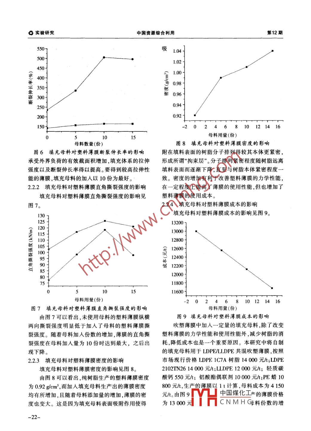 Vol 32. No 12中國資源綜合利用2014年12月China resources Comprehensive utilizationc實驗研究聚烯烴填充母料在塑料薄膜中的應用研究徐冬梅,高標,曾長春2(1徐州工業(yè)職業(yè)技術學院,江蘇徐州221140;2徐州同創(chuàng)塑業(yè)有限公司,江蘇徐州221006)摘要:聚烯烴填充母料用于塑料薄膜,具有良好的社會和經濟效益。采用同向雙螺桿擠出機制備了膜用填充母料,以熔體流動速率為指標優(yōu)化了填充母料的配方并用于吹膜實踐。結果表明,隨著母料加入份數(shù)的增多,薄膜的力學性能增大,加入的份教達到10份時效果最好;薄膜的密度會在加入母料后增大,但變化幅度不大;母料的加入使塑料薄膜的成本降低。但考慮到塑料薄膜性能,母料的加入量應控制在10份為宜。關鍵字:聚烯烴;薄膜;填充母料中圖分類號:TQ320文獻標識碼:A文章編號:l008-9500(2014)12001905Application of Filling Polyolefin Matrix in the Plastic Thin FilmXu Dongmei, Gao Biao, Zeng Changchun(1. Xuzhou College of Industrial Technology, Xuzhou 221140, China2. Xuzhou Tongchuang Plastic Industry Co, Ltd. Xuzhou 221006, China)Abstract: The application of filling polyolefin matrix in plastic thin film has excellent social and economicbenefits. In the present work, co-rotating twin screw extruder has been adopted to prepare film used fillingmatrix, and the formula of the filling matrix has been optimized by using the melt flow rate as index and ithas been further applied to the film blown practice. The research results showed that the mechanical propertiesof the thin films increased with the increase of the added percentage of the polyolefin matrix and theproperties reached the best with the filled matrix of 10 phr. The membrane density would increase after theddition of the polyolefin matrix, while the variation range was not great. Moreover, the addition of the polyolefinmatrix could decrease the cost, and the optimum filling amount of the polyolefin matrix should be controlledat 10 phr in consideration of the mechanical properties of the thin filmKeywords: low density polyolefin; thin film; filling matrix碳酸鈣具有原料易得、價格低廉、穩(wěn)定性好、無毒等諸多優(yōu)點,用于填充塑料,不僅可降低材料成1實驗本且可起增韌補強、提高材料抗沖擊強度、改善材1.1實驗原料料彈性模量和拉伸性能等作用叩。吳智華等比較實驗原料及生產廠家見表1。了碳酸鈣、高嶺土和淀粉吹塑薄膜的成膜性,得出表1實驗原料及生產廠家了碳酸鈣的成膜性最好的結論,所以以碳酸鈣為母原料名稱生產廠家料核的聚烯烴填充母料在塑料薄膜中應用最為廣LDPE(2102N26齊魯石化公司泛LDPE(IC7A)北京燕山石化公司填充母料的結構由里向外由填料核、偶聯(lián)層、LDPE(DFDC-7050)中原石化公司體樹脂的種類、母料核填充劑碳酸鈣份數(shù)以及分散0日)余姚市雪峰碳酸鈣填充母料廠分散層和載體樹脂4部分組成。本文主要研究了載輕質碳酸鈣余姚市奮發(fā)塑業(yè)有限公司硬脂酸余姚市榮威塑化商行劑PE蠟的用量對母料熔體流動速率的影響,PE蠟上海華熠化工助劑有限公司并分析了應用于吹塑薄膜時的效果。液體石蠟市售中國煤化工收稿日期:2014-10-09CNMHG作者簡介:徐冬梅(1966-),女,江蘇如東人,高級工程師副教授,從事高分子材料的權實驗研究中國資源綜合利用第12期12實驗設備及儀器表4擠出造粒工藝參數(shù)實驗設備及儀器見表2。機頭溫度熔體熔體喂主機表2實驗設備及儀器(℃)溫度(℃)壓力(Mpa)頻率電流(A)頻率(Hz)195230-2420050.851801922實驗設備及儀器生產廠家由表3、表4可以看出,擠出機各區(qū)段溫度最雙螺桿擠出造粒機組(CTE-35)南京科貝隆科亞機械公司高速混合機(SHR-50張家港億利機械有限公司高設置是七區(qū)的200℃,但熔體溫度在230~242℃熔體流動速率儀(XNR-400C)河北承德試驗機有限公司之間波動。這是因為設置的溫度是機筒各區(qū)段溫真空干燥箱(DZF-6210)上海賀德實驗設備有限公司度,并不是實際溫度,所以在擠出造粒過程中應隨電子天平(BT22S)賽多利斯科學儀器(北京)時控制冷卻水,以更好的平衡各區(qū)段的溫度。有限公司134原料娸干吹塑薄膜機組(SJ-45/28)大連橡塑機械有限公司造粒完成后,因擠出過程需經過冷卻水池或其塑料電子萬能試驗機(AI-7000LA高鐵科技股份有限公司他原因可能混入水分,因此將填充母料顆粒置于烘沖片機(CP25)江都市試驗機械廠箱中,以溫度80℃,壓力為005Mpa烘干30min13工藝流程1.3.5吹塑薄膜工藝流程見圖1根據(jù)熔體流動速率(MFR)選擇配方7制得的填充母料吹塑薄膜。吹塑薄膜的基體樹脂選擇擠沖性 LDPE/LLDPE共混,這是因為LLDE樹脂易結晶加工性較差,但其在沖擊強度、斷裂伸長率、韌性、合粒膜樣撓曲性等方面優(yōu)于DDPE;而LDPE薄膜的霧度、光圖1工藝流程澤度、透明度等方面又優(yōu)于LDE采用兩者共混吹1.3.1原料預處理塑薄膜可在一定程度上提高薄膜的加工性和使用因為輕質碳酸鈣易吸濕,所以必須將輕質碳酸性。本研究吹塑薄膜 LDPE/LLDPE共混比為ll鈣置于真空干燥箱中,以80℃恒溫干燥30min,壓吹膜工藝參數(shù)見表5。力為0.05Mpa。為提高分散劑的效果本研究采用硬表5吹塑薄膜工藝參數(shù)脂酸、液體石蠟并用,同時為提高混合效果液體石區(qū)三區(qū)四區(qū)驅動螺桿度溫度溫度電機電流轉速吹脹比蠟應先與載體樹脂LDPE混合浸潤樹脂。(℃)(℃)(℃)(℃)(A)(r/min)1.3.2高混機混合195230~242215-220200102將已干燥好的輕質碳酸鈣置于高速混合機中注:薄膜規(guī)格為400mmx0.06mm升溫至80℃高