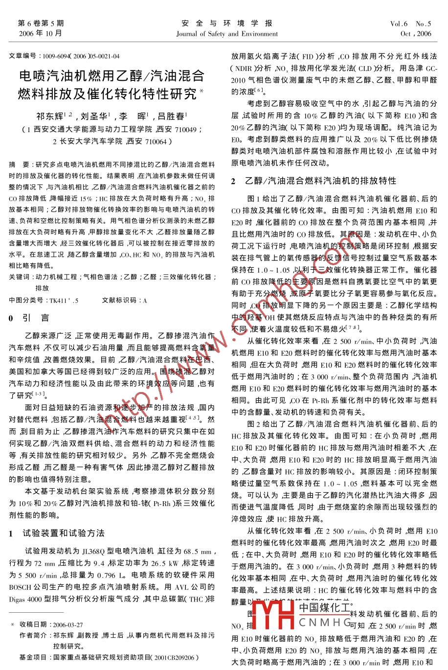 第6卷第5期安全與環(huán)境學(xué)報(bào)Vol 6 No 52006年10月JournalOct,2006文章編號(hào):1009-6094200605-0021-04放用氫火焰離子法(FID)分析,CO排放用不分光紅外線法電噴汽油機(jī)燃用乙醇/汽油混合(NDR)分析NO排放用化學(xué)發(fā)光法(CID)分析。用島津GC2010氣相色譜儀測(cè)量廢氣中的未燃乙醇、乙醛、甲醇和甲醛燃料排放及催化轉(zhuǎn)化特性研究*的濃度°考慮到乙醇容易吸收空氣中的水,引起乙醇與汽油的分祁東輝12,劉圣華1,李暉,呂勝春層試驗(yàn)時(shí)所用的含10%乙醇的汽油(以下簡(jiǎn)稱(chēng)E10)和含1西安交通大學(xué)能源與動(dòng)力工程學(xué)院西安71004920%乙醇的汽油以下簡(jiǎn)稱(chēng)E20)均為現(xiàn)場(chǎng)調(diào)配。純汽油記為2長(zhǎng)安大學(xué)汽車(chē)學(xué)院西安710064)EO。考慮到醇類(lèi)燃料的應(yīng)用推廣以及20%以下低比例摻燒醇類(lèi)對(duì)電噴汽油機(jī)部件腐蝕和溶脹作用比較小在試驗(yàn)中對(duì)摘要:研究多點(diǎn)電噴汽油機(jī)燃用不同摻混比的乙醇/汽油混合燃料原電噴汽油機(jī)未作任何改動(dòng)時(shí)的排放及催化器的轉(zhuǎn)化性能。結(jié)果表明在汽油機(jī)參數(shù)未做任何調(diào)2乙醇/汽油混合燃料汽油機(jī)的排放特性整的情況下與汽油機(jī)相比乙醇/汽油混合燃料汽油杋催化器之前的CO排放降低降幅接近15%;HC排放在大負(fù)荷時(shí)略有升高;NO,排圖1給出了乙醇/汽油混合燃料汽油機(jī)催化器前、后的放基本相同;乙醇對(duì)排放物催化轉(zhuǎn)換效率的影響與電噴汽油機(jī)的轉(zhuǎn)Co排放及其催化轉(zhuǎn)化效率。由圖可知:汽油機(jī)燃用E10和速、負(fù)荷和空燃比控制策略有關(guān)。用氣相色譜分析儀測(cè)錄的未燃乙醇E20時(shí)催化器前的CO排放在整個(gè)負(fù)荷范圍內(nèi)基本相同并排放在大負(fù)荷時(shí)略有升高甲靜排放量變化不大乙醛排放量隨乙靜且比燃用汽油時(shí)的CO排放低。其原因是:發(fā)動(dòng)機(jī)在中、小負(fù)含量增大而增大經(jīng)三效催化轉(zhuǎn)化器后可以被控制在接近零排放的荷工況下運(yùn)行時(shí)電噴汽油機(jī)的控制策略是閉環(huán)控制根據(jù)安水平。在息速工況隨乙靜含量增加,CO、HC和NO.的排放與汽油機(jī)裝在排氣管上的氧傳感器的反饋信號(hào)控制過(guò)量空氣系數(shù)基本相比略有降低保持在1.0~1.05以利于三效催化轉(zhuǎn)換器正常工作。催化器關(guān)鍵詞:動(dòng)力機(jī)械工程;氣相色諧法;乙醇;乙醛;三效催化轉(zhuǎn)化器前CO排放降低的主要原因是燃料自攜氧要比空氣中的氧更有助于充分燃燒或原子氧要比分子氧更容易參與氧化反應(yīng)。中圖分類(lèi)號(hào):TK411.5文獻(xiàn)標(biāo)識(shí)碼:A同時(shí)CO排放明顯下降的另一個(gè)原因主要是:乙醇化學(xué)結(jié)構(gòu)0引言中的羥基OH使其燃燒反應(yīng)特點(diǎn)與汽油中的各種烴類(lèi)的有所乙醇來(lái)源廣泛正常使用無(wú)毒副作用。乙醇摻混汽油作不同使著火溫度較低和不易熄火7從催化轉(zhuǎn)化效率來(lái)看在2500r/min、中小負(fù)荷時(shí)汽油汽車(chē)燃料不僅可以減少石油用量而且能夠提高燃料含氧量機(jī)燃用E10和E20燃料時(shí)的催化轉(zhuǎn)化效率與燃用汽油時(shí)基本和辛烷值改善燃燒效果。目前乙醇/汽油混合燃料在巴西、相同但在大負(fù)荷時(shí)燃用E10和E20燃料時(shí)的催化轉(zhuǎn)化效率美國(guó)和加拿大等國(guó)已經(jīng)得到較廣泛的應(yīng)用。圍繞摻混乙醇對(duì)低于燃用汽油時(shí)的;在3000r/min、整個(gè)負(fù)荷范圍內(nèi)汽油機(jī)汽車(chē)動(dòng)力和經(jīng)濟(jì)性能以及由此帶來(lái)的環(huán)境效應(yīng)等問(wèn)題,也有燃用E10和E20燃料時(shí)的催化轉(zhuǎn)化效率與燃用汽油時(shí)的基本了研究相同。由此可見(jiàn)CO在P-hh系催化劑中的轉(zhuǎn)化效率與燃料面對(duì)日益短缺的石油資源和逐步加嚴(yán)的排放法規(guī),國(guó)內(nèi)中的含醇量、發(fā)動(dòng)機(jī)的轉(zhuǎn)速和負(fù)荷有關(guān)對(duì)替代燃料包括乙醇汽油混合燃料也越來(lái)越重視45然圖2給出了乙醇/汽油混合燃料汽油機(jī)催化器前、后的而到目前為止乙醇摻混汽油作汽車(chē)燃料的研究只集中在如HC排放及其催化轉(zhuǎn)化效率。由圖可知:在小負(fù)荷時(shí),燃用何實(shí)現(xiàn)乙醇/汽油雙燃料供給、混合燃料的動(dòng)力和經(jīng)濟(jì)性能E0o和E0時(shí)催化器前的HC排放與燃用汽油時(shí)相差不大在等有關(guān)排放性能的研究相對(duì)較少。另外乙醇不完全燃燒會(huì)中、大負(fù)荷燃用E10和E0時(shí)的HC排放明顯高于燃用汽油形成乙醛而乙醛是一種有害氣體因此摻混乙醇對(duì)乙醛排放的乙醇含量對(duì)HC排放的影響較小。其原因是:閉環(huán)控制策的影響也值得特別注意。略使過(guò)量空氣系數(shù)保持在1.0~1.05,燃料基本可以完全燃本文基于發(fā)動(dòng)機(jī)臺(tái)架實(shí)驗(yàn)系統(tǒng)考察摻混體積分?jǐn)?shù)分別燒??梢哉J(rèn)為主要是由于乙醇的汽化潛熱比汽油大得多因?yàn)?0%和20%乙醇對(duì)汽油機(jī)排放和鉑銥(P助h)三效崔化而使進(jìn)氣溫度降低同時(shí)由于燃燒室的余隙而出現(xiàn)較強(qiáng)烈的劑性能的影響。淬熄效應(yīng)使HC排放升高試驗(yàn)裝置和試驗(yàn)方法從催化轉(zhuǎn)化