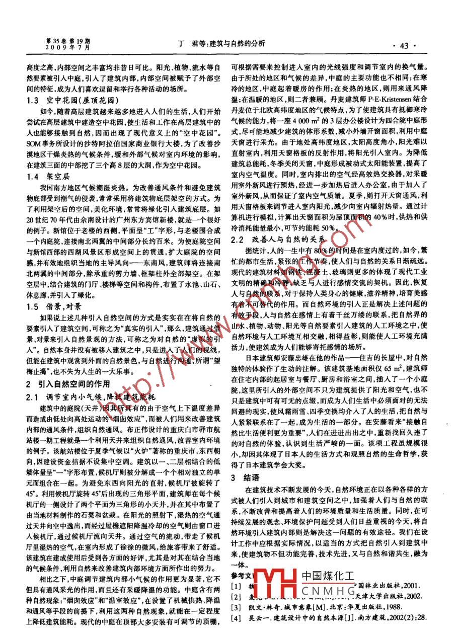 第35卷蕈19臀山西建筑Vol.35 No.19●42●SHANXI ARCHTECTUREJul.2009文章編號:1009-682502009)19-0042-03建筑與自然的分析丁君付士洋摘妻:分析了將自然環(huán)境引入建筑內(nèi)部的方式和作用,提出在設(shè)計中應(yīng)利用這一手段來改善建筑內(nèi)部小氣候,以降低.建筑能耗、提高建筑內(nèi)部的環(huán)境質(zhì)量,加強人與自然的溝涌,使人與自然和諧共生、融為一體。.關(guān)鍵詞:建筑,自然,環(huán)境,建筑藝術(shù)中圖分類號:TU-021文獻標識碼:A在當今的技術(shù)條件下,營造-一個滿足使用需要的、完全由人庭院,這一引人自然的古老方式,在現(xiàn)代建筑中依然被大量工控制的舒適的建筑空間已并非難事。但是,建筑物使用過程中地運用,它在建筑空間 中不但起著通風(fēng)采光的作用,而且成為建大量的能源消耗和由此產(chǎn)生的對生態(tài)環(huán)境的不良影響,以及眾多筑空間的 重要組成部分,增強著建筑空間的表現(xiàn)力。以程泰寧設(shè)建筑空間所表現(xiàn)出的自我封閉和與自然環(huán)境缺乏溝通的缺陷卻計的聯(lián)合國國際小水電中心為例,該建筑位于杭州西湖風(fēng)景區(qū)玉成了建筑設(shè)計中亟待解決的問題。有識之士針對上述問題提出皇山龍, 為體現(xiàn)風(fēng)景園林建筑特點,體現(xiàn)地方特色,建筑中幾乎所了設(shè)計“生態(tài)建筑"和營造“山水城市”的設(shè)想,力圖通過對自然資有的房間都圍繞-一個半圓形的庭院布置,庭院內(nèi)是大片的水面,源的開發(fā)和利用,來降低建筑的能耗,保護生態(tài)環(huán)境;同時,希望其間點綴以山石樹木 ,池中紅鱗戲水,池畔回廊環(huán)繞,使活動在建通過將自然環(huán)境與城市空間建筑空間的結(jié)合來改善城市環(huán)境和筑中的人能時時感到自然的存在。建筑環(huán)境。就此,筆者分析了將自然環(huán)境引人建筑內(nèi)部的方式和1.2 中庭作用,提出在設(shè)計中應(yīng)利用這-手段來改普建筑內(nèi)部小氣候,降建筑的中庭這-概念其實也起源于庭院(天井),據(jù)稱,希臘低建筑能耗,提高建筑內(nèi)部環(huán)境質(zhì)量,加強人與自然的溝通。人最早在建筑中利用露天庭院這一-概念。 后來,羅馬人在這一基1引入自然空間的方式礎(chǔ)上加以改進,在天井上加蓋屋頂,形成了有頂蓋的室內(nèi)空間的1.1 庭院(天井)中庭。如今,中庭這一-形式有了很大的發(fā)展,其跨度之大,改變農(nóng)業(yè)以種植業(yè)為主的單-產(chǎn)業(yè)結(jié)構(gòu),發(fā)展優(yōu)質(zhì)、高產(chǎn)高效農(nóng)地有償使用。 對小城鎮(zhèn)建設(shè)用地,實行“統(tǒng)- -規(guī)劃、統(tǒng)- -征用、統(tǒng)業(yè),建設(shè)農(nóng)產(chǎn)品基地,形成規(guī)模效益。3)有步驟地改革小城鎮(zhèn)現(xiàn)一出讓 .統(tǒng)-開發(fā)”的制度,提高土地利用率。6)探索小城鎮(zhèn)社會行財政稅收體制。建立鎮(zhèn)級財政,建立完整統(tǒng)-的預(yù)算,將鎮(zhèn)級保障制度的改革,逐步破除城鄉(xiāng)分割的社會保障體制。為了確保預(yù)算內(nèi)外收入統(tǒng)-納人財政管理,聚焦財政資金,規(guī)范收支行社會 穩(wěn)定,要依靠社會各方面的力量,充分發(fā)揮國家、集體、個人為,合理分配,加大對小城鎮(zhèn)建設(shè)的投入。4)抓好小城鎮(zhèn)戶籍制的積極性,建 立和完善包括養(yǎng)老保險、失業(yè)保險、醫(yī)療保險、工傷度的改革,逐步實現(xiàn)城鄉(xiāng)戶口一體化管理。因此,應(yīng)在現(xiàn)有的農(nóng)保險 、生育保險等一系列社會保險體系。這樣解決了進入小城鎮(zhèn)業(yè)戶口、非農(nóng)業(yè)戶口、自理口糧戶口和其他類型戶口的基礎(chǔ)上,按農(nóng)民的基 本生活保障,解除他們的后顧之憂,確保社會的長治久照“離土不離鄉(xiāng)”的方針,實行農(nóng)村剩余勞動力有效轉(zhuǎn)移,按照居安。住地登記原則,對進人小城鎮(zhèn)有穩(wěn)定收人、穩(wěn)定就業(yè)和穩(wěn)定居住總之,推進城市化進程是世界發(fā)展的總趨勢,城市化是一個場所的遷移人口應(yīng)允許登記本地常住戶口,消除就業(yè)的歧視性、國家現(xiàn)代化的重要標志之 -。我國城市化水平還較低,發(fā)展小城政策限制,激勵農(nóng)民進人小城鎮(zhèn)。5)抓好土地管理制度改革,建鎮(zhèn)是提高 我國城市化水平的有效途徑。但小城鎮(zhèn)建設(shè)本身是一立農(nóng)民進入小城鎮(zhèn)后原有耕地使用權(quán)的流轉(zhuǎn)制度,提高土地的利個系統(tǒng)工程,多數(shù)地方又剛剛起步,經(jīng)驗不足,需要加強完善的地用率。隨著城鎮(zhèn)人口的不斷增加,城鎮(zhèn)基礎(chǔ)設(shè)施和住房及公益事方還很多。因此,在建設(shè)發(fā)展過程中要針對出現(xiàn)的新情況和新問業(yè)建設(shè)必然要占用土地。目前,小城鎮(zhèn)建設(shè)使用土地普遍存在廉題,不斷改革和完善 穩(wěn)中求快,努力把小城鎮(zhèn)建設(shè)搞好,促進農(nóng)價性,造成土地使用率低和浪費土地資源的問題。如何堅持“一村經(jīng)濟社會全面發(fā)展,實現(xiàn)我國的全面現(xiàn)代化。要吃飯二要建設(shè)’的關(guān)系,小城鎮(zhèn)建設(shè)的土地管理和使用制度要參考文獻:在符合《土地法>的規(guī)定下進行改革。農(nóng)民進入小城鎮(zhèn)后,由政府[1] 宋虎存. 關(guān)于子小城鎮(zhèn)建設(shè)的探討[J].山西建筑,007,33(5):統