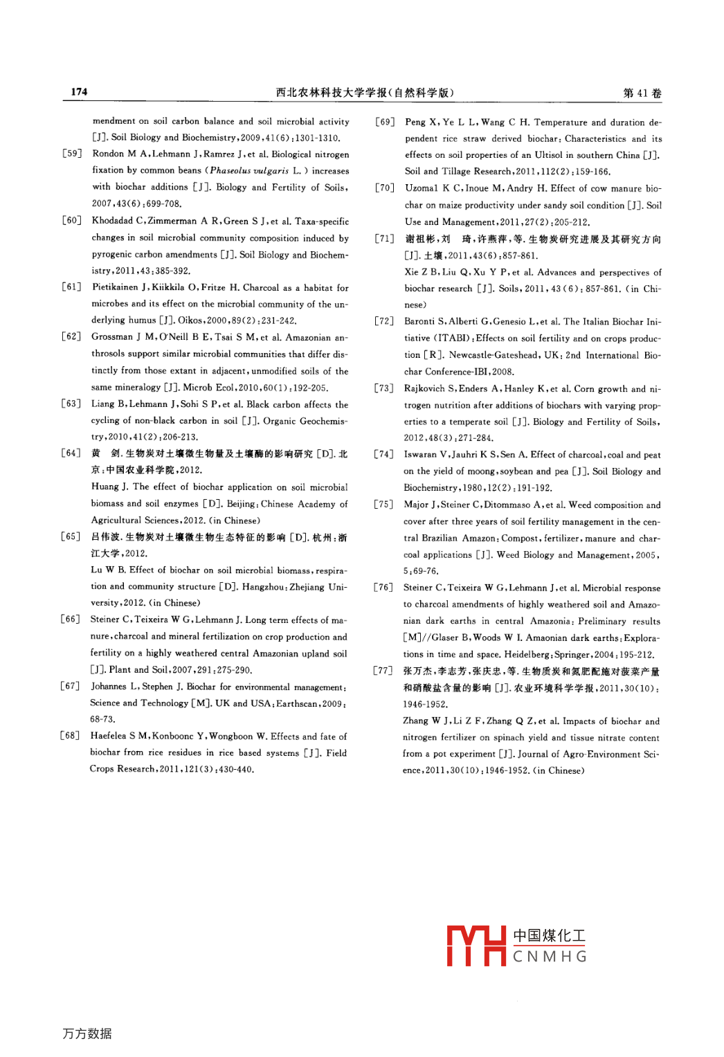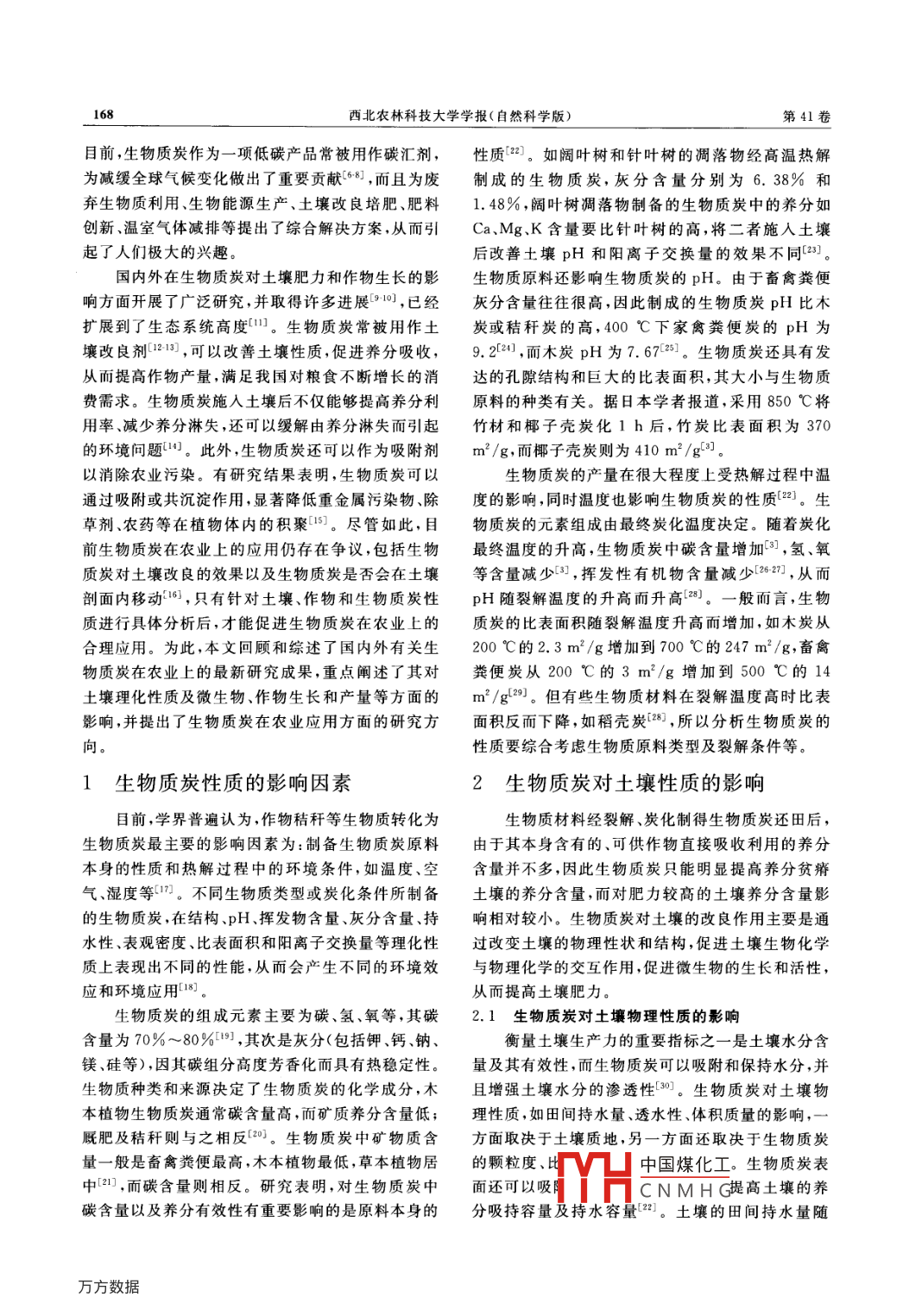 第41卷第2期西北農(nóng)林科技大學(xué)學(xué)報(bào)(自然科學(xué)版)VoL 41 No. 22013年2月Journal of Northwest A&F University(Nat. Sci. Ed.)Feb.2013網(wǎng)絡(luò)出版時(shí)間:201301-1416:13網(wǎng)絡(luò)出版地址http://www.cnkinet/kcms/detail/61.1390.s.20130114.1613.015.html生物厲炭在農(nóng)業(yè)上的應(yīng)用陳心想,耿增超(西北農(nóng)林科技大學(xué)資源環(huán)境學(xué)院陜西楊凌712100)[摘要]生物質(zhì)炭是由生物質(zhì)在完全或部分缺氧的條件下經(jīng)過(guò)熱裂解、炭化產(chǎn)生的一類(lèi)高度芳香化、難溶性的固態(tài)物質(zhì)。近年來(lái),生物質(zhì)炭作為土壤改良劑、肥料緩釋載體在農(nóng)業(yè)上的應(yīng)用越來(lái)越廣泛。為促進(jìn)生物質(zhì)炭在農(nóng)業(yè)上的研究及應(yīng)用,從生物質(zhì)炭性質(zhì)的影響因素,生物質(zhì)炭對(duì)土壤物理性質(zhì)、化學(xué)性質(zhì)和微生物的影響,以及生物質(zhì)炭對(duì)作物生長(zhǎng)和產(chǎn)量的影響等方面進(jìn)行了闡述和分析,并提出未來(lái)生物質(zhì)炭在農(nóng)業(yè)應(yīng)用方面的研究方向。[關(guān)鍵詞]生物質(zhì)炭;影響因素;土壤性質(zhì);作物生長(zhǎng)[中圖分類(lèi)號(hào)]S156.2[文獻(xiàn)標(biāo)志碼]A[文章編號(hào)]1671-9387(2013)02-0167-08Application of biochar in agricultureCHEN Xin-xiang, GENG Zeng-chaoCollege of Resources and Environment, Northwest A&F University, Yangling, Shaanxi 712100, China)Abstract: Biochar is an insoluble solid matter with high aromatization produced by biomass pyrolysisin completely or partially hypoxic conditions. In recent years, biochar is widely used in agriculture as a soilamendment and controlled-release carrier for fertilizers. In order to boost the study and utilization of bio-char in agriculture, this study summarized the factors that affect properties of biochar and its effects on soilohysical and chemical properties, amount of microorganisms in soil, and growth and yields of crops. The fu-ture research issues were also suggesteKey words: biochar; influence factors; soil properties; crop growth我國(guó)是一個(gè)農(nóng)業(yè)大國(guó),年產(chǎn)作物秸稈8×108t來(lái),用生物質(zhì)熱裂解生產(chǎn)生物質(zhì)炭已成為農(nóng)業(yè)研究以上,而以作物秸稈為主的廣泛存在的生物質(zhì)的熱點(diǎn)之一,而且由于在生產(chǎn)過(guò)程中消耗了大量生( biomass)是制備生物質(zhì)炭( biochar)的主要原料。物質(zhì)資源,因此生物質(zhì)炭有助于我國(guó)龐大的秸稈資生物質(zhì)炭是由生物質(zhì)在完全或部分缺氧的條件下經(jīng)源的有效利用。熱裂解、炭化產(chǎn)生的一類(lèi)高度芳香化、難溶性的固態(tài)目前,全球?qū)ι镔|(zhì)炭科學(xué)研究的重視,源于對(duì)物質(zhì)2。根據(jù)原料的來(lái)源不同,生物質(zhì)炭分為木炭、巴西亞馬遜盆地中部黑土( Terra preta de indio)的竹炭、秸稈炭、稻殼炭、動(dòng)物糞便炭等4。通常認(rèn)認(rèn)識(shí)黑土是古人類(lèi)刀耕火種形成的一種特殊的肥為,生物質(zhì)炭屬于黑炭( black carbon)范疇的一種,沃土壤,至今仍是全球最肥沃的土壤之一。然而,在而黑炭包含了生物質(zhì)略微炭化到燃燒后黑煙顆粒的世紀(jì)80年代以后,全球?qū)ι镔|(zhì)炭的性質(zhì),以及炭化物質(zhì),其對(duì)全球碳循環(huán)所起作用較大5。近年將其用作土壤改良劑及固碳劑的研究才相繼展開(kāi)。[收稿日期]2012-05-31[基金項(xiàng)目]林業(yè)局“948”項(xiàng)目“林果木生物質(zhì)綜合轉(zhuǎn)化技術(shù)引進(jìn)”(2009464);農(nóng)業(yè)部“948”項(xiàng)目“生物炭技術(shù)引進(jìn)及消化”(2010Z19);陜西省自然科學(xué)基礎(chǔ)研究計(jì)劃項(xiàng)目(2010JM5004);陜西省攻及施用技術(shù)研究”(2010K02-12-1)中國(guó)煤化工[作者簡(jiǎn)介]陳心想(1986-),女,山東臨沂人,在讀碩土,主要從事廢棄生物質(zhì)肥E-mail:xinxiang20073975@163.comCNMHG[通信作者]耿增超(1963-),男,陜西韓城人,教授,主要從事森林土壤及農(nóng)業(yè)廢棄物轉(zhuǎn)化研究。Emal; gengzengchao@126l68西北農(nóng)林科技大學(xué)學(xué)報(bào)(自然科學(xué)版)第41卷目前,生物質(zhì)炭作為一項(xiàng)低碳產(chǎn)品常被用作碳匯劑,性質(zhì)2)。如闊葉樹(shù)和針葉樹(shù)的凋落物經(jīng)高溫?zé)峤鉃闇p緩全球氣候變化做出了重要貢獻(xiàn),而且為廢制成的生物質(zhì)炭,灰分含量分別為6.38%和棄生物質(zhì)利用、生物能源生產(chǎn)、土壤改良培肥、肥料1.48%,闊葉樹(shù)凋落物制備的生物質(zhì)炭中的養(yǎng)分如創(chuàng)新、溫室氣體減排等提出了綜合解決方案,從而引Ca、Mg、K含量要比針葉樹(shù)的高,將二者施入土壤起了人們極大的興趣。后改善土壤pH和陽(yáng)離子交換量的效果不同23。國(guó)內(nèi)外在生物質(zhì)炭對(duì)土壤肥力和作物生長(zhǎng)的影生物質(zhì)原料還影響生物質(zhì)炭的pH。由于畜禽糞便響方面開(kāi)展了廣泛研究,并取得許多進(jìn)展1,已經(jīng)灰分含量往往很高,因此制成的生物質(zhì)炭pH比木擴(kuò)展到了生態(tài)系統(tǒng)高度。生物質(zhì)炭常被用作土炭或秸稈炭的高,400℃下家禽糞便炭的pH為壤改良劑213,可以改善土壤性質(zhì),促進(jìn)養(yǎng)分吸收,9.22,而木炭pH為7.6721。生物質(zhì)炭還具有發(fā)從而提高作物產(chǎn)量,滿(mǎn)足我國(guó)對(duì)糧食不斷增長(zhǎng)的消達(dá)的孔隙結(jié