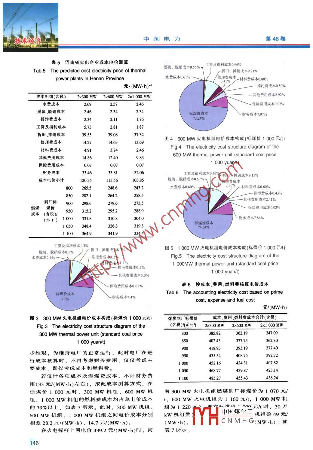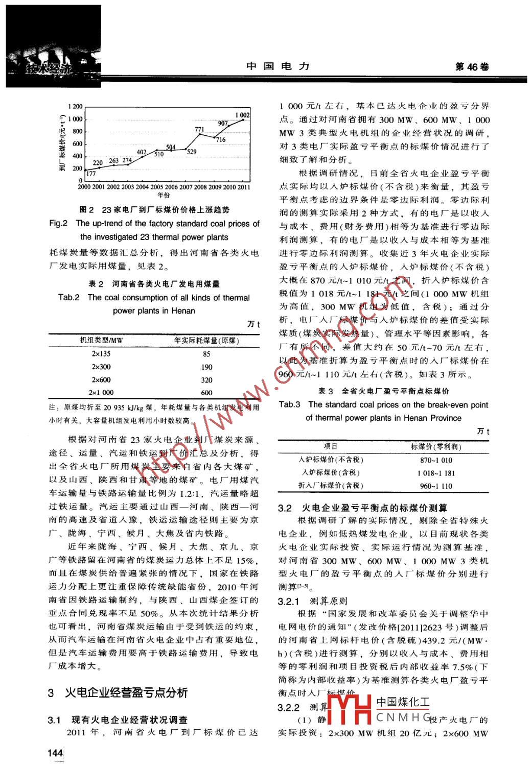 第46卷第7期中國電力Vol. 46, No. 72013年7月ELECTRIC POWERJul. 2013技術經(jīng)濟河南省火電廠經(jīng)營狀況分析.白宏坤,錢文纓2,韋迎旭2,李干生2(1.河南省電力公司電力經(jīng)濟技術研究院,河南鄭州450052;2.河南省電力勘測設計院,河南鄭州450007)摘要: 對河南省火電廠逐年到廠標煤價數(shù)據(jù)和火電廠經(jīng)營成本進行了整理與測算,得出目前河南省火電.廠燃料費是決定電廠成本的決定因素的結(jié)論,并測算出河南省現(xiàn)運行中的各類型火電機組盈虧平衡點時的人廠標煤價。建立的火電廠盈虧平衡點時到廠煤價與現(xiàn)行電價之間的關系模型,可為以實時煤價判斷火電廠經(jīng)營狀況提供理論參考。關鍵詞:火電廠;經(jīng)營狀況;到廠煤價;盈虧平衡.中圖分類號: TM715;F014.35文獻標志碼: A文章編號: 1004-9649(2013 )07-0143-060引言10 0008 64080007000|6 460近年來,河南省火電廠到廠標煤價從2000年6 000的200元/t以下水平,快速升至2011年的1 000t 50003 00030003160元/水平(含稅),已達火電企業(yè)的盈虧分界點,煤20001000價高企導致火電企業(yè)經(jīng)營舉步維艱-21。本文將對河00302013.南省火電廠逐年到廠標煤價數(shù)據(jù)和火電廠經(jīng)營成.機組類型/MW本進行整理與測算,擬通過建立的火電廠盈虧平圖1 23家發(fā)電企業(yè)機組類型及容量構(gòu)成衡點時到廠煤價與現(xiàn)行電價之間的關系模型,為Fig.1 Composition of unit type and capacity of以實時煤價判斷火電廠經(jīng)營狀況提供理論參考。investigated 23 power generation companies1 2000- -2011年河南省火電企業(yè)煤價上表12000- -2011年河南省23家火電企業(yè)標煤價(含稅)漲趨勢Tab.1 2000- -2011 standard coal prices (tax included)of thermal power plants in Henan本項調(diào)查向河南省內(nèi)44家燃煤火電廠發(fā)出了元.t1調(diào)研函,收回23家回復函。所調(diào)研23家發(fā)電企業(yè)總裝機容量22760MW,約占全省統(tǒng)調(diào)火電總標煤價200220032004裝機容量的53.2%,涉及火電機組類型分別為年份1772202632744025102006200820101 000 MW. 600 MW、300 MW. 200 MW. 135 MW。50452971716071 00各類機組類型及容量構(gòu)成見圖1。調(diào)研類型中600MW.300 MW機組為主力機型,具有一定的代表性。本保持在400~500元/t;自2008年開始,到廠標根據(jù)對23家火電企業(yè)到廠煤價匯總分析,得煤價上升幅度加大,上升到700元/t左右;出平均的2000- -2011 年河南省火電廠到廠標煤價2010- -2011 年連續(xù)2年,火電廠標煤價進而上升格.上漲趨勢曲線(含稅),見表1和圖2。至1 000元/t水平(含稅)。由河南省火電廠到廠標煤價上漲趨勢曲線得出,2000--2011年河南省23家火電企業(yè)標煤價2河南省火電企業(yè)到廠煤炭途徑分析年均增長幅度約為17.1%。 到廠標煤價在2000-2003年間基本維持在300元/t以下水平;自2004根據(jù)本次所收集資料較為完整的23家電廠年開始,到廠煤價有所上升,2004- -2007 年間基2010年、2011 年煤炭到廠途徑、運輸量、發(fā)電消收稿日期: 2013-03-26中國煤化工作者簡介:白宏坤(1971- -),女,河南開封人,博士,高級工程師,從事電力系.MYHCNM HGE-mail: baihongkun@sohu.com143中國電力第46卷12001000元/t左右,基本已達火電企業(yè)的盈虧分界10021000點。通過對河南省擁有300 MW.600 MW、1 00080071.907MW3類典型火電機組的企業(yè)經(jīng)營狀況的調(diào)研,600對3類電廠實際盈虧平衡點的標煤價情況進行了40251054 -529400200220 263-274細致了解和分析。177,根據(jù)調(diào)研情況,目前全省火電企業(yè)盈虧平衡200 2001 2002 2003 2004 2005 2006 2007 2008 2009 2010 2011點實際均以人爐標煤價(不含稅)來衡量,其盈虧年份平衡點考慮的邊界條件是零邊際利潤。零邊際利圖223家電廠 到廠標煤價價格上漲趨勢潤的測算實際采用2種方式,有的電廠是以收入Fig.2 The up-trend of the factory standard coal prices of與成本、費用(財務費用)相等為基準進行零邊際the investigated 23 thermal power plants利潤測算,有的電廠是以收入與成本相等為基準耗煤炭量等數(shù)據(jù)匯總分析,得出河南省各類火電進行零邊際利潤測算。收集近3年火電企業(yè)實際廠發(fā)電實際用煤量,見表2。盈虧平衡點的人爐標煤價,人爐標煤價(不含稅)表2河南省各類火電廠 發(fā)電用煤量大概在870元/~1 010元/t之間,折人爐標煤價含稅值為1 018 元/t~1 181 元/之間(1 000 MW機組Tab.2 The coal consumption of all kinds of thermalpower plants in Henan為高值,300MW機組為低值,含稅);通過分萬t析,電廠人廠標煤價與人爐標煤價的差值受實際煤質(zhì)(煤炭實際發(fā)熱量)、管理水平等因素影響,各機組類型/MW年實際耗煤量(原煤)廠有所不同,差值大約在50元/t~70元/t左右,2x13585以此為基準折算為盈虧平衡點時的人廠標煤價在2x300190960元/t~1 110 元/t左右(含稅)。如表3所示。2x6003202x1 000表3全省火電廠盈虧平衡點標煤價注:原煤均折至20 935 kJ/kg煤,年耗煤量與各類機組發(fā)電利用Tab.3 The standard coal prices on the break-even point小時有關,大容量機組發(fā)電利用小時數(shù)較高。of thermal power plants in Henan Province根據(jù)對河南省23家火電企業(yè)到廠煤炭來源、項目標煤價(零利潤)途徑、運量、汽運和鐵運到廠價匯總及分析,得人爐標煤價(不含稅)870~1 010出全省火電廠所用煤炭主要來自省內(nèi)各大煤礦,人爐標煤價(含稅)1018-1 181以及山西、陜西和甘肅等地的煤礦。電廠用煤汽折入廠標煤價(含稅)960~1 110車運輸量與鐵路運輸量比例為1.2:1, 汽運量