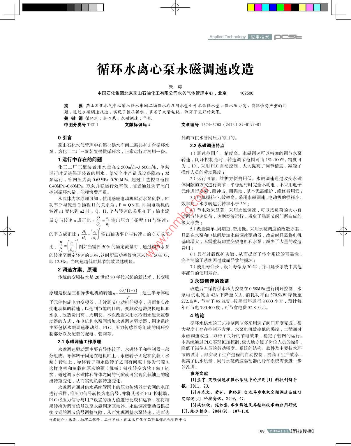 Applied Technology應(yīng)用技術(shù)口cs□循環(huán)水離心泵水磁調(diào)速改造朱濤中國石化集團(tuán)北京燕山石油化工有限公司水務(wù)氣體管理中心,北京102500摘要燕山石化水氣中心第七供水車間二循供水存在用水量小于水泵供水量,供水壓力高,能耗浪費(fèi)嚴(yán)重的問題,通過永磁調(diào)速改造,實(shí)現(xiàn)了恒壓供水,節(jié)省了大量電耗,取得了良好的效果關(guān)鍵詞循環(huán)水;離心泵;永磁調(diào)速;節(jié)能中圖分類號(hào)TH311文獻(xiàn)標(biāo)識(shí)碼A文章編號(hào)1674-6708(2013)89-0199-010引言到調(diào)節(jié)供水管網(wǎng)壓力的目的燕山石化水氣管理中心第七供水車間二循共有3臺(tái)循環(huán)水調(diào)速特點(diǎn)泵,為化工二廠三聚裝置提供循環(huán)水,正常運(yùn)行時(shí)兩用一備。1)調(diào)速范圍廣、精度高。永磁調(diào)速可以精確的調(diào)節(jié)水泵1運(yùn)行中存在的向題轉(zhuǎn)速,閉環(huán)控制是時(shí),轉(zhuǎn)速調(diào)節(jié)范圍可由1%-100%,精度可化工二廠三聚裝置用水量在250m/h-3500mh,單泵為±1%,采用PLC自動(dòng)控制,大大提高了調(diào)節(jié)精度,減輕了行時(shí)無法保證裝置的用水,給安全生產(chǎn)造成設(shè)備隱患;雙操作人員的勞動(dòng)強(qiáng)度泵運(yùn)行,管網(wǎng)壓力高0.65MPa-0.70MPa,超過工藝控制范圍2)運(yùn)行可靠、維護(hù)方便費(fèi)用低。永磁調(diào)速通過改變永磁040MPa-060MPa,雙泵并聯(lián)運(yùn)行效率低,裝置通過調(diào)節(jié)閥門體間隙的方式進(jìn)行調(diào)節(jié),平穩(wěn)運(yùn)行時(shí)完全不耗電,不采用電子控制循環(huán)水量,能耗浪費(fèi)嚴(yán)重元件進(jìn)行變頻,耐沖擊、耐振動(dòng),基本無需維護(hù),維修費(fèi)用低;從流體力學(xué)原理可知,使用感應(yīng)電動(dòng)機(jī)驅(qū)動(dòng)水泵負(fù)載,軸3)電機(jī)損耗小、效率高。采用永磁調(diào)速,電動(dòng)機(jī)的損耗小、功率P與流量Q揚(yáng)程H的關(guān)系為:P∝Q×H,即當(dāng)電動(dòng)機(jī)的效率高,水泵轉(zhuǎn)速丟轉(zhuǎn)率小于3%;轉(zhuǎn)速n1變化到n2時(shí),Q、H、P與轉(zhuǎn)速的關(guān)系如下:輸出流4)節(jié)電效果顯著。采用永磁調(diào)速,可以按負(fù)荷的大小自量Q與轉(zhuǎn)速n成正比:=輸出壓力(揚(yáng)程)H與轉(zhuǎn)速n極大浪費(fèi)動(dòng)調(diào)節(jié)轉(zhuǎn)速負(fù)荷,達(dá)到經(jīng)濟(jì)運(yùn)行,避免了靠調(diào)節(jié)閥門所造成的5)改造簡(jiǎn)單、周期短、費(fèi)用低。采用永磁調(diào)速的改造方案的平方成正比:-輸出軸功率P與轉(zhuǎn)速n的立方成正只需在水泵和電機(jī)間增加永磁調(diào)速驅(qū)動(dòng)器,改造時(shí)只需將電機(jī)P基礎(chǔ)增大,無需重新購置變頻電機(jī)和水泵,減少了大量的改造比:=(n例如當(dāng)需要50%的額定流量時(shí),通過調(diào)節(jié)水泵費(fèi)用:的轉(zhuǎn)速至額定轉(zhuǎn)速的50%,這時(shí)所需功率僅為原來的(50%)36)具有過載保護(hù)功能,從而提高了整個(gè)系統(tǒng)的可靠性即12.5%。當(dāng)轉(zhuǎn)速越低時(shí)其節(jié)能效果越明顯完全消除了系統(tǒng)因過載而導(dǎo)致的損壞2調(diào)速方案、原理7)使用壽命長(zhǎng),設(shè)計(jì)壽命為30年,并可延長(zhǎng)系統(tǒng)中其他傳統(tǒng)的變頻技術(shù)是20世紀(jì)80年代興起的新技術(shù),其變頻零部件的使用壽命。3永磁調(diào)速的效益原理是根據(jù)三相異步電機(jī)的轉(zhuǎn)速n=60(1-8,通過半導(dǎo)體電改造后二循將供水壓力控制在0.58MPa進(jìn)行閉環(huán)控制,水泵電機(jī)電流由42A下降至31A.消耗功率由370.9kW降低至子元件構(gòu)成電力變頻器,連續(xù)調(diào)節(jié)電動(dòng)機(jī)的頻率,進(jìn)而相應(yīng)改272kW,節(jié)省了988kW,按照每年運(yùn)行8000小時(shí),預(yù)計(jì)每變電動(dòng)機(jī)的轉(zhuǎn)速,以達(dá)到節(jié)能的目的。變頻改造需更換電機(jī)和可節(jié)電790400度,可節(jié)省電費(fèi)528萬元水泵,改造費(fèi)用高,周期長(zhǎng)。本次改造采用水冷型永磁調(diào)速驅(qū)4結(jié)論動(dòng)器的方式,在電機(jī)和水泵間增加永磁調(diào)速驅(qū)動(dòng)器,調(diào)速系統(tǒng)循環(huán)水供水的工藝控制調(diào)節(jié)多采用調(diào)節(jié)閥門開度完成,很主要包括水磁調(diào)速驅(qū)動(dòng)器、PLC、壓力傳感器等組成的閉環(huán)控大程度上存在控制不方便、水泵電機(jī)效率低的弊端,二循通過制部分以及配套的配電、管網(wǎng)等。永磁調(diào)速改造,取得了良好的節(jié)電效果,穩(wěn)定了管網(wǎng)的運(yùn)行2.1永磁調(diào)速工作原理本系統(tǒng)通過PLC實(shí)現(xiàn)恒壓控制,極大地方便了崗位人員的操作永磁調(diào)速驅(qū)動(dòng)器主要有導(dǎo)體轉(zhuǎn)子、永磁轉(zhuǎn)子和控制器三部降低了崗位人員的勞動(dòng)強(qiáng)度。系統(tǒng)的結(jié)構(gòu)、軟件及主要技術(shù)環(huán)分組成。導(dǎo)體轉(zhuǎn)子固定在電機(jī)軸上,永磁轉(zhuǎn)子固定在負(fù)載(水節(jié)的設(shè)計(jì),都實(shí)現(xiàn)了生產(chǎn)過程的自動(dòng)控制,提高了生產(chǎn)效率泵)轉(zhuǎn)軸上,導(dǎo)體轉(zhuǎn)子和永磁轉(zhuǎn)子之間有間隙(稱為氣隙)是高了供水質(zhì)量,同時(shí)永磁調(diào)速驅(qū)動(dòng)器的冷卻系統(tǒng)需要進(jìn)一步這樣電機(j