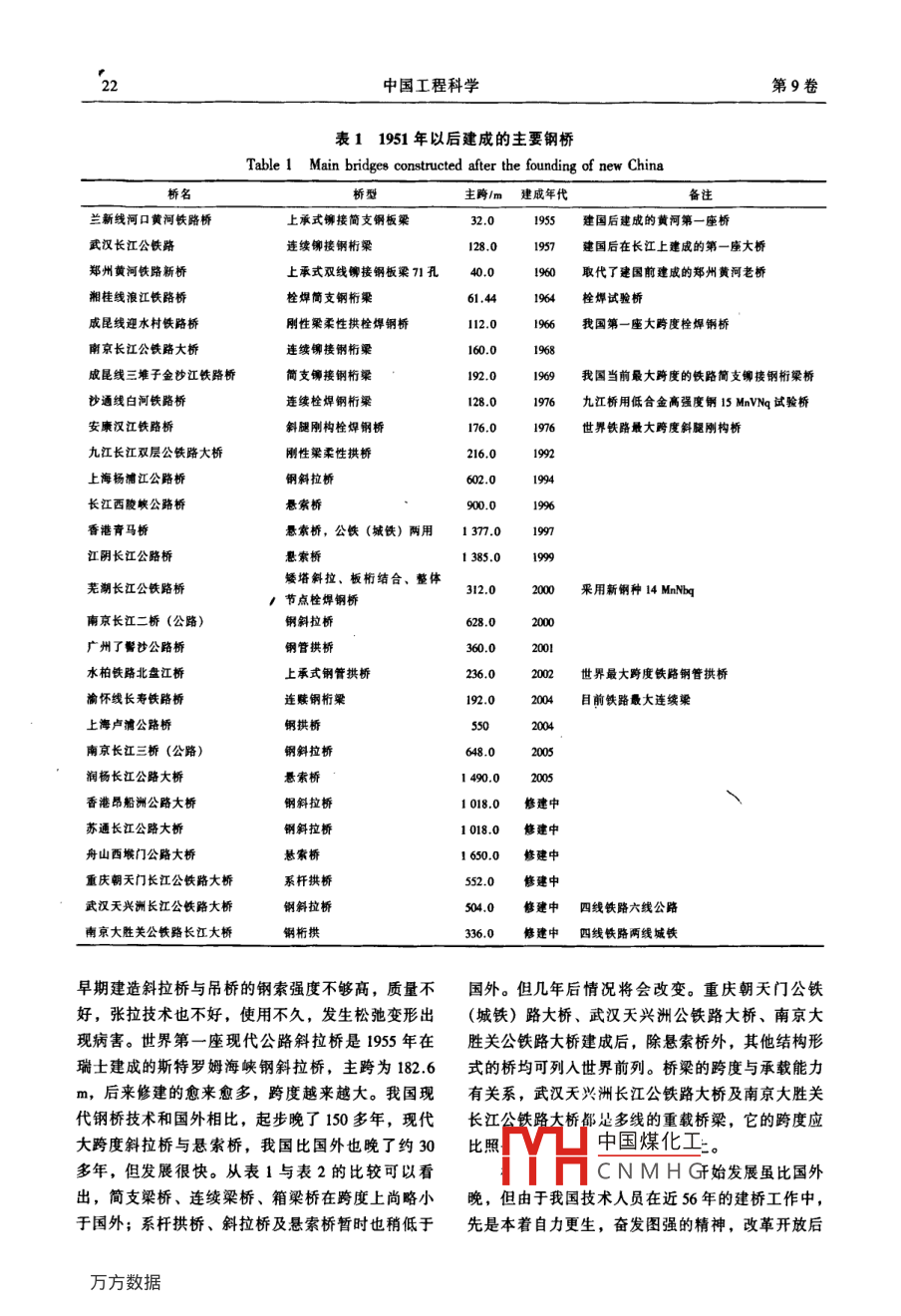 2007年7月中國工程科學(xué)Jul.2007第9卷第7期engineeningVol 9 No. 7專題報(bào)告中國鋼橋潘際炎(鐵道科學(xué)研究院,北京100081)摘要]介紹了我國鋼橋的發(fā)展及國內(nèi)外的鋼橋比較;論述了建造鋼橋的鋼材及其要求的化學(xué)成分和物理力學(xué)性能。[關(guān)鍵詞]中國鋼橋;鋼材;鋼橋設(shè)計(jì);鋼橋結(jié)構(gòu)[中圖分類號]U41;44;45[文獻(xiàn)標(biāo)識碼]A[文章編號]109-1742(200)07-018-091我國鋼橋的發(fā)展概況3128m鉚接米字形連續(xù)鋼桁梁(見圖1)11三個(gè)里程碑和新技術(shù)發(fā)展的新紀(jì)元我國鋼橋是在中華人民共和國建國后,在國外對我們實(shí)施經(jīng)濟(jì)、技術(shù)封鎖的情況下,自力更生成長起來的。中國早在1889年就開始了鐵路鋼橋的建設(shè),到現(xiàn)在已經(jīng)有100多年的歷史了,但在1949年前所建的鐵路鋼橋,標(biāo)準(zhǔn)雜亂,跨度都很小,建橋的鋼材是進(jìn)口的,結(jié)構(gòu)是鉚接的,采用的建造技術(shù)落后,工藝簡陋,質(zhì)量低劣;稍大一點(diǎn)的橋梁如鄭洲黃河老橋和濟(jì)南濼口黃河橋等都是由外國商人圖1武漢長江公鐵路大橋承建,自行設(shè)計(jì)建造的很少。自行設(shè)計(jì)建造有代表Fig 1 Wuhan Yangtze River railway and性的大橋只有1937年建成的浙贛鐵路錢塘江公鐵highway combined bridge路大橋,跨度為65.84m。1949年新中國成立后,各項(xiàng)建設(shè)蓬勃發(fā)展,20世紀(jì)60年代,為了連通京滬鐵路,決定修橋梁建設(shè)也不例外。但改革開放以前,由于材料的建南京長江大橋以取代南京輪渡。為解決無低合金原因,主要發(fā)展的是鐵路鋼橋。發(fā)展過程可以概括結(jié)構(gòu)鋼料的困難,鞍山鋼鐵公司于192年研制成為三個(gè)里程碑和一個(gè)新紀(jì)元。建國初期建橋用的材功16錳低合金高強(qiáng)度橋梁鋼(6Mnq),屈服點(diǎn)a料都要進(jìn)口,也沒有建造大型復(fù)雜橋梁的經(jīng)驗(yàn)。=340MPa,南京橋除少部分仍用原蘇聯(lián)已進(jìn)口的1956年由原蘇聯(lián)進(jìn)口低碳鋼材料并接受其技術(shù)指低合金鋼外,其余全部用國產(chǎn)鋼材代替了原定進(jìn)口導(dǎo),建成京廣鐵路武漢長江公鐵路大橋,首次在長的鋼材,當(dāng)時(shí)這些鋼的研制成功,十分鼓舞人心,江上實(shí)現(xiàn)了“一橋飛架南北,天塹變通途”。這是被稱之為“爭氣鋼”。南京長江大橋正橋鋼梁全長在長江上建造的第一座大橋,是我國橋梁史上第1576為降度10m鎦接米字形連續(xù)鋼桁個(gè)里程碑。武漢長江大橋全長1156m,橋跨結(jié)構(gòu)為梁。中國煤化工術(shù)力量和國產(chǎn)材料CNMHG收稿日期]2006-11-09;修回日期2007-05-09作者簡介]潘際炎(1924-),男,江西瑞昌縣人,中國鐵道科學(xué)研究院研究員第7期潘際炎:中國鋼橋建成的長江大橋,標(biāo)志著我國的建橋技術(shù)進(jìn)入到了后者取得了國家有關(guān)主管領(lǐng)導(dǎo)部門的同意。但采用個(gè)獨(dú)立自主的新水平,所以南京大橋的建成是我這一方案面臨的困難很多,當(dāng)時(shí)沒有制造大跨度焊國橋梁史上的第二個(gè)里程碑(見圖2)。接鋼梁的材料。原來造橋采用的16錳橋鋼,在材質(zhì)和規(guī)格上已不符合制造大跨度焊接鋼橋的需要。因這種鋼材的板厚效應(yīng)很大,鋼材的強(qiáng)度、韌性隨板厚的增加下降很快,用原來的16錳橋鋼建橋,鐵路單線桁梁橋最大跨度只可能達(dá)到112m。為此,鐵道部和原冶金部決定研究開發(fā)15錳釩氮橋梁鋼(15 MnnG),其屈服點(diǎn)比16錳橋梁鋼高,a=420MPa。由于當(dāng)時(shí)鋼鐵冶煉及軋制設(shè)備落后,合金元素不全,前后經(jīng)歷了20多年研究。通過大量的焊接及力學(xué)性能試驗(yàn)和在北京密云建造白河試圖2南京長江公鐵路大橋驗(yàn)橋(圖4)的工程實(shí)踐,優(yōu)化生產(chǎn)出了15錳釩Fig 2 Nanjing Yangtze River railway and氮C級正火橋梁鋼。這種鋼的板厚效應(yīng)小,板厚highway combined bridge56mm,焊接性及力學(xué)性均較好。在當(dāng)時(shí)的條下,取得如此的結(jié)果,確實(shí)非常不易,為改革開放后鋼1965年為加快成昆鐵路的建設(shè),鐵道部和國橋材料、焊接制造工藝、設(shè)計(jì)理論發(fā)展奠定了基家科委組建鐵路栓焊鋼梁科研、設(shè)計(jì)、制造、安裝礎(chǔ)。當(dāng)時(shí)由于設(shè)備和資源原因,15錳釩氮C鋼的新技術(shù)攻關(guān)組,系統(tǒng)研究、發(fā)展了栓焊鋼橋新技降碳、脫硫、脫磷不夠,加人的合金元素Ⅴ與N術(shù)。1%65-1970年一舉建成13種不同結(jié)構(gòu)的栓焊也不理想,因此焊接工藝要求比較嚴(yán)格。有人形容鋼橋44座,達(dá)到了當(dāng)時(shí)的國際先進(jìn)水平,為加快說這個(gè)鋼在焊接時(shí)既怕冷又怕熱。經(jīng)科研、設(shè)計(jì)成昆鐵路建設(shè)起了重要作用,更有意義的是從此結(jié)制造人員的艱苦努力,1993年用這種鋼建成了九束了我國使用近100年的鉚接鋼橋的歷史,為我國江長江公鐵路大橋。該橋正橋鋼梁全長1806m,主鋼橋技術(shù)發(fā)展開創(chuàng)了新紀(jì)元。栓焊鋼橋比鉚接鋼橋跨是216m的剛性梁柔性拱,結(jié)構(gòu)雄偉壯觀,橋形可節(jié)約鋼材12%~15%,可加快建橋速度,改善秀麗。從此我國用國產(chǎn)高強(qiáng)度鋼材建造大跨度栓焊工人勞動條件和結(jié)構(gòu)的傳力狀態(tài)。圖3即為我國第鋼橋,在材料、工藝、理論方面都沒有問題了,徹座栓焊鋼橋—一