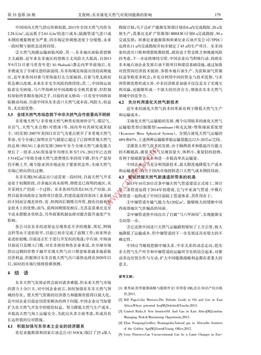 第33卷第20期企業(yè)技術(shù)開發(fā)2014年7月Vol 3 3 No 20TECHNOLOGICAL DEVELOPMENT OF ENTERPRISEJu.2014東非液化天然氣對(duì)我國能源的影響艾俊樹(云南大學(xué)國際關(guān)系研究院非洲研究中心,云南昆明650091)摘要:近年來,東非天然氣的勘探取得了重大突破。烏干達(dá)、肯尼亞、坦桑尼亞、莫桑比克等囯由于其龐大的天然氣潛在儲(chǔ)量而躋身于天然氣生產(chǎn)囯行列。然而,非洲囯家長期以來的工業(yè)基礎(chǔ)薄弱、資金匱乏、能源機(jī)制不健全等因素是限制東非天然氣產(chǎn)業(yè)發(fā)展的隱患。作為世界上最大的夭然氣消費(fèi)囯之一,中國也將注意力放在了這個(gè)潛力巨大的新興能源產(chǎn)地。東非夭然氣對(duì)中國在非洲能源領(lǐng)域的投資、中國國內(nèi)能源市場(chǎng)以及中國能源安全戰(zhàn)略都有很大的影響。關(guān)鍵詞:液化天然氣;能源;東非;中國中圖分類號(hào):TE862文獻(xiàn)標(biāo)識(shí)碼:A文章編號(hào):1006-8937(2014)20-0176-05自2006年烏干達(dá)阿爾貝特湖區(qū)發(fā)現(xiàn)了大量石油后,東非便氣生產(chǎn)地。目前已發(fā)現(xiàn)的產(chǎn)氣區(qū)主要集中在東非內(nèi)陸地區(qū)和沿作為全球能源的新前沿而被世界廣泛關(guān)注。從201年開始,隨海深水盆地,主要分布在烏干達(dá)、埃塞俄比亞、坦桑尼亞、莫桑著勘探工程的繼續(xù),肯尼亞、坦桑尼亞、莫桑比克等國家也都相比克四國。繼發(fā)現(xiàn)了大量的潛在天然氣儲(chǔ)備。作為新興能源基地,東非在烏干達(dá)的油氣資源主要集中在西部的阿爾貝特湖( Albert)全球能源格局中扮演的角色也越來越重要。中國作為天然氣消一帶。2006年塔洛公司(Tulw)首次發(fā)現(xiàn)石油并取得了開采獨(dú)費(fèi)大國,當(dāng)然不會(huì)忽視東非這個(gè)極具潛力的天然氣產(chǎn)地。本文占權(quán),初步建立了較完善的鉆井平臺(tái)。2011年塔洛公司聲稱已擬以東非天然氣領(lǐng)域?yàn)閷?duì)象,初步探討它對(duì)中國能源的影響。發(fā)現(xiàn)的石油達(dá)1億桶,且至少還有14億桶的潛在儲(chǔ)藏量。隨著國際上目前對(duì)東非天然氣的關(guān)注較為廣泛,重要集中在對(duì)已進(jìn)石油開采,伴生碳?xì)浠衔?天然氣)也逐漸被找到。僅2011年行生產(chǎn)的油氣產(chǎn)地,如烏干達(dá)、肯尼亞、埃塞俄比亞等地的油氣一年中所探明的天然氣儲(chǔ)量就達(dá)140億m3。鑒于可觀的油氣發(fā)儲(chǔ)量和生產(chǎn)情況進(jìn)行了較為詳盡的介紹,同時(shí)對(duì)新興天然氣的展前景,烏干達(dá)政府在2013年出臺(tái)了對(duì)天然氣開發(fā)和生產(chǎn)的相勘探情況作了現(xiàn)狀分析,并初步探討了東非天然氣的前景及對(duì)關(guān)法案,并可望在2014年進(jìn)行首輪招標(biāo)。本國工業(yè)發(fā)展的作用。2012年非洲已勘探天然氣儲(chǔ)量情況報(bào)告肯尼亞油氣資源主要集中在四個(gè)地區(qū),它們分別是中部的見表1安扎(Anza)、曼德拉( Mandera),西北內(nèi)陸的圖爾卡納裂谷區(qū)表12012年非洲已勘探天然氣儲(chǔ)量情況報(bào)告( Turkana)和東南沿海的拉姆盆地( Lamu basin),其中后兩個(gè)地區(qū)屬于最近探測(cè)出的潛在石油儲(chǔ)藏區(qū)。2012年肯尼亞3個(gè)鉆區(qū)域國家2012年1月儲(chǔ)量2010年需求量2010年生產(chǎn)量井平臺(tái)中有16個(gè)顯示出了碳?xì)浠衔锏嫩E象,但當(dāng)時(shí)未引起重阿爾及利亞44520視。隨著2013年莫桑比克和坦桑尼亞大量天然氣的發(fā)現(xiàn),肯尼亞游非21620利比亞l4780亞政立即計(jì)劃用兩年的時(shí)間對(duì)奧芬能源( Afren Energy)、阿納達(dá)突尼斯科( Anadarko)、BP集團(tuán)等公司的鉆井平臺(tái)進(jìn)行前期勘探,并成功尼日利亞0530地在拉姆盆地南端的的姆巴瓦( Bava)區(qū)域探測(cè)出了60)~西非喀麥隆1400億m的儲(chǔ)量。由于肯尼亞具有較為完善的油氣產(chǎn)業(yè),因此剛果(布未來天然氣前景將十分可觀。肯尼亞由于長期重視石油工業(yè),埃塞俄比亞0.0因而形成了產(chǎn)量比較穩(wěn)定的產(chǎn)業(yè)體系。部分學(xué)者認(rèn)為肯尼亞政蘇丹府有足夠能力大規(guī)模開采油氣東非烏干達(dá)坦桑尼亞內(nèi)陸尚未發(fā)現(xiàn)油氣資源,其天然氣資源主要集中坦桑尼亞在東部沿海的松戈松戈( Songo songo)和姆納茲灣(Mnai)兩莫桑比克地。2010年奧菲爾能源( Ophir)率先在此開采,2013年已探明超①表中只列出了部分國家;②(*)代表不足5億m3過1.2萬億m的天然氣,并預(yù)計(jì)可開采天然氣多達(dá)28萬億m3資料來源:O1& Gas Journal. Demand/production, U. S Department of Energy.目前除了坦桑尼亞石油發(fā)展有限公司(TPDC)之外,還有眾多Note that the latestiction data are for 2010. Note that theatest re2012國際企業(yè)參與其中,見表2。坦桑尼亞政府下一步計(jì)劃進(jìn)行招標(biāo),不過至今未有天然氣開采及生產(chǎn)的相關(guān)法案出臺(tái)1東非天然氣勘探與開發(fā)現(xiàn)狀莫桑比克天然氣的95%以上集中在東北海域的魯伍馬盆正如國際能源機(jī)構(gòu)( International Energy Agency)在2011地(Rom).自2010年以米已探明天然氣儲(chǔ)量已超過4萬億年6月的一篇報(bào)告里所說的那樣:“我們是否進(jìn)入了一個(gè)天然氣m世界銀行組織預(yù)計(jì)在魯伍馬地區(qū)還有38億m的儲(chǔ)量。加上的黃金時(shí)代?”目前東非成為了非洲大陸上最具有潛力的