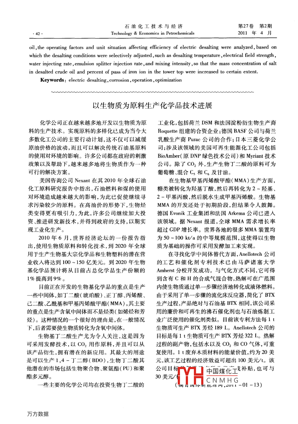 石油化工技術(shù)與經(jīng)濟(jì)第27卷第2期Technology Economics in Petrochemicals011年4月il, the operating factors and unit situation affecting efficiency of electric desalting were analyzed based onwhich the desalting conditions were selectively adjusted, such as desalting temperature, electrical field strength,water injecting rate, emulsion splitter injection rate, and mixing intensity, so that the mass concentration of saltin desalted crude oil and percent of pass of iron ion in the tower top were increased to certain extent.Keywords: electric desalting, corrosion, operation, optimization以生物質(zhì)為原料生產(chǎn)化學(xué)品技術(shù)進(jìn)展化學(xué)公司正在越來(lái)越多地開(kāi)發(fā)以生物質(zhì)為原工業(yè)化,包括荷蘭DSM和法國(guó)淀粉衍生物生產(chǎn)商料的生產(chǎn)技術(shù)。實(shí)現(xiàn)原料的多樣化已成為當(dāng)今大 Roquette組建的合資企業(yè);德國(guó)BASF公司與荷蘭多數(shù)化工公司的主要行動(dòng)計(jì)劃,這不僅可以減緩乳酸生產(chǎn)商 Purac公司的合作;日本三菱化學(xué)公原油價(jià)格的波動(dòng),而且可以解決傳統(tǒng)石油基原料司;涉及該領(lǐng)域的美國(guó)可再生能源化工公司包括的使用對(duì)環(huán)境的影響。許多公司都在政府的剌激 BioAmber(原DNP綠色技術(shù)公司)和 Tyrant技術(shù)政策以及幫助下,越來(lái)越多地將生物質(zhì)作為一種公司。除了CO2外,生產(chǎn)生物丁二酸的原料可為可行的解決方案。葡萄糖、混合C5和C6及甘油。美國(guó)咨詢(xún)公司 Nexant在其2010年全球石油在生物基甲基丙烯酸甲酯(MMA)生產(chǎn)方面,化工原料研究報(bào)告中指出,石油燃料和煤的使用糖類(lèi)被轉(zhuǎn)化為羥基丁酸,然后再轉(zhuǎn)化為2-羥基、對(duì)環(huán)境造成越來(lái)越大的影響,為此已促使繼續(xù)尋2-甲基丙酸,然后脫水生成甲基丙烯酸。生物基求污染較少的原料。在高油價(jià)的形勢(shì)下,生物烴MMA的開(kāi)發(fā)還處于初期階段,但結(jié)果令人鼓舞。類(lèi)變得更有吸引力,為此,許多公司繼續(xù)加大投德國(guó) Evonik工業(yè)集團(tuán)和法國(guó) Arkema公司已進(jìn)入資、推進(jìn)研發(fā)新技術(shù),并得到政府的支持,以期實(shí)該領(lǐng)域。據(jù) Nexant報(bào)道,全球MMA需求增長(zhǎng)率現(xiàn)工業(yè)化生產(chǎn)超過(guò)GDP增長(zhǎng)率。世界各地的很多MMA裝置均2010年6月,世界經(jīng)濟(jì)論壇的一份報(bào)告指為50~100kt/a的中等規(guī)模范圍,這使得以生物出,使用生物質(zhì)原料和轉(zhuǎn)化技術(shù),到2020年全球質(zhì)為基礎(chǔ)的操作可采用發(fā)酵加工來(lái)實(shí)現(xiàn)。用于生產(chǎn)生物基大宗化學(xué)品和生物塑料的潛在營(yíng)在尋找化學(xué)中間體替代方面, Anellotech公司業(yè)收入將達(dá)到100~150億美元。到2020年生物的工藝和催化劑專(zhuān)利技術(shù)已由馬薩諸塞大學(xué)基化學(xué)品預(yù)計(jì)將從目前占總化學(xué)品生產(chǎn)份額的 Amherst分校開(kāi)發(fā)成功。與氣化方式不同,它可得1%提高到9%。到含有C和H的合成氣混合物,熱解可在廣范圍目前正在開(kāi)發(fā)的生物基化學(xué)品的重點(diǎn)是生產(chǎn)內(nèi)使生物質(zhì)通過(guò)單一步驟經(jīng)濟(jì)地轉(zhuǎn)化成液體燃料。些中間體,如丁二酸(琥珀酸)、正丁醇、丙烯酸、由于采用了單一步驟的流化床反應(yīng)器,簡(jiǎn)化了BTX己二酸、乙?;图谆┧峒柞?MMA),其主要生產(chǎn)過(guò)程,產(chǎn)品絕對(duì)與石油基BX相同,該公司采的重點(diǎn)是生產(chǎn)含氧中間體而不是烴類(lèi)(如烯烴和芳用的廉價(jià)和可再生的沸石催化劑也與石油煉制工烴)。這種情況的一個(gè)很好的理由是,在一般情況業(yè)廣泛使用的催化劑類(lèi)似。目前該專(zhuān)利方法每1t下,后者需要使生物質(zhì)轉(zhuǎn)化為含氧中間體。生物質(zhì)可生產(chǎn)BTX芳烴189L。 Anellotech公司的生物基丁二酸生產(chǎn)尤為令人關(guān)注,這是因?yàn)槿諛?biāo)是每1t生物質(zhì)可生產(chǎn)BIX芳烴322L。熱解可采用發(fā)酵技術(shù),以CO2用作原料,并且可以從過(guò)程的副產(chǎn)物,包括水以及CO2和CO氣體,可重該產(chǎn)品衍生,擁有潛在的新應(yīng)用。其最大的用途復(fù)使用。1t廢棄木質(zhì)材料的能量?jī)r(jià)值,約為20美是可以生產(chǎn)1,4-丁二醇(BDO),生物丁二酸其元,該工藝過(guò)程的經(jīng)濟(jì)效益可超出100美元/t。該他潛在的市場(chǎng)包括生物聚合物、聚氨酯(PU)和聚公司目中國(guó)煤化工補(bǔ)貼,也可與酯多元醇。30美元CNMHG些主要的化學(xué)公司均在投資生物丁二酸的門(mén),∠U1I-01-13)