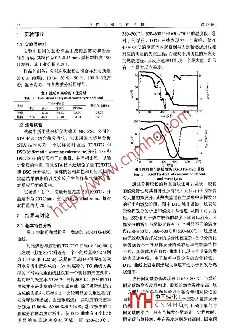 第27卷第14期中國電機(jī)工程學(xué)報(bào)VoL 27 No 14 May 20072007年5月Proceedings of the csee02007 Chin. Soc. for Elec Eng文章編號:0258803(2007)14005105中圖分類號:TK27文獻(xiàn)標(biāo)識碼:A學(xué)科分類號:47010廢輪胎膠粉與煤混燒的熱重分析李相國,馬保國,徐立,羅忠濤(武漢理工大學(xué)硅酸鹽材料工程教育部重點(diǎn)實(shí)驗(yàn)室,湖北省武漢市430070Investigation on Combustion Behavior of the Mixtures of Waste Tyres and Pulverized CoalLI Xiang-guo, MA Bao-guo, XU Li, LUO Zhong-taoKey Laboratory for Silicate Material and Engineering Ministry of Education,Wuhan University of Technology, Wuhan 430070, Hubei Province, China)ABSTRACT: The combustion process, ignition and burnout 0 3lEharacteristics of waste tyre, one high ash coal and tyre-coal隨著汽車工業(yè)和交通運(yùn)輸事業(yè)的發(fā)展,對輪胎blends with 10%, 30% and 50% waste tyres were investigatedby means of thermogravimetric analysis (TGA)caried out at和其它橡膠制品的需求量日益增多,與此同時,廢20 K/min in the temperature range from ambient temperature舊輪胎的產(chǎn)生量也急劇增加。目前,熱解法處理廢o1273K. The results indicate that the combustion of waste舊輪胎是較為有效的方法之一,但該技術(shù)的推廣受tyre is controlled by the emission of volatile matter;the到一定的限制,主要原因是熱解設(shè)備投資大、熱解regions are more complex for waste tyre( three or more peaks)過程能耗高、熱解產(chǎn)品質(zhì)量不佳等。而與煤粉相比,than for coal( one peak), moreover, combustion of high ash廢輪胎具有更高的熱值(29~37MJkg),如果把廢輪oal is controlled by the burn of fixed carbon. Compared wi胎作為燃料( tire-derived fuel,TDr,這個問題就可the ignition temperature of high ash coal, those of mixtures以得到很好的解決。因此,無論從經(jīng)濟(jì)上還是環(huán)保with 10%, 30% and 50% waste tyre decreased by 8C, 30Cand 80 C, and the combustion rate can be increased which上考慮,如何將廢輪胎作為一種可回收利用的化工may be due to the emission and combustion of volatile matter原料或能源材料,已成為一個極為緊迫的世界性問in waste tyre. Moreover, the incorporation of waste tyre can題。TDF可廣泛地應(yīng)用于發(fā)電廠、水泥廠、造紙improve the burnout characteristics廠以及其他一些鍋爐裝置上,可減少化石燃料的使用,而且可以解決廢輪胎處理這個難題,保護(hù)自然KEY WORDS: waste tyres; coal; combustion; thermo-gravimetric analysis; ignition temperature環(huán)境,這種方法在美國、日本、歐洲等已得到廣泛的應(yīng)用4。但是在中國,把廢輪胎作為燃料利用摘要:采用熱重分析法(TGA)對膠粉、煤粉及膠粉與煤混的研究還沒有開展合物燃燒特性進(jìn)行分析,研究煤粉與膠粉混合比例對混合燃料著火特性和燃盡特性的影響規(guī)律。結(jié)果表明:膠粉的充分了解廢輪胎膠粉(簡稱膠粉)的燃燒特性,燃燒特性與煤的燃燒有較大的區(qū)別,高灰分煤的燃燒主要為電力、水泥等工業(yè)專用燃燒設(shè)備的設(shè)計(jì)、燃燒裝受固定碳燃燒控制;而膠粉在燃燒過程中,其高揮發(fā)分的置的正常運(yùn)行和控制燃燒過程提供理論基礎(chǔ),對發(fā)析出和燃燒起主要作用。與煤粉相比,摻10%、30%和50%展循環(huán)經(jīng)濟(jì)具有極其重要的意義。熱重分析法作為的膠粉后燃料的著火溫度分別降低8、30℃和80℃,且促種研究固體化學(xué)反應(yīng)特性的手段,廣泛應(yīng)用于進(jìn)了燃料的燃燒速率,這主要是由于膠粉含大量揮發(fā)分且煤、生物質(zhì)、城市生活垃圾和石油焦的燃燒和熱解在較低溫度下即可明顯析出和燃燒的結(jié)果,膠粉與煤的混特性的研究512。采用TGA技術(shù)研究膠粉及其與煤燒有利于改善高灰分煤的著火和燃盡特性粉有部性和燃蟀性的相對較少中國煤化工關(guān)鍵詞:廢輪胎;煤;燃燒;熱重分析:著火點(diǎn)CNMHG.煤粉及膠粉與煤基金項(xiàng)目:國家863高技術(shù)基金項(xiàng)目(2002AA335050)。The National High Technology Research and Development of China混合物燃燒特性進(jìn)行分析,研究混合比例對混合燃863 Programme)(2002AA335050)料著火特性、燃盡特性和燃燒機(jī)理的影響規(guī)律第27卷1實(shí)驗(yàn)部分360-500℃、520~600℃和650~750℃的溫度段;④對于純煤粉,DTG曲線表現(xiàn)為一個寬峰,僅在1.1實(shí)驗(yàn)原材料實(shí)驗(yàn)中使用的膠粉樣品由廢輪胎剪切和粉磨400~750℃溫度范圍內(nèi)觀察到與固定碳燃燒過程相對應(yīng)的明顯的失重過程,而觀察不到明顯的揮發(fā)分制備而成,其粒徑為0.3~0.45mm。煤粉顆粒度190的燃燒過程。其反應(yīng)速率只出現(xiàn)一個最大值,即只目左右。其工業(yè)分析見表1。樣品的制備:分別選取膠粉占混合樣品總質(zhì)量有一個最大反應(yīng)溫度。的0%(純煤)、10%、30%、50%、100%(純膠粉)混合均勻,制備熱重分析用樣品60表1膠粉和煤粉的工業(yè)分析DTGTab. 1 Industrial analysis of waste tyre and coal類別一水分灰分工業(yè)分析%發(fā)熱值/Mkg揮發(fā)分固定碳200400800T℃煤粉266449321.40(a)膠粉1.2燃燒試驗(yàn)試驗(yàn)中所用熱分析儀為德國 NETZSC公司的STA449C綜合熱分析儀,它采用的同步熱分析DTG(STA)技術(shù)可對一個試樣同時做出 TG/DTG和Dsc( differential scanning calorimetric)分析。TG和DSC/DTG的結(jié)果可同時獲得,并互相比照,以確800T/℃定物質(zhì)的性質(zhì),而且STA技術(shù)還避免了當(dāng) TG/DTG和DSC分開做時,試樣的各相異性和幾何形狀對圖1純膠