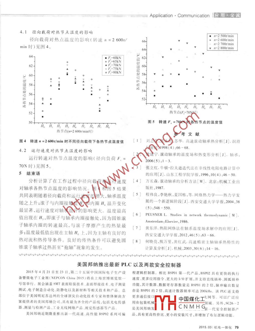 基于熱網(wǎng)絡(luò)法的列車軸箱軸承熱分析基于熱網(wǎng)絡(luò)法的列車軸箱軸承熱分析Thermal Analysis of Axle Box Bearing Based on Thermal Network Method吳偉余志壯同濟(jì)大學(xué)鐵道與城市軌道交通研究院,上海201804)摘要:分析了圓錐滾子軸承的摩擦熱來源,在此基礎(chǔ)上以脂潤滑下的cRH3列車用軸箱圓錐滾子軸承單元130/240-B-TVP為研究對象,通過熱網(wǎng)絡(luò)法建立圓錐滾子軸承的熱節(jié)點(diǎn)的平衡方程組,采用牛頓-拉夫遜迭代法求解進(jìn)行熱分析,研究了各熱節(jié)點(diǎn)隨著徑向載荷和運(yùn)行速度的變化趨勢,并得出了圓錐滾子軸承在工作過程中溫度最高點(diǎn)和最低點(diǎn)分別出現(xiàn)在滾子與軸承內(nèi)圈接觸處和主軸上關(guān)鍵詞:熱網(wǎng)絡(luò)法圓錐滾子軸承熱分析DOI:10.1641l3/ j. cnkiissn.1007-080x.2015.03.017Abstract: Analysis with the thermal sources theory for tapered rolling bearing, taking the bearing 130/240-BTVP lubricated by grease as research object. The balance equations of hot nodes are established by thermal network ofthe tapered roller bearing, analyze the trends of each heat node with varied radial loads and speeds by Newton- Raphson iterative method, and reach the conclusion that the peak temperature and valley temperature appear on the innerKey words: thermal network method tapered rolling bearing thermal analysis0引言率損失及熱量在各元件之間的分配進(jìn)行,熱平衡方列車軸箱軸承常常在高速工況下工作,若軸承程組根據(jù) Kirchhoff定律建立,用牛頓-拉夫遜迭代內(nèi)的摩擦熱及高溫環(huán)境傳入軸承的熱量不能及時(shí)地法③進(jìn)行數(shù)值計(jì)算求解。本文在圓錐滾子軸承分析散發(fā),滾動(dòng)軸承將可能因熱膨脹失去工作間隙而發(fā)的基礎(chǔ)上,對其溫度場隨徑向載荷和運(yùn)行速度的變生“抱軸”現(xiàn)象,保持架材料可能因高溫而熔化,軸承化趨勢進(jìn)行分析,找出了各節(jié)點(diǎn)溫度分布的最高點(diǎn)滾道及滾動(dòng)體表面可能因損傷而過早報(bào)廢。軸承與最低點(diǎn)。的許多種失效形式皆因“熱”導(dǎo)致。找出軸承的溫度1滾動(dòng)軸承摩擦熱源分布,預(yù)測出某一工況下軸承所處的溫度場、哪些零熱源計(jì)算是研究溫度場的基礎(chǔ)。根據(jù) Palmgren部件是溫度較高易于失效的危險(xiǎn)部件,就可以有的推導(dǎo)的公式,軸承的摩擦力矩主要有兩部分:潤滑劑放矢地對設(shè)計(jì)方案、工藝流程或結(jié)構(gòu)材料進(jìn)行改進(jìn),以提高新產(chǎn)品的壽命和可靠性2]。軸承熱分析研究黏性產(chǎn)生的摩擦力矩M。和與速度無關(guān)的載荷作用產(chǎn)生的摩擦力矩M1。內(nèi)容主要包括軸承熱源計(jì)算、熱網(wǎng)絡(luò)圖繪制、熱平衡方程組的建立與求解。軸承發(fā)熱量通過計(jì)算軸承功、中國煤化工CNMHG*作者簡介:吳偉1987年生,碩士研究生。研究方向?yàn)檩S承潤滑與溫度場分礦于。余志壯1963年生,博士,副教授。主要研究方向?yàn)閮?nèi)燃機(jī)與軸承摩擦潤滑、先進(jìn)制造等。76機(jī)電一體化12015.03Application· Communication應(yīng)用交流M,=f1P1dn。dh式中,f6為與軸承類型和潤滑方式有關(guān)的系數(shù);v為工pcvx,=q,(i=1,2,…,n)。作溫度下潤滑劑的運(yùn)動(dòng)黏度,mn/;n為主軸轉(zhuǎn)速,式中,為密度;e為比熱容;為體積業(yè)為溫度對時(shí)r/min;d為軸承節(jié)圓,mmf為與軸承類型和所受載荷有關(guān)的系數(shù);P為確定軸承摩擦力矩的計(jì)算載荷,間的導(dǎo)數(shù)。N;Ma、M1為摩擦力矩,N·mm求解這一微分方程組可獲得系統(tǒng)的瞬態(tài)溫度場。滾動(dòng)軸承接觸區(qū)熱生產(chǎn)還與滾動(dòng)體和套圈的自熱網(wǎng)絡(luò)法的節(jié)點(diǎn)位置的布局、網(wǎng)絡(luò)的疏密程度完全由旋有關(guān)。根據(jù)高速下軸承套圈溝道理論,滾動(dòng)體和研究者根據(jù)實(shí)際需要來靈活掌握因而用起來很方便。內(nèi)套圈存在自旋自旋摩擦力矩為M=3Q8。3圓錐滾子軸承溫度場模型建立及分析式中,μ為滾動(dòng)體與溝道的摩擦系數(shù);Q為滾動(dòng)體與本文以脂潤滑下的CRH3列車用軸箱圓錐滾子溝道的法向接觸載荷,N;a為赫茲接觸橢圓長半軸,軸承單元130240-B-TVP為研究對象B表示帶潤m;e為第二類橢圓積分。因此,軸承的摩擦熱可計(jì)滑脂和密封,TvP表示塑鋼保持架,見圖1。外形尺寸算得為dDB=130mm×240mm×160mm。軸承發(fā)熱量主要2嚇n(M。+M1)+M,on由軸承元件相互運(yùn)動(dòng)產(chǎn)生,首先需分析其內(nèi)部的運(yùn)動(dòng)及受力關(guān)系。所建立的承載模型見圖2式中,n為主軸轉(zhuǎn)速,r/min;a,為滾動(dòng)體內(nèi)圈自旋運(yùn)動(dòng)的角速度,rad/s。2熱網(wǎng)絡(luò)法的理論基礎(chǔ)目前,軸承熱分析主要包括有限元法、熱網(wǎng)絡(luò)法和實(shí)驗(yàn)法。熱網(wǎng)絡(luò)法是緊跟現(xiàn)代電子學(xué)發(fā)展的,它的分析方法基本上效法電系統(tǒng),其網(wǎng)絡(luò)理論可認(rèn)為是電子學(xué)和電系統(tǒng)的網(wǎng)絡(luò)。這是因?yàn)樵谝磺泻形锪髋c能流的動(dòng)態(tài)系統(tǒng)中,不論該系統(tǒng)中是否有電的存在都可找到電系統(tǒng)中的電阻、電容和電感等概念的對應(yīng)物,電阻對應(yīng)各種阻力和對能量的消耗與節(jié)流,電容對應(yīng)各種形式的儲(chǔ)存能量,電感對應(yīng)各種慣性儲(chǔ)存能圖1 TAROL雙列圓錐滾子軸