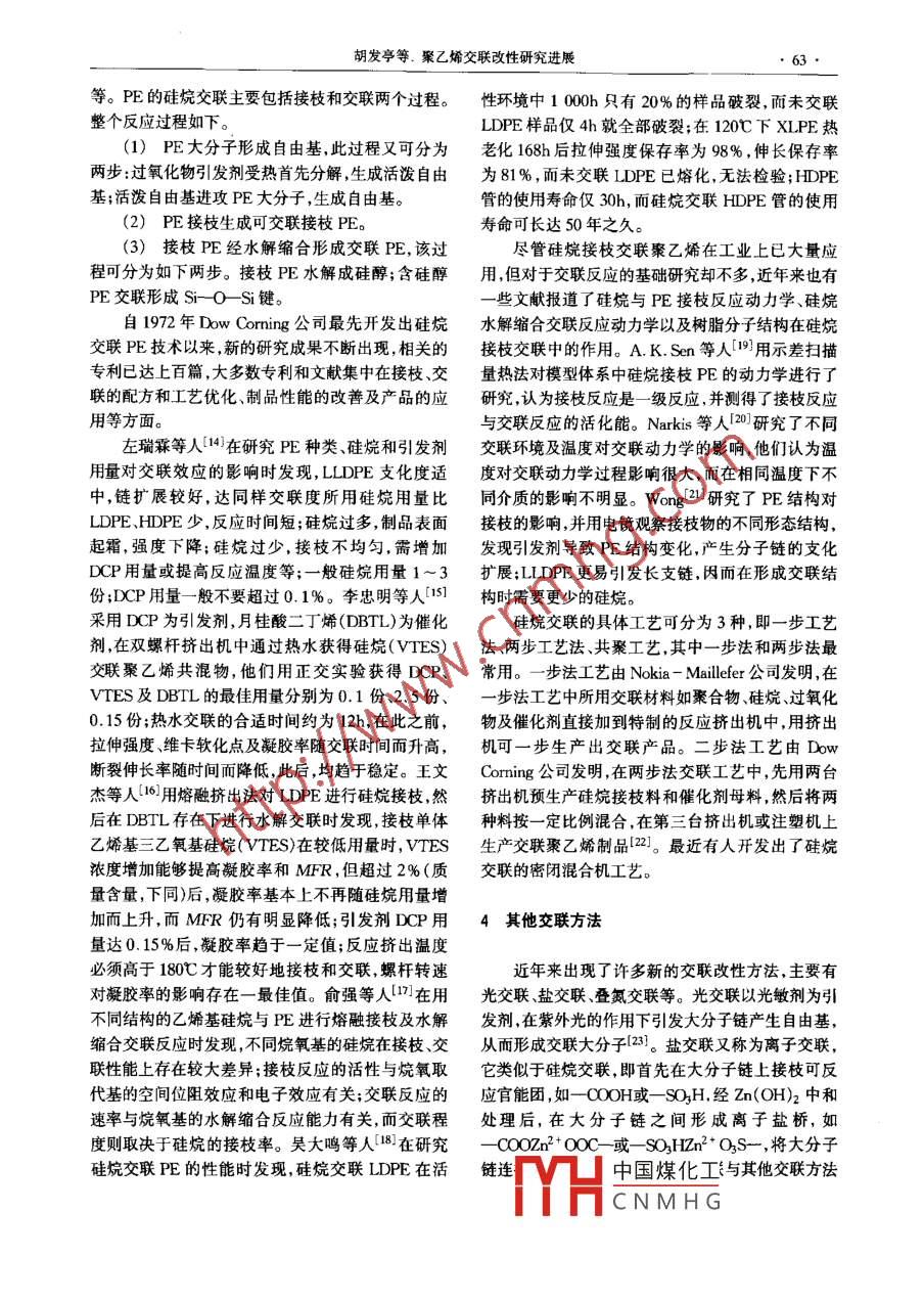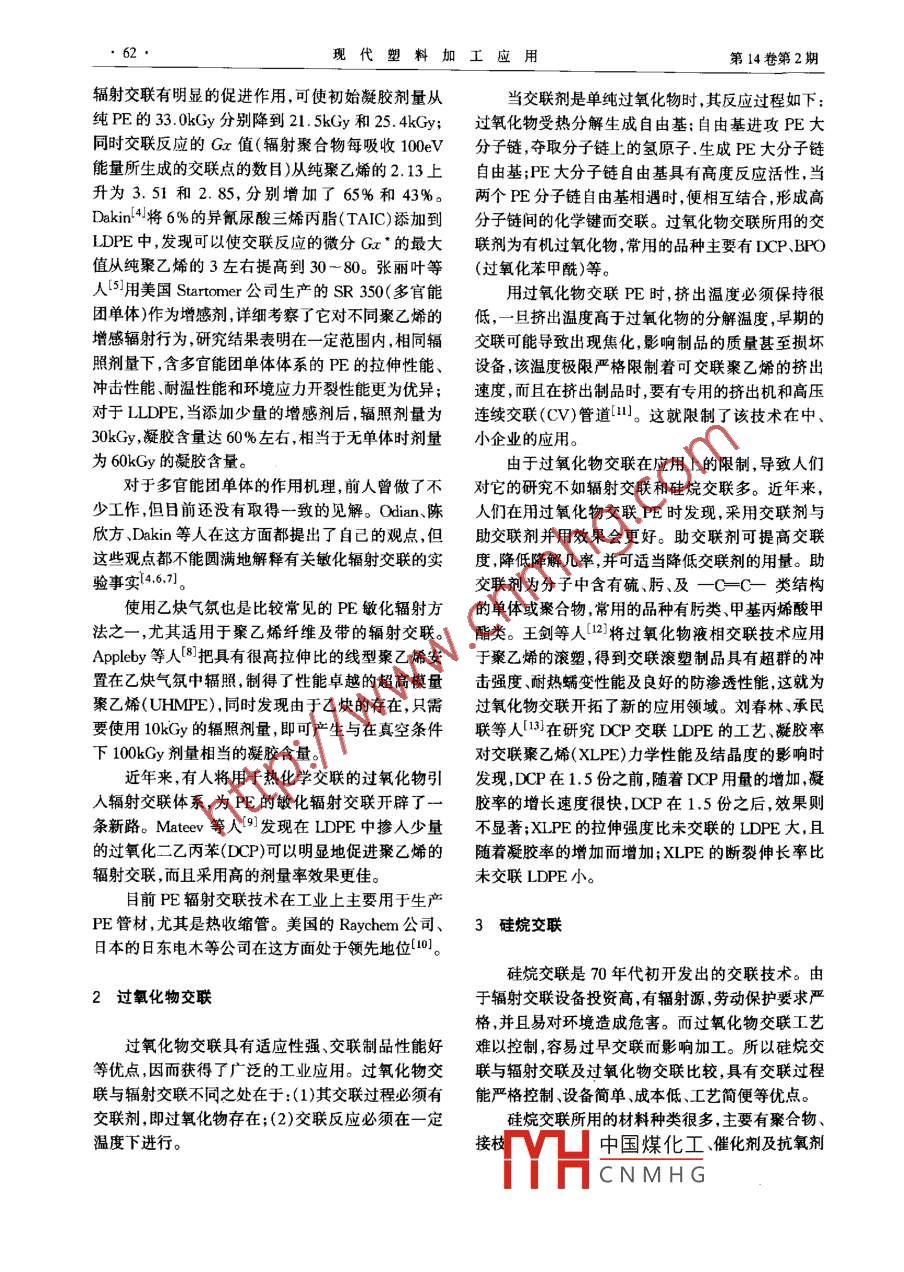.,現(xiàn)代塑料加工應(yīng)用第14卷第2期Modem Plastics Processing and Applications2002年4月聚乙烯交聯(lián)改性研究進展胡發(fā)亭郭奕祟(北京化工大學(xué)塑料機械及塑料工程研究所, 1002090摘要:綜述了近年來國內(nèi)外對聚乙烯交聯(lián)技術(shù)(輻射交聯(lián)過氧化物交聯(lián)、硅烷交聯(lián))的研究進展情況,同時介紹了3種主要交聯(lián)方法的反應(yīng)機理和優(yōu)缺點。關(guān)鍵詞:聚乙烯 交聯(lián)輻射過氧化物硅烷聚乙烯(PE)是五大通用塑料之一,具有優(yōu)良的應(yīng)形成交聯(lián)鍵。電絕緣性、耐低溫性、易加工成型和足夠的力學(xué)性聚乙烯是一種典型的可輻射交聯(lián)聚合物,在過能,以及優(yōu)異的化學(xué)穩(wěn)定性和介電性能,已被廣泛應(yīng)去的近50年中,人們對它的輻射效應(yīng)作了大量深人用于制作薄膜、泡沫制品、管材、電線電纜絕緣料等,細(xì)致的研究工作。PE在輻照下容易交聯(lián),初始凝膠其產(chǎn)量和用量居各合成樹脂之首。但是聚乙烯的熔時輻照劑量較低,但要達到較高的凝膠含量仍需要點較低,機械強度低,且環(huán)境應(yīng)力開裂性能較差,大較高的輻照劑量,以至于成本偏高,限制了其推廣使大限制了它的應(yīng)用范圍,因此對其進行改性處理一用21。而且大劑量的輻照還可能產(chǎn)生氧化降解、破直是PE應(yīng)用和理論研究的重點,而交聯(lián)則是PE改壞材料中的添加劑等副反應(yīng),影響材料的使用性能。性較為理想的方法之一。因此如何加速輻射交聯(lián),抑制副反應(yīng),降低達到所需聚乙烯比較常用的交聯(lián)方法有輻射交聯(lián)、過氧凝膠含量時的輻照劑量,也就是聚乙烯的敏化輻射化物交聯(lián)和硅烷交聯(lián)。此外還有光交聯(lián).鹽交聯(lián)等問題,已成為當(dāng)前研究的重點。解決PE敏化輻射其他交聯(lián)方法。其中輻射交聯(lián)、光交聯(lián)屬于物理改問題的一般方法是在 PE中加人增敏劑和敏化劑性方法,過氧化物交聯(lián)、硅烷交聯(lián)和鹽交聯(lián)屬于化學(xué)(也有人將增敏劑和敏化劑統(tǒng)稱為敏化劑或增感劑)改性方法。交聯(lián)改性與共聚及共混等改性方法相或者改變輻照氣氛(如在乙炔、四氟乙烯氣氛中)。比,工藝簡單,并可以邊成型邊實施交聯(lián)。對PE進增敏劑一般為多官能團單體,可增大交聯(lián)反應(yīng)的比行交聯(lián)政性可明顯提高PE的拉伸強度、沖擊強度、例,提高交聯(lián)反應(yīng)G值。常用的增敏劑有二甲基丙抗蠕變及耐熱性能等,而又幾乎不損壞原有的其他烯酸四甘醇脂(TEGDM)、三甲基丙烯酸三羥基丙性能。因此對PE交聯(lián)技術(shù)的研究具有特別重要的酯(TMPTM)等。敏化劑一般為活潑小分子,作用意義,是目前聚乙烯改性研究的熱[ ]課題。為加速輻射交聯(lián)反應(yīng)。常用的敏化劑有SiCl2、CCl4、NaF以及炭黑等。1輻射交聯(lián)在聚乙烯中混入多官能團單體是PE敏化輻射交聯(lián)最常用的方法。不但能夠有效地降低PE的初輻射交聯(lián)不用交聯(lián)劑可在室溫下進行,因而可始凝膠劑量,增加在相同凝膠劑量下的凝膠含量,而在制品成型后進行交聯(lián)并可保證制品不發(fā)生變形。且工藝簡單,操作方便。輻射交聯(lián)的高能輻射源主要有高能電子束、X射線、Novakovie和Gal[3I在研究增敏劑的作用時發(fā)中子及r射線等?,F(xiàn),在LDPE中混入3份的三羥基甲基丙烷三甲基PE的輻射交聯(lián)反應(yīng)為自由基鏈?zhǔn)椒磻?yīng)1),反應(yīng).丙烯酸脂(TMPTMA)和氰尿酸三烯丙脂(TAC)對過程可分為3步:(1)PE高分子鏈在輻照作用下生收稿日期:2001 - 10- 16。成初級自由基和活潑氫原子;(2)活潑氫原子可繼續(xù)攻擊PE,再生成自由基;(3)大分子鏈自由基之間反中國煤化工爾化工大學(xué)碩士研究生,MYHCNMHG62 .現(xiàn)代塑料加工應(yīng)用第14卷第2期輻射交聯(lián)有明顯的促進作用,可使初始凝膠劑量從當(dāng)交聯(lián)劑是單純過氧化物時,其反應(yīng)過程如下:純PE的3.0kGy分別降到21. 5kGy和25.4kGy;過氧化物受熱分解生成自由基;自由基進攻PE大同時交聯(lián)反應(yīng)的Gx值(輻射聚合物每吸收100eV分子鏈,奪取分子鏈上的氫原子.生成PE大分子鏈能量所生成的交聯(lián)點的數(shù)目)從純聚乙烯的2.13上自由基;PE大分子鏈自由基具有高度反應(yīng)活性,當(dāng)升為3.51和2.85,分別增加了65%和43%。兩個PE分子鏈自由基相遇時,便相互結(jié)合,形成高Dakin' 4|將6%的異氰尿酸三烯丙脂(TAIC)添加到分子鏈間的化學(xué)鍵而交聯(lián)。過氧化物交聯(lián)所用的交LDPE中,發(fā)現(xiàn)可以使交聯(lián)反應(yīng)的微分Gx °的最大聯(lián)劑為有機過氧化物,常用的品種主要有DCP、BPO值從純聚乙烯的3左右提高到30~ 80。張麗葉等(過氧化苯甲酰)等。人[5)用美國Startomer公司生產(chǎn)的SR 350(多官能用過氧化物交聯(lián)PE時,擠出溫度必須保持很團單體)作為增感劑,詳細(xì)考察了它對不同聚乙烯的低,- -旦擠出溫度高于過氧化物的分解溫度,早期的增感輻射行為,研究結(jié)果表明在一定范圍內(nèi),相同輻交聯(lián)可能導(dǎo)致出現(xiàn)焦化,影響制品的質(zhì)量甚至損壞照劑量下,含多官能團單體體系的PE的拉伸性能、設(shè)備,該溫度極限嚴(yán)格限制著可交聯(lián)聚乙烯的擠出沖擊性能、耐溫性能和環(huán)境應(yīng)力開裂性能更為優(yōu)異;速度,