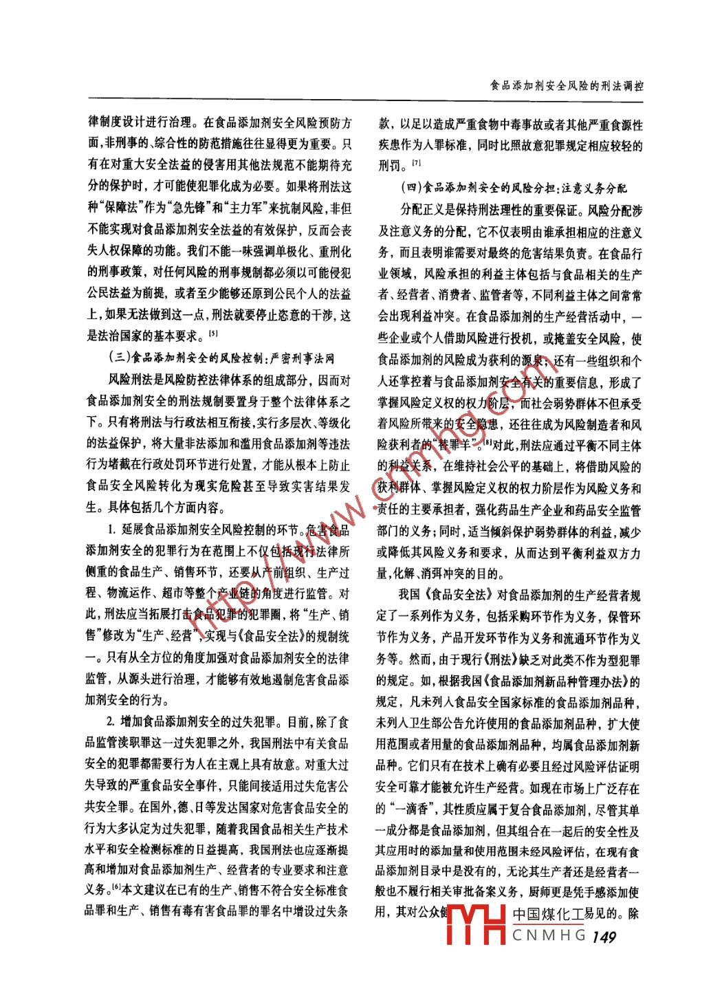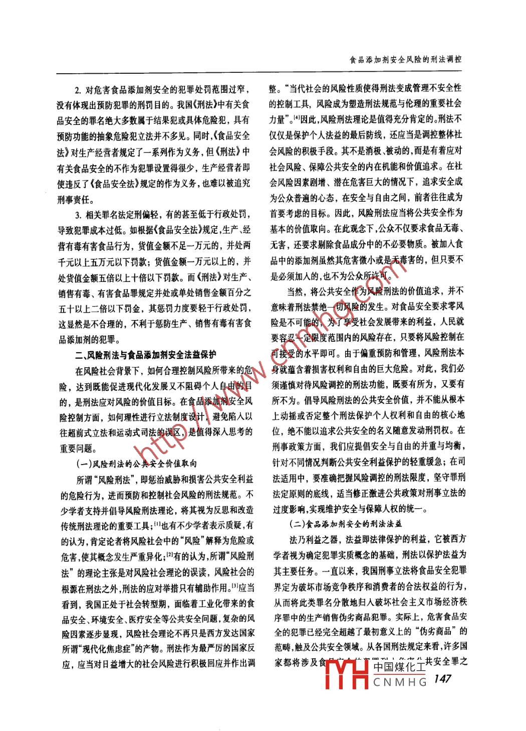 旺西社金科學(xué)2013年第5期食品添加劑安全風(fēng)險(xiǎn)的刑法調(diào)控■張勇近年來我國發(fā)生的一些食品添加劑事件凸顯我國食品安全風(fēng)險(xiǎn)及監(jiān)管存在的問題。在風(fēng)險(xiǎn)社會(huì)背景下,風(fēng)險(xiǎn)刑法理論是值得提倡的。刑法應(yīng)當(dāng)積極發(fā)揮對(duì)食品添加劑安全風(fēng)險(xiǎn)調(diào)控功能,加強(qiáng)公共安全法益的保護(hù),優(yōu)化食品添加劑安全法益結(jié)構(gòu)。筆者認(rèn)為,食品添加劑安全風(fēng)險(xiǎn)調(diào)控的刑法功能表現(xiàn)在風(fēng)險(xiǎn)識(shí)別、風(fēng)險(xiǎn)預(yù)防、風(fēng)險(xiǎn)控制、風(fēng)險(xiǎn)分擔(dān)、風(fēng)險(xiǎn)轉(zhuǎn)移,即安全法益分級(jí)、法益前置保護(hù)、嚴(yán)密刑事法網(wǎng)、風(fēng)險(xiǎn)義務(wù)分配、刑事推定適用等五個(gè)方面。[關(guān)鍵詞]食品添加劑;風(fēng)險(xiǎn)刑法;安全法益;食品安全;食品監(jiān)管[中圖分類號(hào)]D924.32 [文獻(xiàn)標(biāo)識(shí)碼]A [文章編號(hào)]1004 - 518X(2013)05 -0145 -06{基金項(xiàng)目]高水平特色法學(xué)學(xué)科建設(shè)與人才培養(yǎng)工程(085工程)張勇,華東政法大學(xué)研究員,上海市松江區(qū)人民檢察院副檢察長,法學(xué)博士,博士后。(上海201620)食品添加劑在食品加工業(yè)得到廣泛應(yīng)用,被視為現(xiàn)保護(hù)劑、乳化劑、增稠劑、凝固劑和水分保護(hù)劑等。未進(jìn)代食品工業(yè)的靈魂。在食品添加劑與人們?nèi)粘I钣尤四夸浀奈镔|(zhì)不得作為添加劑進(jìn)行食品的加工處理。無密切的同時(shí),食品添加劑產(chǎn)業(yè)鏈中的行為失范和監(jiān)管缺論是天然的還是人工的,食品添加劑都具有兩個(gè)基本屬失問題凸顯,蘇丹紅、三聚氰胺、染色饅頭、瘦肉精等重性:第一,不能當(dāng)作食品單獨(dú)食用;第二,必須是安全的。大食品安全事件頻發(fā),人們對(duì)“舌尖上風(fēng)險(xiǎn)”的擔(dān)憂和恐我國現(xiàn)行的《食品安全法>第2條規(guī)定,在境內(nèi)從事食品慌不斷加劇。作為法律體系中最為嚴(yán)厲的刑法,如何發(fā)添加劑的生產(chǎn) 經(jīng)營,食品生產(chǎn)經(jīng)營者使用食品添加劑、揮其風(fēng)險(xiǎn)調(diào)控和安全保障功能,將食品添加劑所蘊(yùn)含的食品相關(guān)產(chǎn)品,對(duì)食品添加劑和食品相關(guān)產(chǎn)品的安全管風(fēng)險(xiǎn)降至最低,為食品公共安全守住的最后防線,是一理等活動(dòng),應(yīng)當(dāng)遵守本法。也就是說,食品添加劑安全是個(gè)涉及民生大計(jì)的重要理論和現(xiàn)實(shí)問題。食品安全的有機(jī)組成部分,其性質(zhì)沒有區(qū)別,受食品安一、食品添加劑安全及其刑事立法缺陷全法律法規(guī)的調(diào)整。食品添加劑是指為改善食品品質(zhì)和色、香、味以及與環(huán)境污染、網(wǎng)絡(luò)病毒、恐怖主義等社會(huì)風(fēng)險(xiǎn)- -樣,為防腐保鮮和加工工藝的需要而加入食品中的人工合食品添加劑的風(fēng)險(xiǎn)是不確定的,具有無法感知、難以計(jì)成或者天然物質(zhì)。我國對(duì)食品添加劑實(shí)行目錄管理制算和延展性強(qiáng)的特點(diǎn)。多種風(fēng)險(xiǎn)交織在一-起, 導(dǎo)致食品度,《食品添加劑使用衛(wèi)生標(biāo)準(zhǔn)》>(GB2760- -2007)規(guī)定安全隱患重重,并易誘致新型、高危的風(fēng)險(xiǎn)發(fā)生。但客觀有22類近兩千種食品添加劑,從產(chǎn)品種類和用途功能來來說,風(fēng)險(xiǎn)本身就是社會(huì)發(fā)展的正常現(xiàn)象,食品工業(yè)化看,可分為防腐劑抗氧化劑、酸味劑、著色劑、漂白劑、包含著技術(shù)風(fēng)險(xiǎn) 和制度風(fēng)險(xiǎn)。1們?cè)谙硪ú?食的同時(shí),中國煤化工TYHCNMHG 145江西社會(huì)科學(xué)2013.5也要對(duì)其中的風(fēng)險(xiǎn)加以認(rèn)識(shí)、判斷和選擇。刑法中的危情況罪等。.險(xiǎn)與風(fēng)險(xiǎn)社會(huì)中風(fēng)險(xiǎn)的含義不同,前者是整體社會(huì)風(fēng)險(xiǎn)2.食品添加劑安全監(jiān)管者的風(fēng)險(xiǎn)行為。除了上述生的具體化、現(xiàn)實(shí)化,是經(jīng)過否定性刑法評(píng)價(jià)的風(fēng)險(xiǎn),也只產(chǎn)經(jīng)營者的風(fēng)險(xiǎn)行為之外, 食品添加劑安全監(jiān)管方面的有那些危險(xiǎn)程度較高,涉及國家、社會(huì)或個(gè)人法益的風(fēng)缺陷和漏洞也是重要的風(fēng)險(xiǎn)源。食品添加劑安全監(jiān)管部險(xiǎn)行為才會(huì)受到刑法規(guī)制。同時(shí),隨著人們對(duì)風(fēng)險(xiǎn)與危門重審批、輕監(jiān)管,行政執(zhí)法不銜接、不協(xié)調(diào),專項(xiàng)整治險(xiǎn)主觀認(rèn)識(shí)上的變化,刑法的評(píng)價(jià)與規(guī)制也會(huì)產(chǎn)生轉(zhuǎn)行動(dòng)治標(biāo)不治本,往往更為公眾媒體詬病和責(zé)難。對(duì)食變。如在阜陽“毒奶粉”案中,蛋白質(zhì)脂肪含量不足的奶品添加劑生產(chǎn)經(jīng)營負(fù)有安全監(jiān)管責(zé)任的人員不履行法粉不是不符合衛(wèi)生標(biāo)準(zhǔn),而是涉及食品營養(yǎng)安全問題。定職責(zé)或者濫用職權(quán),造成嚴(yán)重后果的,可能構(gòu)成濫用在物質(zhì)匱乏、溫飽已足的年代,食品營養(yǎng)問題是無人考職權(quán)罪、玩忽職守罪、提供虛假證明文件罪、出具證明文