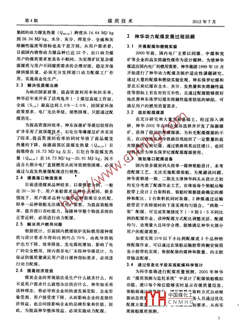 第4期煤質(zhì)技術(shù)2012年7月動力配煤在神華煤質(zhì)管理中的應(yīng)用繆希偉(神華銷售集團有限公司,北京100011)摘要:對神華集團開展動力配煤的必要性進行了分析,介紹了神華動力配煤的發(fā)展和實施過程以及取得的效果,對煤炭企業(yè)的煤質(zhì)管理有較好的示范效果。關(guān)鍵詞:動力配煤;煤質(zhì)管理;神華;應(yīng)用中圖分類號: TQ520. 62文獻標(biāo)識碼: B文章編號: 1007-7677 (2012) 04-0006-05Application of steam coals blending in coal quality management of Shenhua GroupMIAO Xi-wei(Shenhua Sales Group Co., Ltd., Beijing 100111 China)Abstract: The necessity of steam coals blending in Shenhua Group was analyzed, and the development, implementation and theeffects of steam coals blending was introduced in this paper, which would be a good demonstration for the coal quality managementof coal enterprises.Key words: stegm coals blending; coal quality management; Shenhua; application動力配煤是根據(jù)工業(yè)生產(chǎn)的需求,按照科學(xué)計沒有系統(tǒng)的配煤理論作指導(dǎo),配煤工藝及混煤設(shè)備算或由燃燒試驗獲得的配煤比,把幾種不同品質(zhì)的落后,也沒有采用優(yōu)化配煤等生產(chǎn)工藝,配煤質(zhì)量動力煤均勻地混合在一起或根據(jù)環(huán)保需求配入添加有的達不到要求,且沒有考慮到各種配煤的復(fù)雜劑,生產(chǎn)- -種新的動力煤產(chǎn)品的工藝過程'。性,未能綜合考慮煤的燃燒特性,導(dǎo)致鍋爐常常發(fā)動力配煤是神華集團煤質(zhì)管理的重要- -環(huán),在生運行不穩(wěn)定等事故。神華發(fā)展歷程中,最初因為煤炭品種單- -問題使集2神華開展動力配煤必要性分析團的正常銷售面臨重大挑戰(zhàn),后因煤種多、煤質(zhì)差異大等問題使煤質(zhì)管理工作受到巨大沖擊。通過堅2.1開拓市場持科學(xué)合理的實施動力配煤,集團有效化解了風(fēng)神華集團成立之初,煤炭資源全部來自神府東險,保證了煤質(zhì)的穩(wěn)定和用戶的需求,提高了經(jīng)濟勝礦區(qū)。神府東勝礦區(qū)是國內(nèi)最大的動力煤基地之效益,提升了品牌形象。一, 煤炭形成于侏羅紀(jì),為低變質(zhì)程度的煙煤-不黏煤和長焰煤,具有水分高、灰分低、硫分低、揮1國內(nèi)外動力配煤發(fā)展現(xiàn)狀發(fā)分高、發(fā)熱量較高、灰熔融性溫度較低的特點。國外的動力配煤始于20世紀(jì)70年代中期,西由于灰熔融性溫度較低,最初不能滿足大部分電廠方一些國家配煤的主要目的是采用低硫煤與高硫煤的燃用要求,用戶出于安全考慮不愿接受神華煤?;旌弦越档蚐O,的排放、降低鍋爐的結(jié)渣及積灰,煤炭品種單一、灰熔融性溫度低等問題制約了神華充分利用高發(fā)熱量煤,保證灰分和發(fā)熱量的穩(wěn)定的快速發(fā)展壯大。為開拓市場,使神華煤滿足用戶等。而日本等國家的配煤則主要是為了節(jié)約煤炭和的燃用需求,必須尋找合適的配煤煤源,開展配煤減少運輸費用。動力配煤主要對象是電廠用煤,配研究和實驗,通過港口動力配煤擺脫困難局面。煤方式-般采用倉混式、庫混式、帶混式等形式。2.2穩(wěn)定煤質(zhì) .國內(nèi)的動力配煤研究與應(yīng)用起步于20世紀(jì)80年隨著神華的快速發(fā)展,金烽公司、萬利公司、代初,國內(nèi)配煤主要有2種:①用戶入爐前簡單配準(zhǔn)能公司及包頭礦業(yè)公司等并入集團,又先后成立煤;②港口、煤站煤場混煤,按2種煤種的發(fā)熱量了榆神公中國煤化工原公司等單位,外和揮發(fā)分采用簡單加權(quán)平均方法進行一定比例的混購煤區(qū)域MHCNMH(大到晉、陜、蒙。合,即不同煤種的簡單機械混合。國內(nèi)動力配煤總煤源單位不斷增多,土廠1開仙外購煤站臺大量增體技術(shù)水平低,很多配煤場尚處于經(jīng)驗配煤階段,加,煤炭品種和質(zhì)量日趨復(fù)雜。從目前看,神華銷售第4期煤質(zhì)技術(shù)2012年7月集團的動力煤發(fā)熱量(Qme,a) 跨度從14. 64 MJ/kg3神華動力 配煤發(fā)展過程回顧到26.34 MJ/kg,水分、灰分、揮發(fā)分、全硫和灰熔融性溫度等指標(biāo)也是千差萬別。從用戶需求看,3.1開 展配煤和燃燒實驗?zāi)壳皣鴥?nèi)銷售動力煤品種已達22個,出口動力煤2000年前,國內(nèi)電廠主要以同煤、中煤和兗用戶的煤質(zhì)要求更是各不相同。為實現(xiàn)礦區(qū)復(fù)雜煤礦等企業(yè)的高灰熔融性煤作為設(shè)計煤種。為使神華源煤質(zhì)與用戶不同煤質(zhì)需求的合理對接,穩(wěn)定并保煤適應(yīng)國內(nèi)電廠的燃用需要,神華集團1999年10月障供煤質(zhì)量,必須充分發(fā)揮港口動力配煤工廠作開始進行了神華動力配煤及鍋爐適應(yīng)性課題研究,用,實施商業(yè)化生產(chǎn)。通過大量的配煤和燃燒實驗發(fā)現(xiàn),神東侏羅紀(jì)煤和2.3解決低質(zhì)煤出路晉北石炭紀(jì)煤在全水、灰分、發(fā)熱量和灰熔融性溫為響應(yīng)國家政策,提高資源利用率和回采率,度等指標(biāo)上有良好的互補性,且通過配煤能夠很好神華近年來開采了活雞兔井1 - 2煤層高硫工作面,地改善神東侏羅紀(jì)煤灰熔融性溫度較低的缺陷,可全硫(Sua) 最高達到2. 0%~3.0%,因國家環(huán)保滿足用戶的燃用質(zhì)量需求。政策要求,電廠無法單燒,銷售困難,只能通過配3.2組 織配煤煤源煤消化。在充分研究和大量實驗基礎(chǔ)上,經(jīng)過深入調(diào)為提高資源回收率,神東保德礦等煤層較厚的