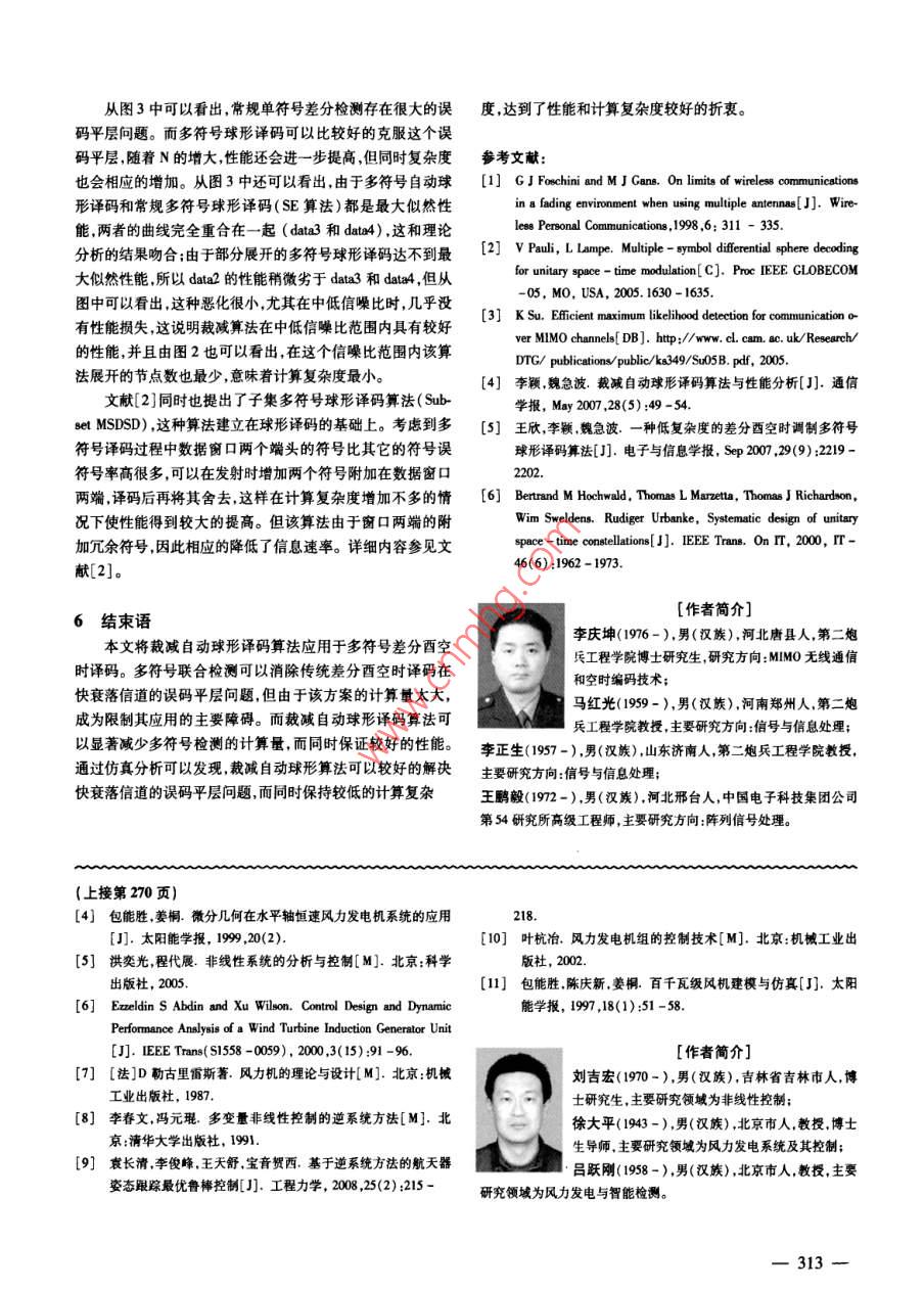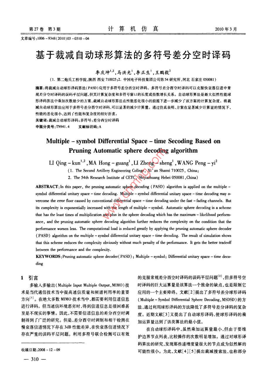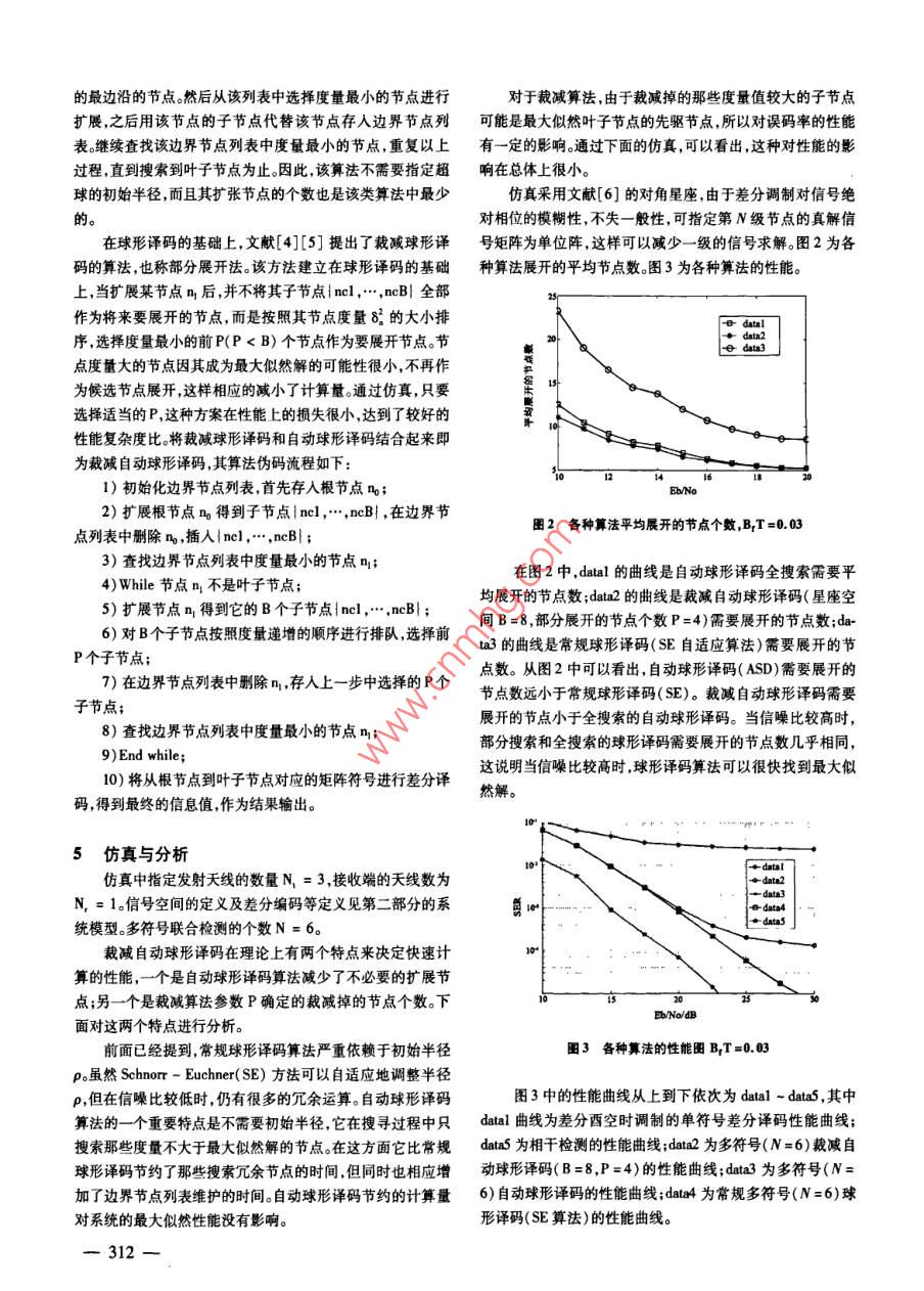 第27卷第3期計算機仿真2010年3月文章編號:1006-9348(2010)03-0310-04基于裁減自動球形算法的多符號差分空時譯碼李慶坤2,馬洪光,李正生,王鵬毅(1.第二炮兵工程學院陜西西安710025;2.中國電子科技集團公司第54研究所,河北石家莊050081)摘要:將裁減自動球形譯碼算法(PASD)應用于多符號差分酉空時譯碼。多符號差分酉空時譯碼可以克服快衰落信道中常規(guī)差分空時譯碼的誤碼平層問題但其計算復雜度和多符號窗口的長度成指數(shù)增長關系。自動球形算法是最大似然性能球形譯碼算法中乘加次數(shù)最少的方案裁減自動球形算法在性能惡化很小的前提下進一步減少了該方案的計算復雜度。將裁減自動球形算法應用于多符號差分酉空時譯碼,可以顯著的減少計算量。通過仿真表明,方案在顯著減少計算量的情況下性能的惡化很小,達到了性能和復雜度的較好折衷關鍵詞:裁減自動球形譯碼;多符號;差分酉空時譯碼中圖分類號:TN941.4文獻標識碼:AMultiple symbol Differential Space-time Secoding Based onPruning Automatic sphere decoding algorithmLI Qing-kun., MA Hong-guang, LI Zheng-sheng, WANG Peng-yi(1. The Second Artillery Engineering College, Xi'an Shanxi 7100252. The 54th Research Institute of CETC, Shijiazhuang Hebei 050081, CABSTRACT: In this paper, the pruning automatic sphere decoding( PASD)algorithm is applied on the multiplesymbol differential unitary space-time decoding. Multiple-symbol differential unitary space-time decoding may o-vercome the error floor caused by conventional differential space-time decoding under the fast-fading channels. Butits complexity is exponentially increased with the length of multiple-symbol. Automatic sphere decoding is a schemethat has the least times of multiplication and plus in the sphere decoding which has the maximum-likelihood performance,and the pruning automatic sphere decoding algorithm furher reduces the complexity on the condition that theperformance worsen less. The computational load is reduced greatly by applying the pruning automatic sphere decoderPASD)algorithm on the multiple-symbol differential unitary space-time decoding. The result of simulation showsthat this scheme reduces the complexity obviously without much penalty of the performance. It gets thebetween the performance and the complexity.KEYWORDS Pruning automatic sphere decoder( PASD): Multiple-symbol; Differential unitary space-time deco-1引言的克服常規(guī)差分西空時譯碼的誤碼平層問題2,但多符號空多輸入多輸出( Multiple Input Multiple Output,MMO)技時譯碼的巨大運算量是該算法一個致命的缺點,也是限制它術是當代通信技術當中提高通信質量和頻譜利用率的重要應用的一個主要障礙。文獻[2]提出了多符號差分球形譯碼方向。在絕大多數(shù)MMO技術當中都需要利用信道信息( Multiple- Symbol Differential Sphere Decoding, MSDSD)的方進行譯碼。但當通信環(huán)境惡劣時得到信道信息是很困難甚法通過利用球形譯碼的方法降低了多符號差分譯碼的復雜至是不現(xiàn)實的事情。因此,不需要信道信息的差分酉空時調度。近期文獻[3]又提出了自動球形譯碼,使球形譯碼的乘制得到了廣泛的研究。但是,差分酉空時調制和相干檢測在加運算量達到了該類算法的最小值。慢衰落信道情況下存在3dB性能差異,在快衰落信道情況下在自動球形譯碼中,雖然乘加運算量最小,但由于要維存在嚴重的誤碼平層問題。利用多符號聯(lián)合檢測可以有效護邊界節(jié)點列表,比較操作的次數(shù)明顯增加。通過對球形譯碼算法的研究,發(fā)現(xiàn)那些遞增度量很大的節(jié)點成為似然解的收稿日期:2008-12-09可能性很小。為此,文獻[4][5]提出裁減搜索法,也稱部分310展開法即在節(jié)點展開后并不把所有子節(jié)點全部存入邊界節(jié)一個N+1階的B(B=N*R)元樹結構,尋找一條從根節(jié)點點列表,只是將部分具有較小遞增度量的節(jié)點存人。這樣,到葉子節(jié)點的最小度量路徑,如圖1所示。減少了邊界節(jié)點列表的維護量,節(jié)約了比較操作耗費的時根節(jié)點間。本文將這種裁減自動球形譯碼算法應用于差分酉空時譯碼。通過仿真表明,在性能惡化很小的情況下,該算法顯著的減少了計算量。B個子節(jié)點2系統(tǒng)模型B個子假定系統(tǒng)的發(fā)射端有N個發(fā)射天線,接收端有N個接收天線。在發(fā)射端每N*R比特信息映像為NxN維的酉矩陣V[k]。其中酉矩陣Vk]來自于信號空間Ⅴ,關于該空葉子節(jié)點間的定義,詳見文獻6]。發(fā)射時,將酉矩陣Ⅴk]差分編碼得到發(fā)射矩陣S[k]:圖1球形譯碼的樹形結構S[k]=V[k]S[k-1],S[0]=I(1)為了保證發(fā)射功率的歸一化獨立于發(fā)射天線個數(shù),設定B是信號空間中信號矩陣個數(shù)定義∑|Sk]12=1,1≤i≤N8=S.R",+X目2,X=∑SR(6)對于第j個接收天線第κ=k*N+i時刻的接收信號這里的1≤n≤N-10這樣第n階的每個樹結點度量可以表r【Kx]=∑S,[k]h,【k]+n[k示為其中b[x]表示第v個發(fā)射天線和第j個接收天線之間式=SE+x1=式n+8的信道衰落系數(shù)假定其為準靜態(tài)平坦衰落信道,即在N個1≤n≤N調制周期內保持不變在空間上保持相互獨立在時域上服所以,=0,4即為最大似然度量。這樣,從根節(jié)點到葉子從經(jīng)典的Cark模型節(jié)點搜尋一條路徑,使該葉子節(jié)點的度量d最小然后再將ψ[刈]J[k十k∴]=(2mB)(4)這條路徑上的信號矩陣進行差分譯碼,即為信息的最終解這里的()表示第一類零階貝磐爾函數(shù);x]是加在搜尋過程中,設定一個初始半徑值p,如果節(jié)點的度量