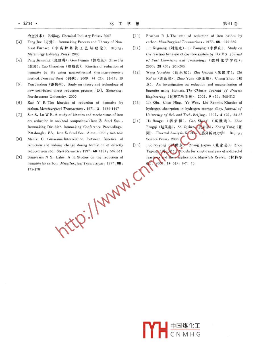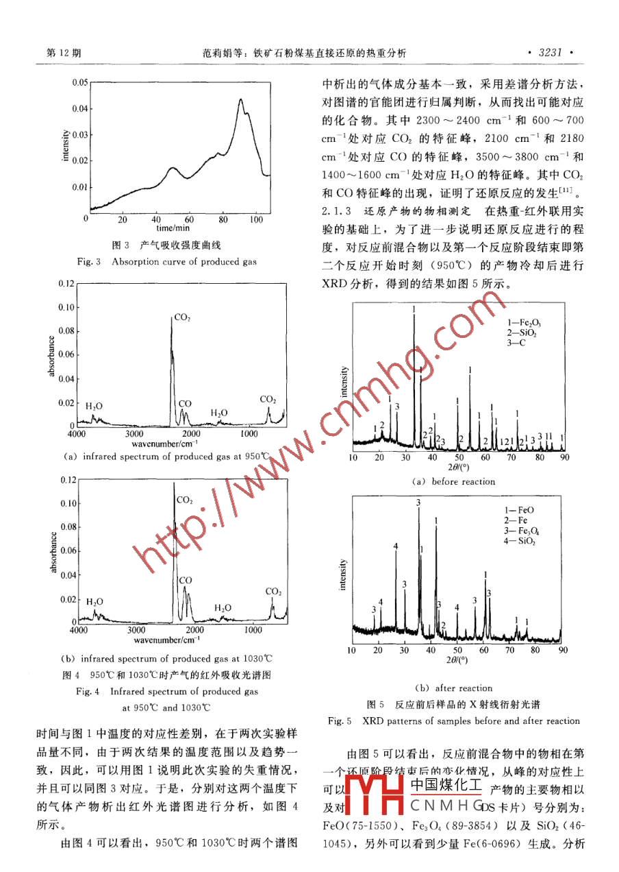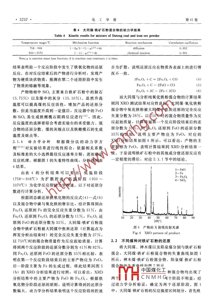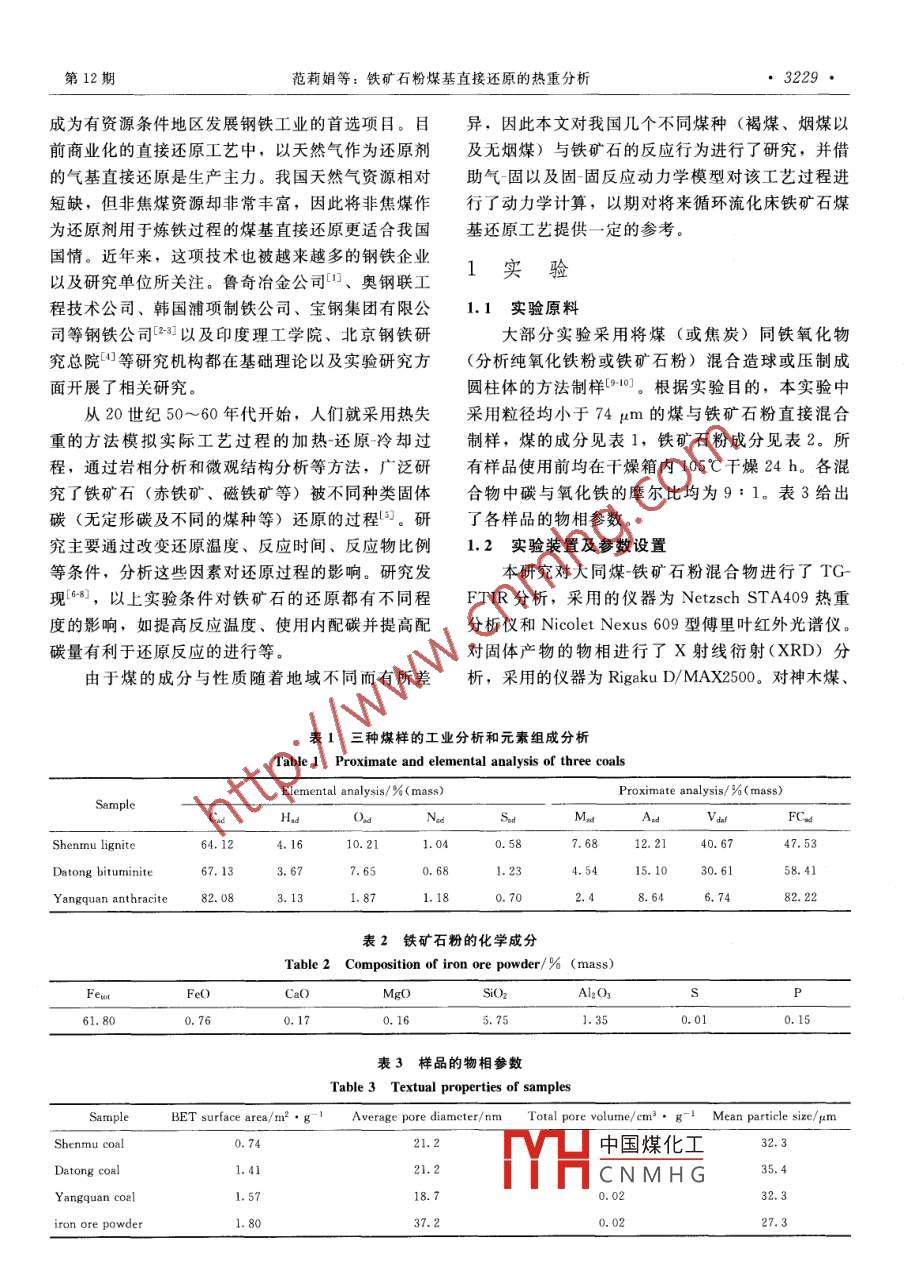 第61卷第12期化工學(xué)Vo.61No.122010年12月CIESC JournalDecember 2010∈∈eeee∈∈研究論文鐵礦石粉煤基直接還原的熱重分析范莉娟山2,呂清剛',那永潔(中國科學(xué)院工程熱物理研究所,北京100190;2中國科學(xué)院研究生院,北京100049)摘要:對(duì)大同煙煤-鐵礦石粉的混合物進(jìn)行了非等溫?zé)嶂丶t外聯(lián)用實(shí)驗(yàn)與分析,確定了鐵礦石粉發(fā)生還原反應(yīng)的溫度區(qū)間范圍,并結(jié)合還原產(chǎn)物的XRD圖譜以及熱重的定量計(jì)算結(jié)果,揭示了每個(gè)還原階段完成后產(chǎn)物的物相及相應(yīng)的還原分?jǐn)?shù)。為了比較,進(jìn)一步用熱重分析儀對(duì)大同煙煤、神木褐煤以及陽泉無煙煤與鐵礦石粉的混合物進(jìn)行了非等溫失重特性的對(duì)比實(shí)驗(yàn)研究。結(jié)果表明,低溫階段(800~950℃)煤對(duì)鐵礦石粉的還原性最好,而高溫階段(1000~1100℃)神木褐煤也表現(xiàn)出良好的還原性關(guān)鍵詞:鐵礦石粉;直接還原;煤中圖分類號(hào):TF559文獻(xiàn)標(biāo)識(shí)碼:A文章編號(hào):0438-1157(2010)12-3228-07Thermogravimetric analysis for direct reduction of iron ore powder by coalFAN Lijuan,, LU Qinggang, NA yongjieInstitute of Engineering Thermo ph ysics, Chinese Academy of Sciences, Beijing 100190, china;Graduate University of Chinese Academy of Sciences, Beijing 100049, China)Abstract: To determine the temperature range of iron ore reduction, the mixture of Datong bituminite andiron ore powder was reduced, and this process was measured by non-isothermal thermogravimetry. Gasproduct was analyzed by Fourier transfeorm intrad spectroscopy (TG-FTIR) and solid one by X-raydiffraction (XRD). The conversion, reduction fraction of iron ore and phase composition of solid productwere calculated quantitatively for each stage. For comparison, the reduction behavior of the iron ore witDatong bituminite, Shenmu lignite or Yangquan anthracite was further studied by the non-isothermal TGtechnique. The results showed that the mixture of the iron ore and the datong bituminite exhibited betterredox response at relatively low temperatures (800-950C) than the other two mixtures. At highertemperatures (1000--1100C), the sample of the iron ore and Shenmu lignite also showed goodreducibility.Key words iron ore powder; direct reduction; coal引言非高爐煉鐵技術(shù)逐漸興起,經(jīng)過數(shù)百年的發(fā)展,至今已經(jīng)形成了以直接還原和熔融還原為主體的現(xiàn)代高爐煉鐵作為煉鐵生產(chǎn)的主體,技術(shù)已經(jīng)非?;歉郀t煉鐵工業(yè)體系。其中,直接還原生產(chǎn)的海成熟,但它存在著對(duì)冶金焦的強(qiáng)烈依賴問題。為了綿鐵不僅是廢鋼的代用品,還是生產(chǎn)優(yōu)質(zhì)鋼、純凈降低煉鐵生產(chǎn)的成本,徹底擺脫對(duì)冶金焦的依賴,鋼不可缺少的原料,因此,直接還原煉鐵技術(shù)已經(jīng)TYH中國煤化工2010-03-03收到初稿,2010-06-23收到修改稿。CNMHG聯(lián)系人:呂清剛作者:范莉娟(1982-),女,博士研or: Prot. LU LInggang, glu ( mail. etp.ac, cn第12期范莉娟等:鐵礦石粉煤基直接還原的熱重分析成為有資源條件地區(qū)發(fā)展鋼鐵工業(yè)的首選項(xiàng)目。目異,因此本文對(duì)我國幾個(gè)不同煤種(褐煤、煙煤以前商業(yè)化的直接還原工藝中,以天然氣作為還原劑及無煙煤)與鐵礦石的反應(yīng)行為進(jìn)行了研究,并借的氣基直接還原是生產(chǎn)主力。我國天然氣資源相對(duì)助氣固以及固-固反應(yīng)動(dòng)力學(xué)模型對(duì)該工藝過程進(jìn)短缺,但非焦煤資源卻非常豐富,因此將非焦煤作行了動(dòng)力學(xué)計(jì)算,以期對(duì)將來循環(huán)流化床鐵礦石煤為還原劑用于煉鐵過程的煤基直接還原更適合我國基還原工藝提供一定的參考。國情。近年來,這項(xiàng)技術(shù)也被越來越多的鋼鐵企業(yè)以及研究單位所關(guān)注。魯奇冶金公司、奧鋼聯(lián)工1實(shí)驗(yàn)程技術(shù)公司、韓國浦項(xiàng)制鐵公司、寶鋼集團(tuán)有限公1.1實(shí)驗(yàn)原料司等鋼鐵公司3以及印度理工學(xué)院、北京鋼鐵研大部分實(shí)驗(yàn)采用將煤(或焦炭)同鐵氧化物究總院等研究機(jī)構(gòu)都在基礎(chǔ)理論以及實(shí)驗(yàn)研究方(分析純氧化鐵粉或鐵礦石粉)混合造球或壓制成面開展了相關(guān)研究。圓柱體的方法制樣10。根據(jù)實(shí)驗(yàn)?zāi)康?本實(shí)驗(yàn)中從20世紀(jì)50~60年代開始,人們就采用熱失采用粒徑均小于74gm的煤與鐵礦石粉直接混合重的方法模擬實(shí)際工藝過程的加熱還原冷卻過制樣,煤的成分見表1,鐵礦石粉成分見表2。所程,通過巖相分析和微觀結(jié)構(gòu)分析等方法,廣泛研有樣品使用前均在干燥箱內(nèi)105℃干燥24h。各混究了鐵礦石(赤鐵礦、磁鐵礦等)被不同種類固體合物中碳與氧化鐵的摩爾比均為9:1。表3給出碳(無定形碳及不同的煤種等)還原的過程。研了各樣品的物相參數(shù)究主要通過改變還原溫度、反應(yīng)時(shí)間、反應(yīng)物比例1.2實(shí)驗(yàn)裝置及參數(shù)設(shè)置等條件,分析這些因素對(duì)還原過程的影響。研究發(fā)本研究對(duì)大同煤-鐵礦石粉混合物進(jìn)行了TG現(xiàn)68),以上實(shí)驗(yàn)條件對(duì)鐵礦石的還原都有不同程FTIR分析,采用的儀器為 Netzsch STA409熱重度的影響,如提高反應(yīng)溫度、使用內(nèi)配碳并提高配分析儀和 Nicolet Nexus609型傅里葉紅外光譜儀。碳量有利于還原反應(yīng)的進(jìn)行等。對(duì)固