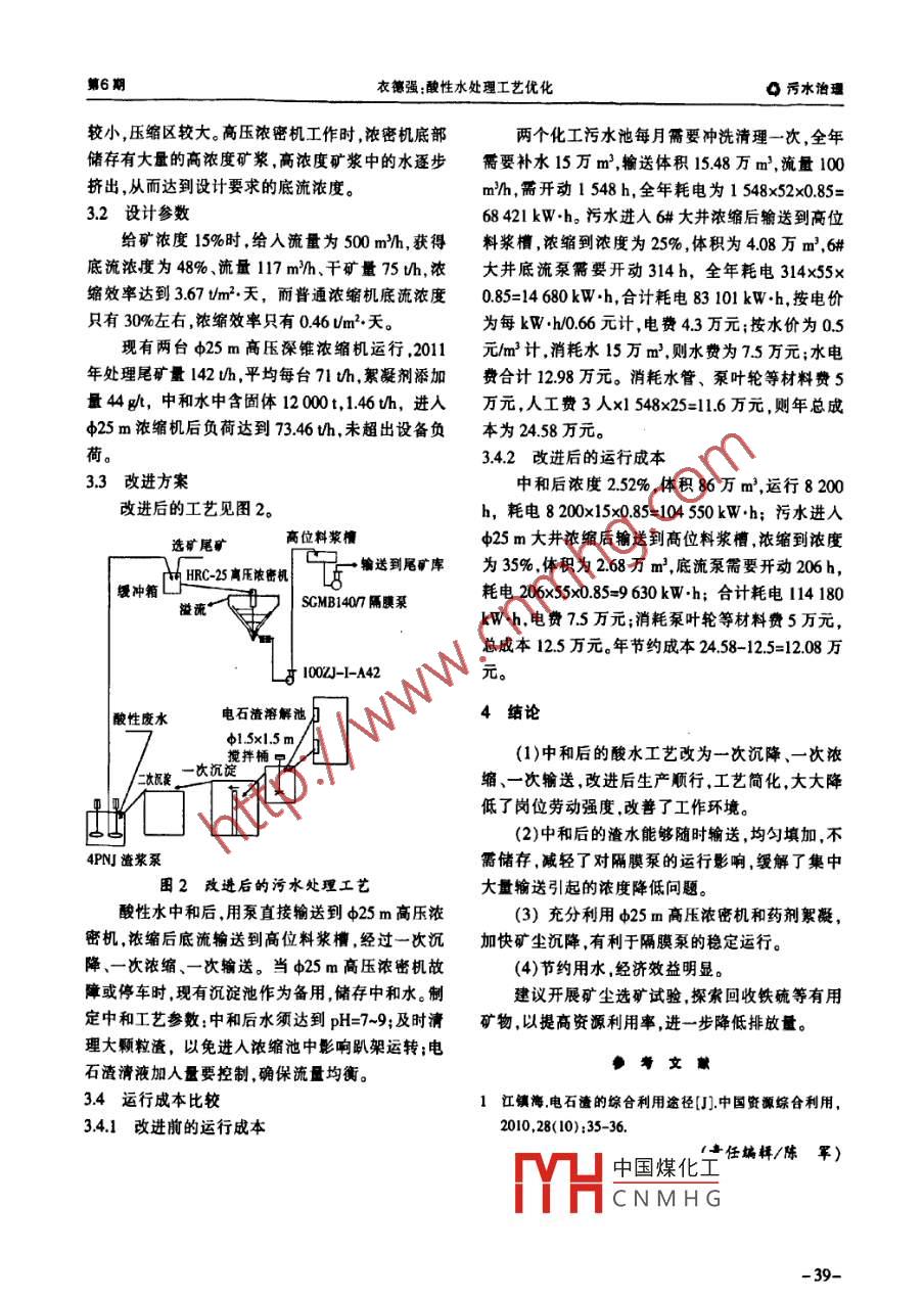 vo30,N0.6中國資源綜合利用2012年6月China Resources Comprehensive Utilization污水治理酸性水處理工藝優(yōu)化衣德強(qiáng)1,王勇2,劉興旺2(1.上洚梅山礦業(yè)有公司;2南京格靈化工有限公司,南京210041)攔要;針對梅山化工酸性水處理現(xiàn)狀,分析了存在的問題,開展了電石渣過濾試驗(yàn),提出了一次沉降、一次濃、一次輸通新工藝,并與選礦尾礦一起經(jīng)過中25m高壓濃縮。實(shí)滮蚰果表明:新工藝改善了環(huán)境簡化了工藝,生產(chǎn)順暢,產(chǎn)生了校好的經(jīng)濟(jì)效益。關(guān)鵪詞:駿性水;電石渣;高壓濃中圖分類號:X703.1文獻(xiàn)標(biāo)識碼:B文章編號:1008-9500(2012)060037-03The Process Optimization of Acid Water TreatmentYi Deqiang, Wang Yong, Liu Xingang?(1.Shanghai Meishan Mining Co, Ld; 2. Nanjing Geling Chemical Co, Ld, Nanjing 210041, China)Abstract: In allusion to the present situation of chemical acid water treatment in Meishan, the existing problemhas been analyzed, and the filtering experiment about carbide slag was made. The new technology was putforward which includes one sedimentation, one thickening and one transporting The acid water mixed withmineral separation tailings has been concentrated by the parameter 25 m high pressure thickener.Resultsshow that the invironment was improved, the process was simplified the production was unhindered, andgood economic benifits has been achieved by using the new techonologyKeywords: acid water; carbide slag: high pressure thickening目前,梅山鐵礦選礦生產(chǎn)的副產(chǎn)品硫精礦,供給梅山化工公司生產(chǎn)硫酸。硫精礦經(jīng)沸騰爐焙燒產(chǎn)1工藝現(xiàn)狀和存在問題生含SO2濃度為10.%溫度為890℃的爐氣經(jīng)廢11改進(jìn)前的工藝熱鍋爐降溫,進(jìn)人旋風(fēng)除塵器降塵,通過內(nèi)噴文氏改進(jìn)前的處理工藝見圖1。管泡沫塔、電除霧器進(jìn)行降溫除塵產(chǎn)生pH值為選礦尾礦4-5的酸性水。酸性水需要用堿中和到中性,才能6#d50大井高位料漿榔使用和排放。沸騰爐、廢熱鍋爐和兩級旋風(fēng)除塵除輸送到尾礦庫SCMB407隔膜泵下的礦粉中,鐵品位達(dá)到60%-64%,已經(jīng)作為鐵精電石渣溶解礦回收。目前兩套制酸系統(tǒng)產(chǎn)生的污水約632萬m3需要電石渣12萬1,配制濃度5%,消耗循環(huán)水1007J--A42φl×lm攪拌桶泵池酸性廢水一次沉淀228萬m3,中和后濃度252%,礦漿總量86萬m3。415x15m電石渣的主要成分是Ca(OH)2,還含有CaS、攪拌10080D-AHCaP2等雜質(zhì),其中CaS、CaP2、HS、HP、CH2為有害雜質(zhì)。電石渣有刺鼻的氣味顏色灰暗,其粒度澄清水NL125-18泥漿泵微細(xì),平均粒度1734微米,與酸水中和后粒度%時(shí)其形態(tài)顯厚狀存運(yùn),給傻相帶沉淀池循環(huán)利用65YUB-45-1000程泵來不便。中國煤化工理工藝CNMHG收稿日期:201203-30作者簡介:衣德強(qiáng)(1963-)男,山東爛臺(tái)人教授級高級工程師,主要從事選礦技術(shù)管理工作。c污水治理中國資源綜合利用第6期電石渣固體經(jīng)過加水溶解、一次攪拌、兩次沉向閥等故障,設(shè)備檢修成本增加。淀,清液與酸性水在φ15x15m攪拌桶中混合中125勞動(dòng)強(qiáng)度大和后,自流進(jìn)入沉淀池,上部澄清水流出作為循環(huán)清理池中渣泥需要用高壓水沖擊使其松散,作水使用。沉淀池堆滿后的沉積渣泥用流量160m、業(yè)時(shí)間長,現(xiàn)場有刺鼻難聞的異味和濺起的水塵功率5kW的浮筒泵輸送到泵池,再用流量14mh、霧,工作環(huán)境差。功率37kW的離心式渣漿泵,輸送到選礦廠6大2渣泥沉降過濾試驗(yàn)井濃縮,底流輸送到高位料槽和選礦尾礦混合,通過SGMB1407隔膜泵輸送到尾礦庫堆存。據(jù)測定,為了探索處理方案,科研人員開展了過濾和沉酸水中含礦塵965mg/m3。礦塵多元素及物相分析降實(shí)驗(yàn)。采用ZPG型盤式真空過濾機(jī),給礦濃度為見表1、表2。40%,在過濾周期為2mn時(shí),在濾布上形成約6-8衰1礦塵多元囊分析cm厚的濾餅層,由于濾餅的吸附性大,吸在濾布元素 TFe s P Ca0 Mgo AlO3sio上,不易卸凈。在真空度0.6MPa時(shí),濾餅水分含量31.6910.0906938991.891631.9354.16%,含水量大,成團(tuán)狀,不能滿足運(yùn)輸要求衰2礦塵鐵物相分析沉降試驗(yàn)表明,明礬、FeCl、CaCl2等無機(jī)絮凝劑沒有絮凝效果;分子量800萬的陰離子型聚丙烯FeCO2Fs2 FeSi,FeO3酰胺絮凝效果明顯。初始濃度為5%時(shí),不加藥時(shí)的48213沉降速度為56 mm/min、藥劑為52g時(shí)沉降速度由圖1、圖2可以看出,礦塵中主要含有鐵、為157 mm/min,速度提高18倍。溫度為6℃時(shí)需硫氧化鈣,品位分別為31.69%、109%、899%,物要15h壓縮,濃度可達(dá)到35%;溫度為28℃時(shí)需相分析表明鐵礦物主要是磁鐵礦,其次是菱鐵礦和要8h壓縮濃度可達(dá)到3%。赤鐵礦。綜合考慮污水不進(jìn)入6#普通濃縮機(jī),改為直12存在問題接進(jìn)入選礦廠現(xiàn)有的中25m高壓深錐濃縮機(jī),采用121工藝復(fù)雜,中間環(huán)節(jié)多加絮凝劑加快沉降的方式,可以提高沉降速度和輸中和后的污水需要兩個(gè)容積60m3的沉淀出濃度池輪流沉降。污水在沉淀池中自然沉降沖洗輸送3改進(jìn)方案進(jìn)入6#大井濃縮,再輸送到高位料漿槽。一般需要經(jīng)過兩次沉降、一次濃縮、兩次輸送。31可行性分析122輸送效率低因?yàn)閐50m普通濃縮機(jī)深度淺、占地面積大,由于礦漿粘稠清理難度大,采用浮筒泵漂在濃縮面積194m2,深度只有45m;而d25m高壓上表面需要連續(xù)補(bǔ)加大量高壓水,才能使渣泥松深錐