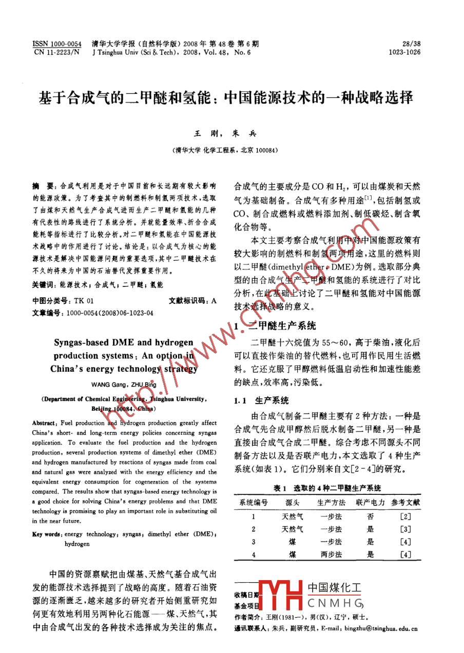 基于合成氣的二甲醚和氫能:中國(guó)能源技術(shù)的一種戰(zhàn)略選擇