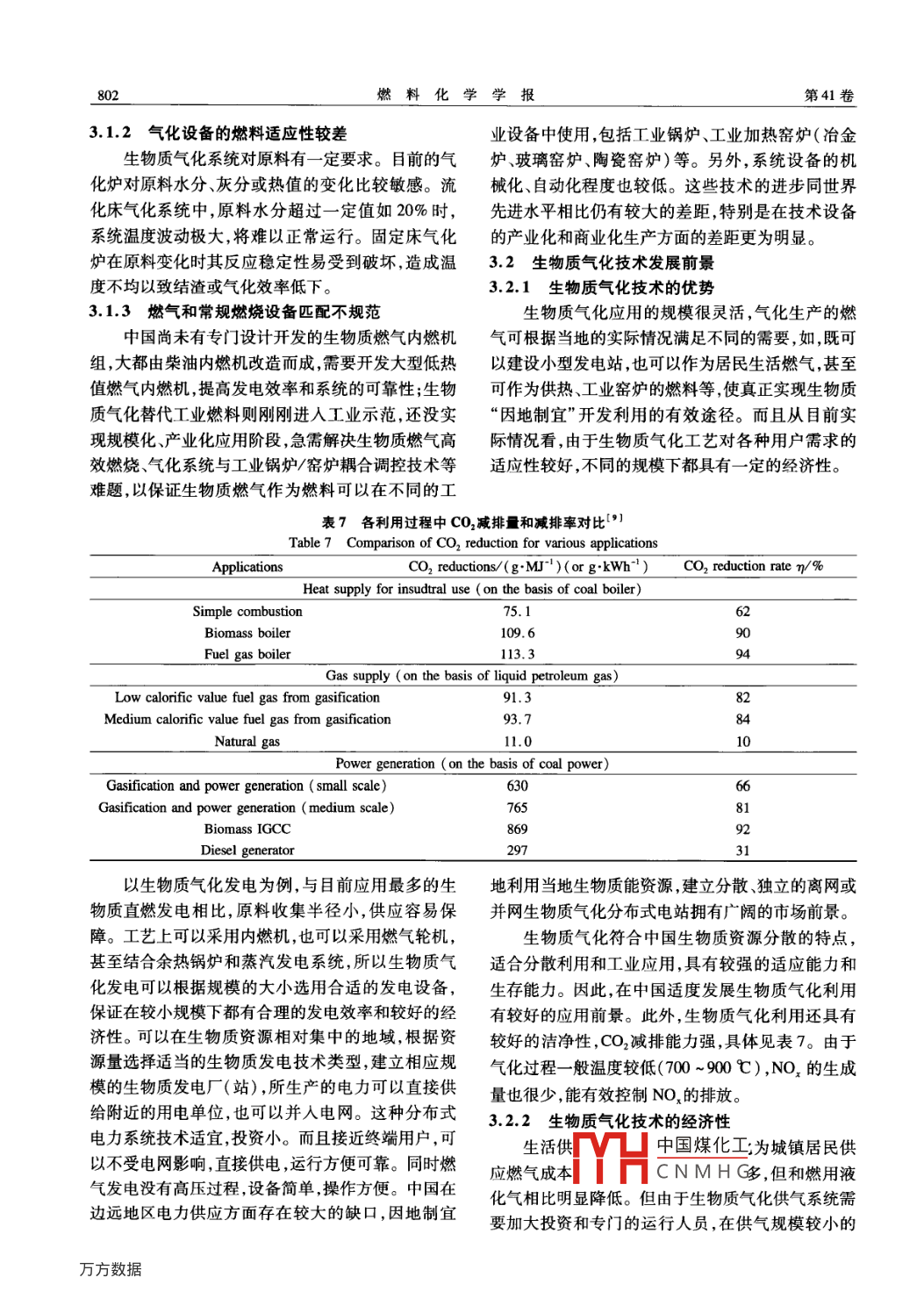 第41卷第7期燃料化學(xué)學(xué)報VoL 41 No2013年7月Journal of Fuel Chemistry and TechJu.2013文章編號:0253-2409(2013)07079807生物質(zhì)氣化技術(shù)發(fā)展分析吳創(chuàng)之,劉華財,陰秀麗(中國科學(xué)院廣州能源研究所中國科學(xué)院可再生能源重點試驗室,廣東廣州510640)摘要:生物質(zhì)氣化技術(shù)在世界范圍內(nèi)得到了廣泛應(yīng)用。研究綜述了生物質(zhì)氣化技術(shù)的發(fā)展現(xiàn)狀和應(yīng)用情況,闡明了生物質(zhì)氣化技術(shù)目前存在的主要問題;對中國生物質(zhì)氣化生活供氣和工業(yè)供氣典型項目的經(jīng)濟性進行了分析,在此基礎(chǔ)上對中國生物質(zhì)氣化技術(shù)應(yīng)用前景進行了展望;結(jié)合中國生物質(zhì)氣化產(chǎn)業(yè)發(fā)展面臨的新形勢,為生物質(zhì)氣化產(chǎn)業(yè)的發(fā)展提出建議。關(guān)鍵詞:生物質(zhì);氣化技術(shù);氣化應(yīng)用;現(xiàn)狀;前景中圖分類號:TK6文獻標識碼:AStatus and prospects for biomass gasificationWU Chuang-zhi, LIU Hua-cai, YiN Xiu-liKey Laboratory of Renewable Energy, Guangzhou Institute of Energy ConversionChinese Academy of Sciences, Guangzhou 510640, China)Abstract: Biomass gasification for energy utilization has been wildly used. The development and applications ofbiomass gasification technologies were reviewed in this paper. Special attention was paid to major problemsencountered in practical use. A comparison of economical performances of gas supply for livelihood and industrywas made. The prospects of biomass gasification in China were put forward. Taking into account the newsituation, several suggestions were given for the development of biomass gasification industryKey words: biomass; gasification; applications; status; prospects1國外生物質(zhì)氣化技術(shù)發(fā)展現(xiàn)狀技術(shù)都有了顯著的進展,建立了一批示范或商業(yè)工11技術(shù)現(xiàn)狀程,部分典型工藝和應(yīng)用見表1。經(jīng)過幾十年的發(fā)展,歐美等國的生物質(zhì)氣化技1.2應(yīng)用情況術(shù)取得了很大的成就。生物質(zhì)氣化設(shè)備規(guī)模較大,生物質(zhì)氣化目前主要應(yīng)用于供熱、窯爐、發(fā)電和自動化程度高,工藝較復(fù)雜,主要以供熱、發(fā)電和合合成燃料,具體見圖1。各種應(yīng)用的規(guī)模都在增長,成液體燃料為主,目前,開發(fā)了多系列已達到示范工CHP(熱電聯(lián)產(chǎn))的增長尤其快已成為目前最主要廠和商業(yè)應(yīng)用規(guī)模的氣化爐。生物質(zhì)氣化技術(shù)處于的利用方式。除了上述技術(shù),生物質(zhì)氣化還有其他領(lǐng)先世界水平的國家有瑞典丹麥、奧地利、德國、美新型利用,比如燃料電池等國和加拿大等。歐洲和美國在生物質(zhì)氣化發(fā)電和集從20世紀80年代起,生物質(zhì)氣化被美國、瑞典中供氣已部分實現(xiàn)了商業(yè)化應(yīng)用,形成了規(guī)?;a(chǎn)和芬蘭等國應(yīng)用于水泥窯和造紙業(yè)的石灰窯,既能業(yè)經(jīng)營。20世紀80年代末90年代初,主要利用上保證原料供給又能滿足行業(yè)需求,這種應(yīng)用方式簡吸式和下吸式固定床氣化爐來發(fā)電或供熱,規(guī)模大單可靠,具有較強的競爭力,但應(yīng)用卻不多都較小。由于下吸式產(chǎn)氣焦油含量較低,近來已逐20世紀90年代起,生物質(zhì)氣化開始被應(yīng)用于漸占據(jù)主導(dǎo)地位,尤其以發(fā)電為目的時,主要在中國熱電聯(lián)產(chǎn),多用柴油或燃氣內(nèi)燃機,對燃料品質(zhì)和系和印度使用。近年的大中型氣化發(fā)電系統(tǒng)多采用常統(tǒng)操作的要求較高,成本也較高,其應(yīng)用推廣受到限壓循環(huán)流化床,容易擴大,原料適應(yīng)性好,對原料尺制,常常需要政府的支持和補貼。受煤的IGCC應(yīng)寸和灰分要求不高??諝鈿饣S糜诎l(fā)電和供熱,用結(jié)果的推動,生物質(zhì)IGCC成為90年代的關(guān)注熱富氧氣化常用于氣化合成,加壓氣化則用于IGCC點,IGCC系統(tǒng)有望在中等成本和中等規(guī)模下提供整體氣化聯(lián)合循環(huán)發(fā)電系統(tǒng))、氣化合成燃料或化高發(fā)電效率,研究者對其進行了大量的研究并建設(shè)工品。在過去的二三十年里歐洲和北美的研究和了幾個示范程產(chǎn)嚴售中在程由于系統(tǒng)運行CNMHG收稿日期:201340609;修回日期:201306-24基金項目:國家科技支撐計劃(2012BAA09B03);國家自然科學(xué)基金(51176194)。聯(lián)系作者:陰秀麗,E-mail:xiyin@ms.giec.ac.cna第7期吳創(chuàng)之等:生物質(zhì)氣化技術(shù)發(fā)展分析799要求和成本都較高,大都已停止運行。表1國外典型氣化工藝和應(yīng)用介紹13Table 1 Typical foreign technologies and applications of biomass gasification說明固定床Bioneer(被 Foster上吸式,以空氣和水蒸氣為氣化介質(zhì),使用含水量達45%的原料,產(chǎn)氣焦油含量50~100g/m3;在芬Wheeler收購)蘭和瑞典建有9個4~6MW的商業(yè)化工程,大部分用于區(qū)域供熱;工廠全自動化操作,投入極少。Babcock& Wilcox上吸式,以濕空氣為氣化介質(zhì),使用含水量高達5%的原料;以位于 Harbour的5MWb商業(yè)工程為Volund典型,最初為鍋爐燃燒供熱,2000年被改造成熱電聯(lián)產(chǎn),發(fā)電效率28%,系統(tǒng)總效率93%。流化床2004年在丹麥 Skive建設(shè)100-150td規(guī)模的低壓(0.5×103-2×103Pa)BFB氣化系統(tǒng),采用石灰Carbona石床料和焦油催化裂解,利用3×2Mw帶余熱回收的燃氣內(nèi)燃機和2×10MWa燃氣鍋爐進行熱