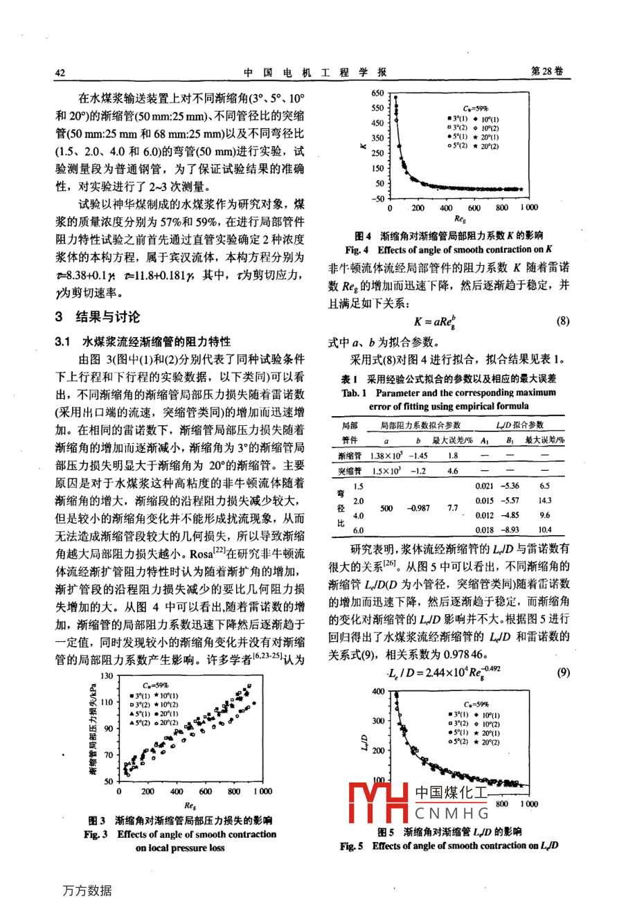 第28卷第26期中國電機工程學報Vol28No26Sep.15,2008008年9月15日@2008 Chin. Soc. for Elec En文章編號:02588013(2008)26004006中圖分類號:O373文獻標志碼:A學科分類號:47020水煤漿流經(jīng)局部管件阻力特性的研究劉猛,陳良勇,段鈺鋒(東南大學熱能工程研究所,江蘇省南京市210096)Research on Resistance Characteristic of Coal-water SlurryFlowing Through the Local FittingsLIU Meng, CHEN Liang-yong, DUAN Yu-feng(Institute of Thermal Power Engineering, Southeast University, NanJing 210096, Jiangsu Province, China)ABSTRACTe The local resistance characteristics of coal-water迅速下降然后逐漸趨于穩(wěn)定,而漸縮管當量長度與管徑的比sumy(cws) nowing through three types of local fittings,值L/D逐漸下降然后趨于穩(wěn)定:突縮管的LD先下降再增namely. the gradual contraction, sudden contraction and90°加,對于彎管的LD則成線性增加horizontal bend, were investigated at a comprehensive關(guān)鍵詞:水煤漿;漸縮管:突縮管:彎管meters such as contract degree, diameter ratio and bend0引言diameter ratio on the local resistance loss of local fittings was水煤漿是一種典型的液固兩相非牛頓流體,也measured. The results show that the local friction loss of是一種很有發(fā)展?jié)摿Φ男滦腿剂?。月前水煤漿的技gradual contraction decreases as the contract degree increases術(shù)研究主要集中在制漿、霧化燃燒、流變特性、觸When the pipe diameter ratio varies a little, the local resistance變性、穩(wěn)定性等方面,但在管道輸送方面尚有許ges insignificantly. There isoptimal value of bend diameter ratio, where the local resistance多問題需要解決,如管道泵的特性,管道阻力的預loss of horizontal bend is least. As Reynolds number increases,測,管道局部裝置流動阻力的計算等等,特別對局the friction loss coefficients of three fittings decline fast at first,部管件中的流動研究甚少,而國外一些學者1對and then gradually tend to be constant values, while the three非牛頓流體流經(jīng)突擴、突縮、彎管、閥門等局部管pipes have different ratio of equivalent length to pipe diameter件的阻力特性做了許多研究,并且提出了一些經(jīng)驗Ld behaviors that is L/d of the gradual contraction decreases公式。但是針對水煤漿這種高粘度(工業(yè)運用要求剪切速率為100s1時表觀粘度低于1200mPa)的非reduces at first and then increases. and that of the horizontal牛頓流體流經(jīng)局部管件阻力特性的研究并不多見,bend increases linearly所以開展水煤漿流經(jīng)局部管件阻力特性的研究對KEY WORDS: coal-water slurry: gradual contraction; sudden水煤漿管道輸送的工業(yè)應用和設(shè)計有重要意義contraction: bend為了擴大氣化爐的單爐容量,H前國內(nèi)外較多摘要:在水煤漿綜合輸送試驗臺研究了水煤漿流經(jīng)漸縮地采用多噴嘴對置工藝,但是在多噴嘴對置撞擊流管、突縮管以及90°水平彎管的局部阻力特性,分析了漸縮中存在著一個很重要的現(xiàn)象就是撞擊面的偏移現(xiàn)角、管徑比以及彎徑比對上述局部管件阻力損失的影響結(jié)象。許多學者1214在研究兩噴嘴對置撞擊流時都發(fā)表明,增加漸縮角使得漸縮管的局部阻力損失減少;較小現(xiàn)了撞擊面與軸線的幾何中心不重合,而撞擊面的的管徑比變化對突縮管的局部阻力損失沒有較大影響:存在個最佳彎徑比,使得水平彎管的局部阻力損失最小。隨著偏移對多噴嘴氣化爐的燃燒效率以及維修等都造雷諾數(shù)的增加,漸縮管、突縮管以及水平彎管的阻力系數(shù)先成了不利的影響S。許建良等人通過實驗證實了中國煤化工嘴對置撞擊面發(fā)生基金項目:國家重點基礎(chǔ)研究發(fā)展計劃項目(93項目200C0較CNMHG相等的一個重要原217701)因就是漿體在流經(jīng)噴嘴乙麗的管道時阻力損失不The National Basic Research Program of China (973 Program2004CB217701)均衡,使得噴嘴的動量不相等,從而導致了在撞擊第26期劉猛等:水煤漿流經(jīng)局部管件阻力特性的研究面上沖量的不平衡,但是月前國內(nèi)外對煤漿流經(jīng)式中:O為彎管所對應的角度:R為彎管的彎曲半各種局部管件阻力損失均衡的研究還不多見。本文徑;D為圓管直徑。對于彎管阻力系數(shù)采用了Ks,詳細研究了水煤漿流經(jīng)漸縮管、突縮管和彎管的局則由式(3)和(4可得下式612部阻力損失,同時探討了局部管件與直管之間阻力Keel=k-ne損失均衡的規(guī)律。1理論分析Chasin18、 boger19、 Spedding22等人采用與局部管件阻力損失相等的管徑為D、長度為L的直如圖1所示,水煤漿流經(jīng)局部管件的壓力損失管沿程阻力損失來研究非牛頓流體流經(jīng)局部管件△Pua主要包括3個部分:的阻力特性,把局部管件阻力損失與直管阻力損失P()相聯(lián)系。據(jù)L的定義和式(2),通過下式可得到L式中:△P為局部管件對上游流動造成的損失△Pha為流體流經(jīng)局部管件段所產(chǎn)生的損失,包括了與局部管件實際長度相等的沿程阻力損失APsTurian認為局部管件的L不僅與管件的幾何以及管件自身所產(chǎn)生的幾何損失△Po:APn為局尺寸和雷諾數(shù)有關(guān),還和漿體的流變特性以及管道部管件對下游流動造成的損失。通過下式可以得到的粗糙度有關(guān):L /D=K/(4f)式中∫為范寧摩擦系數(shù),戶=16RegP1=AP-△P-AP,=△P2試驗系統(tǒng)以及方法22對本所原有的水煤漿輸送裝置進行改造,如圖式中:△P;和△P2分別為局部管件前后穩(wěn)定段的沿2所示,水煤漿輸送測量裝置主要包括攪拌裝置、程阻力損失:L1和L2