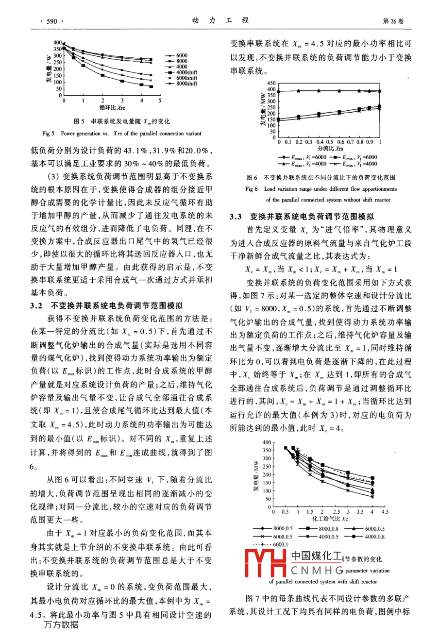 第26卷第4期動(dòng)力工程Vol, 26 No 406年8月Journal of Power Engineering文章編號(hào):10006761(2006)04-587-0甲醇/電多聯(lián)產(chǎn)系統(tǒng)變工況特性的研究劉培,高健,李政(清華大學(xué)熱能工程系,北京100084)摘要:利用 Aspen Plus仿真工具和甲醇/電多聯(lián)產(chǎn)系統(tǒng)的變工況數(shù)學(xué)模型,對(duì)串聯(lián)或并聯(lián)、以及有否變換單元的4種多聯(lián)產(chǎn)系統(tǒng)配置方案進(jìn)行了模擬計(jì)算,詳細(xì)比較了它們的電負(fù)荷調(diào)節(jié)范圍。分析結(jié)果表明:4種系統(tǒng)調(diào)節(jié)能力由強(qiáng)到弱依次為:變換并聯(lián)系統(tǒng)、變換串聯(lián)系統(tǒng)、不變換并聯(lián)系統(tǒng)和不變換串聯(lián)系統(tǒng)。相關(guān)分析方法和結(jié)論為多聯(lián)產(chǎn)系統(tǒng)設(shè)計(jì)提供了參考。圖7參5關(guān)鍵詞:能源工程;多聯(lián)產(chǎn);變工況;負(fù)荷調(diào)節(jié)中圖分類號(hào):TK01,TQ21文獻(xiàn)標(biāo)識(shí)碼:APerformance Alteration of Methanol/ Electricity PolygenerationSystems for Various modes of OperationLIU Pei, GA0 Jian, LI ZhengDepartment of Thermal Engineering, Tsinghua University, Beijing 100084, China)Abstract: Making use of Aspan Plus simulation tools and a mathematical model for operation mode changes of methanolelectricity polygeneration systems, simulation calculation of four different variants of system configurations, includingseries and parallel connections, as well as changes of elements have been calculated and their electric output variationcapabilities compared in detail. The sequence of the four configuration variants in terms of diminishing order of regulationcapability are in succession: the parallel connection variant with shift reactor, the series connection variant with shiftreactor,the parallel connection variant without shift reactor, and the series connection variant without shift reactor. Figsand refs 5Keywords: cenergy engineering polygeneration; off design operation; output regulation1研究目的優(yōu)越的環(huán)保性能,以聯(lián)產(chǎn)運(yùn)輸采用液體燃料以緩解石油安全需要,及未來(lái)可采取較方便和以較小的成在新世紀(jì),我國(guó)能源面臨著資源短缺,液體燃料本減排溫室氣體等特性,成為我國(guó)煤炭現(xiàn)代化利用嚴(yán)重依賴進(jìn)口,環(huán)境污染加劇,溫室氣體排放量大而的重要途徑之且增長(zhǎng)迅速,農(nóng)村和小城鎮(zhèn)需要方便和潔凈能源等多聯(lián)產(chǎn)系統(tǒng)的概念實(shí)質(zhì)上是要把化工過(guò)程和發(fā)諸多挑戰(zhàn)。煤炭作為我國(guó)主要使用的一次能源,急電過(guò)程有機(jī)地耦合在一起,力爭(zhēng)實(shí)現(xiàn)能量利用、經(jīng)濟(jì)需在利用形式上和利用過(guò)程方面加以創(chuàng)新,以應(yīng)對(duì)性和環(huán)保性能的最優(yōu)化。盡管由于多聯(lián)產(chǎn)涉及到的這些挑戰(zhàn)。以煤氣化為核心的多聯(lián)產(chǎn)系統(tǒng)由于具備主V凵中國(guó)煤化工成(如甲醇)和燃輪CNMHG此具有相當(dāng)?shù)目尚惺崭迦掌?2005-1205性,但是要把其發(fā)展為一個(gè)完整的經(jīng)濟(jì)上具有競(jìng)爭(zhēng)基金項(xiàng)目:國(guó)家自然科學(xué)基金重大研究計(jì)劃項(xiàng)目(90210032)及國(guó)家重點(diǎn)基礎(chǔ)研究發(fā)展計(jì)劃項(xiàng)目(2005cB221207)資助。力的實(shí)用技術(shù),依然存在較大的挑戰(zhàn)。這個(gè)挑戰(zhàn)除作者簡(jiǎn)介:劉培(90),男,碩士生,主要從事多聯(lián)產(chǎn)系統(tǒng)研了體現(xiàn)在已有成熟技術(shù)為適應(yīng)多聯(lián)產(chǎn)系統(tǒng)的特殊需方方數(shù)據(jù)要尚需改變和改進(jìn)外,更重要的則體現(xiàn)在系統(tǒng)集成動(dòng)力第26卷層次上,即:如何設(shè)計(jì)系統(tǒng)結(jié)構(gòu),功能和參數(shù),使其不環(huán)回路。定義X。為循環(huán)比,其物理意義為循環(huán)回反僅具有較高的設(shè)計(jì)效率,而且滿足各種變工況運(yùn)行應(yīng)器入口的合成尾氣與反應(yīng)器入口新鮮氣的比值。和操作要求(可操作性)以及在此條件下的可靠性、系統(tǒng)運(yùn)行的一個(gè)特例是合成尾氣完全不循環(huán)、而是可用性和可維護(hù)性要求,使得系統(tǒng)在整個(gè)生命周期全部送往發(fā)電系統(tǒng),本文稱其為合成氣“一次通過(guò)”具備最大的經(jīng)濟(jì)性。為此,本文將多聯(lián)產(chǎn)系統(tǒng)層次方式,此時(shí)Xn=0研究的內(nèi)涵歸納為:在滿足可操作性以及可靠性、可圖2和圖3中用虛線標(biāo)出了變換單元,表示這用性和可維護(hù)性等技術(shù)要求條件下,實(shí)現(xiàn)能源、環(huán)境是一個(gè)可選單元,通過(guò)選擇確定是否設(shè)置合成氣變和生態(tài)以及經(jīng)濟(jì)性的多目標(biāo)最優(yōu)化問(wèn)題(圖1)。換系統(tǒng)。本文研究的系統(tǒng)方案可分為:不變換串聯(lián)操作性可靠性系統(tǒng),變換串聯(lián)系統(tǒng),不變換并聯(lián)系統(tǒng)和變換并聯(lián)系滿足產(chǎn)品生產(chǎn)可用性同可維護(hù)性滿足多目標(biāo)要統(tǒng),分別以方案1-4標(biāo)識(shí)要求的多聯(lián)產(chǎn)的優(yōu)化設(shè)計(jì)方案系統(tǒng)初步設(shè)計(jì)煤氣化系統(tǒng)的集成度一般定義為燃?xì)廨啓C(jī)壓氣方案能經(jīng)環(huán)其他技術(shù)約源|濟(jì)境機(jī)提供的空氣量占空分系統(tǒng)總進(jìn)氣量的比例。由于集成度不是本文討論的