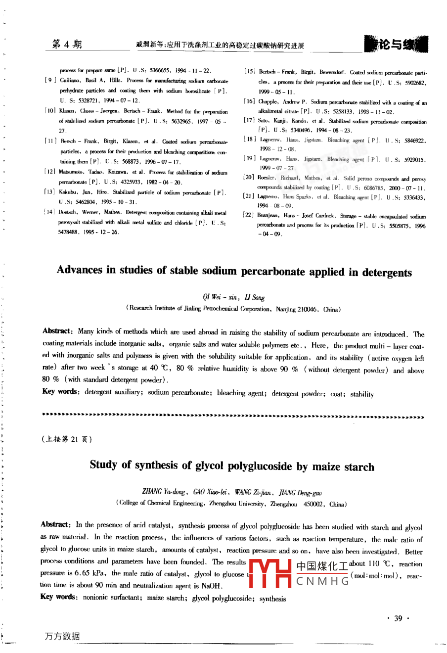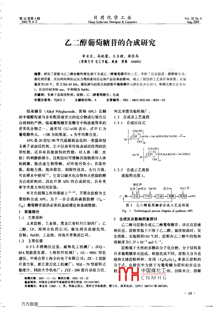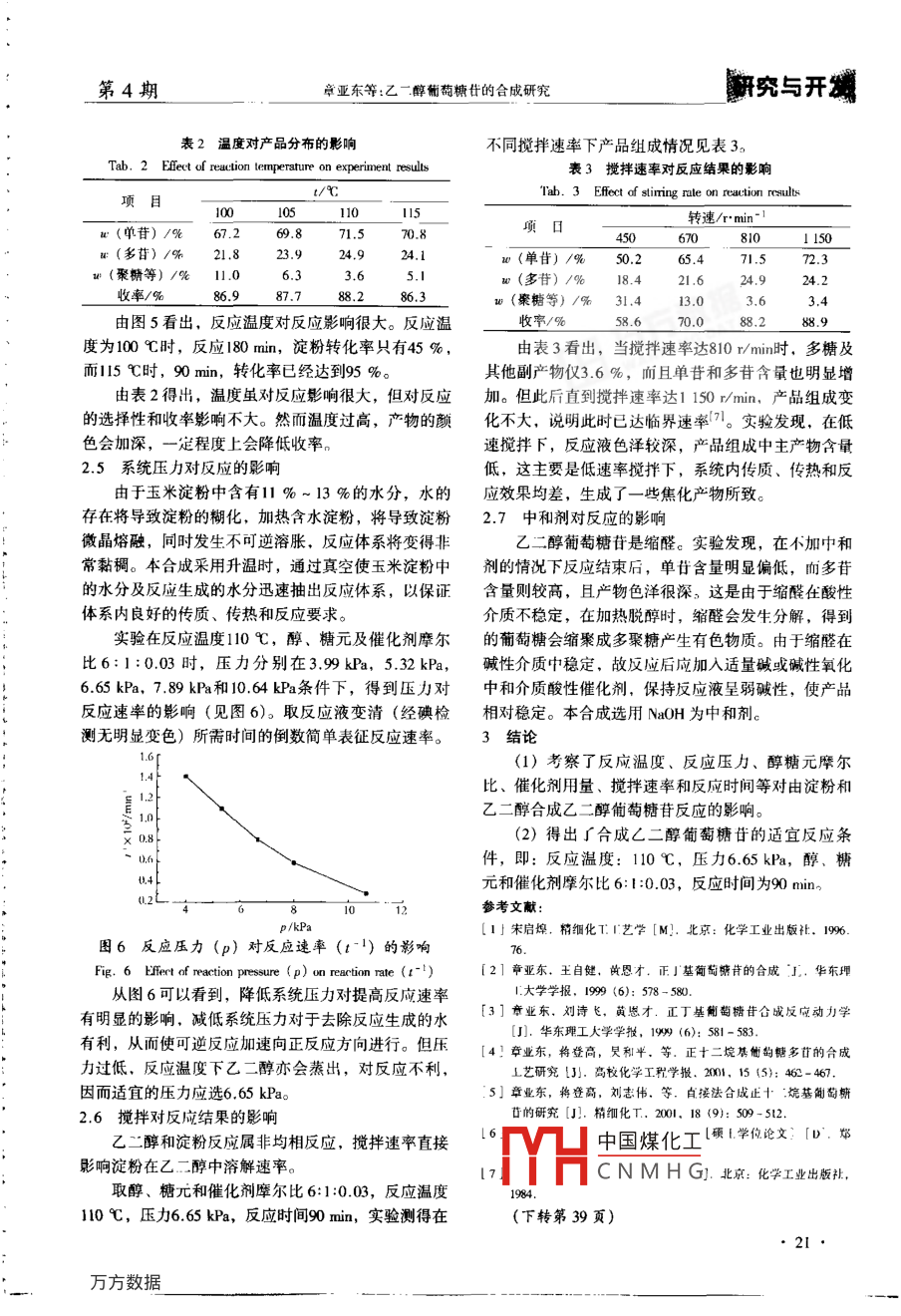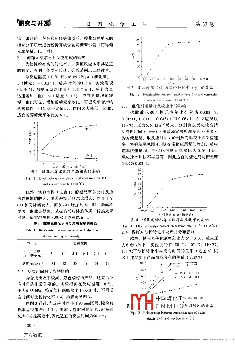 第32卷第4期日用化學(xué)工業(yè)Vol 32 No. 4China Surfactant Detergent Cosmetics乙二醇葡萄糖苷的合成研究章亞東,高曉蕾,王自健,蔣登高鄭州大學(xué)化工學(xué)院,河南鄭州45002)摘妾:研究了淀粉與乙二醇在酸性催化劑下合成乙二醇髓萄糖苷的工藝,考察了反應(yīng)溫度、糖醇摩爾比催化劑用量,反應(yīng)時(shí)問和反應(yīng)壓力等因素對反應(yīng)和產(chǎn)品結(jié)果的影響,確立了較佳的工藝條件和參數(shù):反應(yīng)溫度為110℃,壓力為665kP,催化劑與經(jīng)折合的淀粉中葡萄糖單元摩爾比為003:1,醇糖元摩爾比為6:1,反應(yīng)時(shí)間為90min,中和劑為NaOH關(guān)詞:非離子表面活性劑;淀粉;乙二醇葡萄糖苷;合成中圖分類號:TQ423.2文獻(xiàn)標(biāo)識碼:A文章編號:1001-1803(2002)04-0019-03烷基糖苷( Alkyl Polyglucoside,簡稱APG)是糖河北承德實(shí)驗(yàn)機(jī)械廠。的半縮醛羥基與含有配質(zhì)或苷元的化合物進(jìn)行縮合反1.3合成及工藝流程應(yīng)得到的產(chǎn)物。烷基葡萄糖苷是糖苷中構(gòu)造最簡單的1.3.1合成反應(yīng)式苷類化合物之一,通常用(G)nOR表示,式中G為葡萄糖單元,-OR為烷氧基,n為平均聚合度。)H +(m/n)HOCH CHAPG是20世紀(jì)90年代最新商品化的一類溫和型非離子表面活性劑,它不僅具有傳統(tǒng)表面活性劑的優(yōu)異性能,還具有其他獨(dú)特的性能:對人體(眼、皮CHCHOH +(m/n)H(膚)的刺激極微小,且配伍時(shí)可緩解其他物質(zhì)對人體的刺激,能迅速生物降解,對環(huán)境污染小;其毒性低,起泡力強(qiáng),泡沫穩(wěn)定,潤濕性優(yōu)良,去污力強(qiáng),1.3.2合成工藝流程可在硬水中使用。它是以碳水化合物和天然脂肪醇流程圖見圖1。為合成原料的。因此開展APG的合成研究,具有重要學(xué)術(shù)意義和應(yīng)用價(jià)值。催化劑淀份廣真空NaOH真本文在前期工作的基礎(chǔ)上2-6,開展由淀粉為主要原料合成APG,為下一步合成高碳脂肪醇(Cs乙,一h一份圓-[k-hrC5)葡萄糖苷提供必要的基礎(chǔ)理論和基礎(chǔ)數(shù)據(jù)。圖1乙二醇葡萄糖苷合成工藝流程圖實(shí)驗(yàn)部分Fig. 1 Technological process diagram of synthesis APG1.1主要原料玉米淀粉,工業(yè)級,黑龍江省牡丹江制藥廠;乙2合成反應(yīng)影響因素探討乙二醇與淀粉合成乙二醇葡萄糖苷,該反應(yīng)是液二醇,CP,鄭州市醫(yī)藥公司;催化劑及助催化劑,相反應(yīng)。淀粉常溫下不溶于乙二醇,溫度較高時(shí),發(fā)自制;NaOH,工業(yè)級,河南開普集團(tuán)公司。生溶脹,實(shí)驗(yàn)測得110℃時(shí),淀粉在乙二醇中的飽和12主要儀器溶解度為3.37×10-5molL0.5L不銹鋼反應(yīng)釜,威?;C(jī)械廠;ZG淀粉屬于天然的多糖高分子化合物,分子結(jié)構(gòu)是85A型旋蒸發(fā)器,上海醫(yī)療機(jī)械廠;GC-9C型色許多葡萄糖單元組成。根據(jù)組成不同,淀粉又分為直譜儀,中美合資上海全向電子有限公司;Ⅸ-2型旋鏈和支鏈淀粉兩種,常用(CHO3)m來表示淀粉的片真空泵,浙江黃巖化工機(jī)被廠;ND-79型旋轉(zhuǎn)式分子式。在研究中為便于與葡萄糖為原料的反應(yīng)比黏度計(jì),同濟(jì)大學(xué)機(jī)電廠;YZ-200型自動張力儀,較中國煤化工析,扣除水分、溶解收稿日期:201-1-15;修回日期:200-03-25CNMHG基金項(xiàng)目:河南省自然科學(xué)基礎(chǔ)研究項(xiàng)目資助(作者簡介:章亞東(1965-),男,河南正陽人,鄭州大學(xué)刪教授,博士生,聯(lián)系電話:(071)389317或3887303解究與開譽(yù)日用化學(xué)工業(yè)第32卷物、蛋白質(zhì)、灰分和油脂等物質(zhì)后,按葡萄糖單元的相對分子質(zhì)量把淀粉折算成含葡萄糖摩爾量(簡稱糖元摩爾量,以下同)。2.1醇糖元摩爾比對反應(yīng)組成的影響為使淀粉有高的轉(zhuǎn)化率,并保證反應(yīng)體系具適宜的黏度,有利于傳質(zhì)和傳熱,合成采用乙二醇過量。取反應(yīng)溫度110℃,壓力6.65kPa,n(催化劑)n(糖元)=0.03:1,反應(yīng)時(shí)間為1.5h,實(shí)驗(yàn)發(fā)現(xiàn)見圖2),醇糖元摩爾比由3:1增至6:1,單苷含量圖3反應(yīng)時(shí)間(1)與淀粉轉(zhuǎn)化率(n)的關(guān)系迅速增加,但由6:1增至8:1時(shí)、單苷含量增加緩Fig.3 Relationship between reaction time()and conversion慢。由此可見,增加醇糖元摩爾比,可提高單苷產(chǎn)物rate of maize starch(110%.)的選擇性,但到達(dá)一定值后,作用大大降低。因此23催化劑用量對反應(yīng)速率的影響適宜的醇糖元摩爾比為6:1選取催化劑與糖元摩爾比分別為0.005:1,0.015:1,0.03:1,0,.045:1和0.06:1,在反應(yīng)溫度110℃,壓力6.65kPa下反應(yīng),分別測定反應(yīng)液變清所消耗時(shí)間t(min)(用碘滴定法檢測變色不明顯)為方便起見,取反應(yīng)時(shí)間t的倒數(shù)簡單表征該反應(yīng)速率,實(shí)驗(yàn)結(jié)果見圖4。隨著催化劑用量的增加,反應(yīng)速率快速增加、當(dāng)催化劑糖元摩爾比達(dá)0.03:1后,反應(yīng)速率加快不冉顯著,因此適宜的催化劑與糖元摩爾比為0.03:1。乙醅):n(糖單兒圖2醇糖元摩爾比對產(chǎn)品組成的影響ig. 2 FIect nMole ratin of glycol to glucose units on AP,products components(110 C)此外,實(shí)驗(yàn)測得(見表1)醇糖元摩爾比對反應(yīng)液黏度影響較大,隨著醇糖元摩爾比增大,由3:1至076:1黏度降幅較大,而從6:1增加到8:1時(shí),降幅不05L顯著,由此亦得到,從提高反應(yīng)體系傳質(zhì)、傳熱效果00.010020030405000出發(fā),適宜的醇糖元摩爾比亦可選6:1。n(化劑):n(糖單元)圖4