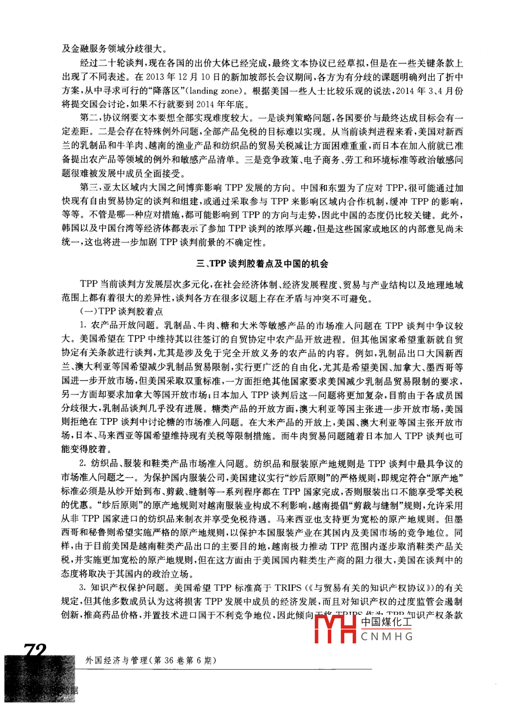第36卷第6期外國經(jīng)濟(jì)與管理Vol 36 No 62014年6月Foreign Economics ManagementJun 2014TPP對中國的挑戰(zhàn)及中國的選擇金中夏袁佳張薇薇(中國人民銀行金融研究所,北京100033)摘要:美國主導(dǎo)的TPP等談判試圖在服務(wù)貿(mào)易和投資開放等領(lǐng)域重建全球貿(mào)易規(guī)則。本文認(rèn)為,TPP談判將是一個長期、持續(xù)的艱苦過程。由于各成員的發(fā)展水平和對外開放水平差異較大,在多個議題上存在嚴(yán)重分歧,最終達(dá)成的協(xié)議會有大量妥協(xié)折中的條款。對中國而言,不加入TPP談判可能面臨國際政治經(jīng)濟(jì)環(huán)境惡化、被排除在規(guī)則制定之外等不利影響。從長遠(yuǎn)看,TPP倡導(dǎo)的多數(shù)原則和標(biāo)準(zhǔn)與我國進(jìn)一步改革開放、打造中國經(jīng)濟(jì)升級版的發(fā)展方向一致。因此,我國應(yīng)采取多管齊下的策略,主動要求參加TPP談判,并加快以我為主導(dǎo)的自貿(mào)區(qū)建設(shè),同時針對國內(nèi)薄弱環(huán)節(jié)加快改革開放步伐關(guān)鍵詞:貿(mào)易投資規(guī)則;跨太平洋伙伴關(guān)系協(xié)議;自貿(mào)區(qū)中圖分類號:F744文獻(xiàn)標(biāo)識碼:A文章編號:1001-4950(2014)06-0070-11“++m…“++++““+“+++“+““+“++“+“+““+“++“““““““十““中““““十十“、引言近年來,由于WTO多哈回合談判久拖不決,各國紛紛選擇通過雙邊和區(qū)域自由貿(mào)易談判等形式來促進(jìn)相互間的貿(mào)易與投資。其中,亞洲地區(qū)的主要經(jīng)貿(mào)框架安排就有中日韓自貿(mào)區(qū)、東盟“10+1”東盟10十3”以及區(qū)域全面伙伴關(guān)系協(xié)定(RCEP)等,亞洲經(jīng)濟(jì)一體化進(jìn)程呈不斷加快趨勢。與此同時,美國也在多管齊下地推進(jìn)有其自身參與的自貿(mào)區(qū),在全球范圍內(nèi)相繼推出了跨太平洋伙伴關(guān)系協(xié)議(TPP)、跨大西洋貿(mào)易與投資伙伴協(xié)議(TTIP)和服務(wù)貿(mào)易協(xié)定(TISA)談判。從整體來看,TPP、TTIP和TISA談判以其全領(lǐng)域、高標(biāo)準(zhǔn)等特點而廣受關(guān)注,成為美國構(gòu)建全球貿(mào)易新規(guī)則的“三大支柱”,其核心目標(biāo)就是實現(xiàn)全面的貿(mào)易自由化,尤其是包括金融領(lǐng)域在內(nèi)的服務(wù)貿(mào)易自由化。特別是TPP談判,美國不僅希望能利用它樹立全球貿(mào)易新標(biāo)準(zhǔn),打造“21世紀(jì)自由貿(mào)易協(xié)定范本”,部分美國人甚至想通過TPP重組國際貿(mào)易秩序①,把中國排除在外,使之成為美國“重返亞太”戰(zhàn)略的重要支柱。二、TPP談判進(jìn)展(一)成員擴(kuò)張,TPP影響力提升TPP的前身是太平洋戰(zhàn)略經(jīng)濟(jì)伙伴關(guān)系協(xié)議(也稱為P4協(xié)議),最初由新加坡、智利、文萊和新西收稿日期:2014-0222作者簡介:金中夏(1963-)男,中國人民銀行金融研究所所長;袁佳(1984—),男,中國人民銀行金融研究所博士后;張薇薇(1981-),女,中國人民銀行金融研究所博士。①在2013年11月13日由北京大學(xué)國家發(fā)展研究院舉辦的會議中,美國布蘭戴斯大學(xué) Peter A. Petri教授就認(rèn)為,盡管從CGE模型預(yù)測來看美國加入TPP的收益并不太高,但對美國而言最重要的就是利用TPPH中國煤化工CNMHG外國經(jīng)濟(jì)與管理(第36卷第6期)蘭四國于2005年6月發(fā)起成立。2008年初,美國開始與P4成員進(jìn)行前期協(xié)商,P4協(xié)議轉(zhuǎn)而被稱為TPP( trans-Pacific strategic economic partnership agreement)。2009年11月美國正式宣布加入TPP,澳大利亞、秘魯、越南緊隨美國之后加入,2010年10月馬來西亞加入。在2012年12月的TPP第15輪談判會議上,加拿大和墨西哥首次參與協(xié)商。2013年7月日本正式宣布加入TPP談判,這使得TPP在全球經(jīng)濟(jì)金融中的影響力進(jìn)一步增強。日本加入談判后,TPP成員的GDP總和約為27萬億美元,占全球GDP總量的近40%,貨物貿(mào)易占全球總量的1/3左右。(二)談判協(xié)議綱要文件的主要內(nèi)容和特征美國加入TPP后主導(dǎo)了TPP談判,并在不少章節(jié)上提出了新的方案。2011年11月,美國總統(tǒng)奧巴馬在APEC工商領(lǐng)導(dǎo)人峰會上表示,已經(jīng)與相關(guān)國家就TPP談判協(xié)議綱要文件達(dá)成一致;美國貿(mào)易代表辦公室隨后公布了TPP綱要文件的主要內(nèi)容(見表1)表1跨太平洋伙伴關(guān)系協(xié)議文本主要內(nèi)容主要內(nèi)容主要特點(1)全面的市場準(zhǔn)入:消除關(guān)稅和其他服務(wù)與投資壁壘;(2)全面的區(qū)域合作協(xié)定;(3)重疊貿(mào)易議題解決原與功能則:保持監(jiān)管的連續(xù)性促進(jìn)竟?fàn)幜Φ奶嵘蜕虡I(yè)發(fā)展的便利支持和鼓勵中小企業(yè)跨國發(fā)展建立實施和執(zhí)行TPP的有效機(jī)制;(4)鼓勵產(chǎn)品和服務(wù)創(chuàng)新;(5)機(jī)動原則:根據(jù)新成員和新情況進(jìn)行更新和靈活處理涵蓋的范{準(zhǔn)充分確保共享利益和義務(wù)關(guān)系的協(xié)漢,并妥善解決各類敏感性問題如發(fā)展中國家成員國待遇貿(mào)易競爭力培養(yǎng)技術(shù)援助和分期履約等問題(1)競爭政策:確保公平競爭的商業(yè)環(huán)境,并保護(hù)消費者權(quán)益;(2)合作與貿(mào)易競爭力培養(yǎng);(3)跨境服務(wù):為服法律文本務(wù)貿(mào)易提供安全公平公正和透明的市場;(4)海關(guān)手續(xù)便利化;(5)電子商