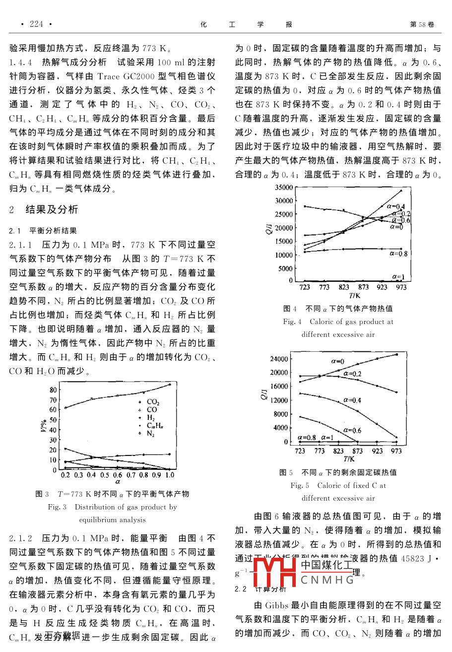 第58卷第1期學(xué)報Vol 58 No. 12007年1月Journal of Chemical Industry and Engineering ( Chinalary 2007研究論文模擬輸液器的熱解特性祝紅梅,嚴建華,沈逍江,蔣旭光,岑可法(能源潔凈利用國家重點實驗室(浙江大學(xué)),浙江杭州310027)摘要:建立非化學(xué)計量平衡模型,根據(jù) Gibbs最小自由能原理對醫(yī)療垃圾中的典型組分輸液器進行平衡分析,根據(jù)分析結(jié)果擬合出產(chǎn)物分布的計算公式。通過危險廢物熱解焚燒多功能試驗臺進行試驗,試驗結(jié)果驗證了計算公式的可靠性,從而通過公式可直接預(yù)測醫(yī)療垃圾中典型組分輸液器熱解后的各產(chǎn)物百分含量關(guān)鍵詞:醫(yī)療垃圾;輸液器;熱解; Gibbs自由能;平衡分析中圖分類號:X705文獻標識碼:A文章編號:0438-1157(2007)01-0222-05Pyrolysis properties of simulated transfusion tubeZHU Hongmei, YAN Jianhua, SHEN Xiaojiang, JIANG Xuguang, CEN KefaState Key laboratory of Clean Energy Utilization (Zhejiang University), Hangzhou 310027, Zhejiang, China)Abstract: A non-stoichiometic equilibrium model based on the Gibbs free energy minimization approach wasdeveloped to analyze the pysolysis of typical medical waste-transfusion tube. The equations of pyrolysisproducts distribution were established on the basis of equilibrium analysis. Also the reliability of theseequations was verified by experimenting on the hazardous waste rotary kiln. These equations could be usedto predict distribution of pysolysis products directlKey words: medical waste; transfusion tube; pyrolysis; Gibbs free energy; equilibrium analysis熱解是在無氧或缺氧條件下,高溫加熱有機引言物,使有機物分子鏈斷裂進行熱分解,分解成裂解醫(yī)療垃圾含有大量的病毒、病菌及化學(xué)藥劑,氣與裂解焦的過程。裂解氣是由一氧化碳、二氧化是對環(huán)境危害極大的危險廢物。組成的多變又對醫(yī)碳、甲烷、氫氣、有機酸、焦油和水蒸氣等組成的療垃圾的處理裝置有很大的影響。目前已有多種技混合氣體,裂解焦則以碳為主。按熱解的溫度不術(shù)可用于醫(yī)療垃圾的處置,如清洗消毒、高溫消同,分為高溫?zé)峤?>1273K)、中溫?zé)峤舛?、填埋和焚燒等υ。由于焚燒能夠做到廢棄物的(873~973K)和低溫?zé)峤?<873K)。其中加熱減量化、穩(wěn)定化、無害化,在所有可行的醫(yī)療垃圾方式又可分為直接加熱和間接加熱。在對醫(yī)療垃處理中,該法已被證明是破壞傳染性和有毒性物圾進行熱解焚燒的處理過程中,由于組分復(fù)雜,以質(zhì)、減少體積和重量的有效方法之一。各國也在不及不允許將醫(yī)療垃圾的包裝袋打開,因此獲得醫(yī)療斷地完善醫(yī)療垃圾焚燒技術(shù),為減少焚燒中產(chǎn)生酸垃圾的比例數(shù)據(jù)是困難旳.直接進行熱解試驗很難性氣體等污染物,目前更多的是采用熱解焚燒對產(chǎn)物的組分和分布有良好的把握,因此在試驗前方法21。對熱中國煤化工分析,可以指導(dǎo)設(shè)計CNMHG005-12-21收到初稿,2006-06-12收到修改稿聯(lián)系人:蔣旭光。第一作者:祝紅梅(1982—),女,博士研jiangxg(a cmee. zju. edu.cn基金項目:國家自然科學(xué)基金項目(50276055)Foundation item: supported by the National Natural ScienceFoundation of China(50276055)第1期祝紅梅等:模擬輸液器的熱解特性223·和更好地完成試驗。常用復(fù)雜化學(xué)平衡計算方法主1.2反應(yīng)氣體組成要有兩大類:(1)根據(jù)質(zhì)量作用定律解線性/非過量空氣系數(shù)a為實際采用的空氣量與各元素線性方程組;(2)某種目標函數(shù)的最優(yōu)化。目前使完全燃燒所需理論空氣量總和的比例??諝庵械某捎幂^多的是以 Gibbs最小自由能為主的目標函數(shù)最分按O2:N2為21:79考慮。平衡分析時的過量優(yōu)化方法。將復(fù)雜化學(xué)平衡的分析結(jié)果進行擬空氣系數(shù)α選取0、0.2、0.4、0.6、。由于合得到模擬輸液器旳熱解產(chǎn)物分布計算公式,從而α為θ時的純熱解,試驗為達到熱解氣的順暢排直接預(yù)測產(chǎn)物的分布,為進一步的工況預(yù)測和系統(tǒng)出,需用高純度的N2作為載氣,因此采樣的氣體優(yōu)化提供幫助中N2含量包括作為載氣的N2,使試驗結(jié)果不真實1模型建立α為1時,不屬于熱解的范疇。所以試驗中只選取0.2、0.4、0.6、0.8的過量空氣系數(shù)進行試驗醫(yī)療垃圾的熱解中,進入反應(yīng)器的物料成分極1.3反應(yīng)使用溫度其復(fù)雜。從表1某醫(yī)療垃圾處置中心進行采樣后的平衡分析溫度373~1273K,試驗溫度773K結(jié)果可見,實際醫(yī)療垃圾中的塑料所占的百分含量1.4分析方法僅次于玻璃。醫(yī)療垃圾中的塑料又以聚丙烯為制作1.4.1平衡分析模型基于 Gibbs最小自由能的原料旳輸液器最典型,且PVC的性質(zhì)在生活垃圾 Factsage5.熱化學(xué)平衡分析軟件。反應(yīng)模型見圖1。的研究中已經(jīng)涵蓋,作為簡化,模型中只選取聚丙烯為分析物料。其他的組分如棉花和紙等,將在今eactor后的研究中作相應(yīng)的分析,將各個組分進行混合,N, CH4, H, CO2.C, H, O, N,S, wa從而建立完整的醫(yī)療垃圾的分析模型CO, C2H6,H]s,sO2圖1反應(yīng)模型1醫(yī)療垃圾的組成成分Fig 1 Pyrolysis modelTable I Component analysis of medical waste/%2試驗裝置試驗在危險(醫(yī)療)廢物熱解Paper焚燒多功能試驗臺上進行,試驗用的回轉(zhuǎn)窯結(jié)構(gòu)示62,4214.8511,82意圖見圖2。根據(jù)輸液器的元素分析,在模型中建立5種元素組成,根據(jù)物料守恒和 Gibbs最小自由能原