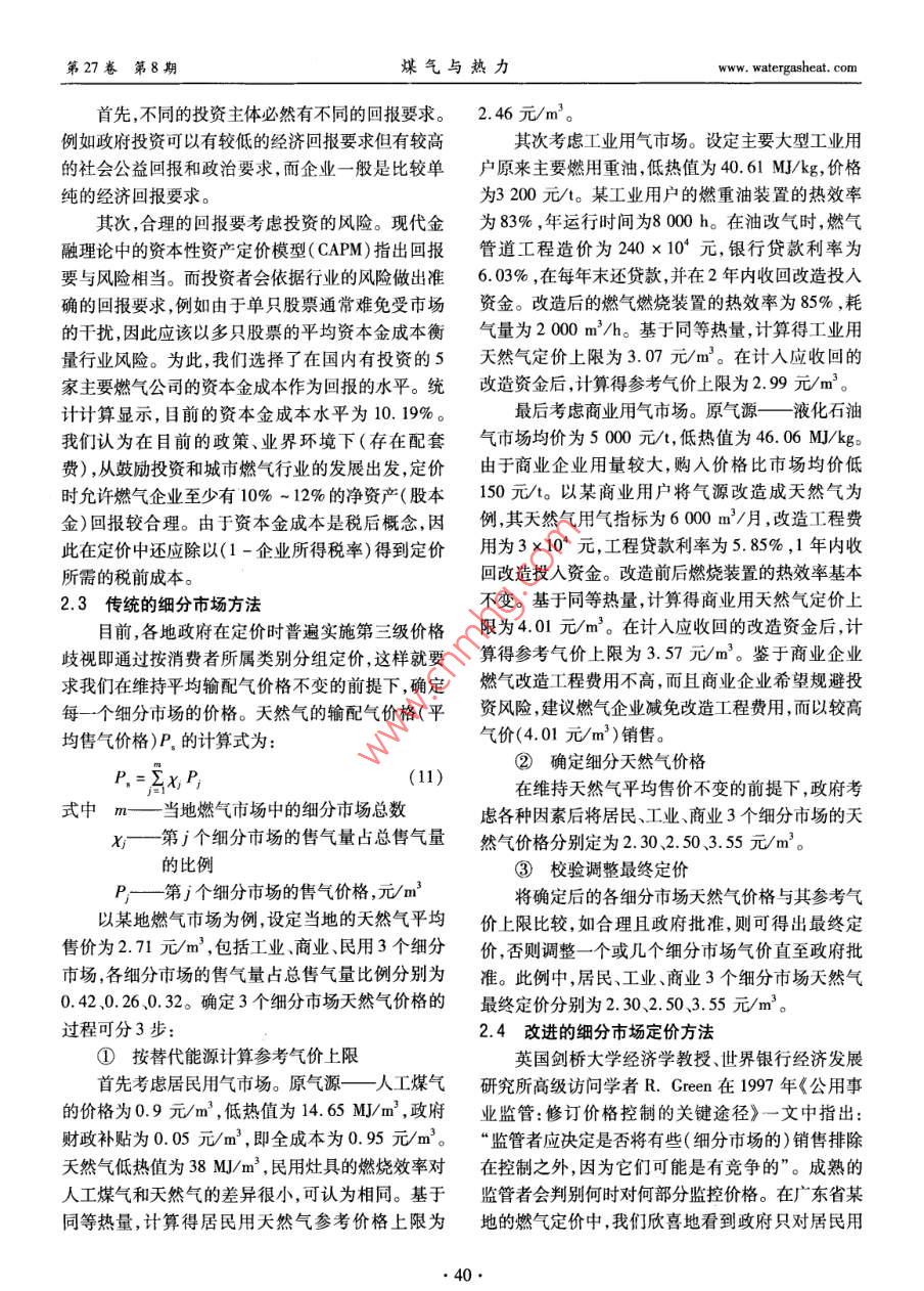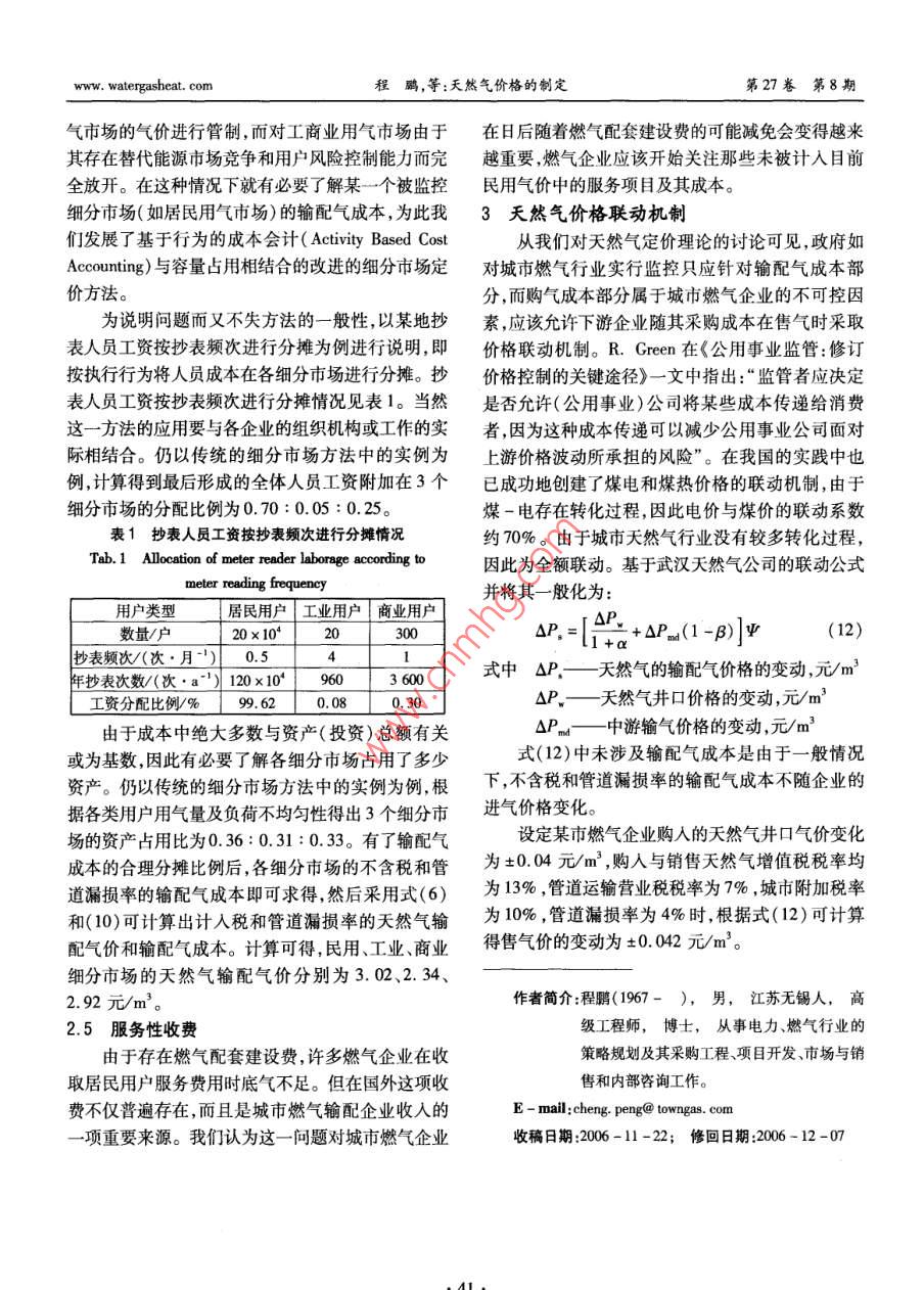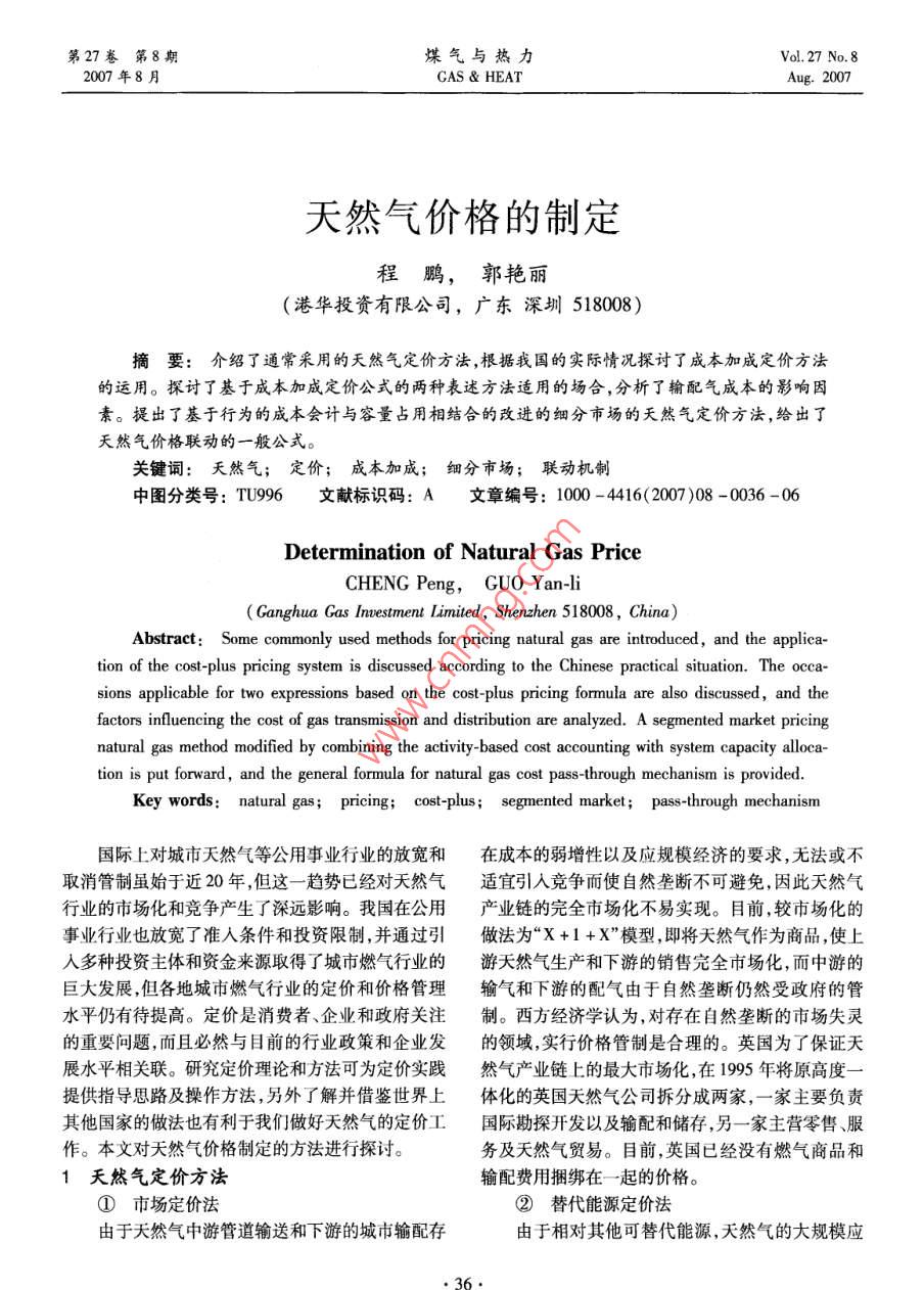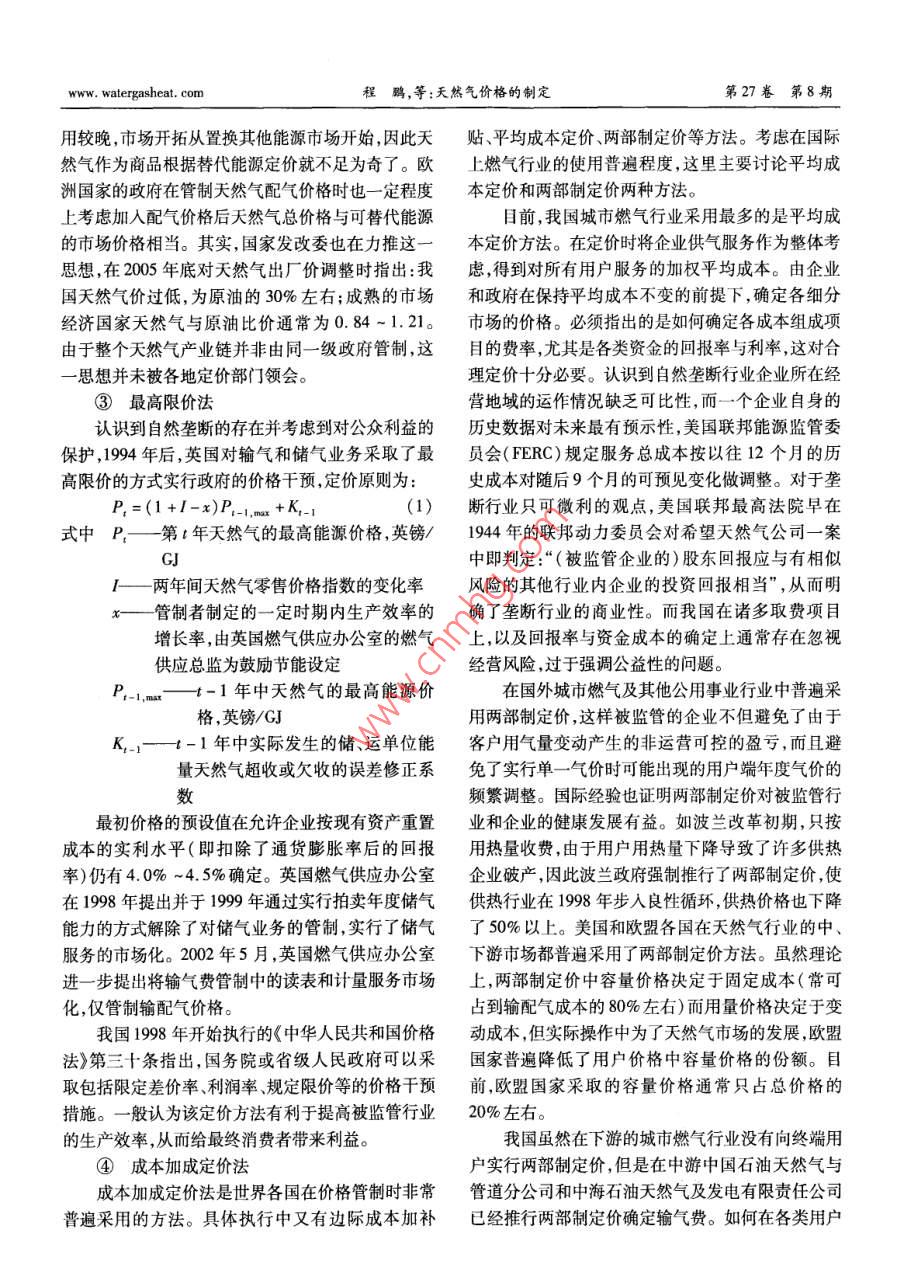 第27卷笫8期煤氣與熱力Vol 27 No 82007年8月GAs heat天然氣價(jià)格的制定程鵬,郭艷麗(港華投資有限公司,廣東深圳518008)摘要:介紹了通常采用的天然氣定價(jià)方法,根據(jù)我國(guó)的實(shí)際情況探討了成本加成定價(jià)方法的運(yùn)用。探討了基于成本加成定價(jià)公式的兩種表述方法適用的場(chǎng)合,分析了輸配氣成本的影響因素。提出了基于行為的成本會(huì)計(jì)與容量占用相結(jié)合的改進(jìn)的細(xì)分市場(chǎng)的天然氣定價(jià)方法,給出了天然氣價(jià)格聯(lián)動(dòng)的一般公式。關(guān)鍵詞:天然氣;定價(jià);成本加成;細(xì)分市場(chǎng);聯(lián)動(dòng)機(jī)制中圖分類號(hào):TU996文獻(xiàn)標(biāo)識(shí)碼:A文章編號(hào):1000-416(2007)08-0036-06Determination of Natural Gas PriceCHENG Peng, GUO Yan-liGanghua Gas Investment Limited, Shenzhen 518008, China)Abstract: Some commonly used methods for pricing natural gas are introduced, and the applica-tion of the cost-plus pricing system is discussed according to the Chinese practical situation. The occa-sions applicable for two expressions based on the cost-plus pricing formula are also discussed, and thefactors influencing the cost of gas transmission and distribution are analyzed. a segmented market pricingnatural gas method modified by combining the activity-based cost accounting with system capacity alloca-tion is put forward, and the general formula for natural gas cost pass-through mechanism is providedKey words: natural gas; pricing; cost-plus segmented market; pass-through mechanism國(guó)際上對(duì)城市天然氣等公用事業(yè)行業(yè)的放寬和在成本的弱增性以及應(yīng)規(guī)模經(jīng)濟(jì)的要求,無(wú)法或不取消管制雖始于近20年,但這一趨勢(shì)已經(jīng)對(duì)天然氣適宜引入競(jìng)爭(zhēng)而使自然壟斷不可避免,因此天然氣行業(yè)的市場(chǎng)化和競(jìng)爭(zhēng)產(chǎn)生了深遠(yuǎn)影響。我國(guó)在公用產(chǎn)業(yè)鏈的完全市場(chǎng)化不易實(shí)現(xiàn)。目前,較市場(chǎng)化的事業(yè)行業(yè)也放寬了準(zhǔn)人條件和投資限制,并通過(guò)引做法為“X+1+X”模型,即將天然氣作為商品,使上入多種投資主體和資金來(lái)源取得了城市燃?xì)庑袠I(yè)的游天然氣生產(chǎn)和下游的銷售完全市場(chǎng)化,而中游的巨大發(fā)展,但各地城市燃?xì)庑袠I(yè)的定價(jià)和價(jià)格管理輸氣和下游的配氣由于自然壟斷仍然受政府的管水平仍有待提高。定價(jià)是消費(fèi)者、企業(yè)和政府關(guān)注制。西方經(jīng)濟(jì)學(xué)認(rèn)為,對(duì)存在自然壟斷的市場(chǎng)失靈的重要問(wèn)題,而且必然與目前的行業(yè)政策和企業(yè)發(fā)的領(lǐng)域,實(shí)行價(jià)格管制是合理的。英國(guó)為了保證天展水平相關(guān)聯(lián)。研究定價(jià)理論和方法可為定價(jià)實(shí)踐然氣產(chǎn)業(yè)鏈上的最大市場(chǎng)化,在1995年將原高度提供指導(dǎo)思路及操作方法,另外了解并借鑒世界上體化的英國(guó)天然氣公司拆分成兩家,一家主要負(fù)責(zé)其他國(guó)家的做法也有利于我們做好天然氣的定價(jià)工國(guó)際勘探開發(fā)以及輸配和儲(chǔ)存,另一家主營(yíng)零售、服作。本文對(duì)天然氣價(jià)格制定的方法進(jìn)行探討。務(wù)及天然氣貿(mào)易。目前,英國(guó)已經(jīng)沒(méi)有燃?xì)馍唐泛?天然氣定價(jià)方法輸配費(fèi)用捆綁在一起的價(jià)格①市場(chǎng)定價(jià)法②替代能源定價(jià)法由于天然氣中游管道輸送和下游的城市輸配存由于相對(duì)其他可替代能源,天然氣的大規(guī)模應(yīng)watergasheat. com程鵬,等:天然氣價(jià)格的制定第27卷第8期用較晩,市場(chǎng)開拓從置換其他能源市場(chǎng)開始,因此天貼、平均成本定價(jià)、兩部制定價(jià)等方法??紤]在國(guó)際然氣作為商品根據(jù)替代能源定價(jià)就不足為奇了。歐上燃?xì)庑袠I(yè)的使用普遍程度,這里主要討論平均成洲國(guó)家的政府在管制天然氣配氣價(jià)格時(shí)也一定程度本定價(jià)和兩部制定價(jià)兩種方法。上考慮加入配氣價(jià)格后天然氣總價(jià)格與可替代能源目前,我國(guó)城市燃?xì)庑袠I(yè)采用最多的是平均成的市場(chǎng)價(jià)格相當(dāng)。其實(shí),國(guó)家發(fā)改委也在力推這一本定價(jià)方法。在定價(jià)時(shí)將企業(yè)供氣服務(wù)作為整體考思想,在2005年底對(duì)天然氣出廠價(jià)調(diào)整時(shí)指出:我慮,得到對(duì)所有用戶服務(wù)的加權(quán)平均成本。由企業(yè)國(guó)天然氣價(jià)過(guò)低,為原油的30%左右;成熟的市場(chǎng)和政府在保持平均成本不變的前提下,確定各細(xì)分經(jīng)濟(jì)國(guó)家天然氣與原油比價(jià)通常為0.84~1.21。市場(chǎng)的價(jià)格。必須指出的是如何確定各成本組成項(xiàng)由于整個(gè)天然氣產(chǎn)業(yè)鏈并非由同一級(jí)政府管制,這目的費(fèi)率,尤其是各類資金的回報(bào)率與利率,這對(duì)合思想并未被各地定價(jià)部門領(lǐng)會(huì)。理定價(jià)十分必要。認(rèn)識(shí)到自然壟斷行業(yè)企業(yè)所在經(jīng)③最高限價(jià)法營(yíng)地域的運(yùn)作情況缺乏可比性,而一個(gè)企業(yè)自身的認(rèn)識(shí)到自然壟斷的存在并考慮到對(duì)公眾利益的歷史數(shù)據(jù)對(duì)未來(lái)最有預(yù)示性,美國(guó)聯(lián)邦能源監(jiā