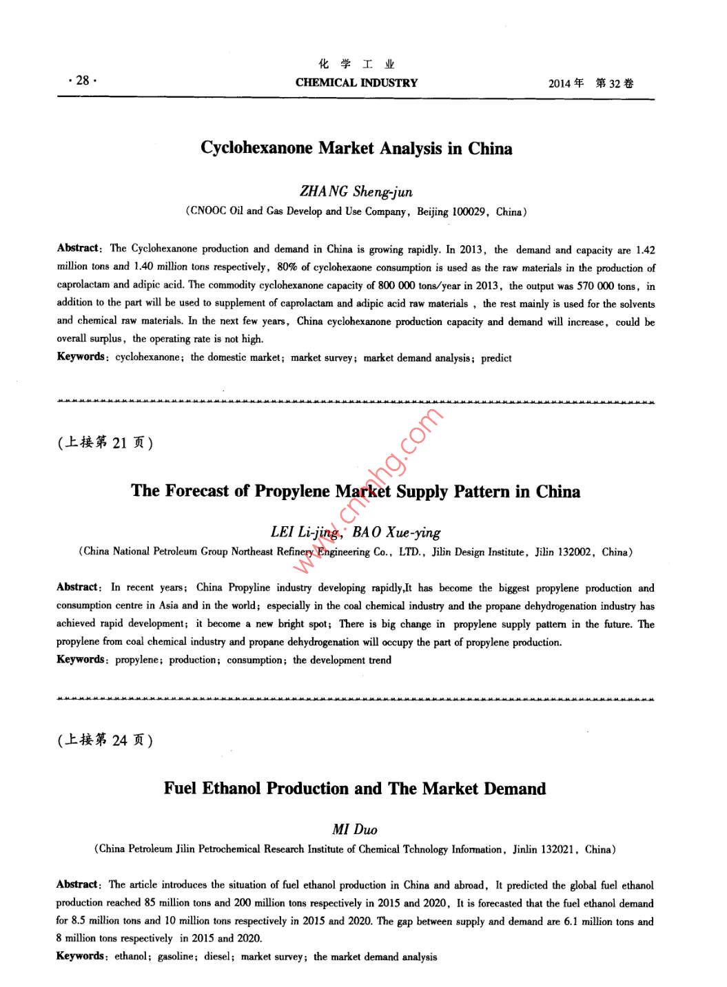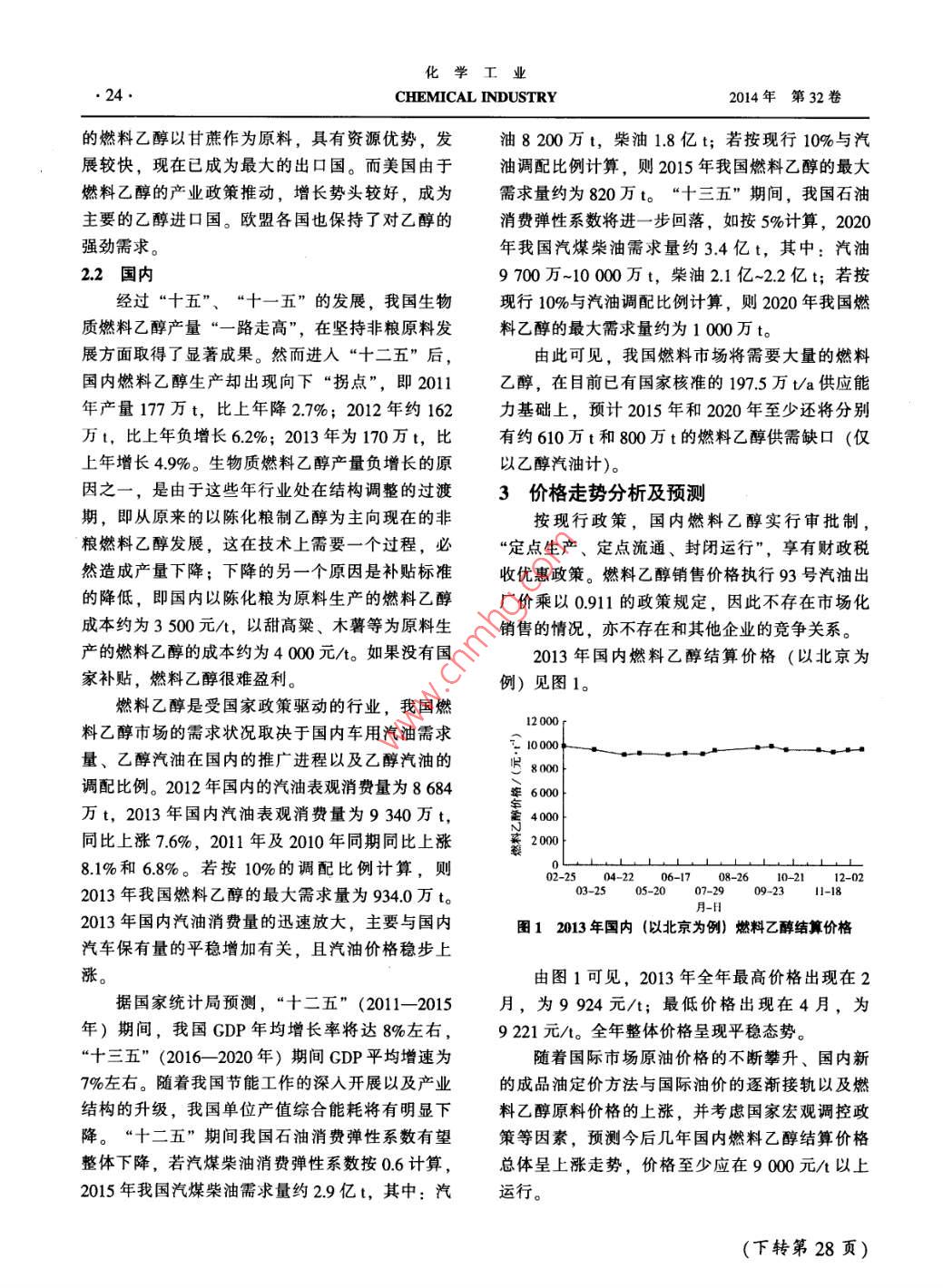 化學(xué)工業(yè)第32卷第8期22 CHEMICAL INDUSTRY2014年8月燃料乙醇生產(chǎn)及市場米多(中國石油吉林石化研究院化工科技信息所,吉林市132021)摘要:介紹國內(nèi)外燃料乙醇生產(chǎn)形勢,預(yù)測2015年和2020年全球燃料乙醇產(chǎn)量分別達到8500萬t和2億t測算我國2015年和2020年燃料乙醇需求量分別為50萬t和1000萬t,供需缺口分別為610萬t和800萬t關(guān)鍵詞:乙醇;汽油;柴油;市場調(diào)查;市場需求分析文章編號:1673-9647(2014)8-0022-04中圖分類號:TQ223.12文獻標識碼:A1生產(chǎn)狀況分析及預(yù)測料乙醇產(chǎn)量1750萬t,2013年2025萬t,是全11世界產(chǎn)業(yè)現(xiàn)狀球燃料乙醇的第二大生產(chǎn)國和第一大出口國,所據(jù)國際分析機構(gòu)F.O.Licht發(fā)布的最新報告顯產(chǎn)乙醇80%用于國內(nèi)消費,20%出口,美國是其示,2012年全球燃料乙醇產(chǎn)量為6771萬t,2013主要出口地。年全球燃料乙醇產(chǎn)量7063萬t。美國和巴西仍然巴西是全球重要的蔗糖生產(chǎn)基地,在燃料乙是兩個最大的乙醇生產(chǎn)國。主要原因為起步早醇生產(chǎn)的原料方面具有先天優(yōu)勢。甘蔗原料,傳政策導(dǎo)向明確和原料充足。由于糧食乙醇存在統(tǒng)產(chǎn)業(yè),成本較低;污水直接還田,節(jié)省后處理“與糧爭地,與人爭糧”問題,因此世界許多國家成本;甘蔗渣熱電聯(lián)產(chǎn),攤薄生產(chǎn)成本。在政策和地區(qū)均加快了非糧燃料乙醇的產(chǎn)業(yè)發(fā)展步伐。方面政府提供專項低息貸款,減免生物燃料稅賦,(1)美國燃料乙醇產(chǎn)量居世界之首。美國以并對乙醇燃料汽車減征工業(yè)產(chǎn)品稅。巴西目前正玉米原料為主,2012年燃料乙醇產(chǎn)量4082萬t,在開發(fā)蔗渣制燃料乙醇和新一代的含糖木薯制燃2013年4050萬t,居世界第一。美國燃料乙醇生料乙醇技術(shù)。產(chǎn)的原料十分充足,其玉米原料價格比中國低(3)歐盟燃料乙醇產(chǎn)業(yè)近年發(fā)展迅猛。歐盟50%以上,并且生產(chǎn)效率較中國高美國國會于燃料乙醇產(chǎn)業(yè)起步較晚,1993年燃料乙醇產(chǎn)量僅2005年8月通過綜合能源法,推出可再生燃料標為4.8萬t。2004年達到42萬t,隨后開始大幅增準(RFS),要求在汽油總組成中加入特定數(shù)量的長,2009年達到296萬t(法國100萬t、德國60可再生燃料,而且每年遞增,強制實施可再生能萬t)。2013年歐盟燃料乙醇產(chǎn)量達364萬t,全源比例。球發(fā)展速度最快。歐盟燃料乙醇生產(chǎn)以谷物為主2011年8月,美國政府推出了一項總額為5.1要原料,其中小麥約占1/3。歐洲目前正鼓勵新億美元的補貼計劃,由農(nóng)業(yè)部、能源部和海軍共能源企業(yè)利用垃圾、麥稈和藻類等非糧食原料開同投資推動美國第2代生物燃料的生產(chǎn)開發(fā)進程。發(fā)新一代生物燃料,規(guī)定只有以非糧原料制備的2012年8月美國政府宣布,對纖維素燃料產(chǎn)品提第2代生物燃料才可能在未來獲得補貼。供1.01美元/USgal(0.27美元/L),對生物柴油11.2國內(nèi)產(chǎn)業(yè)現(xiàn)狀美元/USgal(0.26美元/L)的聯(lián)邦稅收減免。我國政府推廣燃料乙醇的最初設(shè)想出現(xiàn)在(2)巴西燃料乙醇產(chǎn)量位列世界第二。20081999年,當時國內(nèi)的糧食嚴重積壓,北方的情況年之前,巴西乙醇產(chǎn)量呈不斷增長趨勢。2009收稿日期:2014-06-2年,受世界糖需求旺盛的影響,巴西乙醇產(chǎn)量下降6.0%。巴西乙醇以甘蔗為生產(chǎn)原料,2012年燃作者簡:米多(190)女林省人,高級工程師,從事料的國內(nèi)外信息調(diào)研工作。第8期米多:燃料乙醇生產(chǎn)及市場23尤為嚴重,大量富余的糧食無法釋放,國家糧庫籌建萬噸級纖維素乙醇示范項目未來8年,燃超負荷,如何解決陳化糧問題成了當務(wù)之急。我料乙醇將增長6倍,但不可否認的是,非糧燃料國的生物燃料乙醇開發(fā)從2002年開始試點,雖然乙醇項目成本相對較高,多還處于“賠本賺吆喝”時間不長,但發(fā)展速度很快。目前,我國生物燃的階段國家有關(guān)部門應(yīng)將原有的行業(yè)補貼,轉(zhuǎn)料乙醇生產(chǎn)技術(shù)已經(jīng)成熟,黑龍江、吉林、遼寧、到非糧燃料乙醇和纖維素燃料乙醇上,并出臺相河南、安徽5省及湖北、河北、山東、江蘇、廣應(yīng)鼓勵政策,尤其要支持引導(dǎo)好纖維乙醇工業(yè)化西部分地區(qū)已基本實現(xiàn)車用乙醇汽油替代普通無示范項目的發(fā)展。鉛汽油。我國已成為世界上繼巴西、美國之后的13未來產(chǎn)業(yè)預(yù)測第三大生物燃料乙醇生產(chǎn)國?;谀壳吧镔|(zhì)能源的發(fā)展現(xiàn)狀、政策及趨2007年,國家發(fā)改委明確表示,將不再利用勢,對燃料乙醇未來產(chǎn)能需求做出如下預(yù)測:預(yù)糧食作為生物質(zhì)能源的生產(chǎn)原料,取代糧食的將計2015年全球燃料乙醇產(chǎn)量將達到8500萬t;是非糧作物,以玉米、小麥為主的第一代燃料乙醇2020年全球燃料乙醇產(chǎn)量將達到2億t,其中一原料被叫停,各大燃料乙醇公司不得不尋找過渡半以上來自于第二代非糧生物燃料的增加性的非糧原料乙醇,木薯、甜高粱等原料成為發(fā)2消費現(xiàn)狀及預(yù)測展的重點。2008年建成的廣西中糧生物質(zhì)能源有2.1世界限公司的20萬a燃料乙醇項目是經(jīng)國家發(fā)改委世界上燃料乙醇的總消費量以及變化趨勢與立項批準的國內(nèi)唯一的非糧燃料乙醇項目。至產(chǎn)量基本