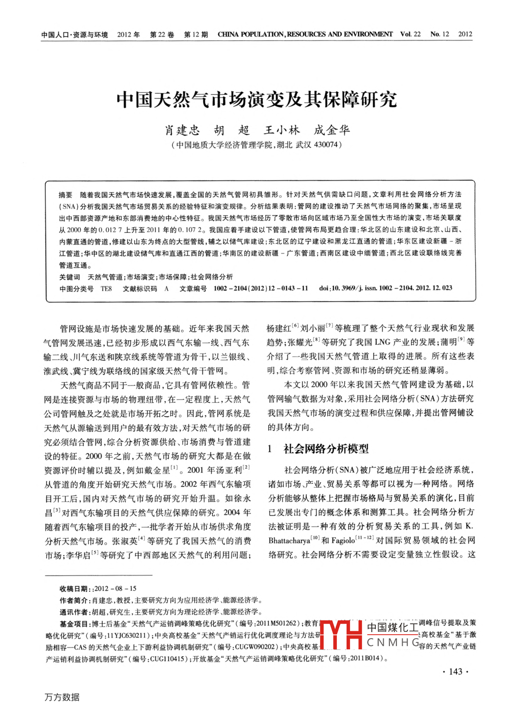 中國人口·資源與環(huán)境2012年第22卷第12期 CHINA POPULATION, RESOURCES AND ENVIRONMENT Vol22No.122012中國天然氣市場演變及其保障研究肖建忠胡超王小林成金華(中國地質(zhì)大學(xué)經(jīng)濟(jì)管理學(xué)院,湖北武漢430074)摘要隨著我國天然氣市場快速發(fā)展,覆蓋全國的天然氣管網(wǎng)初具雛形。針對天然氣供需缺口問題,文章利用社會(huì)網(wǎng)絡(luò)分析方法SNA)分析我國天然氣市場貿(mào)易關(guān)系的經(jīng)驗(yàn)特征和演變規(guī)律。分析結(jié)果表明:管網(wǎng)的建設(shè)推動(dòng)了天然氣市場網(wǎng)絡(luò)的聚集,市場呈現(xiàn)出中西部資源產(chǎn)地和東部消費(fèi)地的中心性特征。我國天然氣市場經(jīng)歷了零散市場向區(qū)域市場乃至全國性大市場的演變,市場關(guān)聯(lián)度從2000年的0.0127上升至2011年的0.1072。我國應(yīng)著手建設(shè)以下管道,使管網(wǎng)布局更趨合理:華北區(qū)的山東建設(shè)和北京、山西內(nèi)蒙直通的管道,修建以山東為終點(diǎn)的大型管線輔之以儲(chǔ)氣庫建設(shè);東北區(qū)的遼寧建設(shè)和黑龍江直通的管道;華東區(qū)建設(shè)新疆-浙江管道;華中區(qū)的湖北建設(shè)儲(chǔ)氣庫和直通江西的管道;華南區(qū)的建設(shè)新疆-廣東管道;西南區(qū)建設(shè)中緬管道;西北區(qū)建設(shè)聯(lián)絡(luò)線完善管道互通關(guān)鍵詞天然氣管道;市場演變;市場保障;社會(huì)網(wǎng)絡(luò)分析中圖分類號(hào)TF8文獻(xiàn)標(biāo)識(shí)碼A文章編號(hào)1002-2104(2012)12-0143-1ldoi:10.3969/ J. issn..1002-2104.2012.12.023管網(wǎng)設(shè)施是市場快速發(fā)展的基礎(chǔ)。近年來我國天然楊建紅劉小麗”等梳理了整個(gè)天然氣行業(yè)現(xiàn)狀和發(fā)展氣管網(wǎng)發(fā)展迅速,已經(jīng)初步形成以西氣東輸一線、西氣東趨勢;張耀光等研究了我國LNG產(chǎn)業(yè)的發(fā)展;蒲明”等輸二線、川氣東送和陜京線系統(tǒng)等管道為骨干,以蘭銀線、介紹了一些我國天然氣管道上取得的進(jìn)展。所有這些表淮武線、冀寧線為聯(lián)絡(luò)線的國家級(jí)天然氣骨干管網(wǎng)。明,綜合考察管網(wǎng)、資源和市場的研究還稍顯薄弱。天然氣商品不同于一般商品,它具有管網(wǎng)依賴性。管本文以2000年以來我國天然氣管網(wǎng)建設(shè)為基礎(chǔ),以網(wǎng)是連接資源與市場的物理紐帶,在一定程度上,天然氣管網(wǎng)輸氣數(shù)據(jù)為對象,采用社會(huì)網(wǎng)絡(luò)分析(SNA)方法研究公司管網(wǎng)觸及之處就是市場開拓之時(shí)。因此,管網(wǎng)系統(tǒng)是我國天然氣市場的演變過程和供應(yīng)保障,并提出管網(wǎng)鋪設(shè)天然氣從源輸送到用戶的最有效方法,對天然氣市場的研的具體方向。究必須結(jié)合管網(wǎng),綜合分析資源供給、市場消費(fèi)與管道建設(shè)的特征。2000年之前,天然氣市場的研究大都是在做1社會(huì)網(wǎng)絡(luò)分析模型資源評(píng)價(jià)時(shí)輔以提及,例如戴金星。2001年湯亞利2社會(huì)網(wǎng)絡(luò)分析(SNA)被廣泛地應(yīng)用于社會(huì)經(jīng)濟(jì)系統(tǒng),從管道的角度開始研究天然氣市場。2002年西氣東輸項(xiàng)諸如市場、產(chǎn)業(yè)、貿(mào)易關(guān)系等都可以視為一種網(wǎng)絡(luò)。網(wǎng)絡(luò)目開工后,國內(nèi)對天然氣市場的研究開始升溫。如徐永分析能夠從整體上把握市場格局與貿(mào)易關(guān)系的演化,目前昌3對西氣東輸項(xiàng)目的天然氣供應(yīng)保障的研究。2004年已發(fā)展出專門的概念體系和測算工具。社會(huì)網(wǎng)絡(luò)分析方隨著西氣東輸項(xiàng)目的投產(chǎn),一批學(xué)者開始從市場供求角度法被證明是一種有效的分析貿(mào)易關(guān)系的工具,例如K分析天然氣市場。張淑英等研究了我國天然氣的消費(fèi) Bhattacharya0和 Fagiolo-2對國際貿(mào)易領(lǐng)域的社會(huì)網(wǎng)市場;李華啟5等研究了中西部地區(qū)天然氣的利用問題;絡(luò)研究。社會(huì)網(wǎng)絡(luò)分析不需要設(shè)定變量獨(dú)立性假設(shè)。這收稿日期::2012-08-15作者簡介:肖建忠,教授,主要研究方向?yàn)閼?yīng)用經(jīng)濟(jì)學(xué)、能源經(jīng)濟(jì)學(xué)。通訊作者:胡超,研究生,主要研究方向?yàn)槔碚摻?jīng)濟(jì)學(xué)、能源經(jīng)濟(jì)學(xué)?;痦?xiàng)目:博士后基金“天然氣產(chǎn)運(yùn)銷調(diào)峰策略優(yōu)化研究”(編號(hào):201M501262);教育中國煤化工調(diào)峰信號(hào)提取及策略優(yōu)化研究”(編號(hào):l1YJC630211);中央高?;稹疤烊粴猱a(chǎn)銷運(yùn)行優(yōu)化調(diào)度理論與方一高?;稹盎诩?lì)相容—CAS的天然氣企業(yè)上下游利益協(xié)調(diào)機(jī)制研究”(編號(hào):CUGW090202);中央高校CNMHG容的天然氣產(chǎn)業(yè)鏈產(chǎn)運(yùn)銷利益協(xié)調(diào)機(jī)制研究”(編號(hào):CUG110415);開放基金“天然氣產(chǎn)運(yùn)銷調(diào)峰策略優(yōu)化研究”(編號(hào):2011B∞14)。143肖建忠等:中國天然氣市場演變及其保障研究在處理關(guān)系數(shù)據(jù)時(shí)擁有了比其他統(tǒng)計(jì)方法極大的優(yōu)勢。黃海這三大海上天然氣富集區(qū)、進(jìn)口LNG以及西氣東輸SNA方法中釆用較為普遍的指標(biāo)是中心性、派系以及關(guān)聯(lián)二線境外段的土庫曼斯坦一哈薩克斯坦管道以供給氣源度
